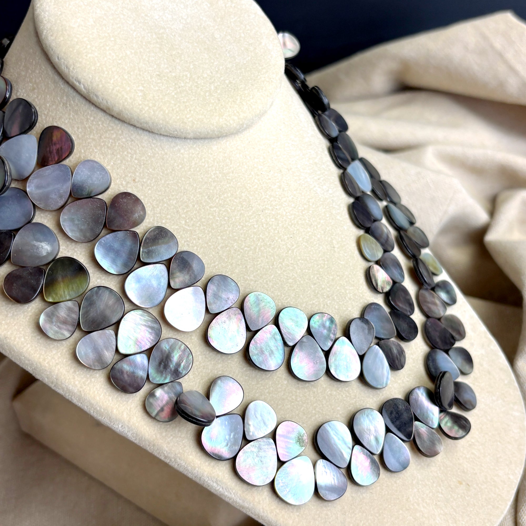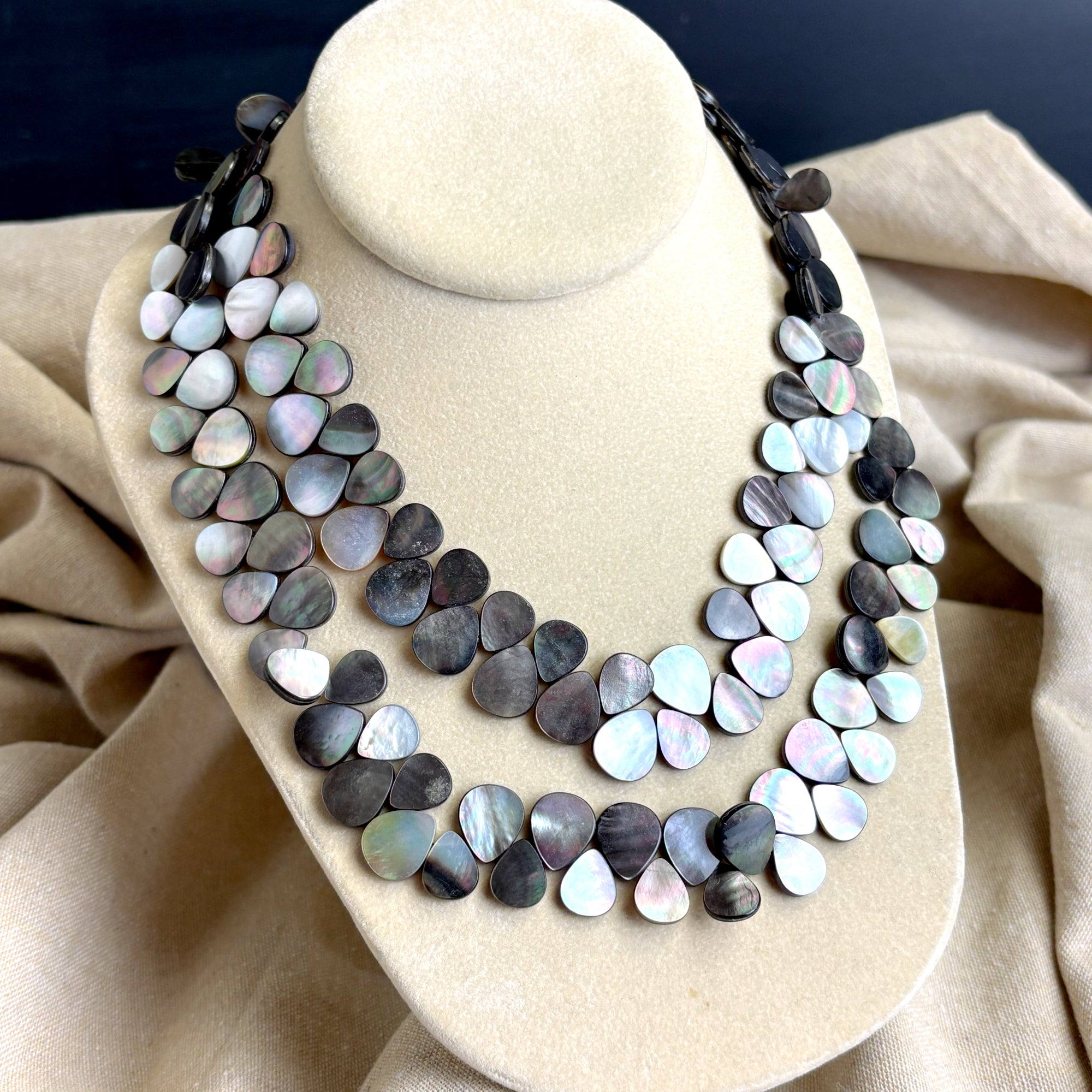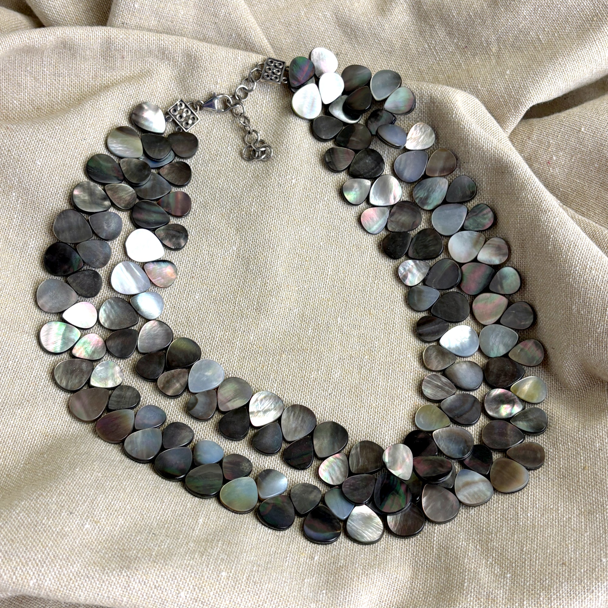 Lucoral for HSN double strand mother of pearl necklace with silver findings. Interlocking flat teardrop dark mother of pearl shell beads. Decorative findings and lobster claw clasp with 1.5" extender. Nice shade variation adds to the natural glow of the mother of pearl.