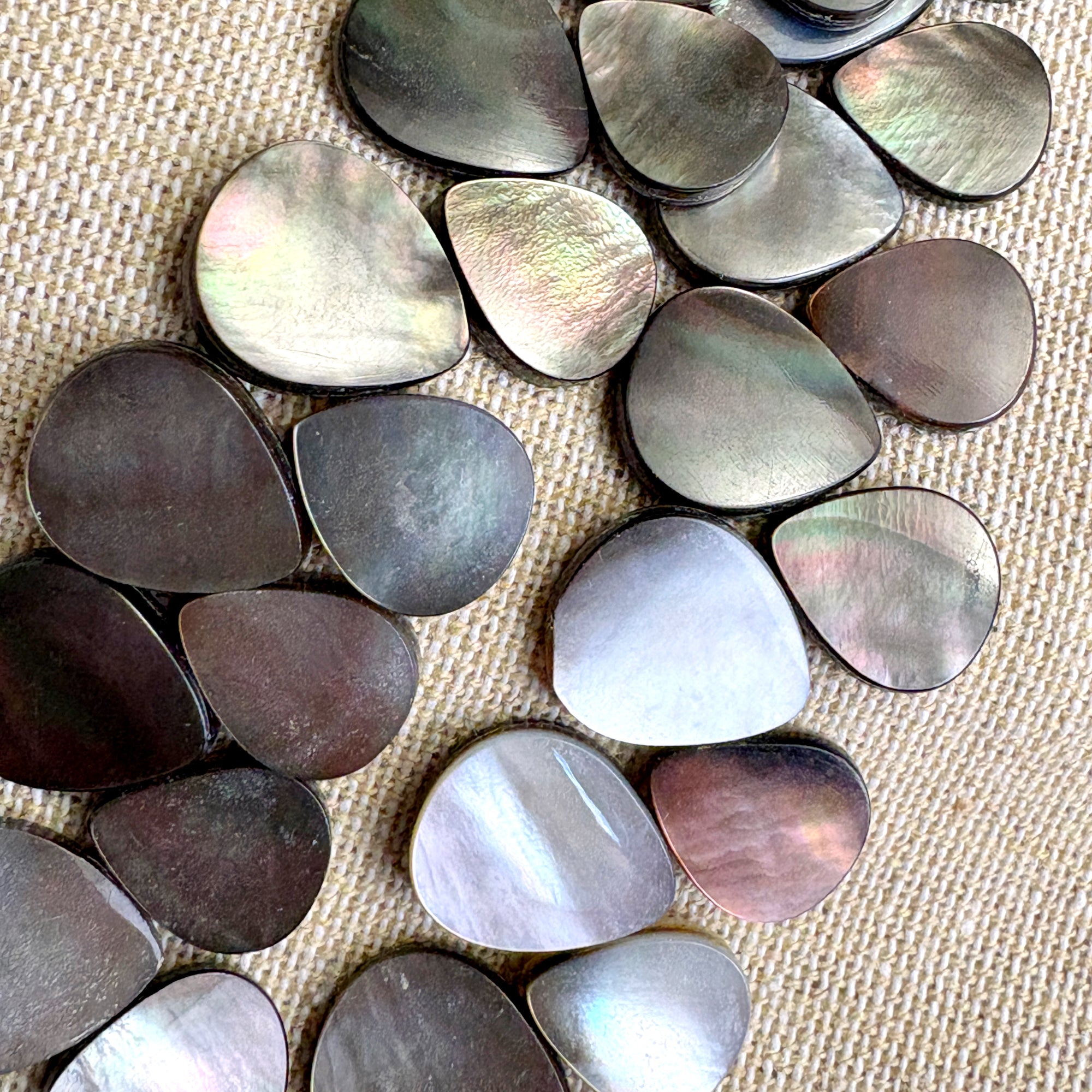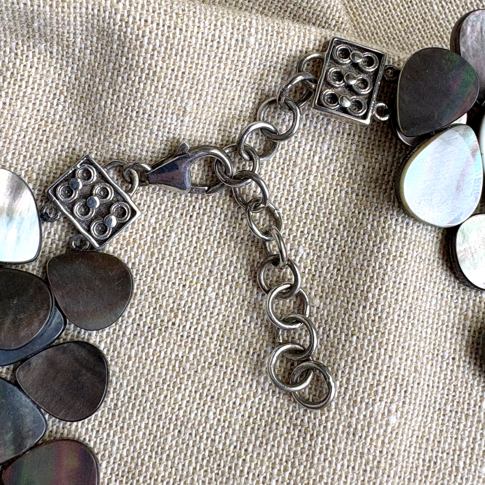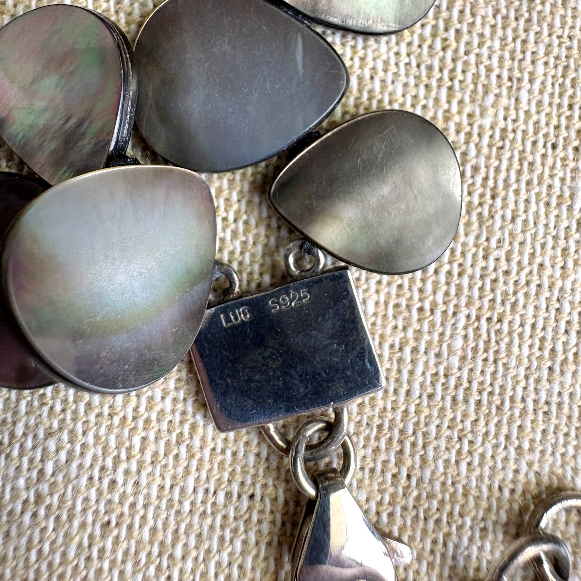 Lucoral for HSN double strand mother of pearl necklace with silver findings. Interlocking flat teardrop dark mother of pearl shell beads. Decorative findings and lobster claw clasp with 1.5" extender. Nice shade variation adds to the natural glow of the mother of pearl.