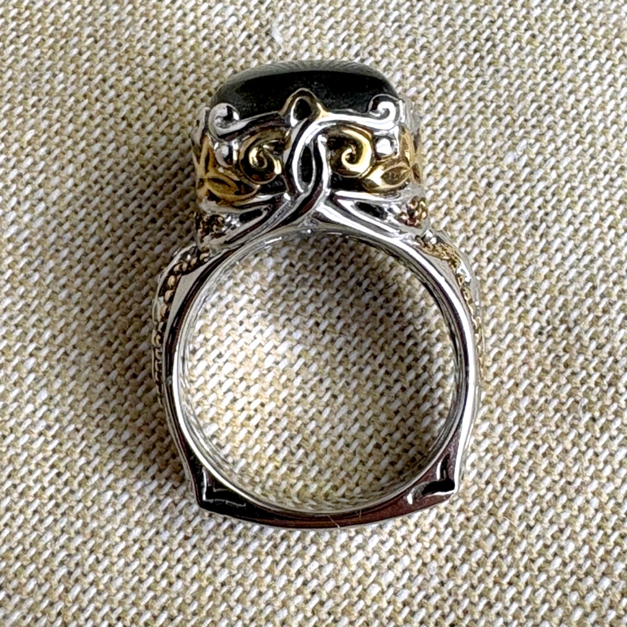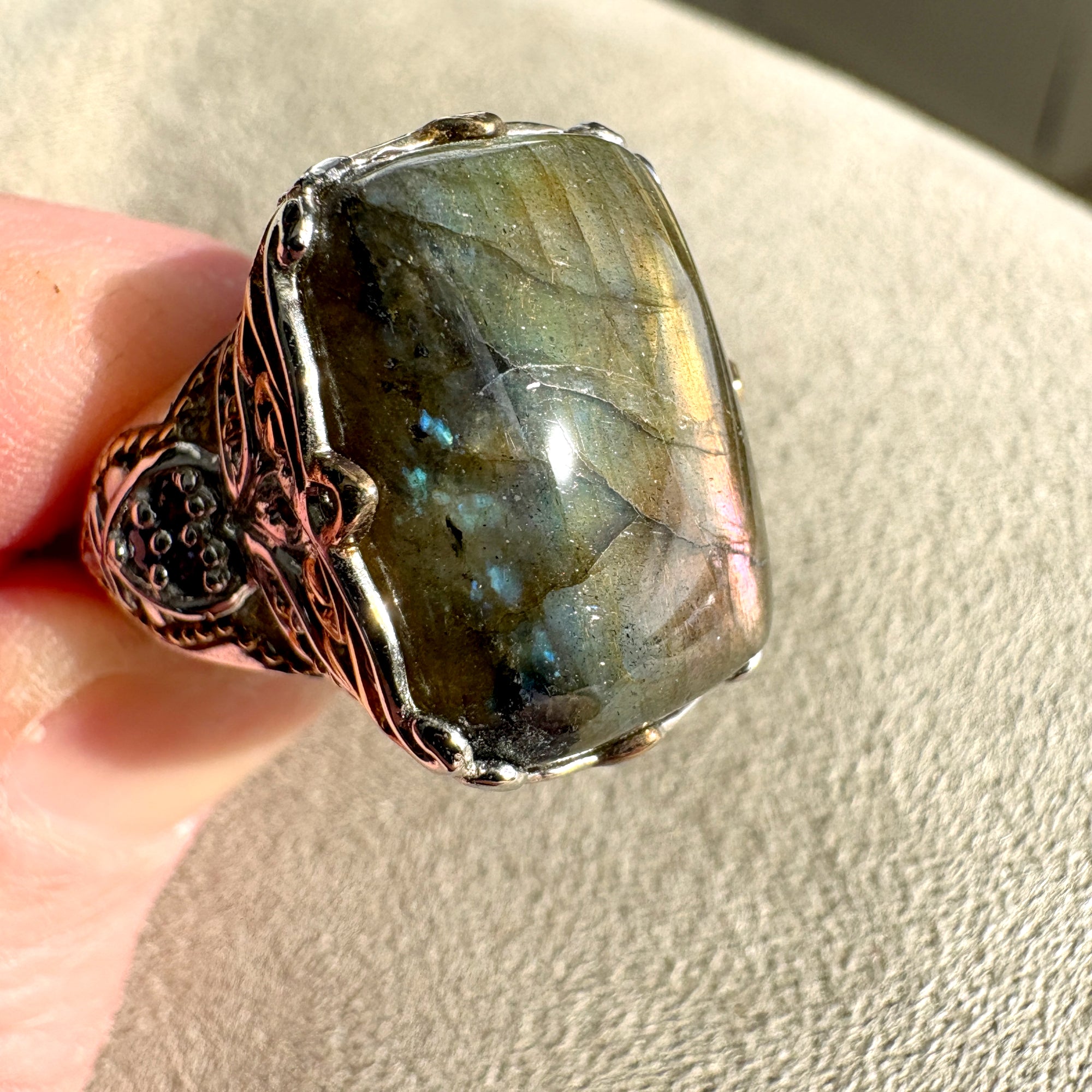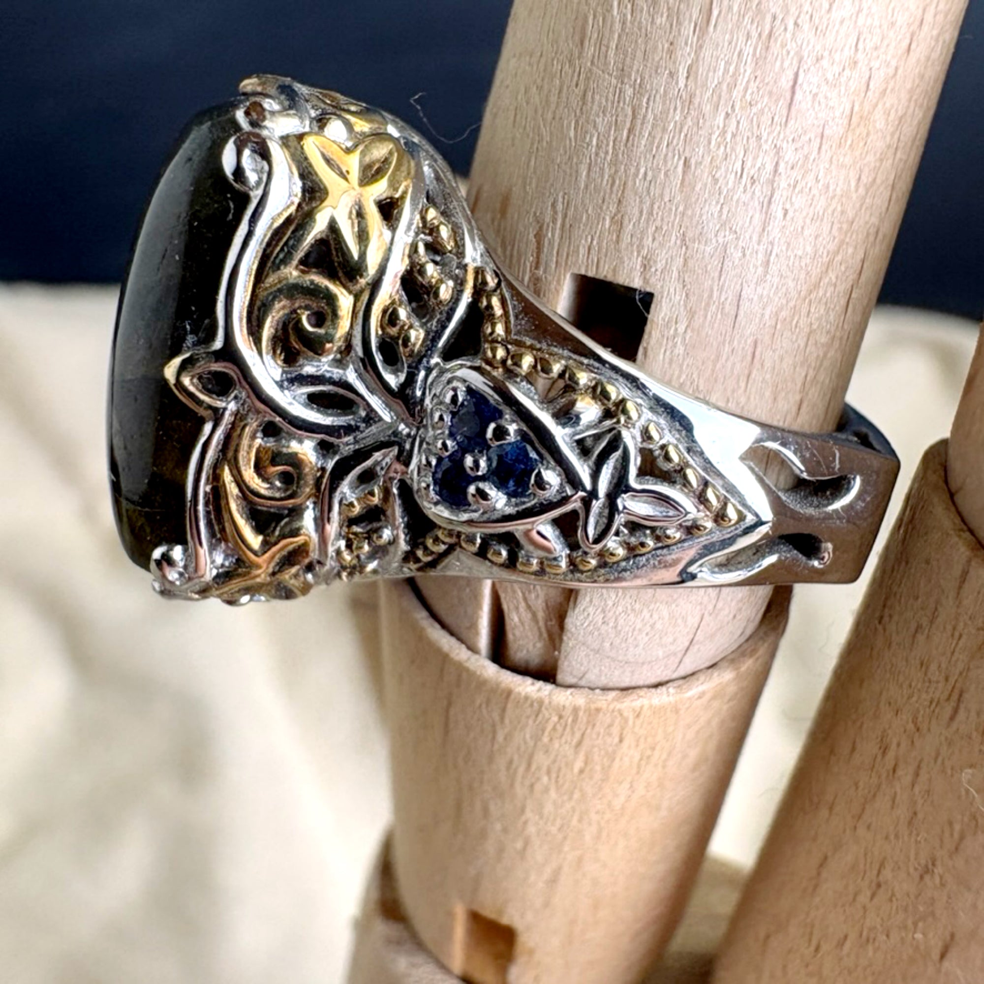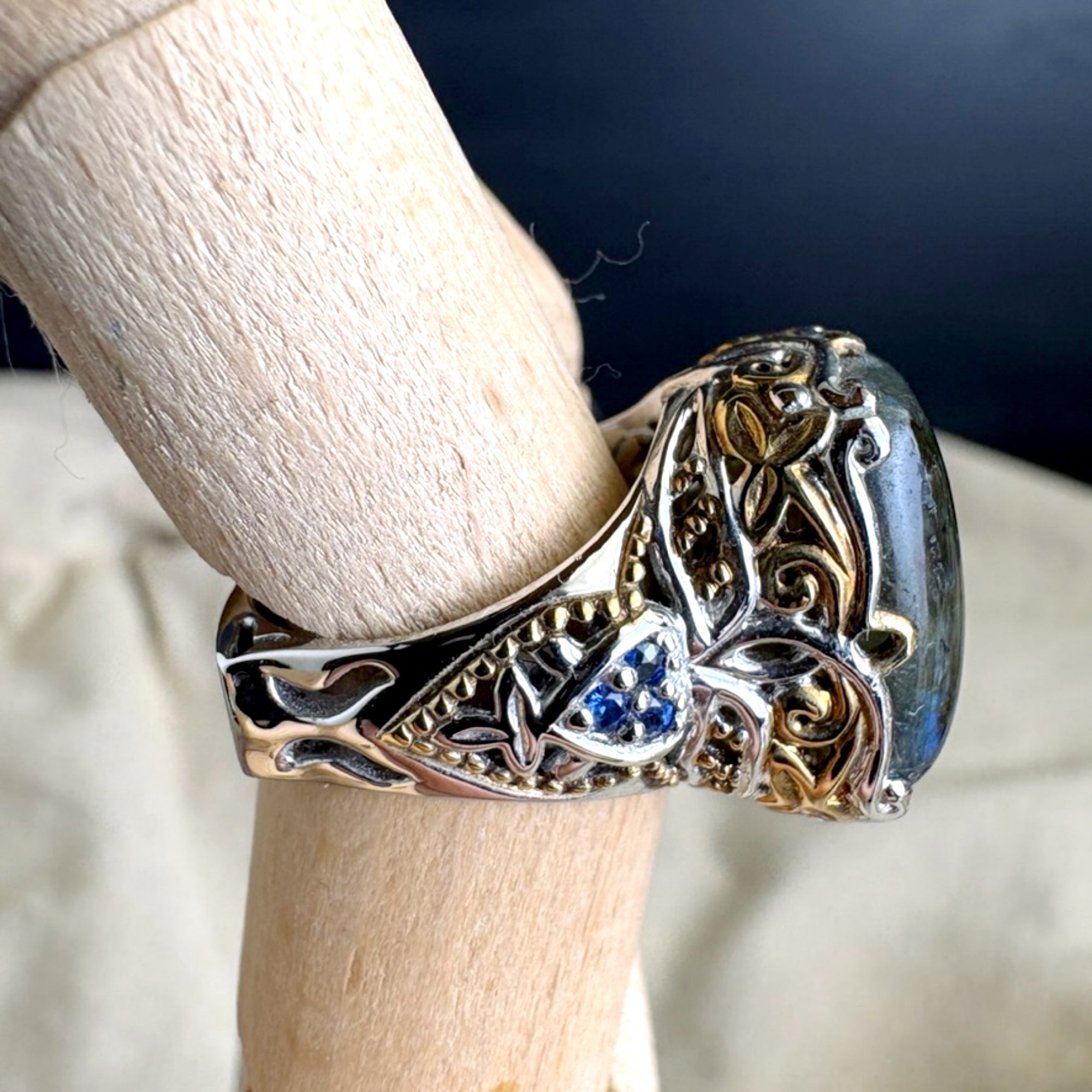 Michael Valitutti Gems En Vogue sterling and labradorite cocktail ring. Olive greens and blues shimmer in this ornately set rectangular stone. Accented on the sides of the band with raised vermeil and sterling and 3 small sapphire colored stones in a heart shape. Marked 925NH