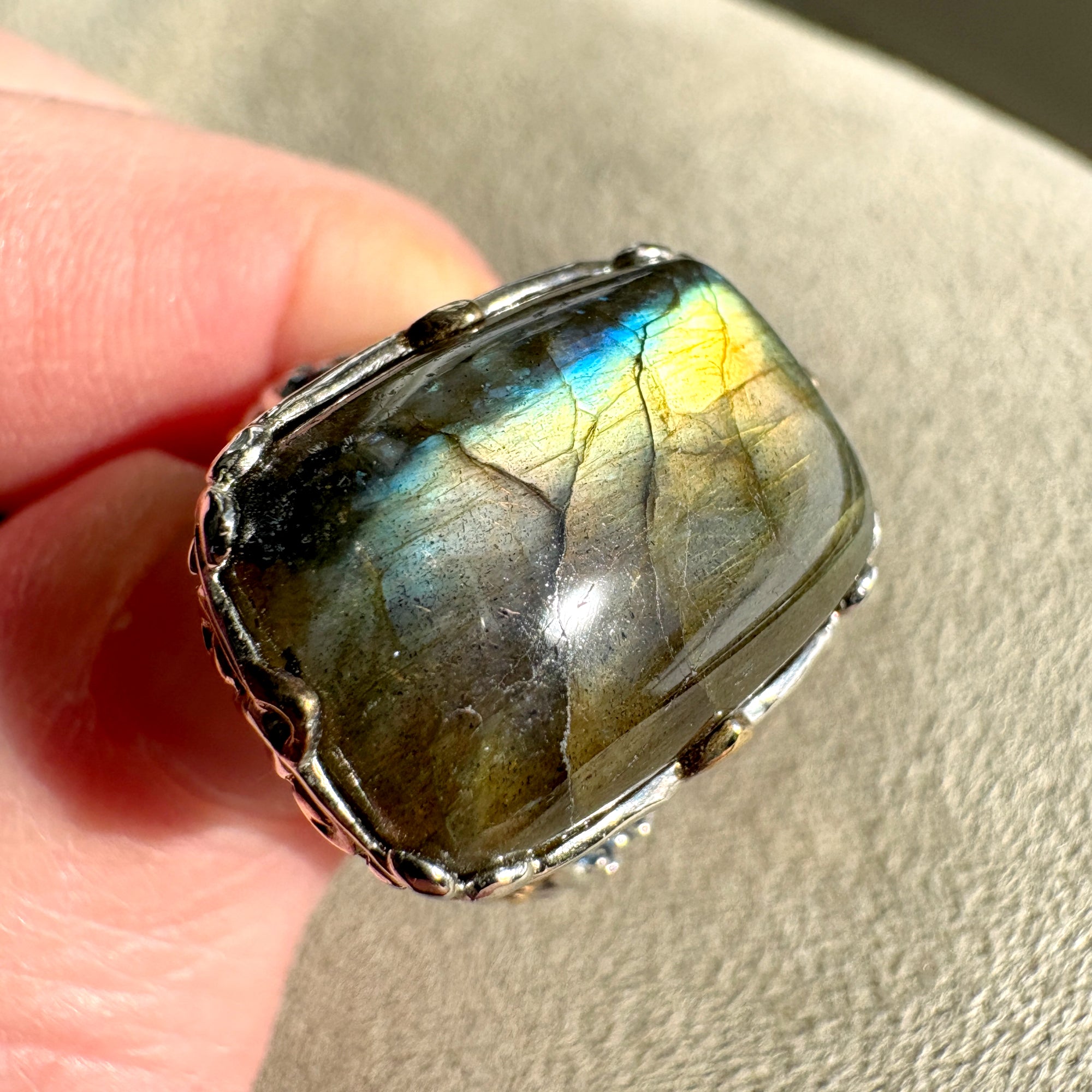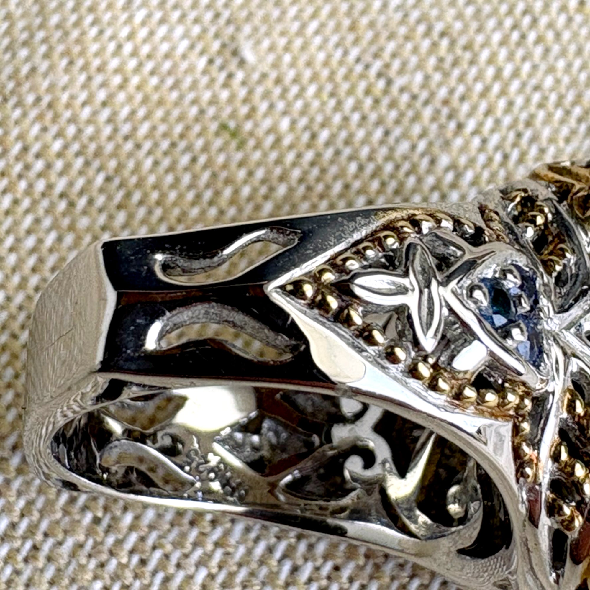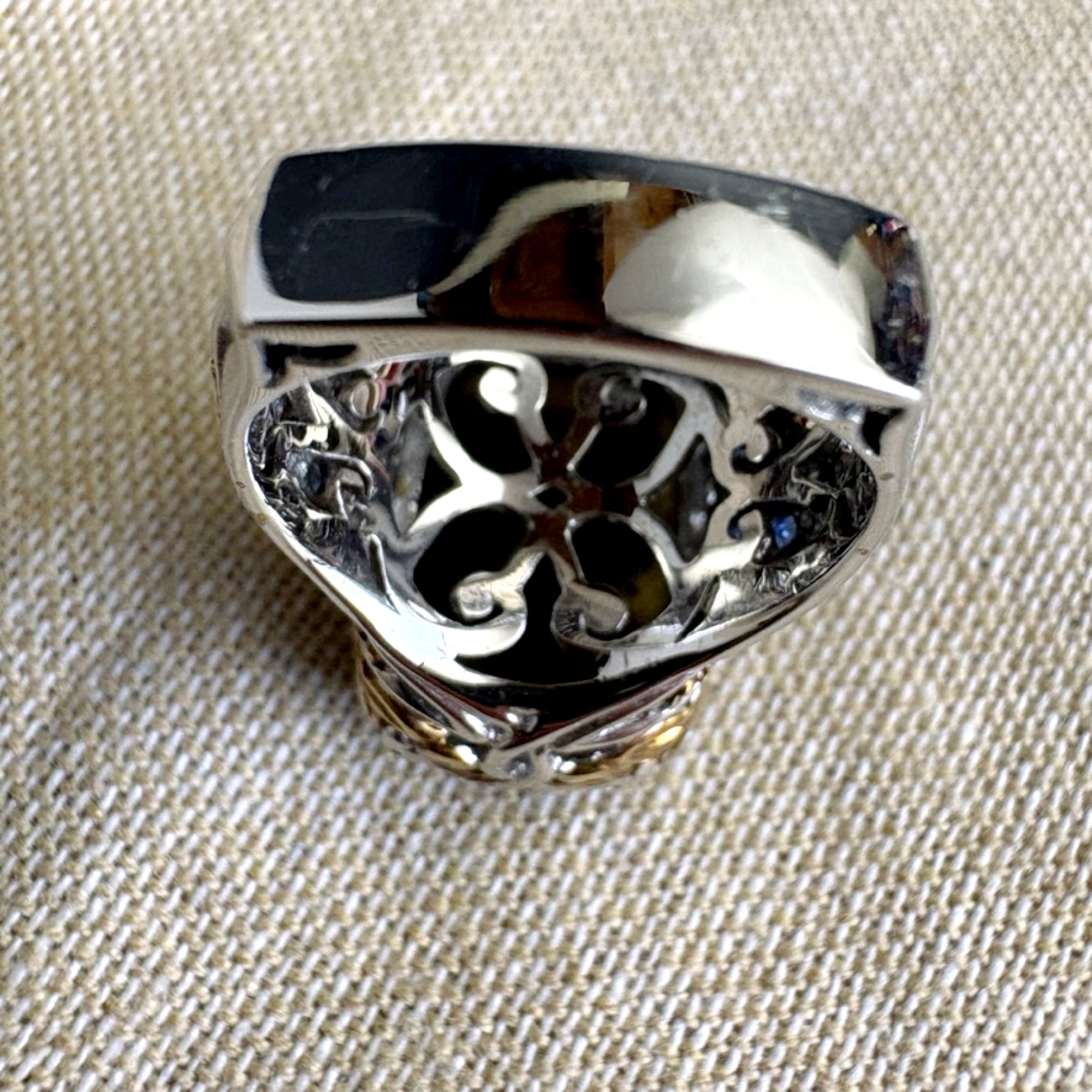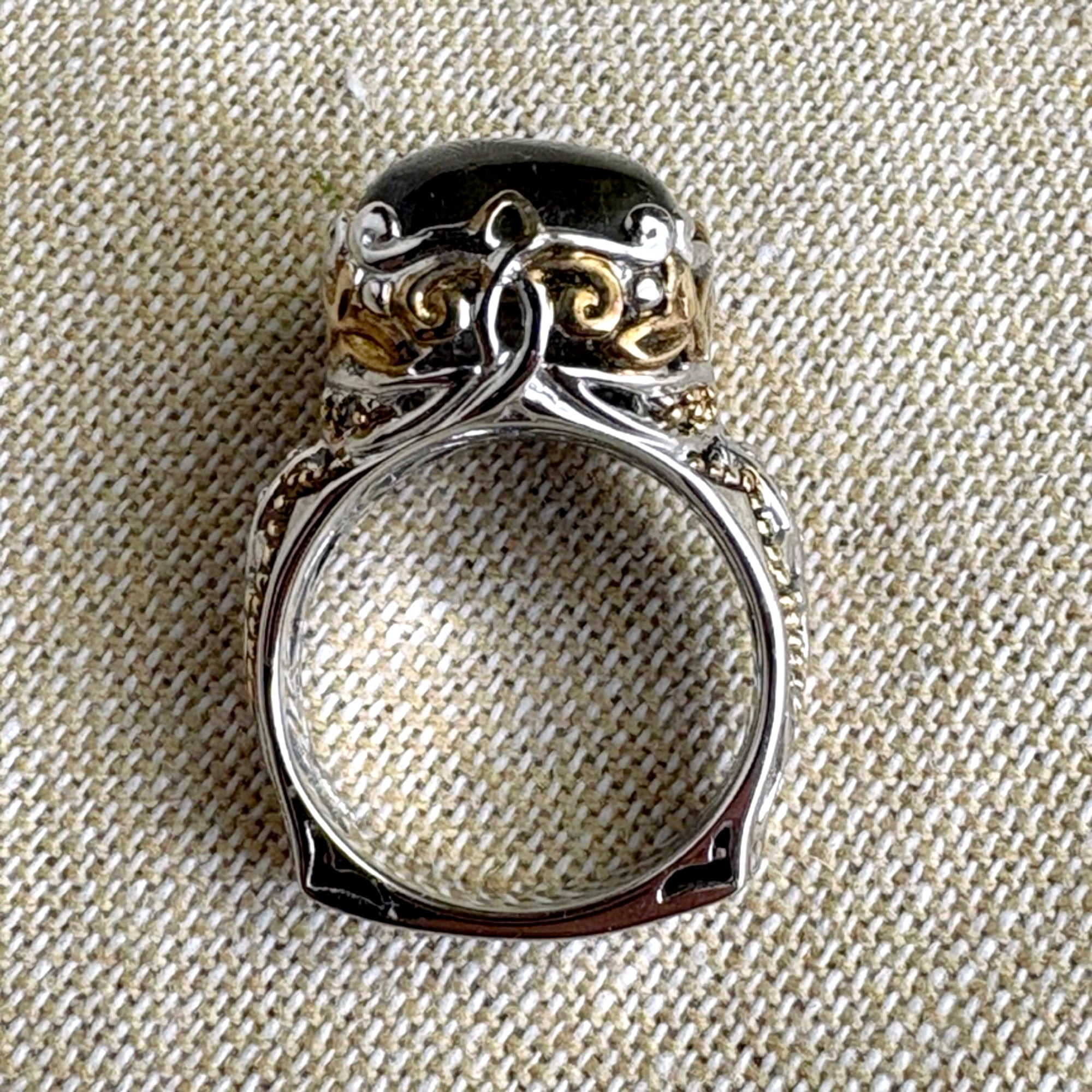 Michael Valitutti Gems En Vogue sterling and labradorite cocktail ring. Olive greens and blues shimmer in this ornately set rectangular stone. Accented on the sides of the band with raised vermeil and sterling and 3 small sapphire colored stones in a heart shape. Marked 925NH