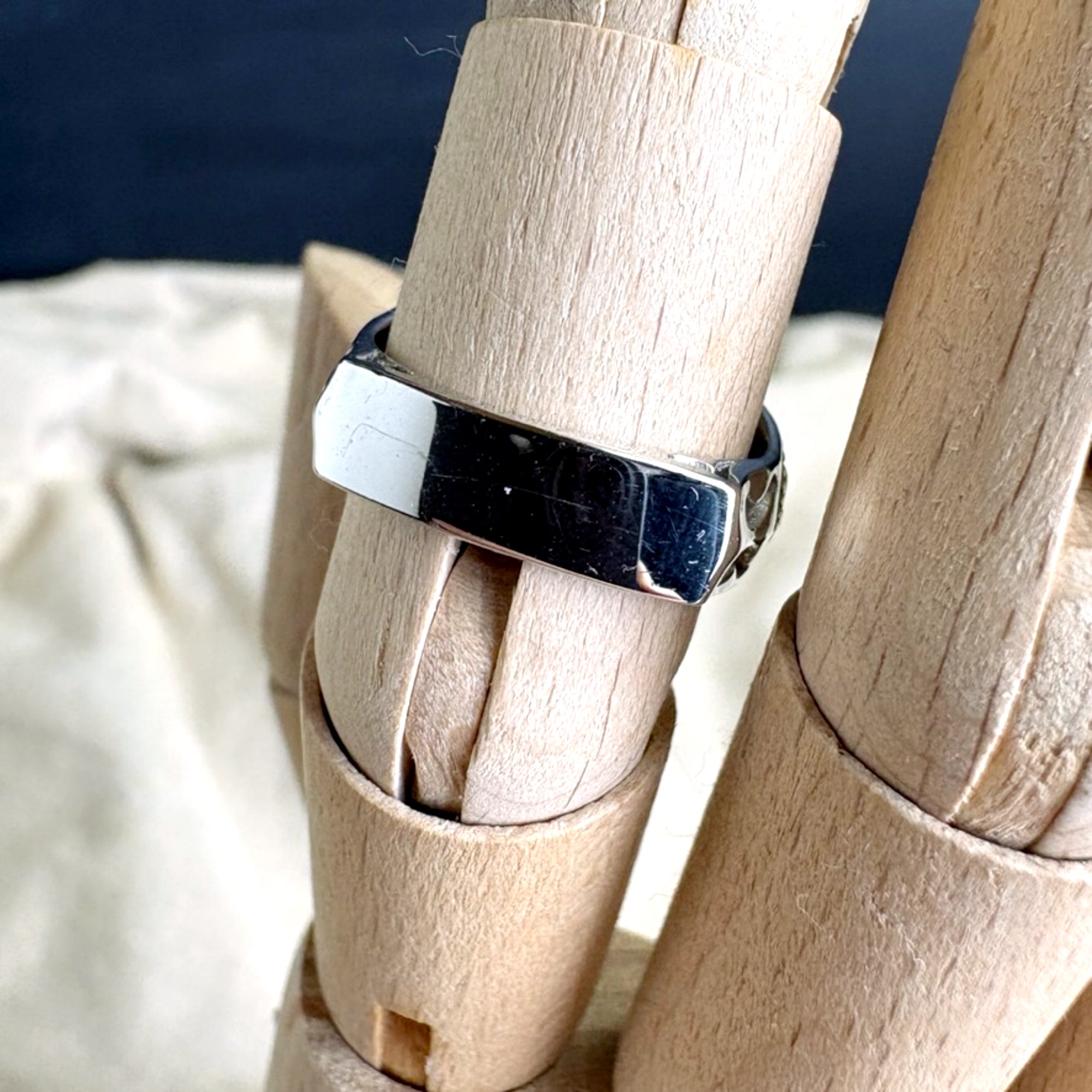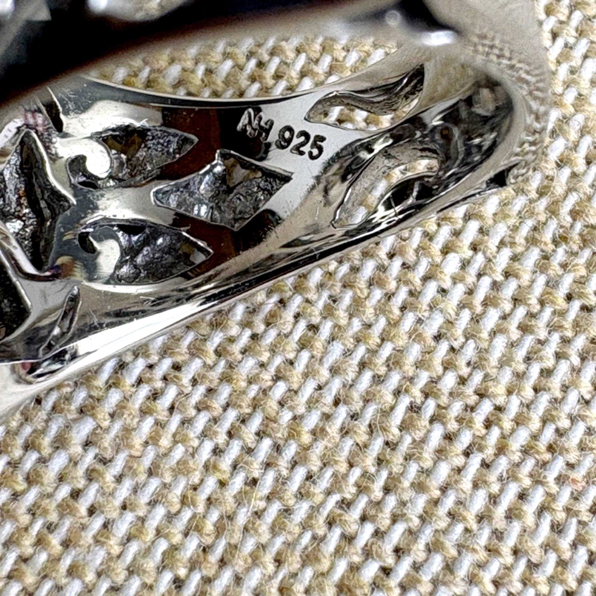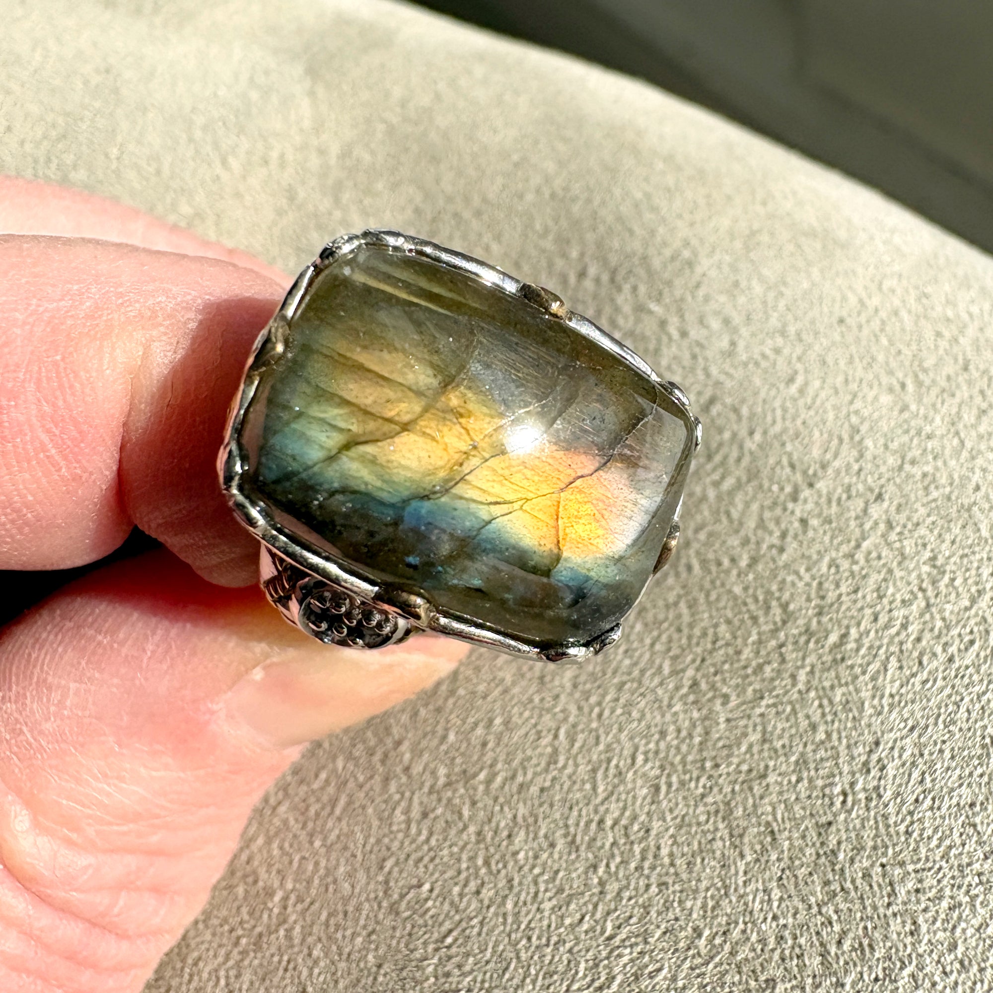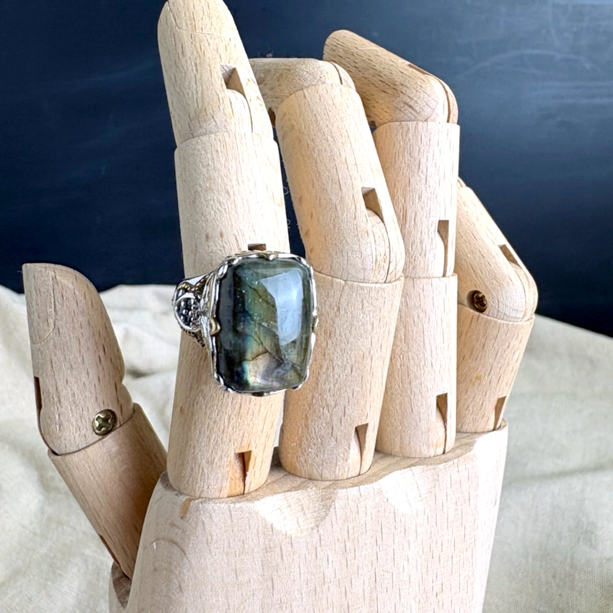 Michael Valitutti Gems En Vogue sterling and labradorite cocktail ring. Olive greens and blues shimmer in this ornately set rectangular stone. Accented on the sides of the band with raised vermeil and sterling and 3 small sapphire colored stones in a heart shape. Marked 925NH