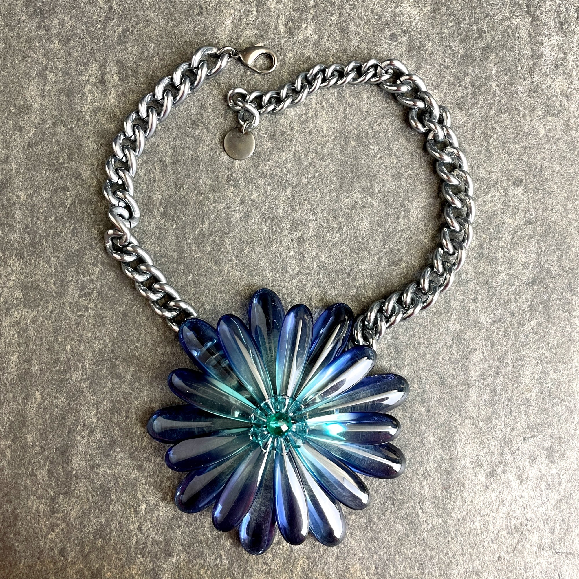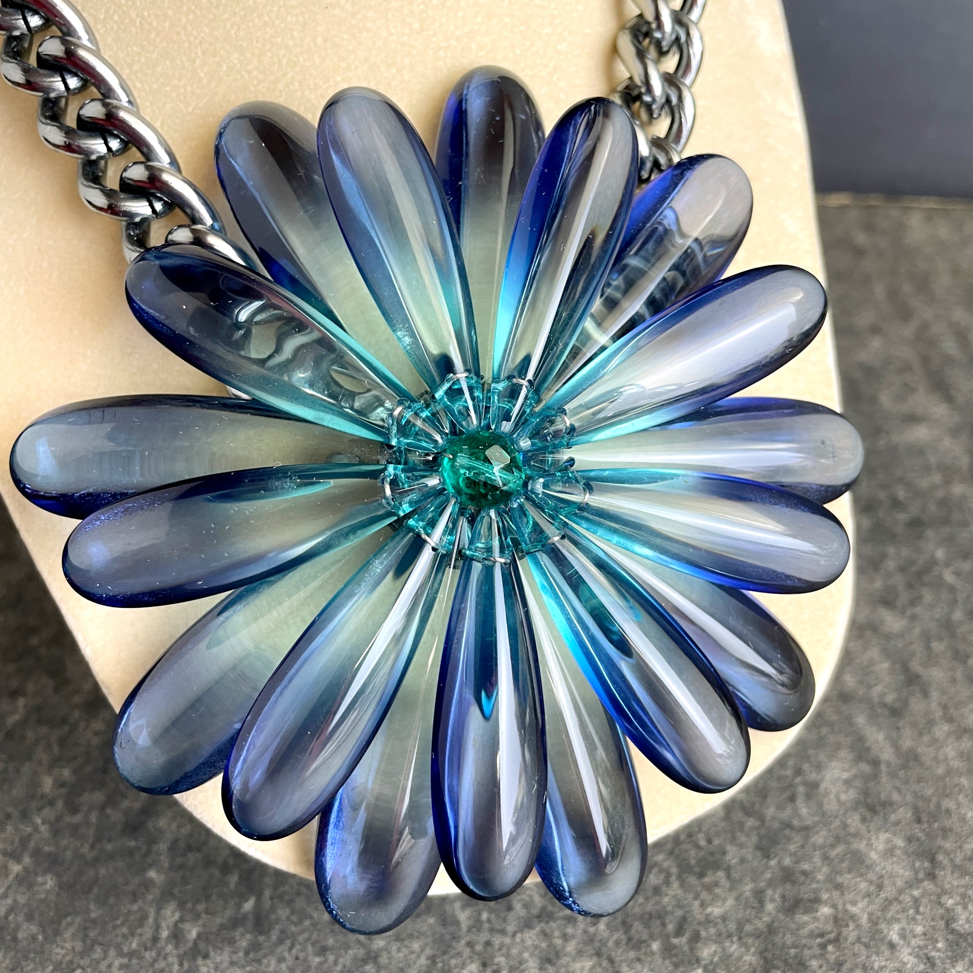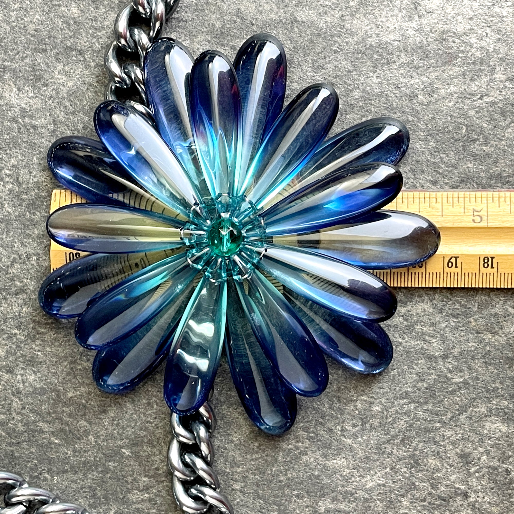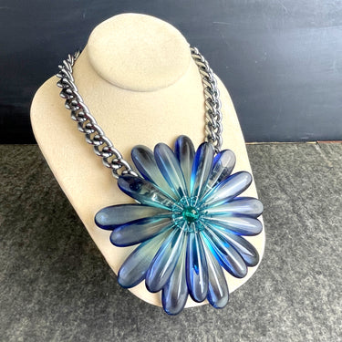 PONO blue resin flower statement necklace. Flower has two rows of rounded petals. Silver colored chunky chain with lobster claw clasp. Made in Italy. In original Museum of Fine Arts, Boston gift.