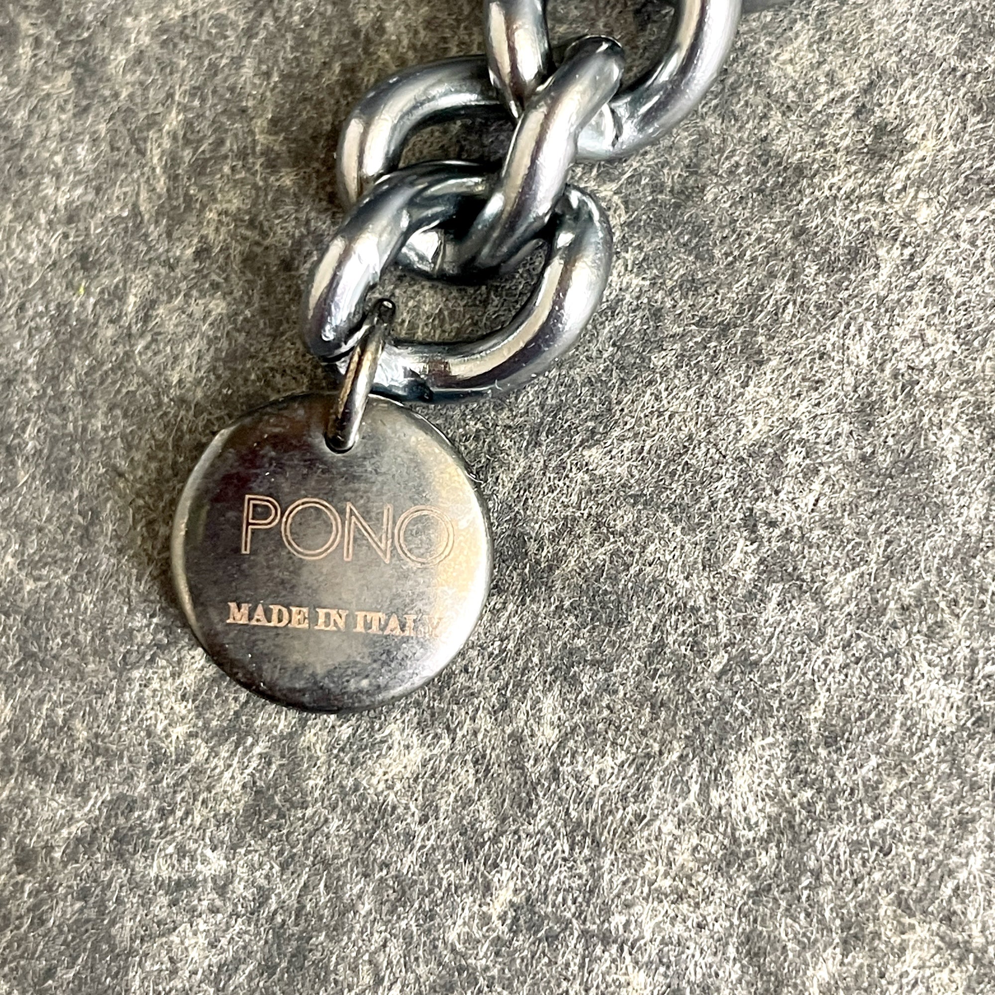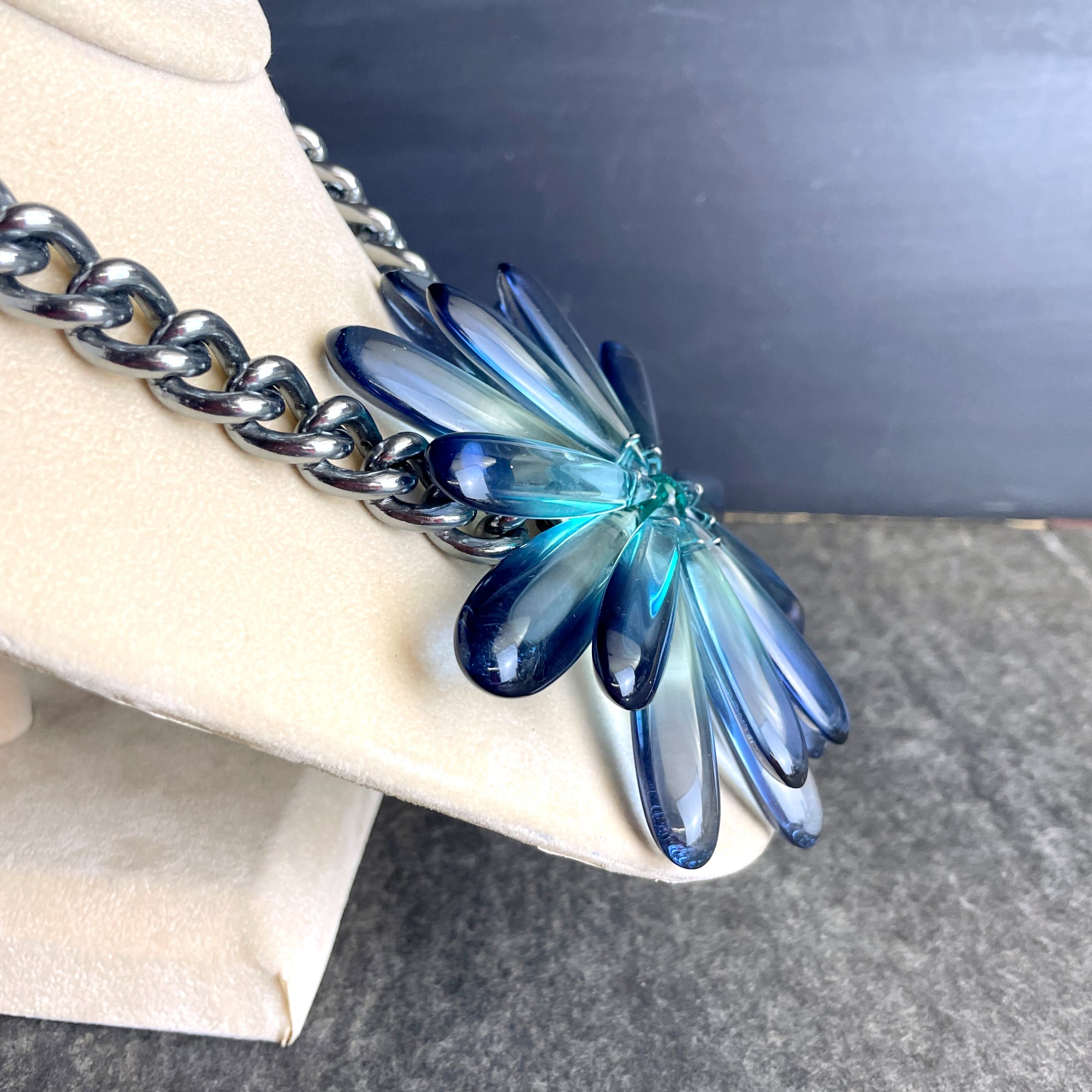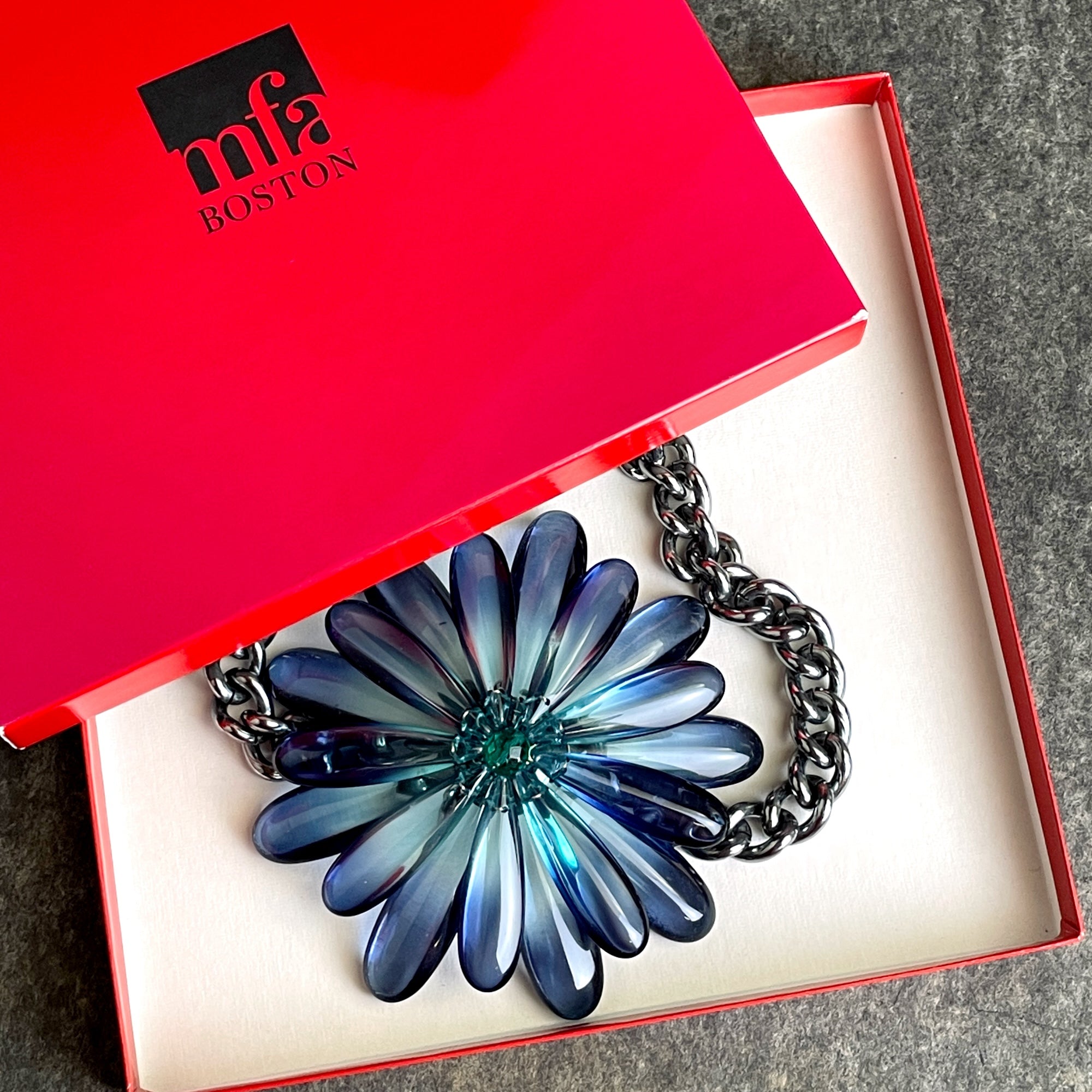 PONO blue resin flower statement necklace. Flower has two rows of rounded petals. Silver colored chunky chain with lobster claw clasp. Made in Italy. In original Museum of Fine Arts, Boston gift.