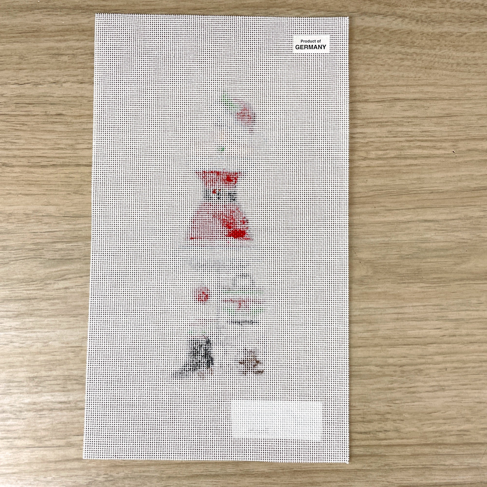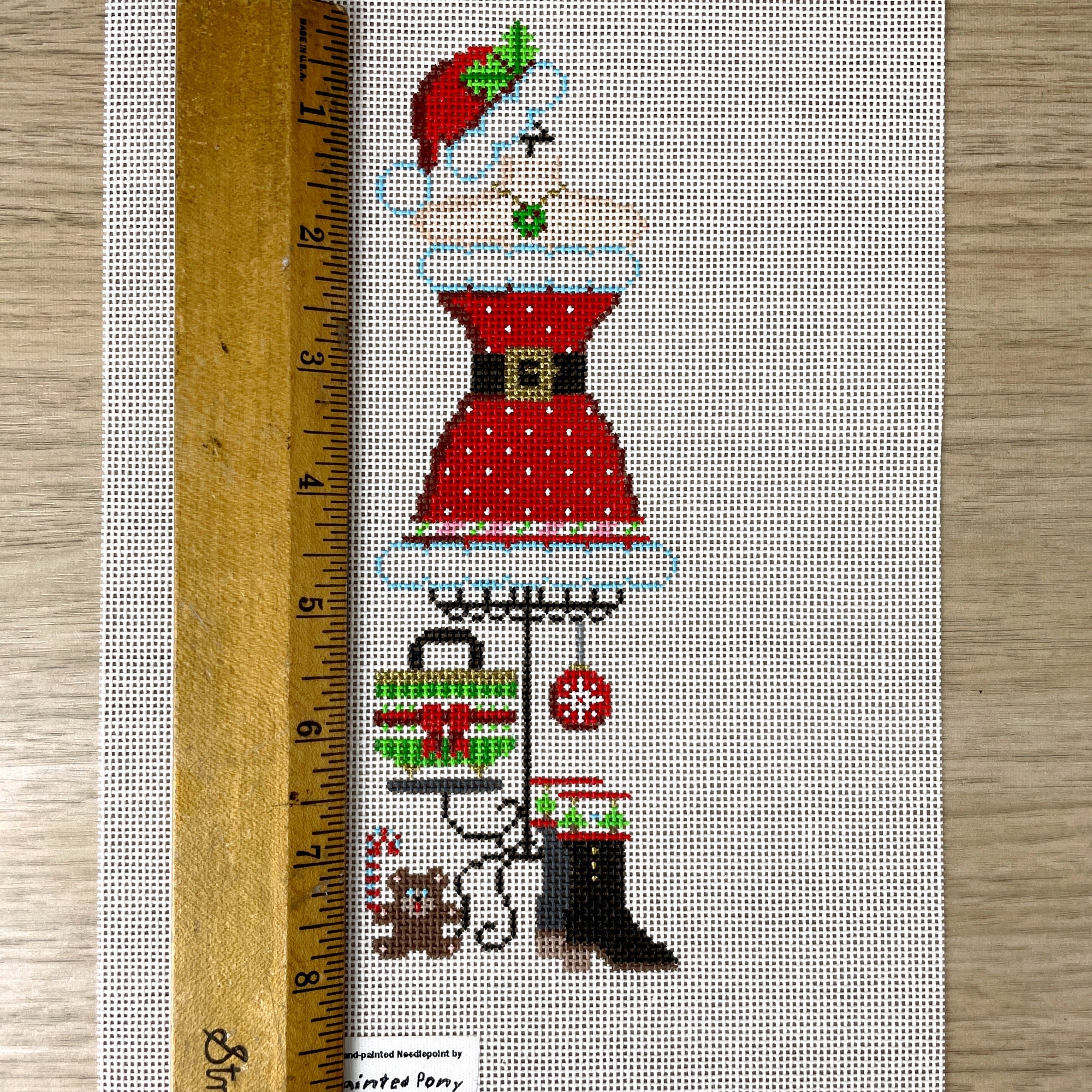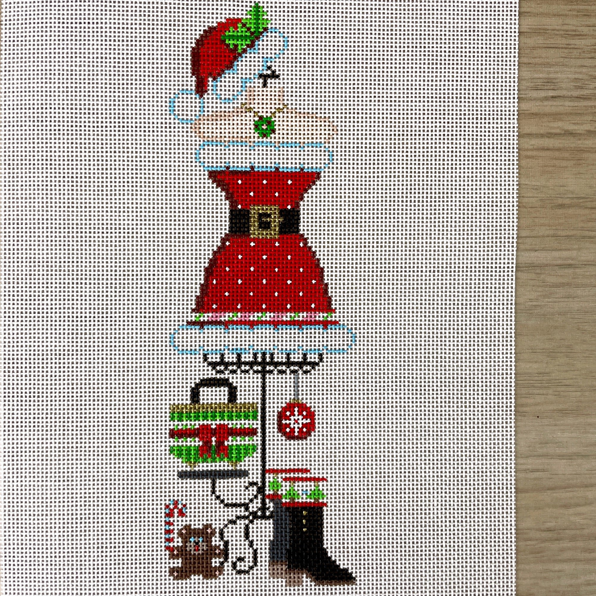 Handpainted needlepoint canvas of a Christmas Dress Form from Painted Pony Designs. Part of a series. #350AL. Retail $80.