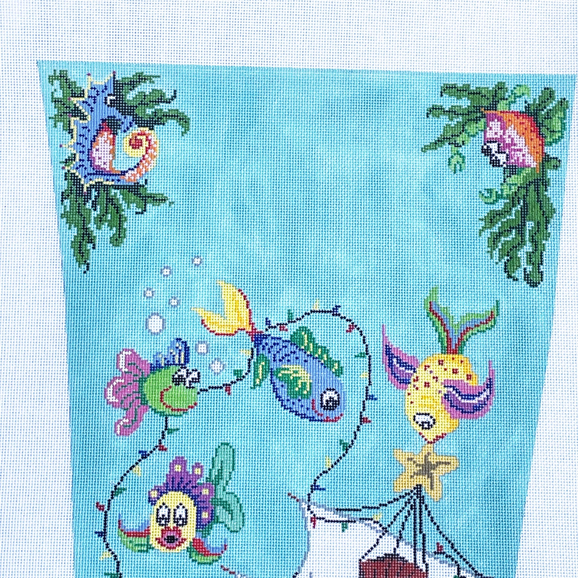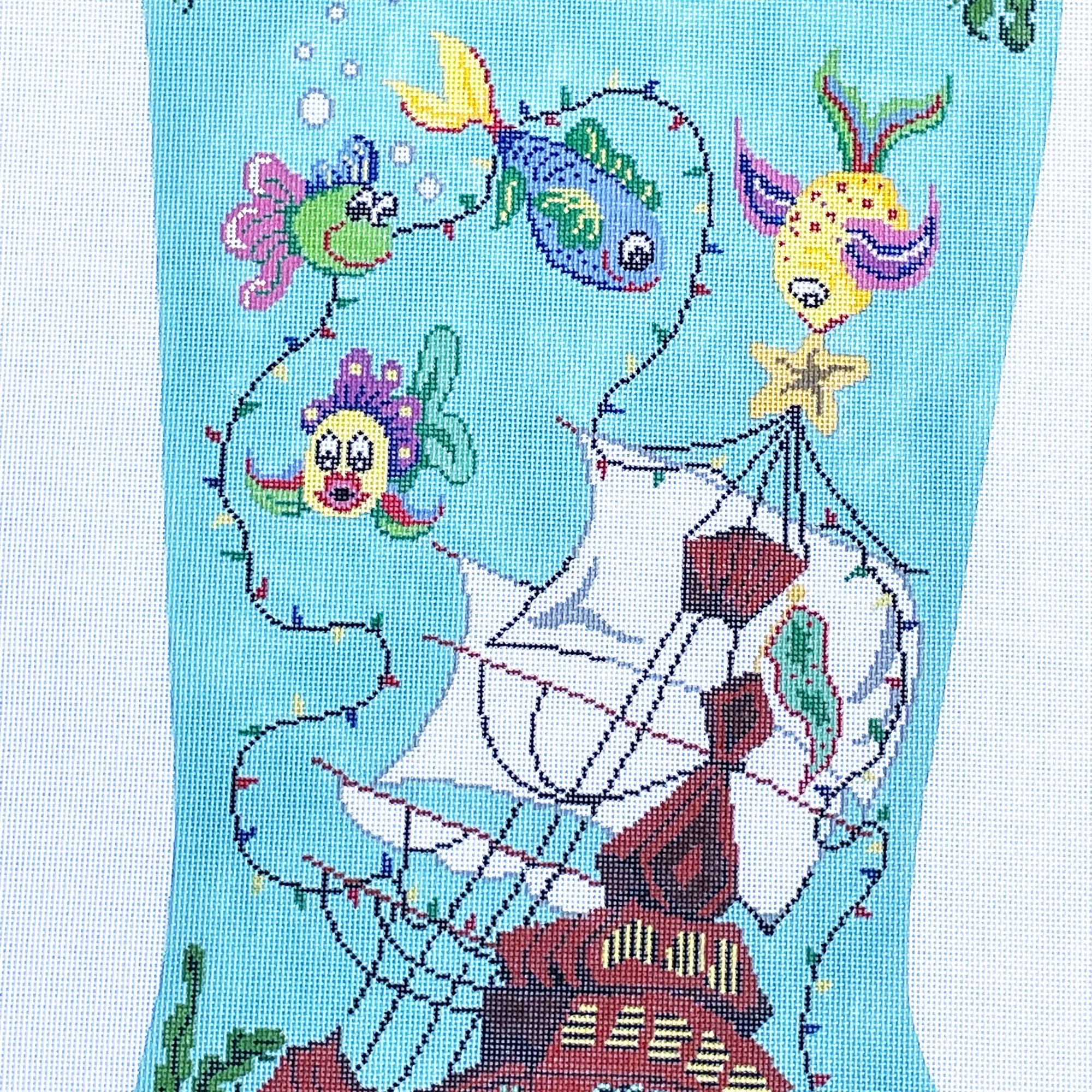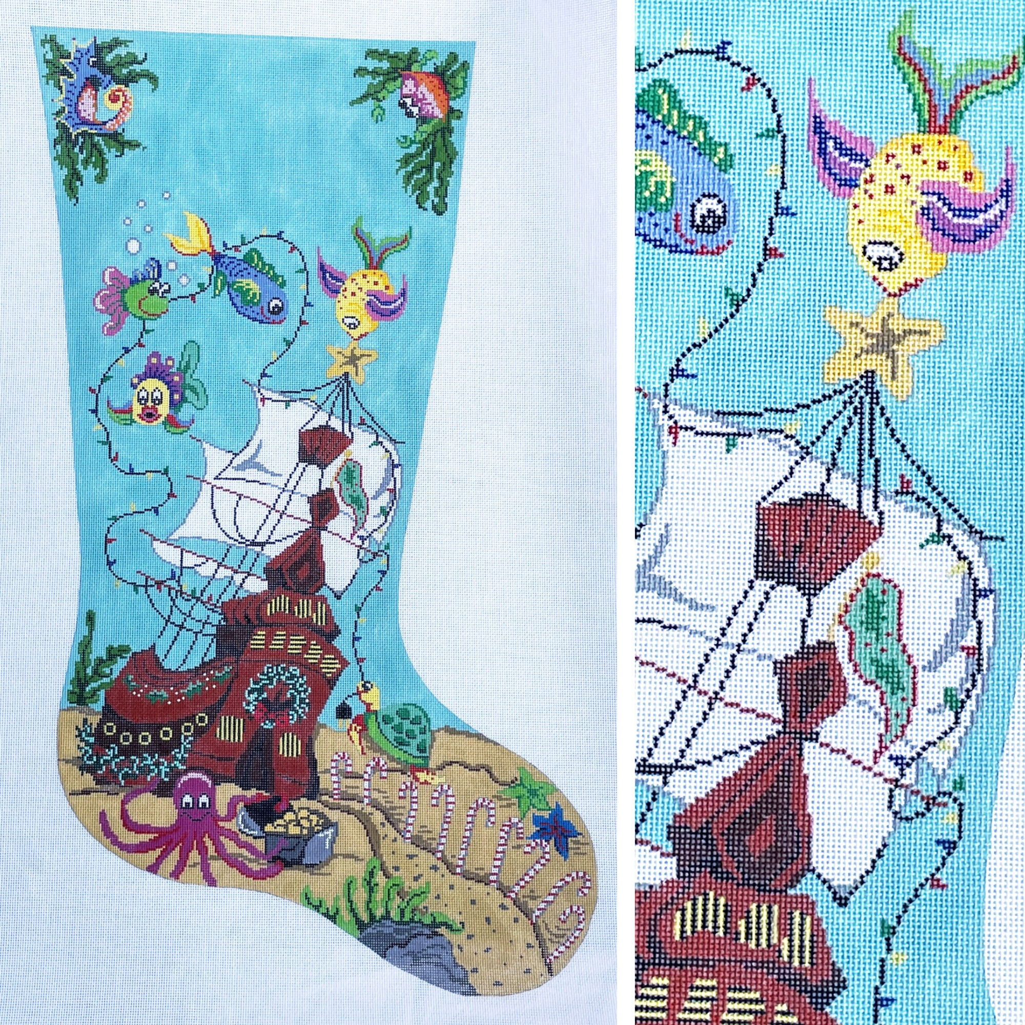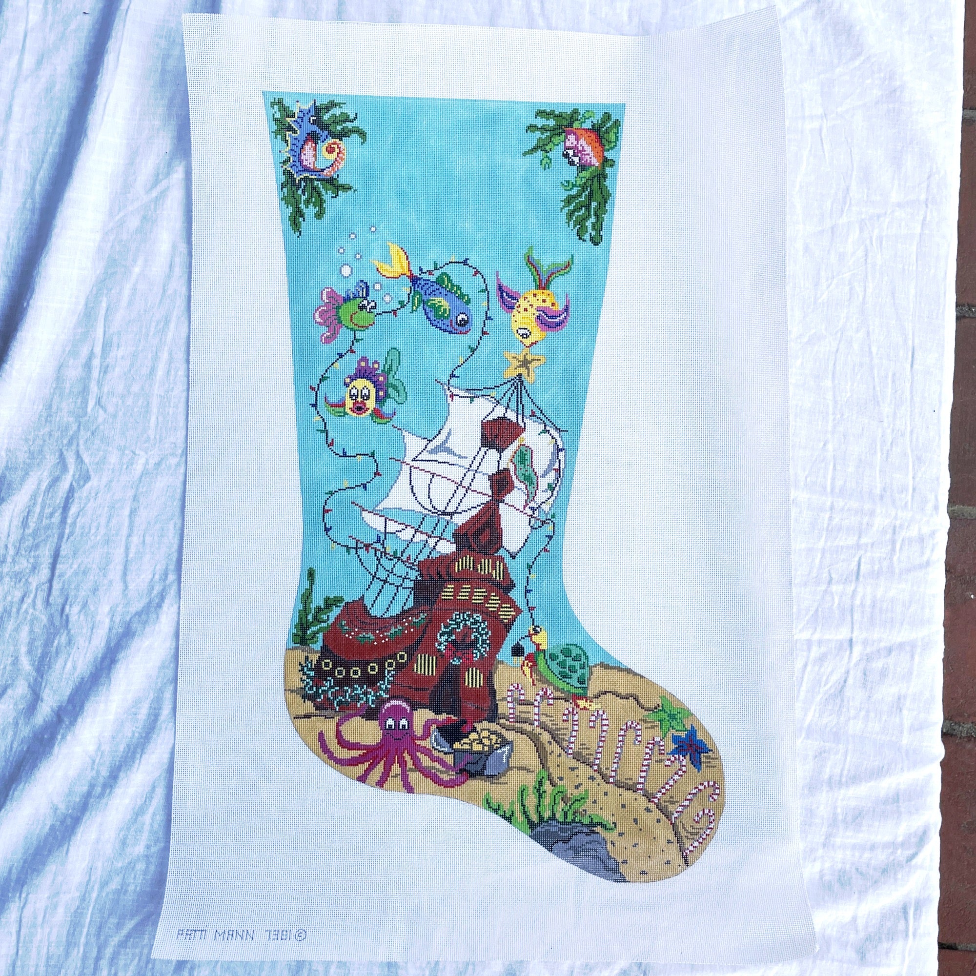 Super fun Patti Mann "Sunken Ship" Christmas stocking handpainted needlepoint canvas #7381. Look at those happy fish and the octopus. Wait a minute, what's that's turtle doing with a plug--doesn't he know electricity and water don't mix? Naughty turtle. Retail $390.