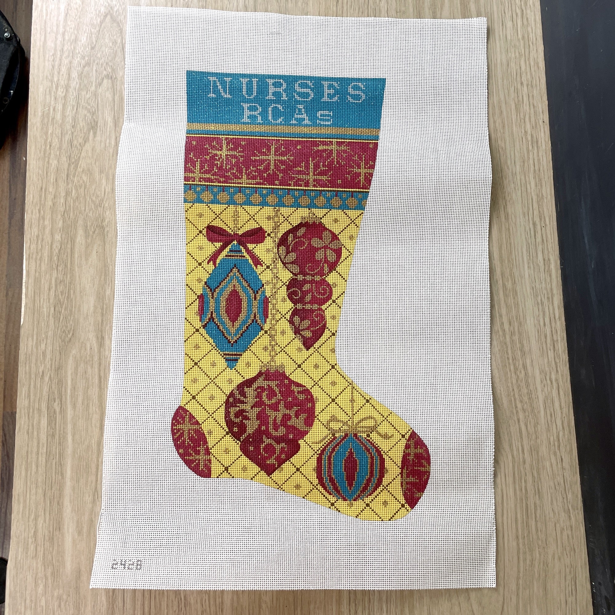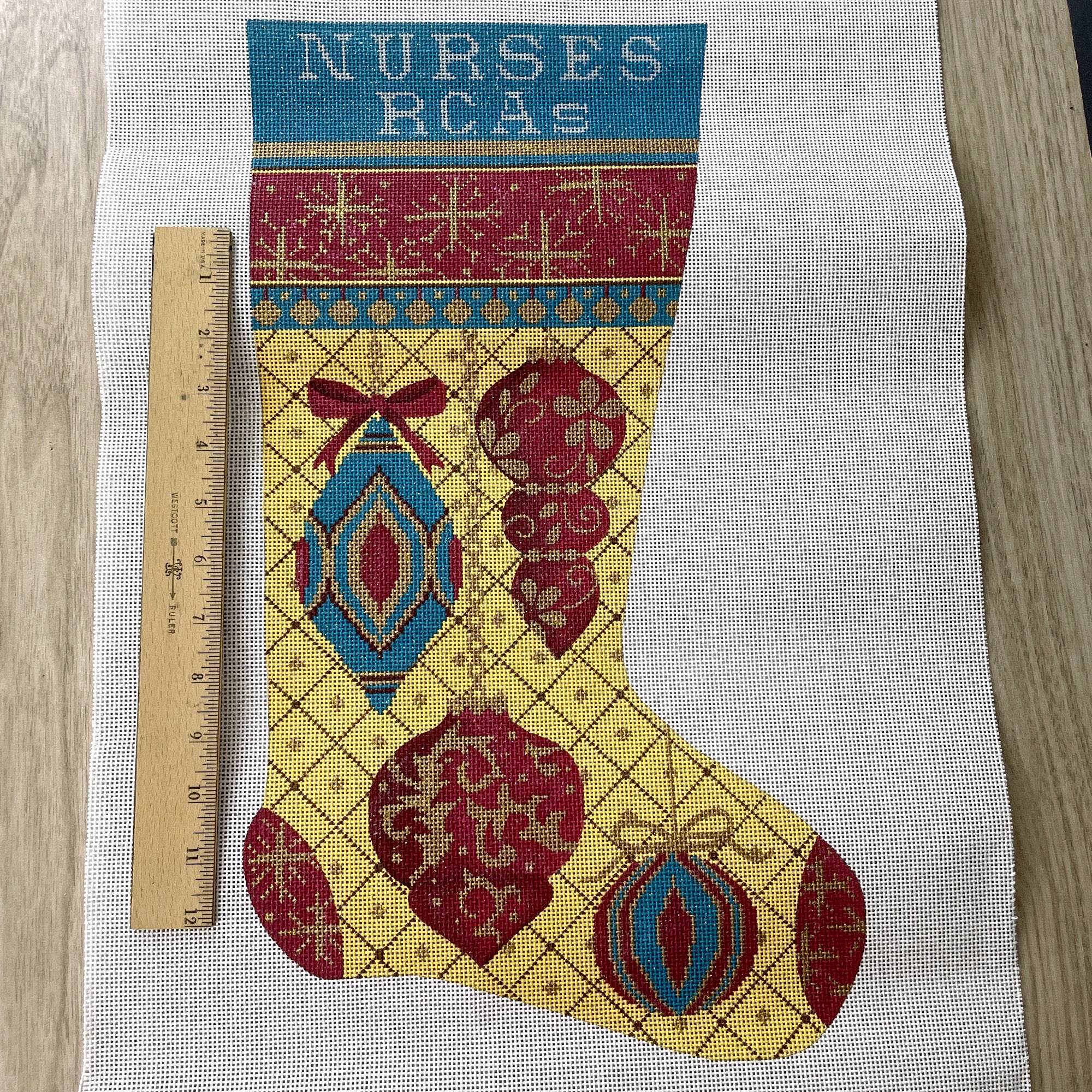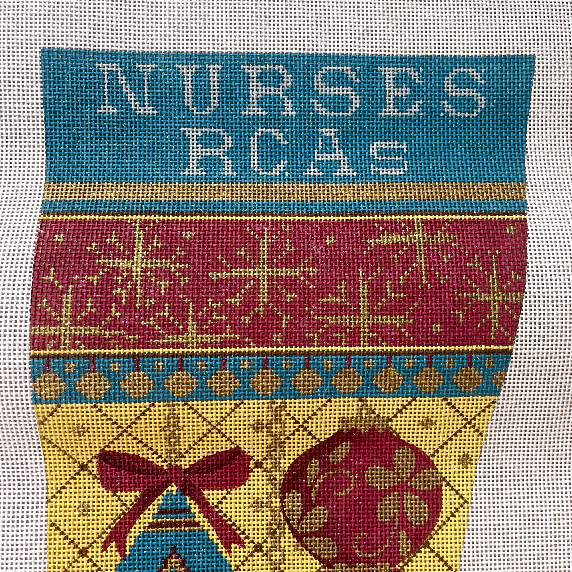 Top of stocking has "Nurses - RCAs" painted in. Stitch over it with a name of your own.