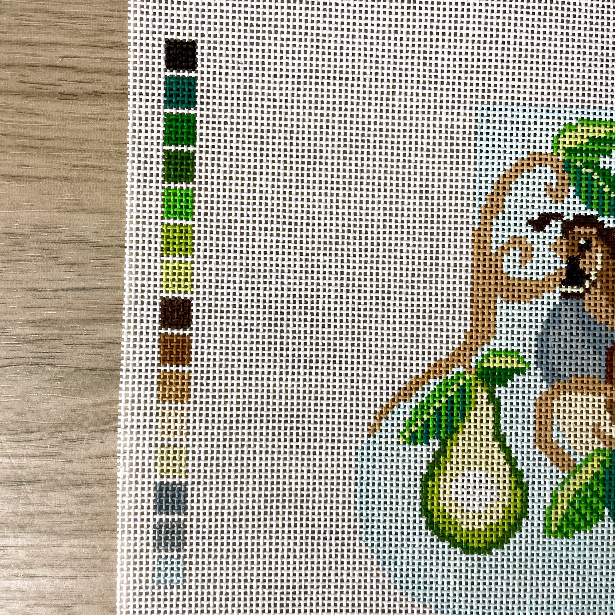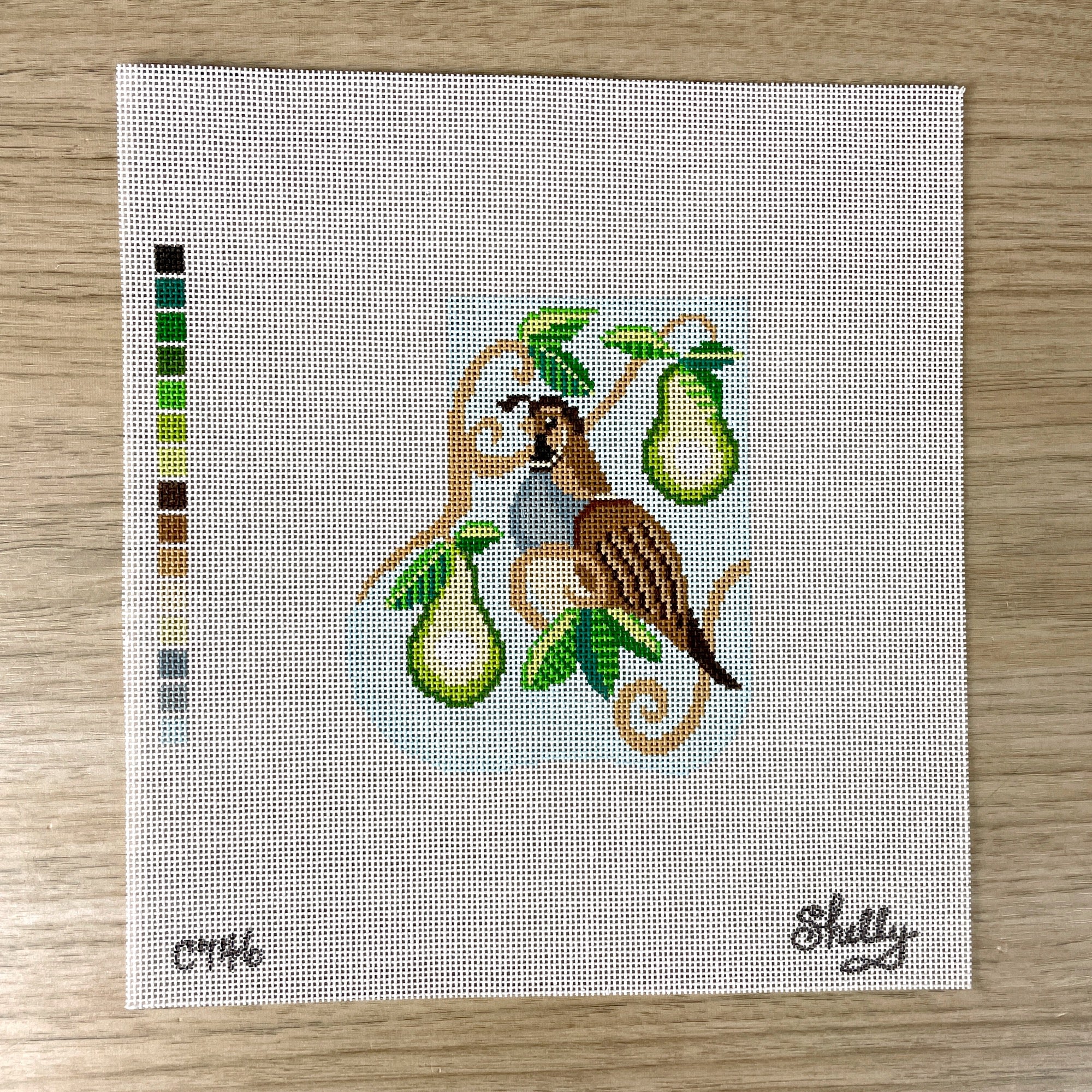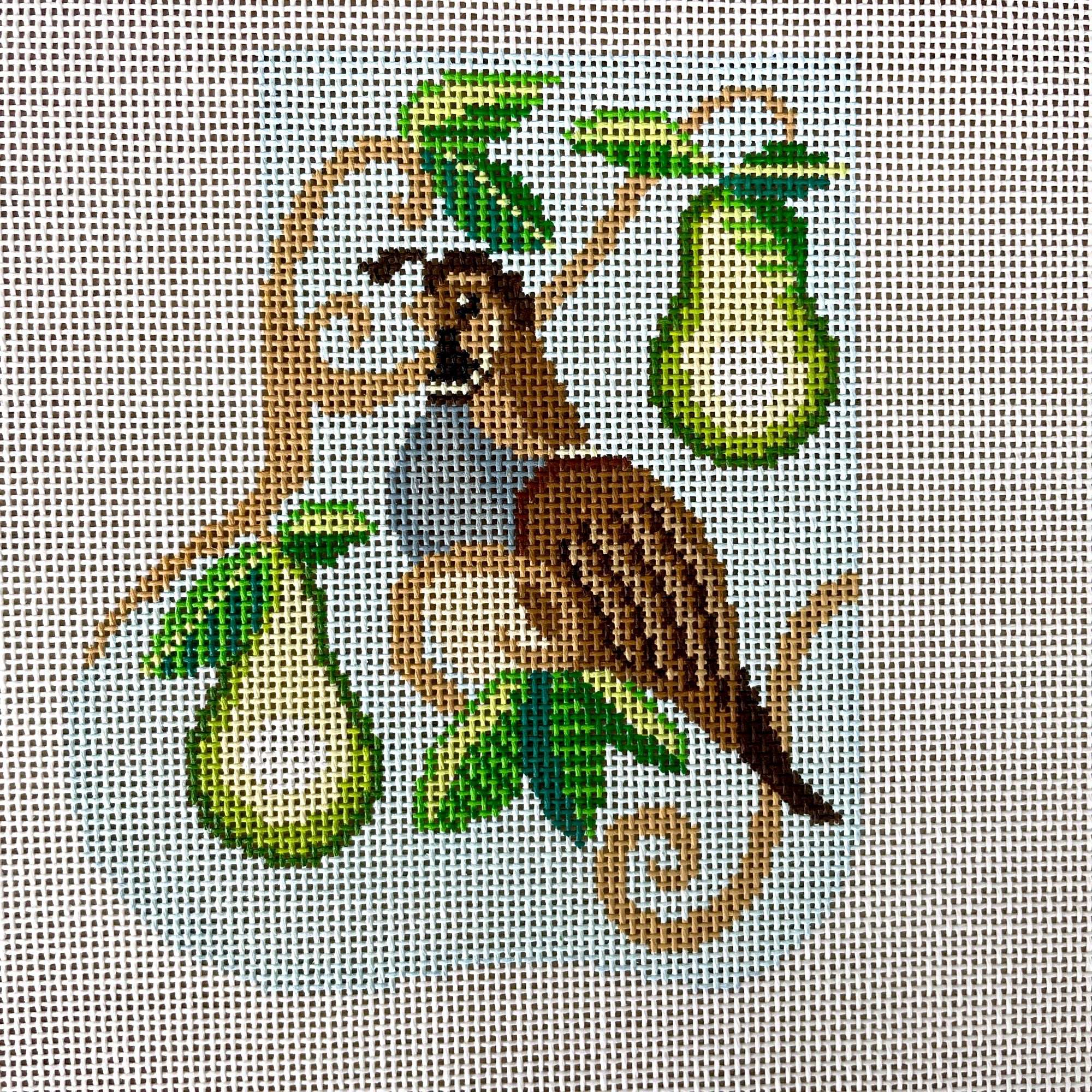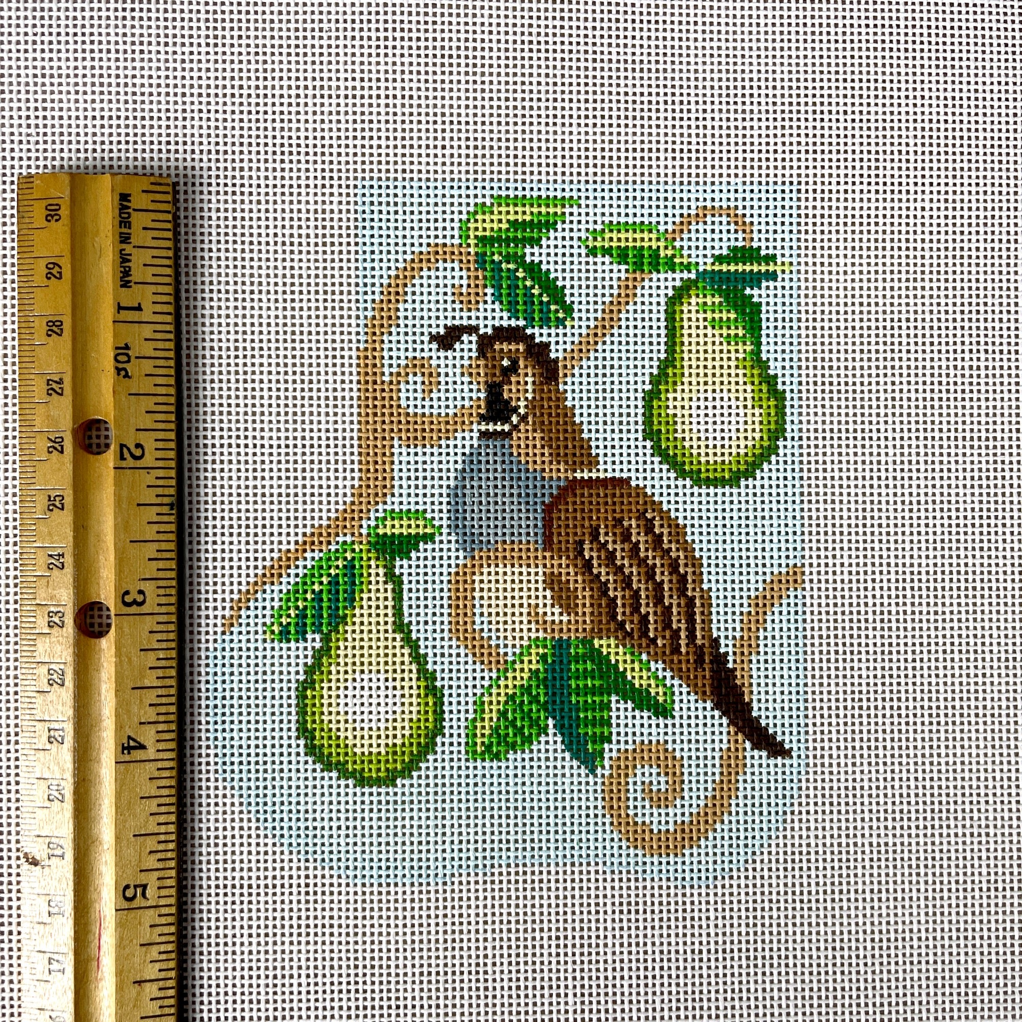A Partridge in a Pear Tree mini stocking handpainted needlepoint canvas from Shelly Tribbey, #C746. Retail $65. (We think you could also call it a Partridge in an Avocado tree if you change the center to a pit color.)