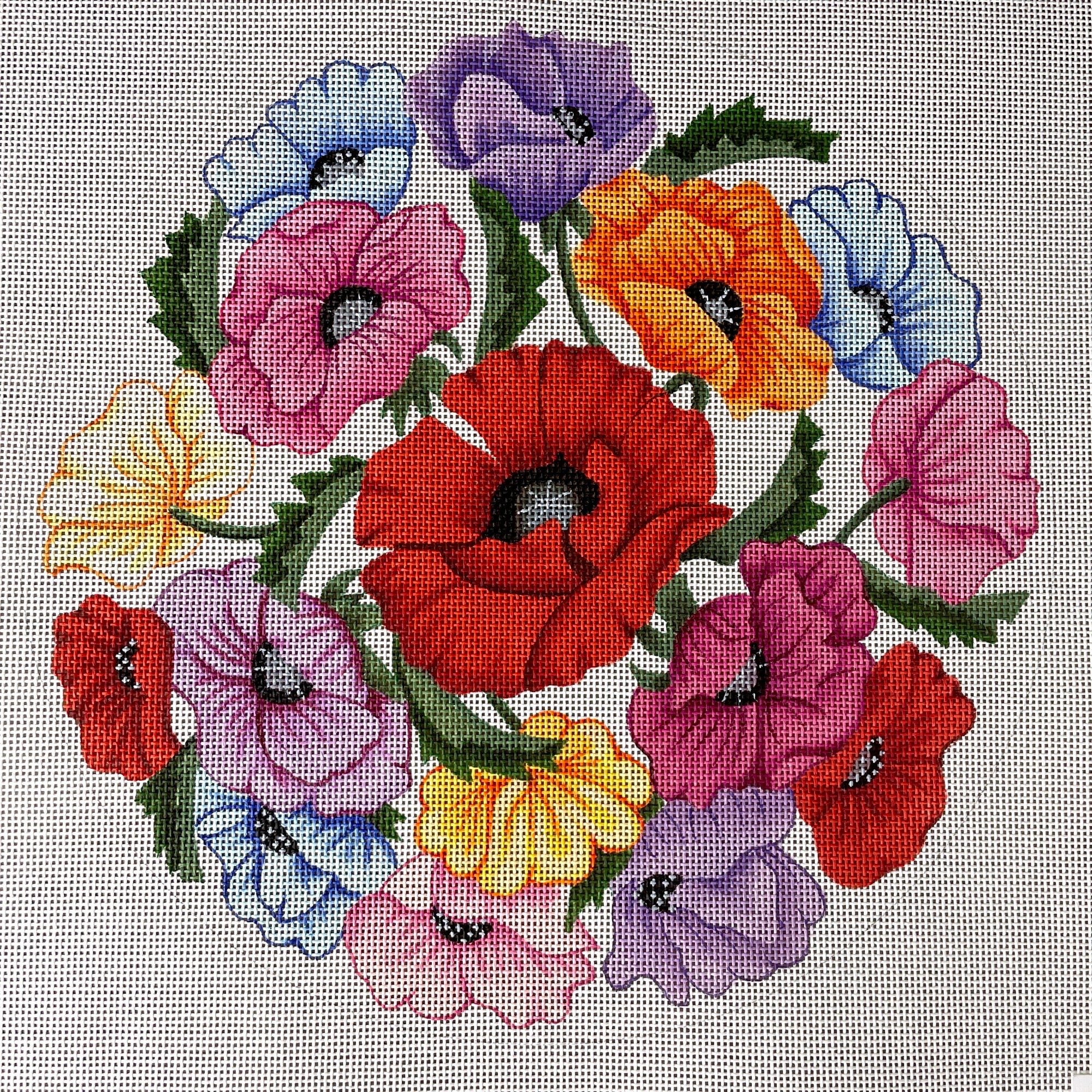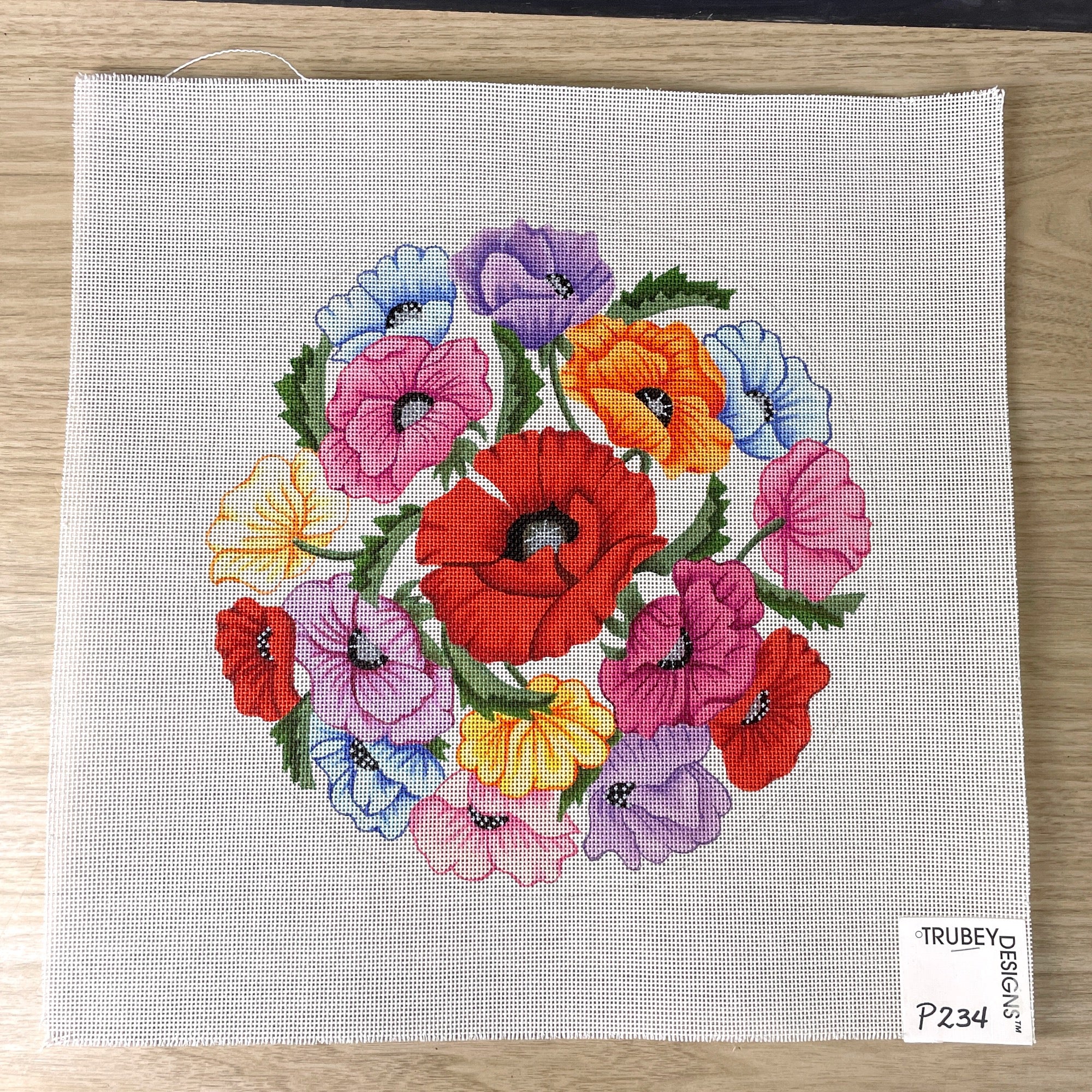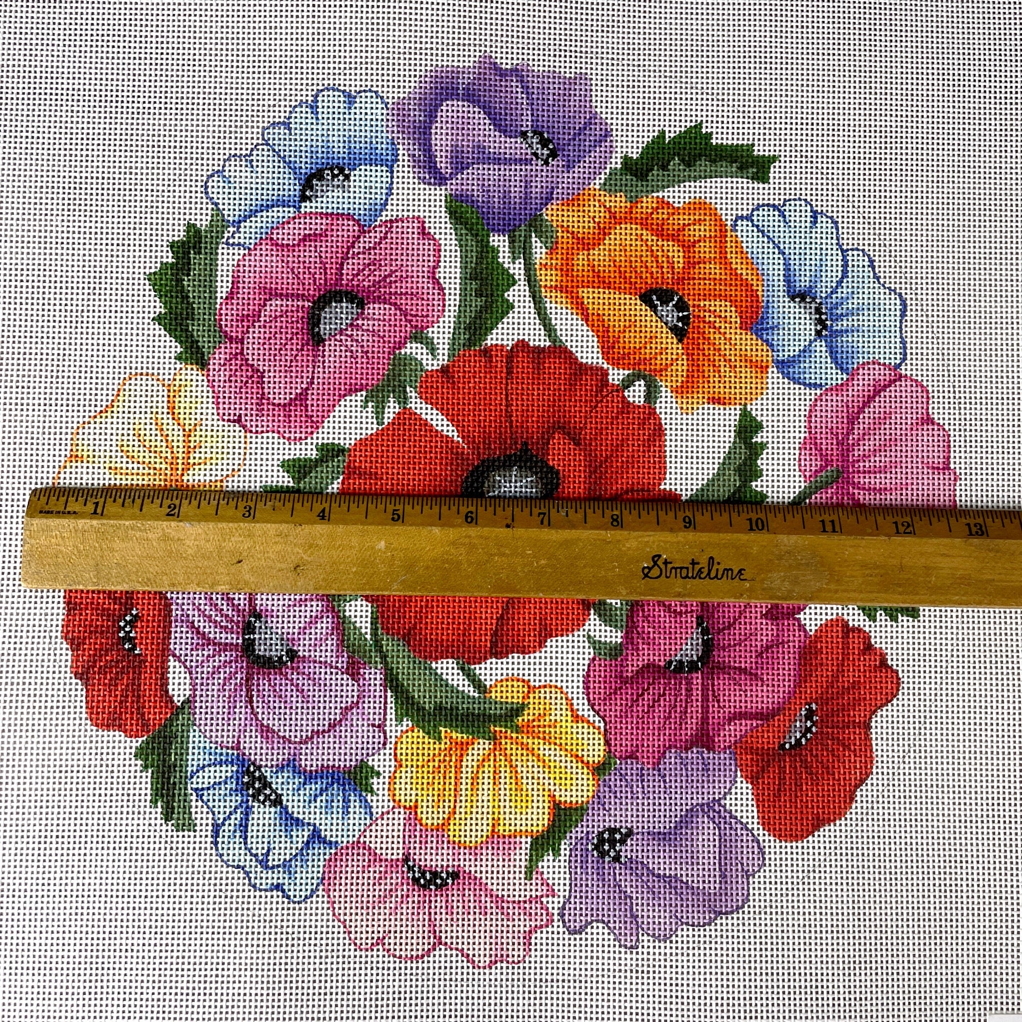 Trubey Designs handpainted needlepoint canvas for a round Poppies Pillow, #P234. Retail $155.