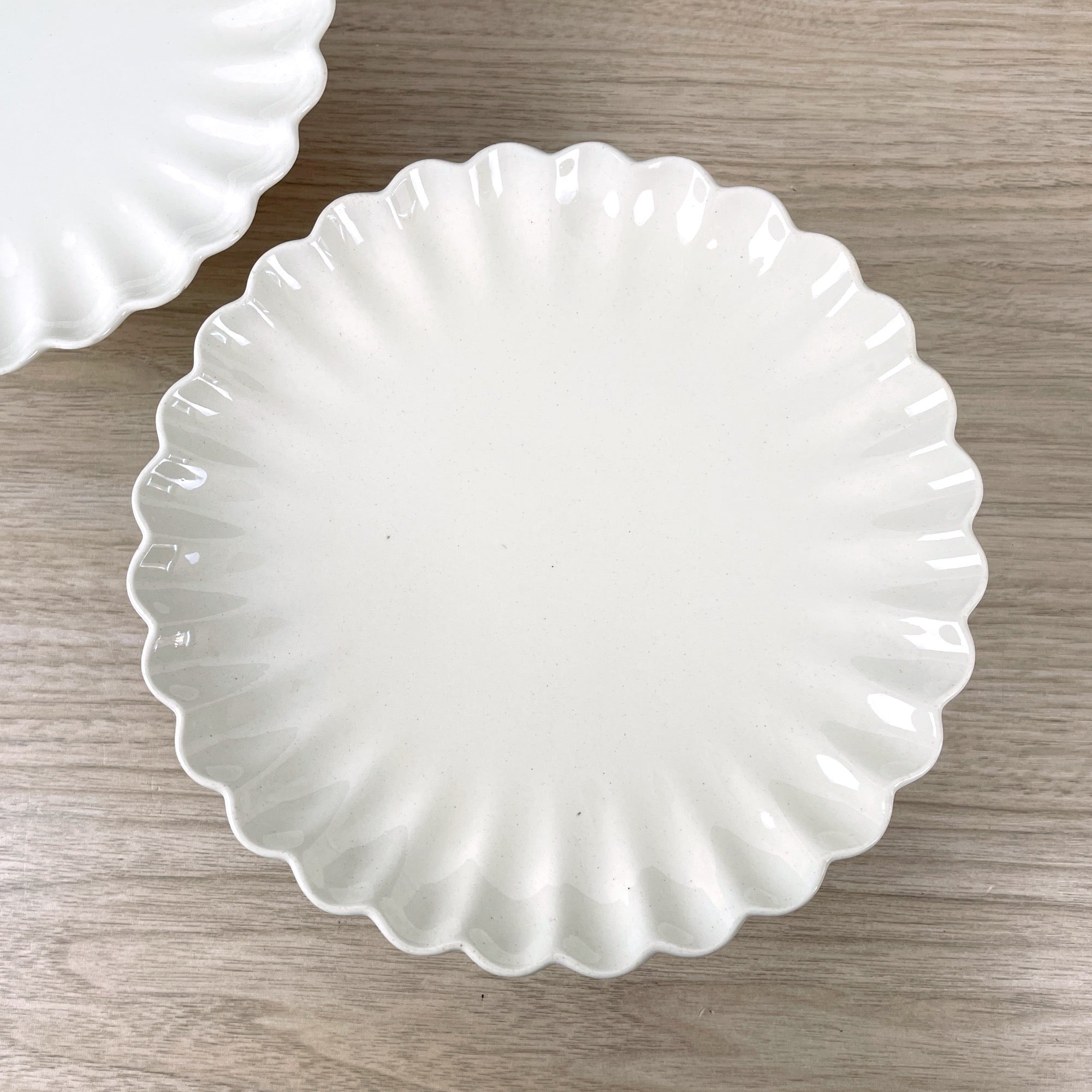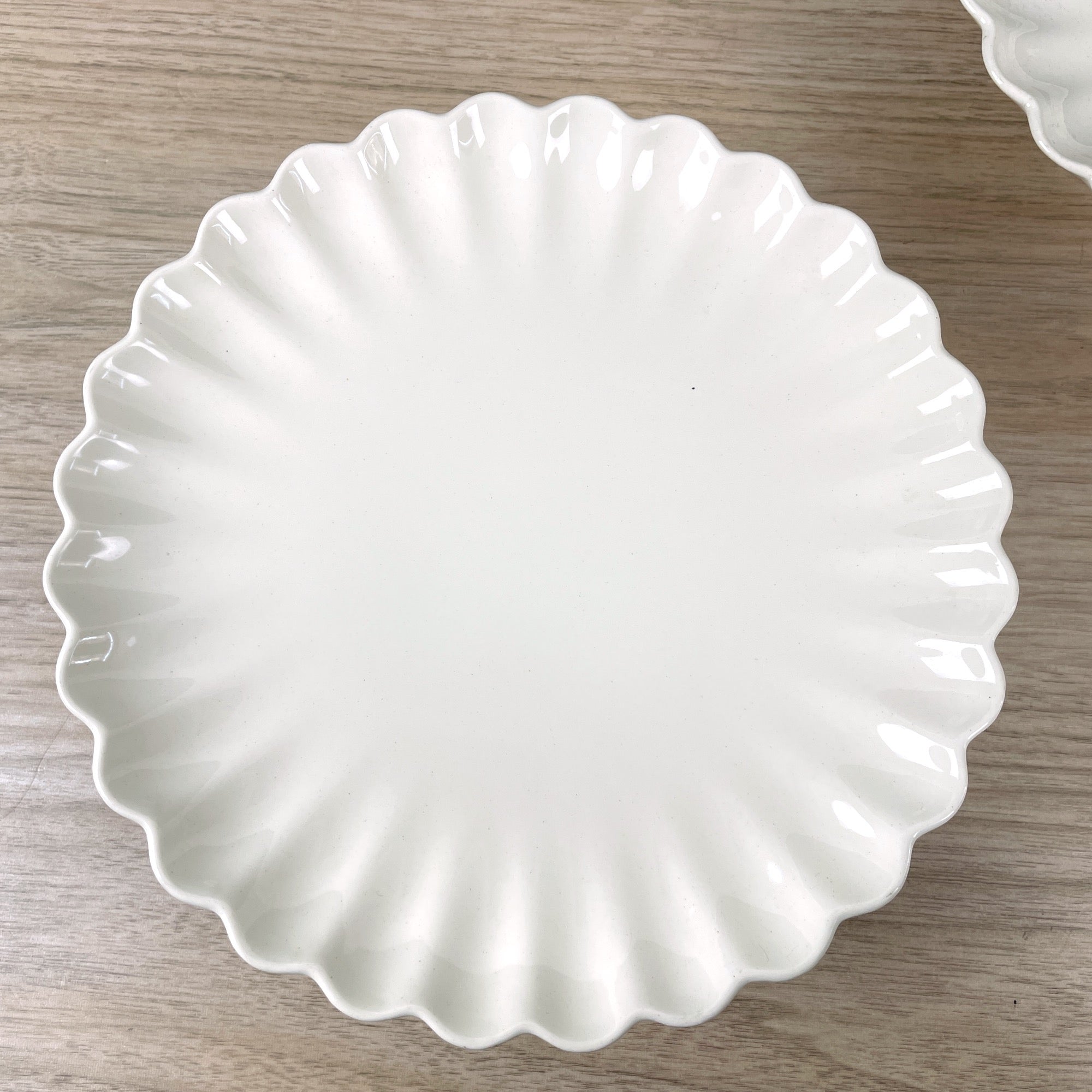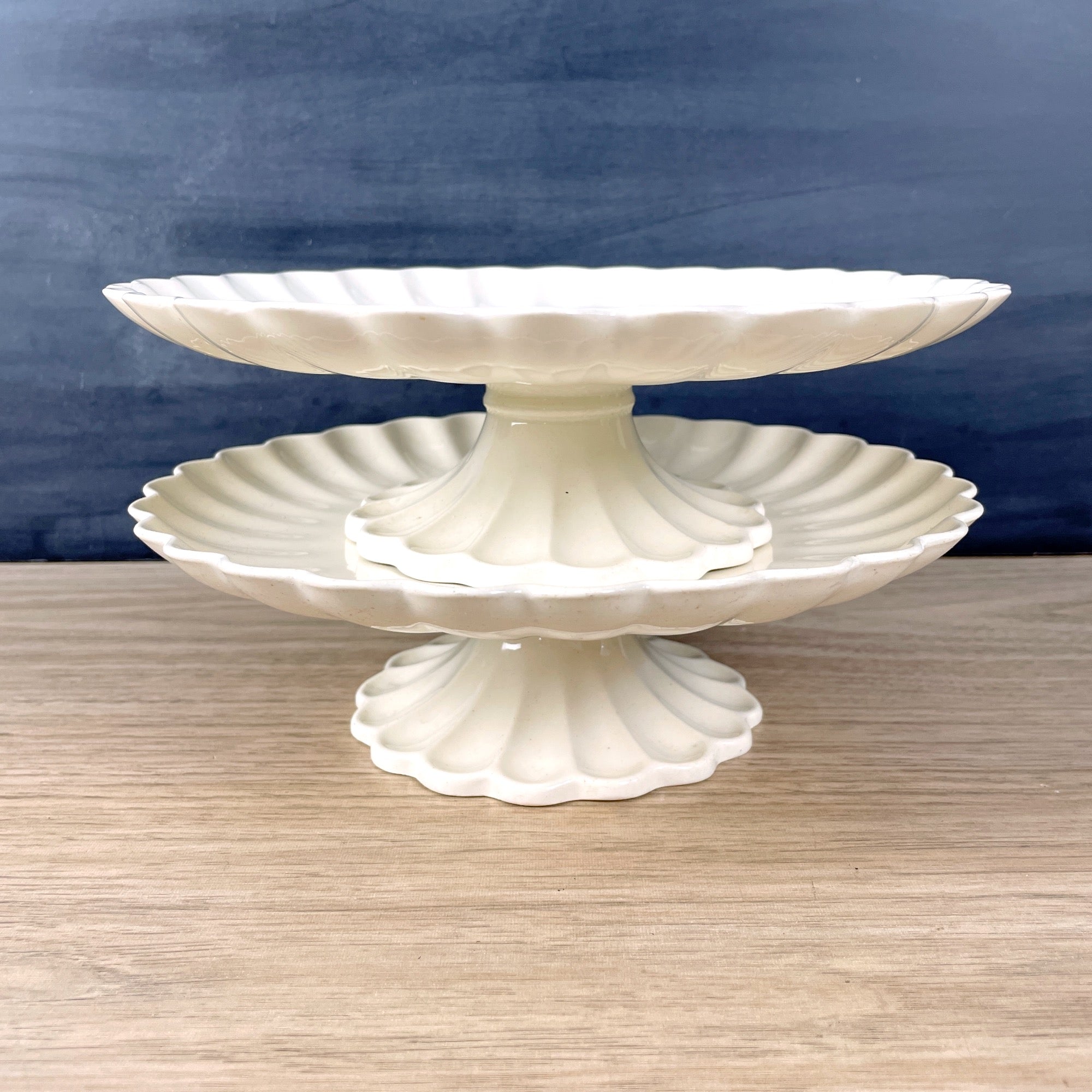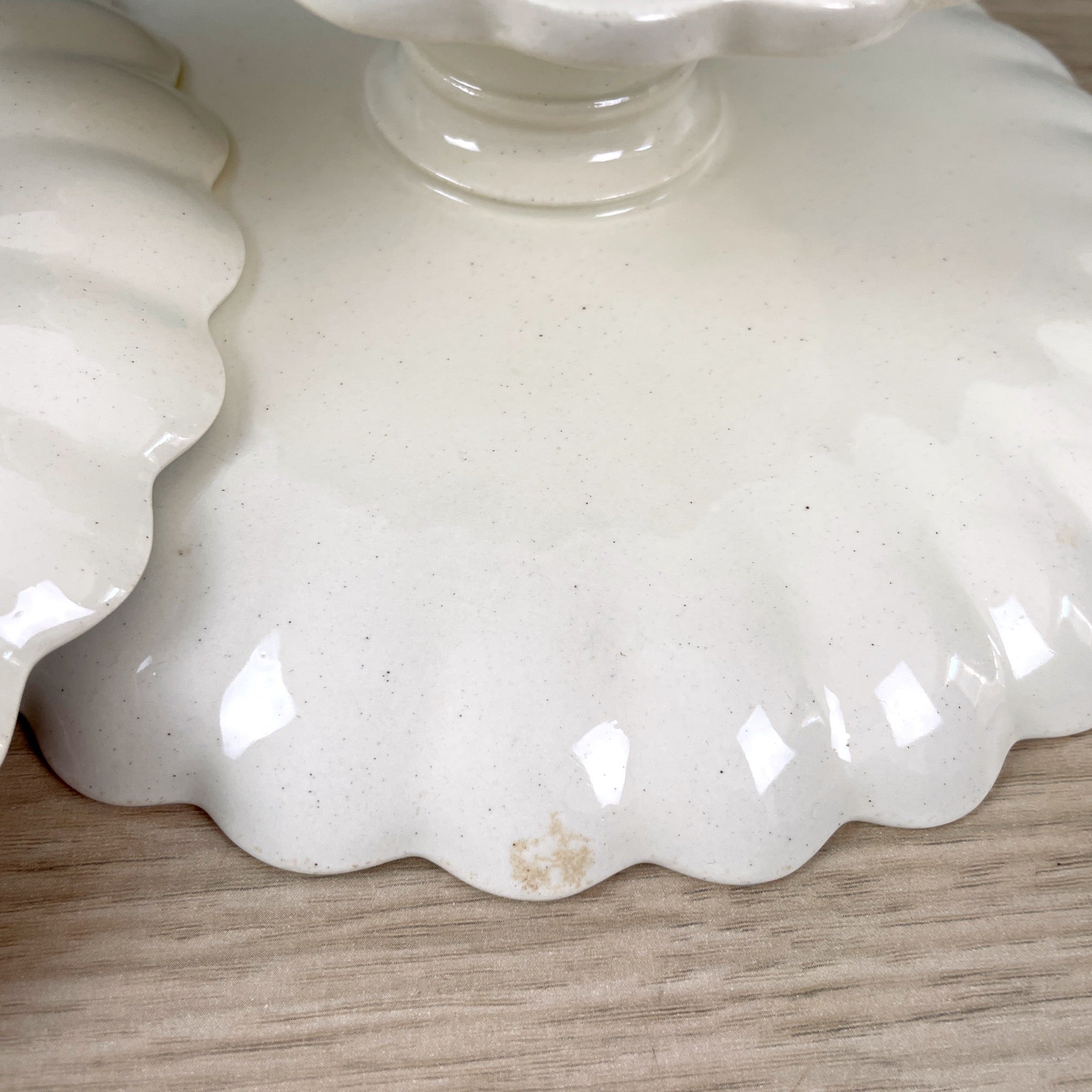 A pair of creamy antique earthenware Copeland Pottery compotes. Compotes have small pedestals and scalloped edges. Use for serving or decor, they're a perfect pair for either.
