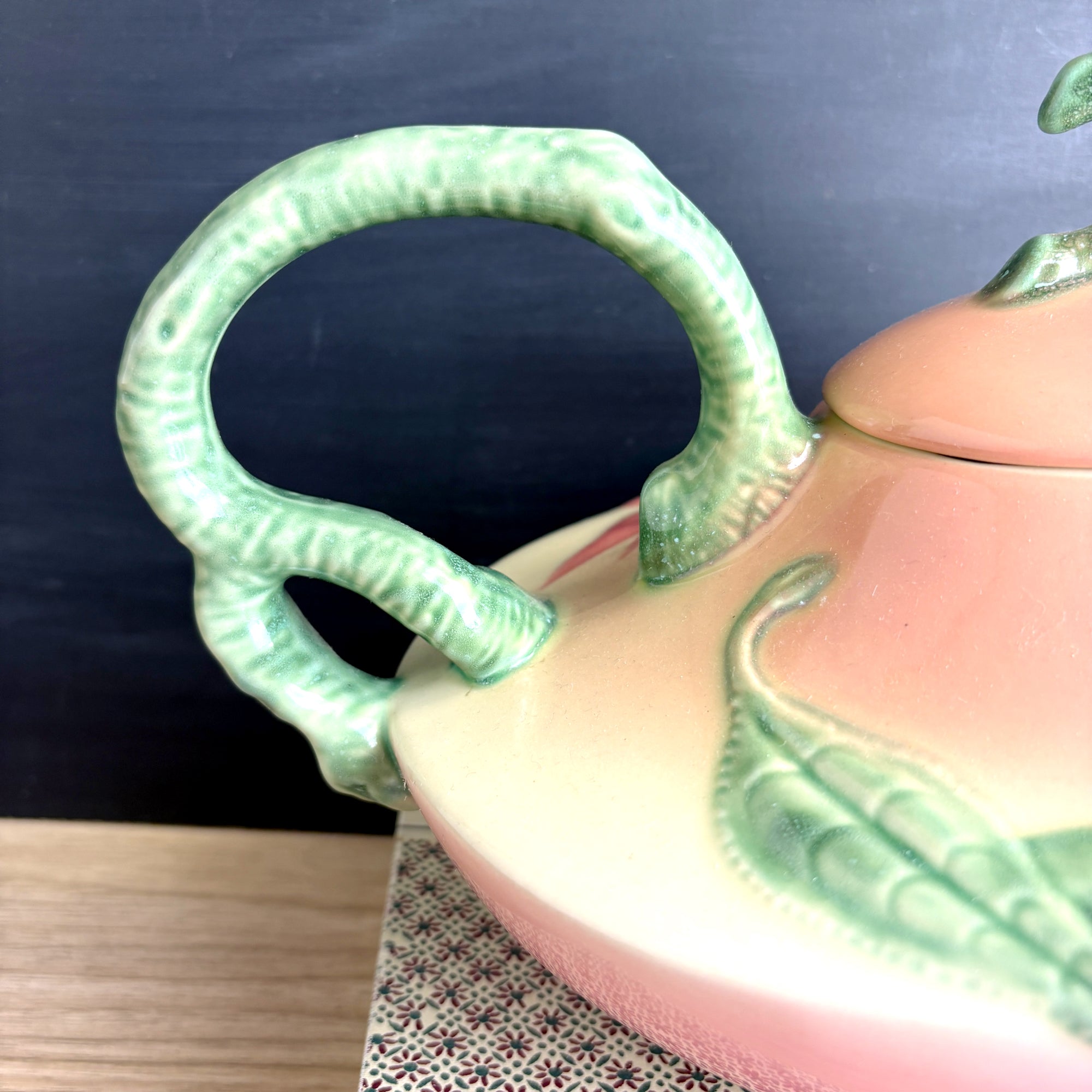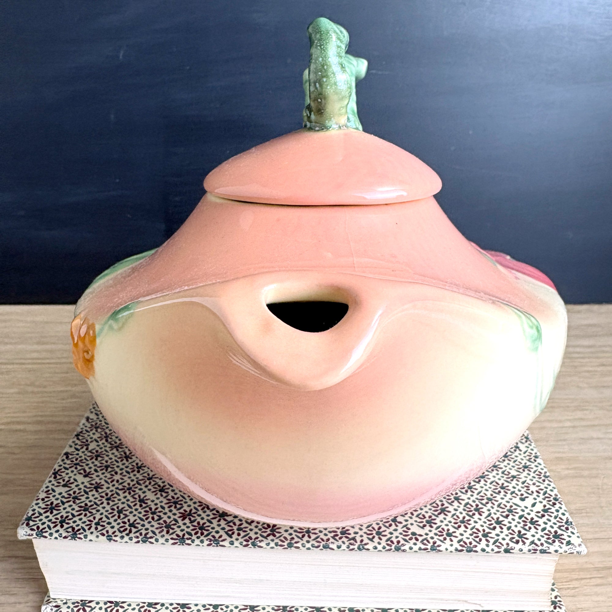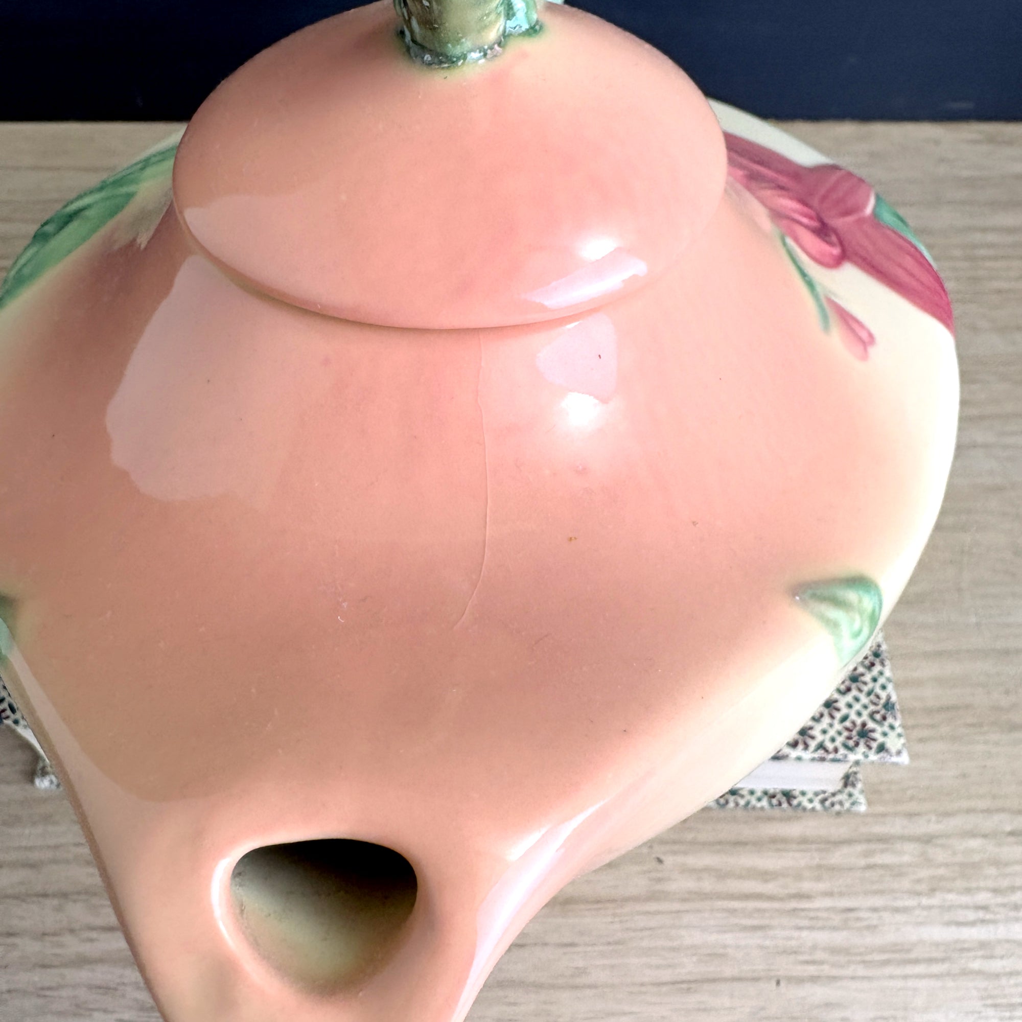 Vintage 1950s Hull Pottery teapot in the Woodland pattern with a pink to peach body and green leaves and branches. Raised marked on bottom Hull W26 USA. Aladdin styling.