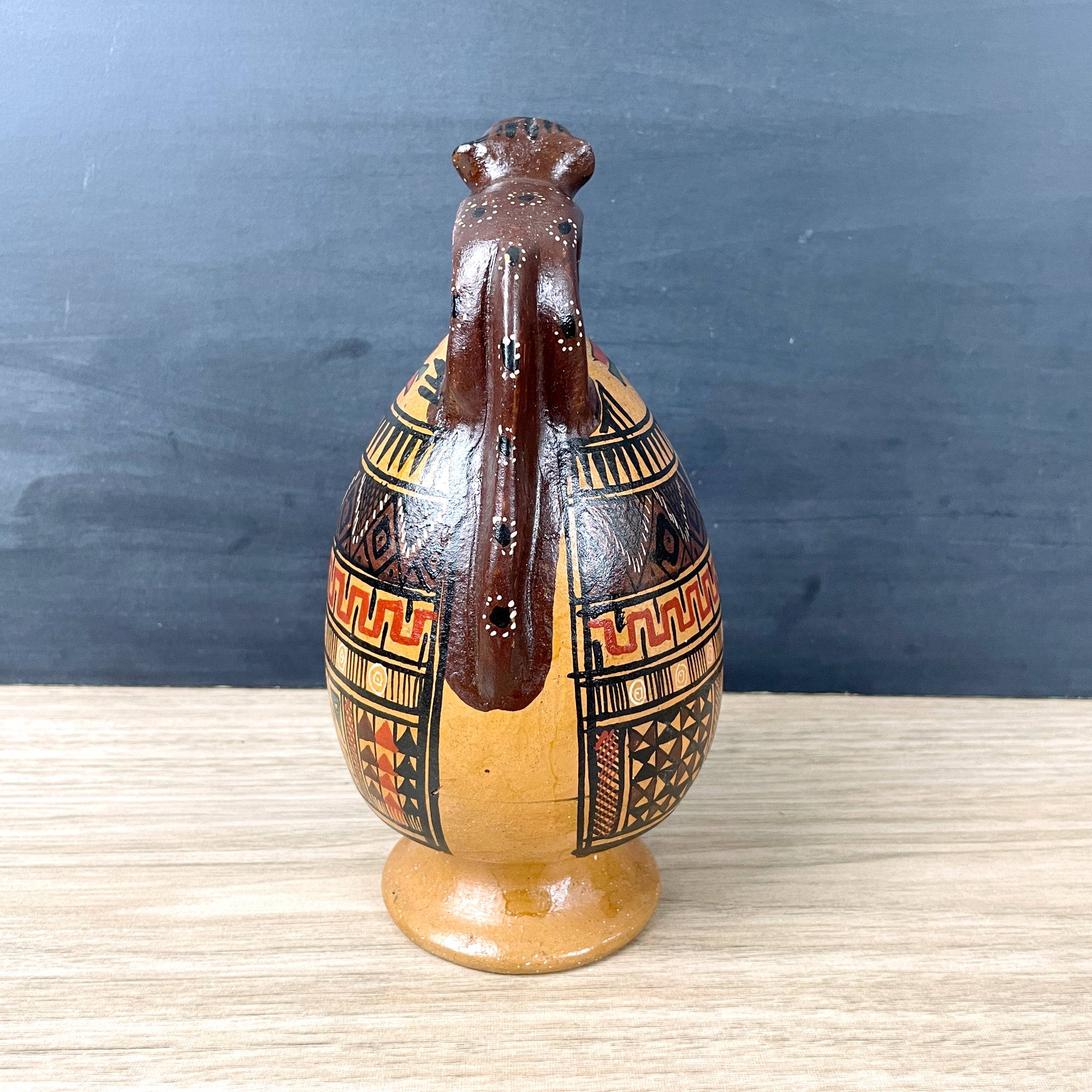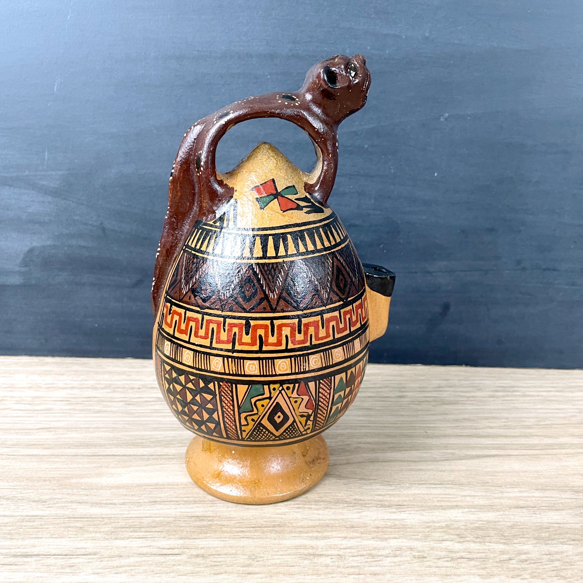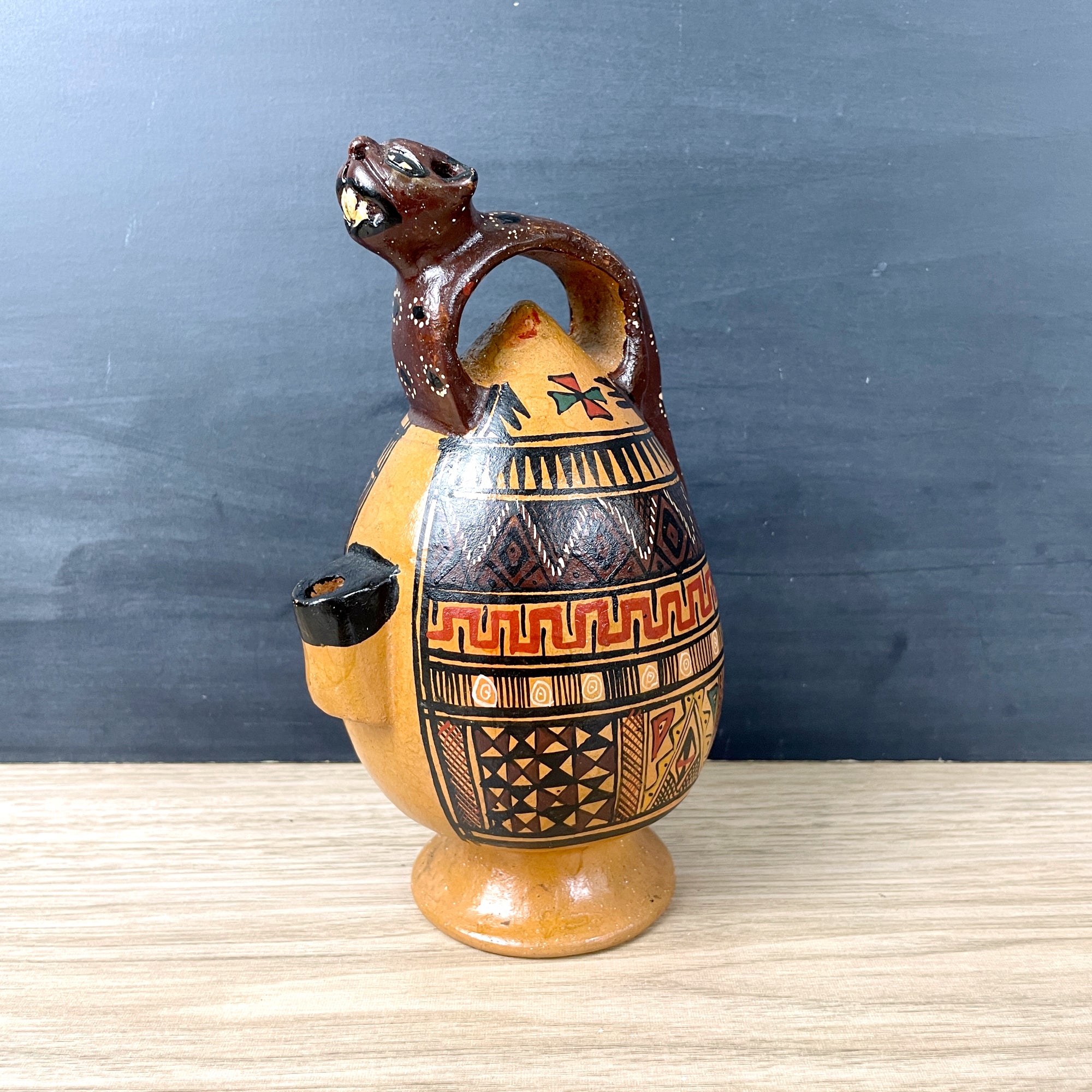Vintage folk art pottery Cusco liquor decanter, likely made in Peru. Jaguar handle, nicely painted designs on the sides. Fills from the bottom, then invert it. Inside is not glazed, best for decor.