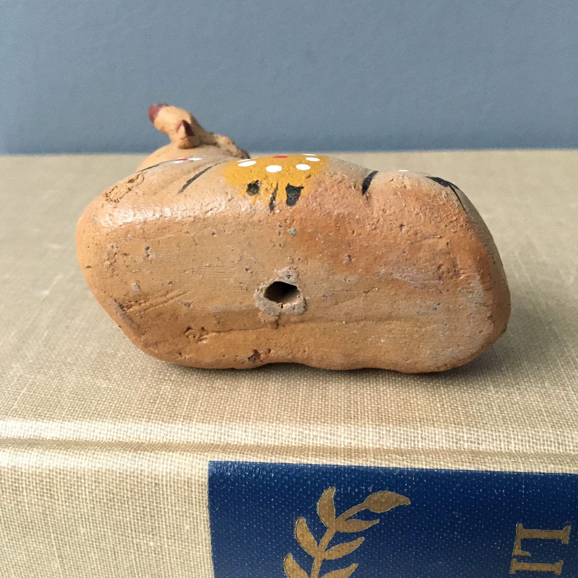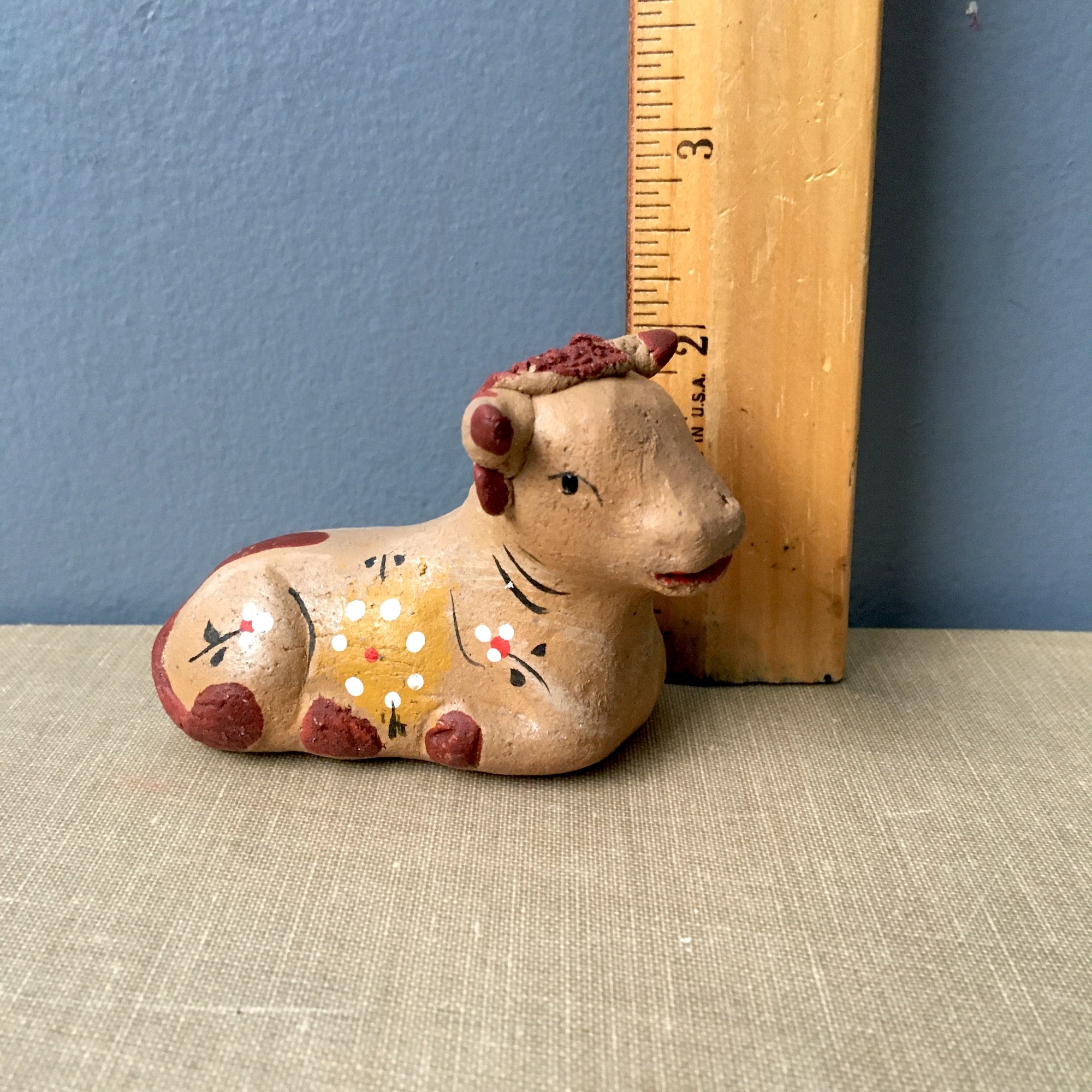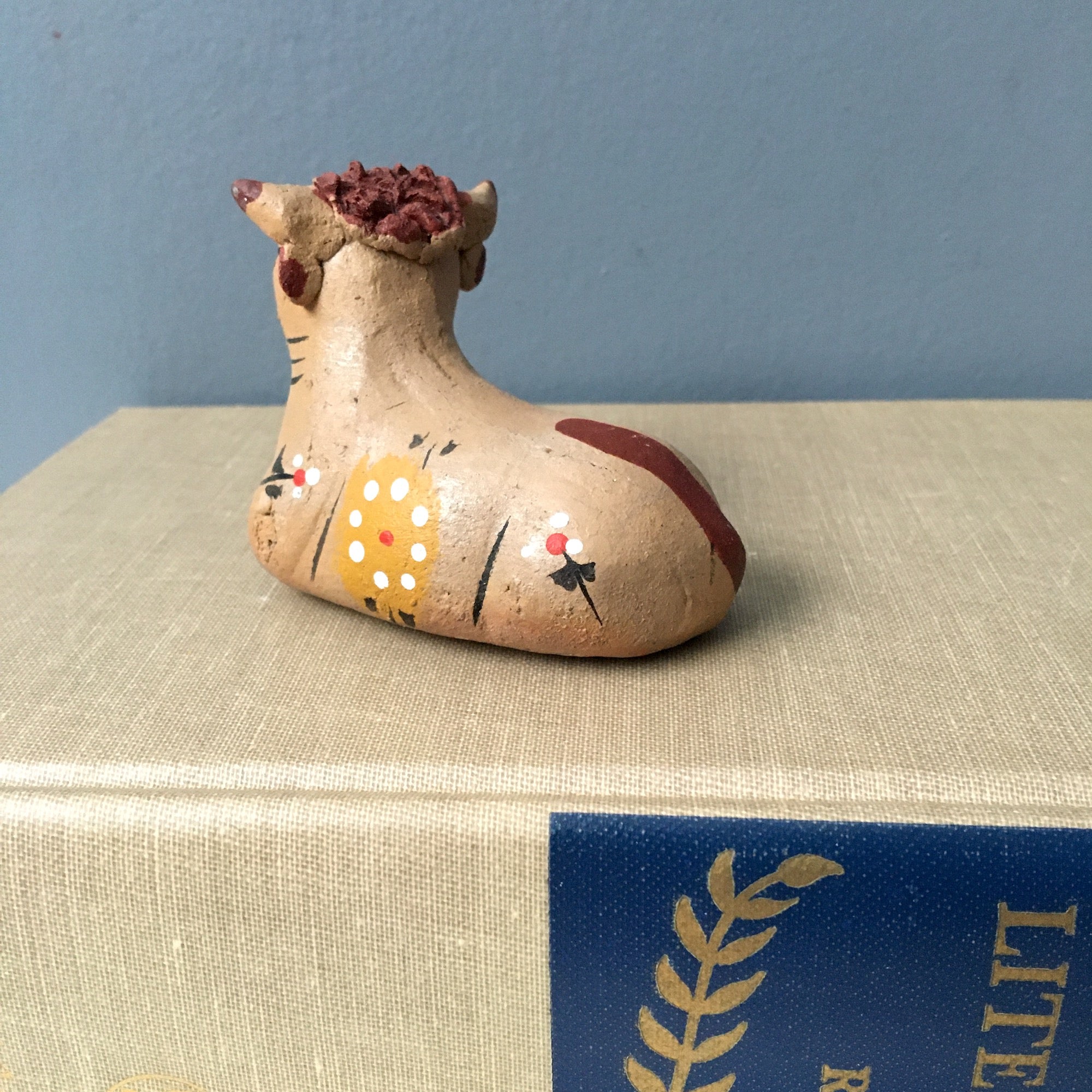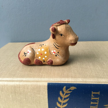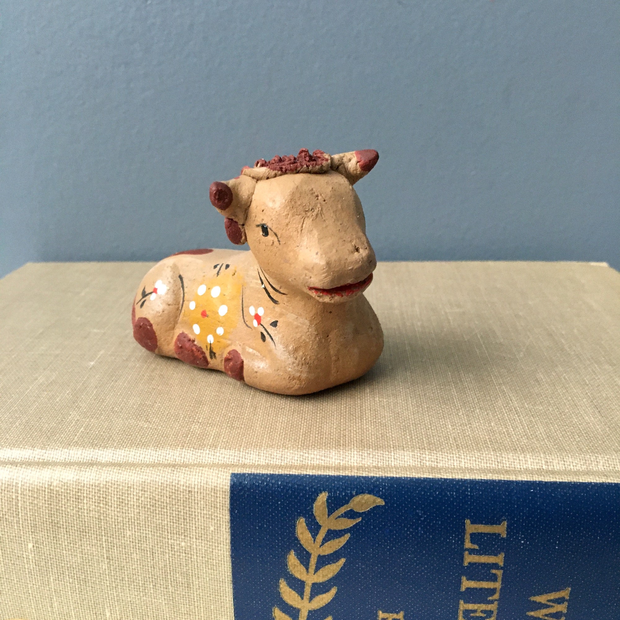 Vintage pottery laying cow figurine, decorated with painted flowers. Peaceful expression on her face. Likely Central or South American. Unsigned.