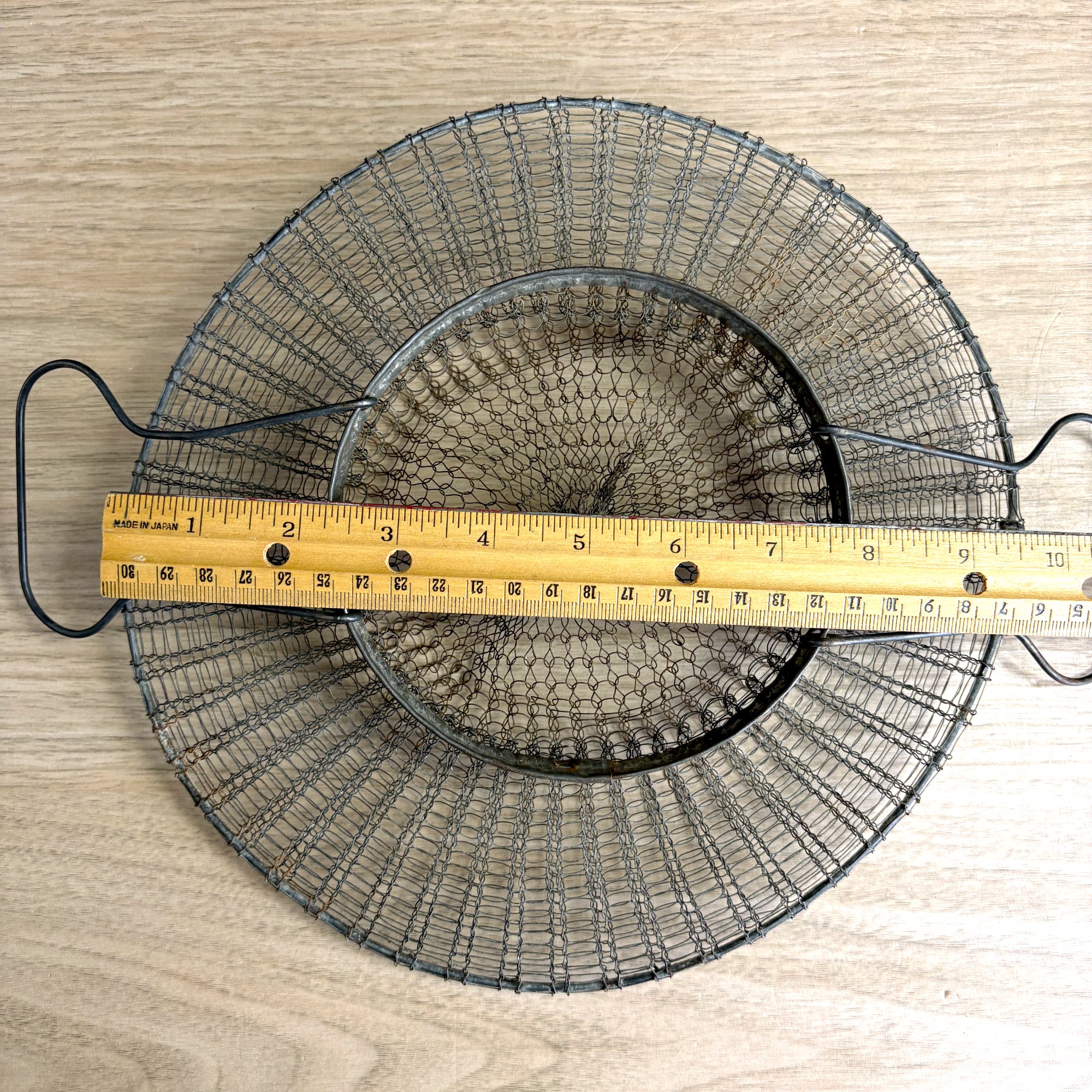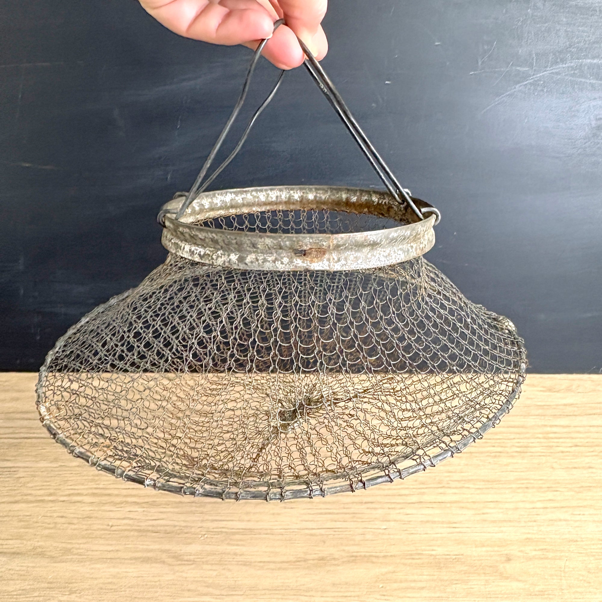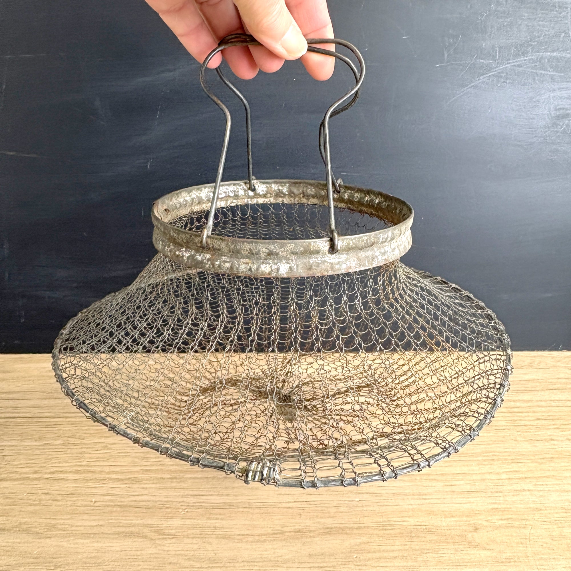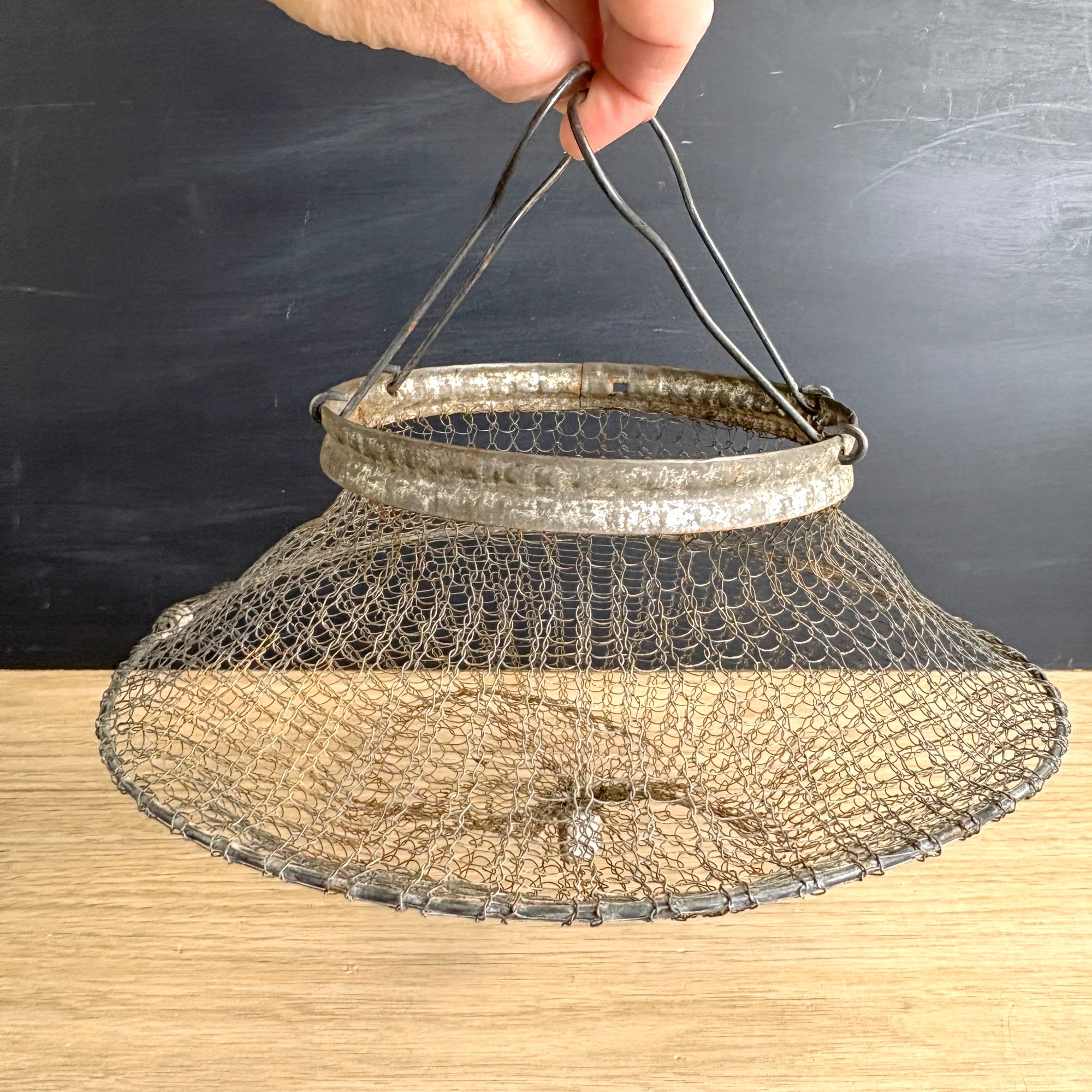 Vintage collapsible basket is made of metal mesh with a ring in the middle and one at the top. Sturdy metal handles. We've seen it described as a fish, egg, gardening, or steamer basket. Collect shells or clams. We also think it could make a conversation-piece of a purse, as long as privacy isn't an issue. Shabby charm.