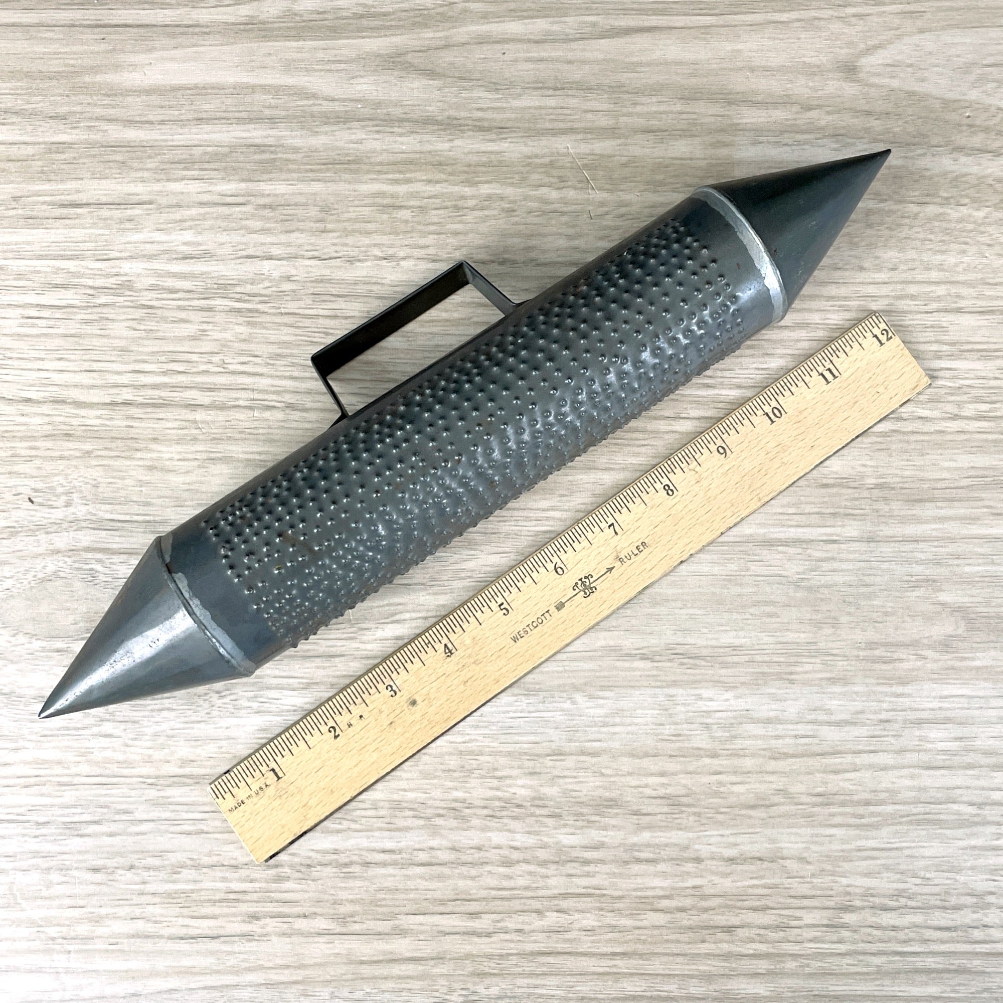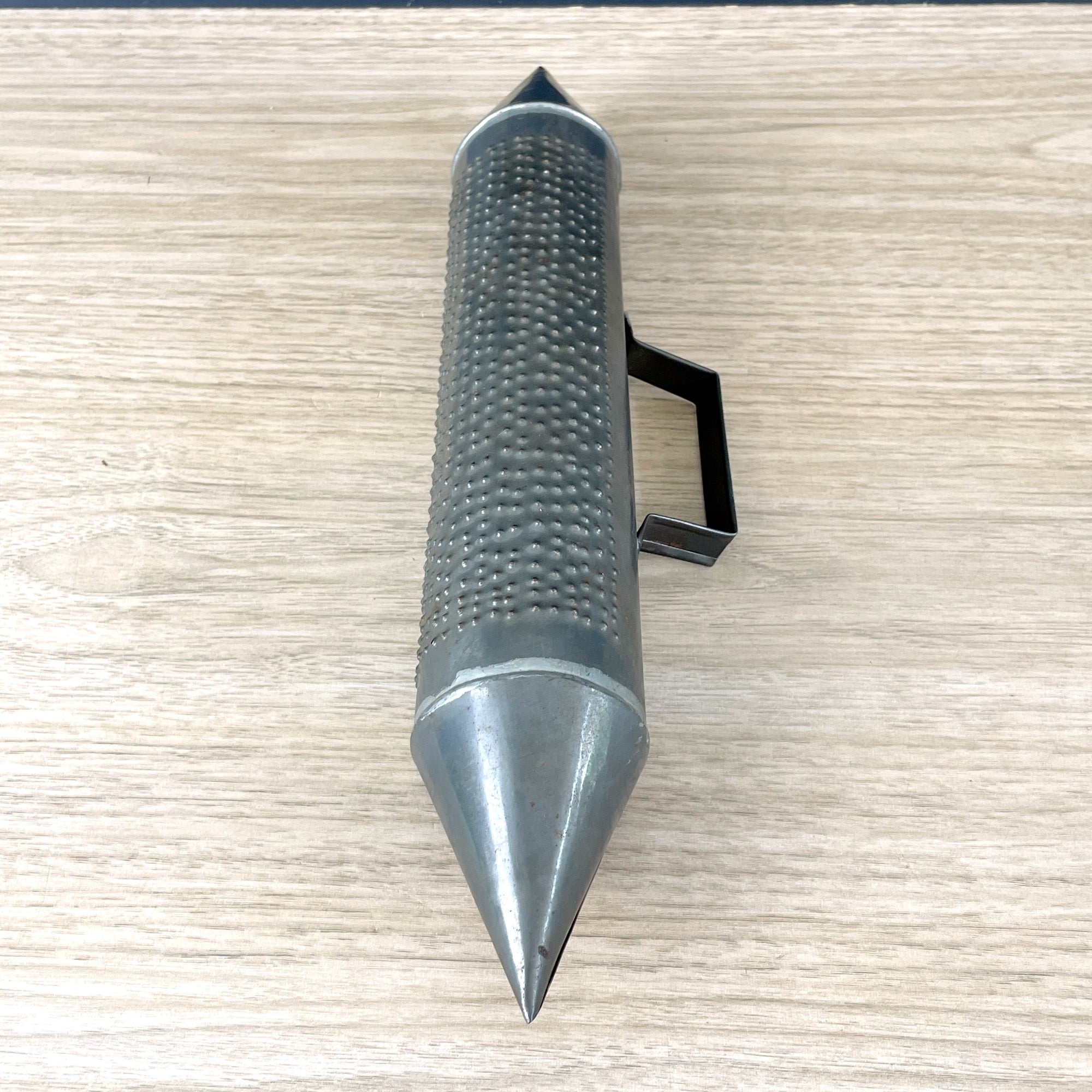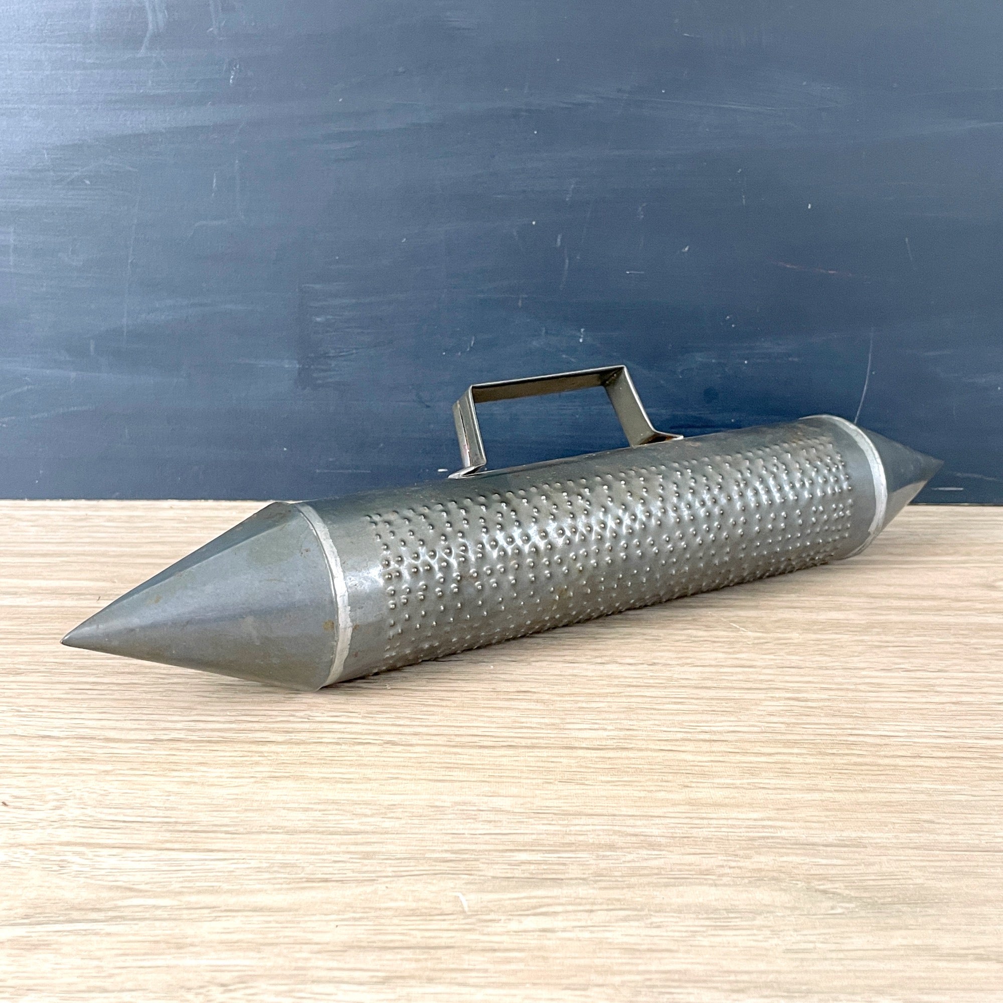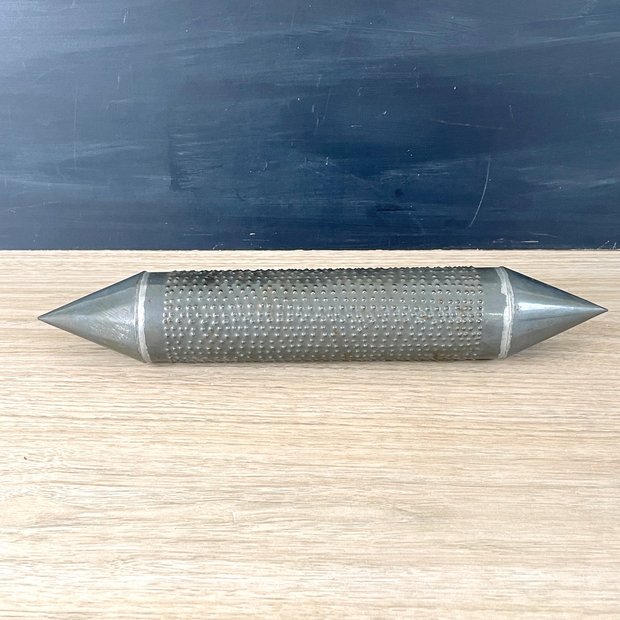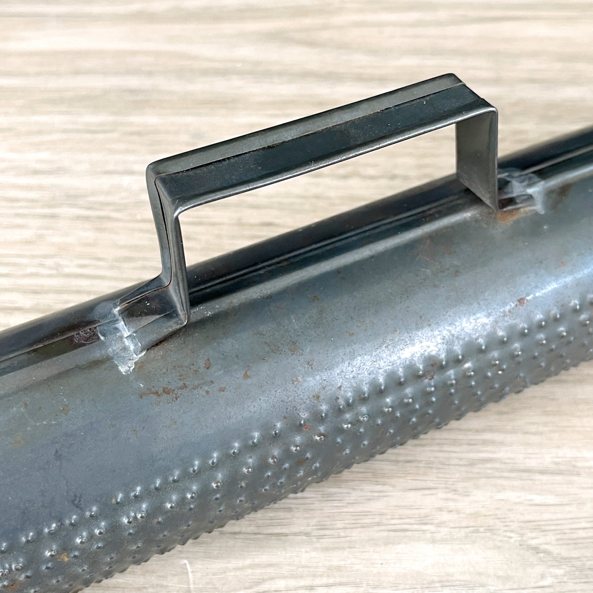 Vintage handmade tin biscuit roller with a handle. Hammered notches around 3/4 of tube with a soldered handle and pointed sealed ends.