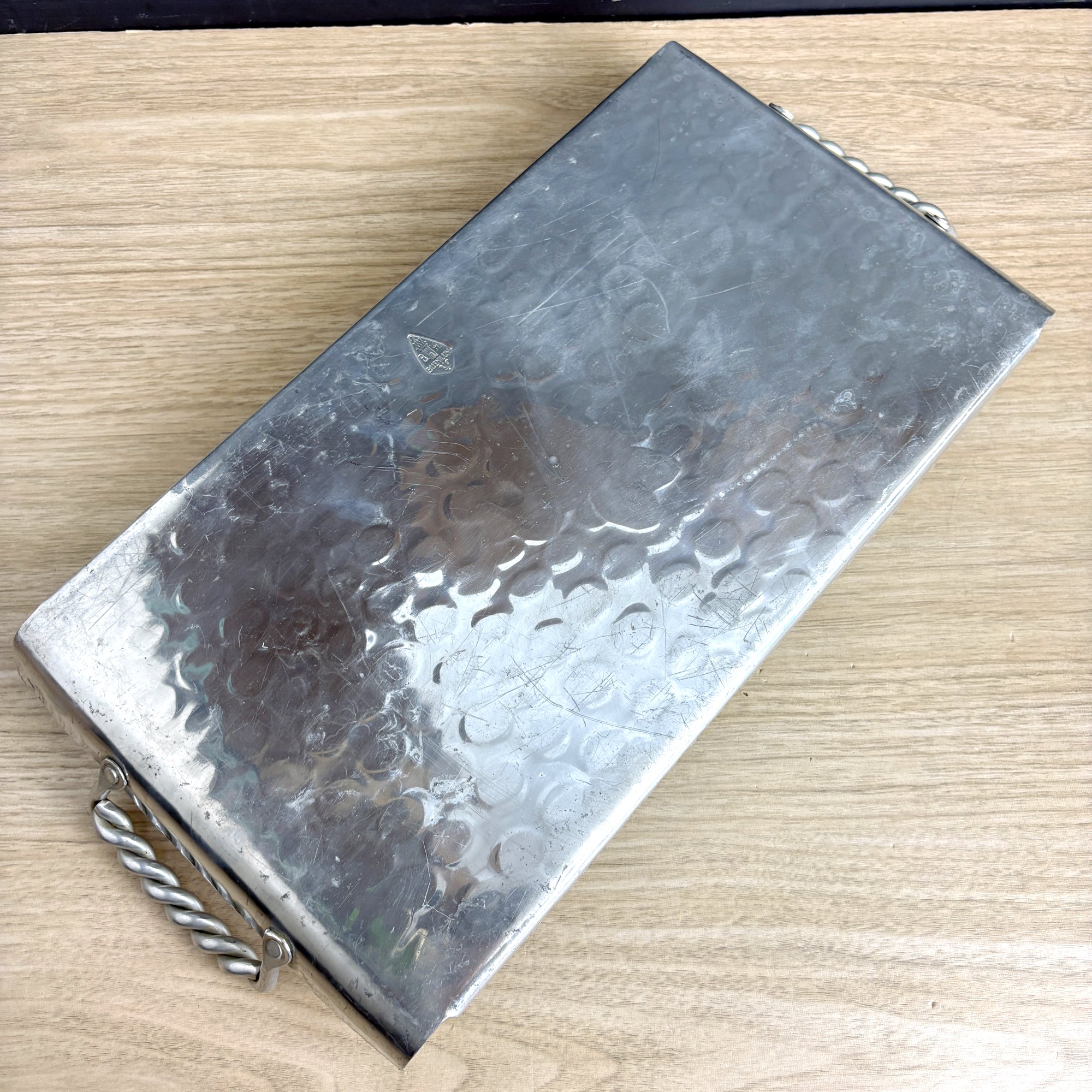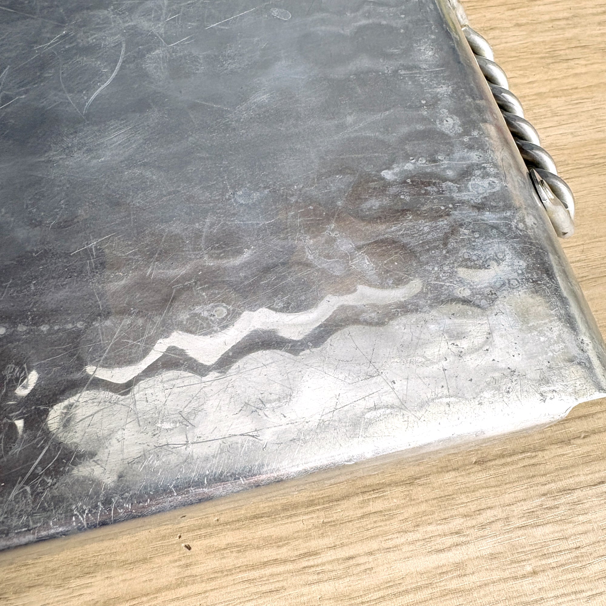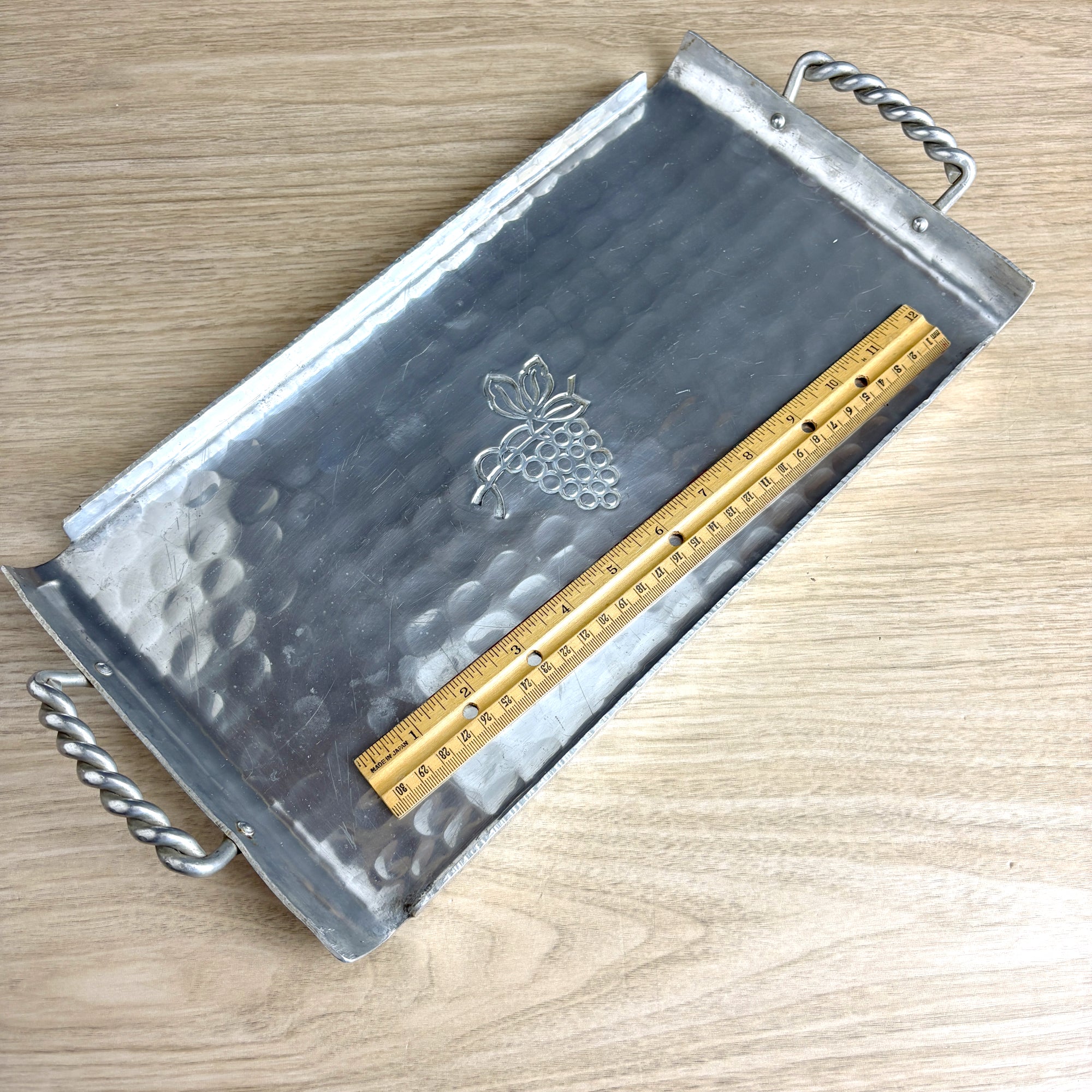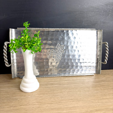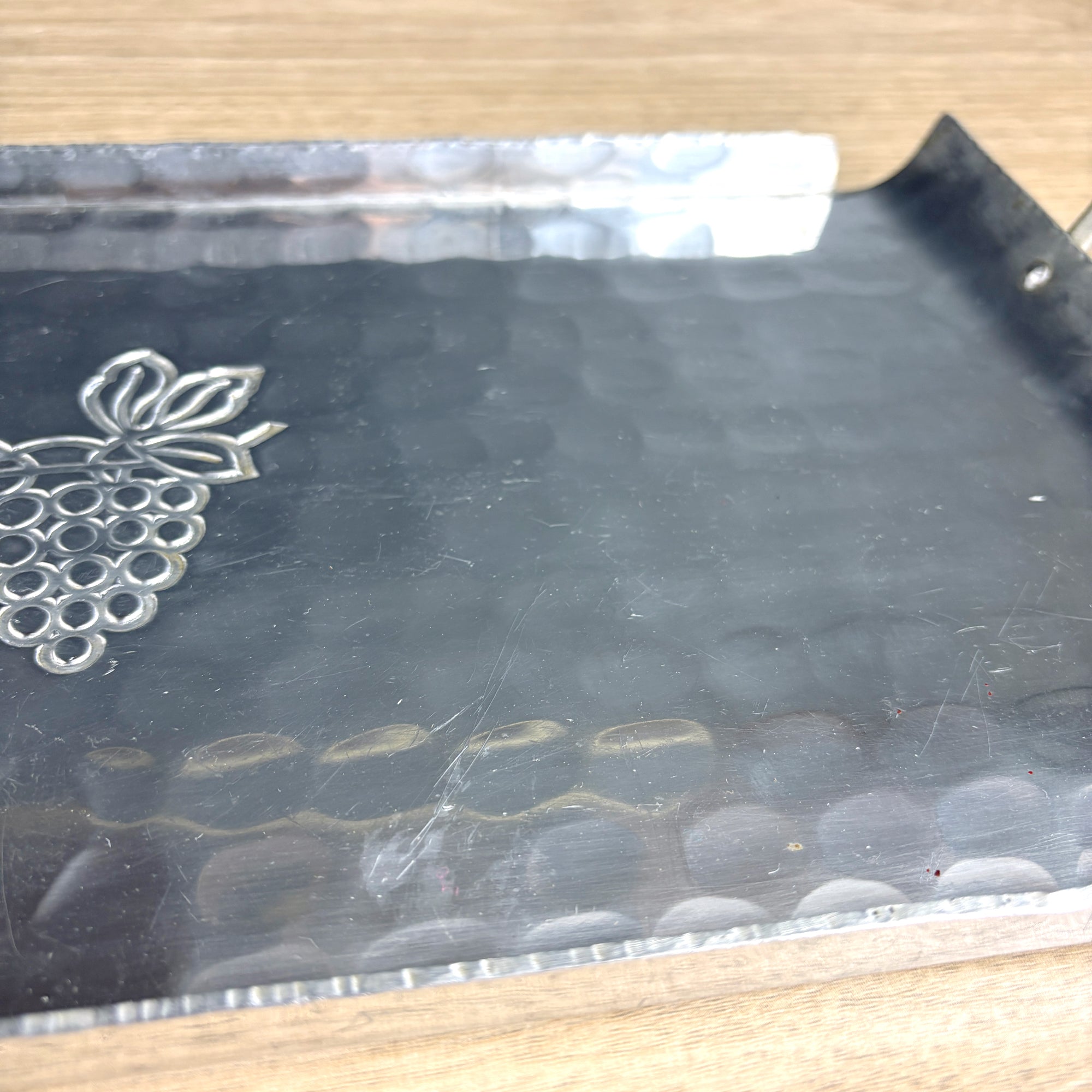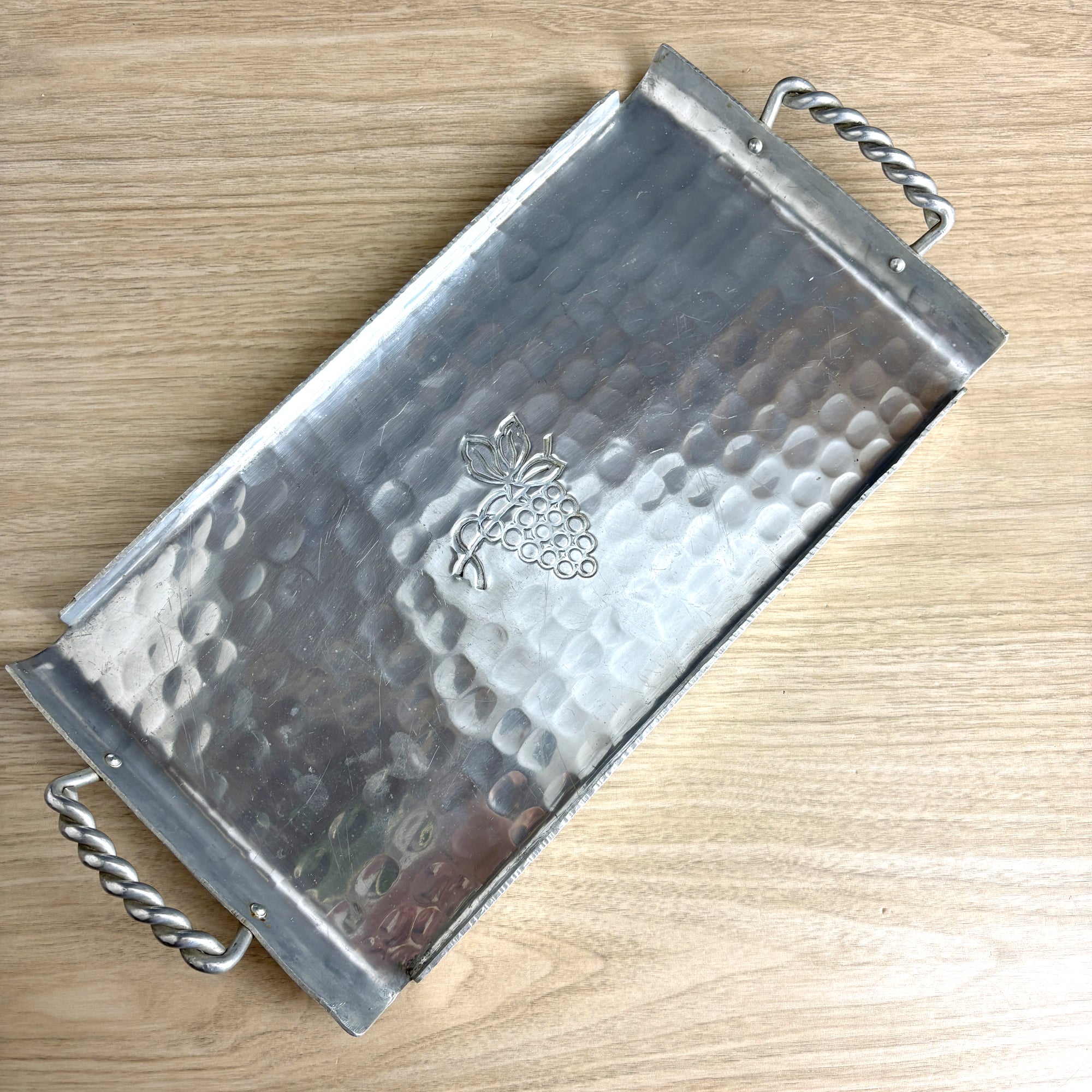Vintage hammered aluminum rectangular serving tray by B.W. Buenilum, featuring classic mid-century modern styling. The short ends curve upward and are fitted with twisted rope–style aluminum handles, securely riveted to each side. The center has an etched grape motif, and the long sides have a raised lip for easy carrying. Lightweight at just over a pound, this tray is perfect for indoor or outdoor entertaining. I would use it to carry my morning coffee and toast out to the deck to enjoy.