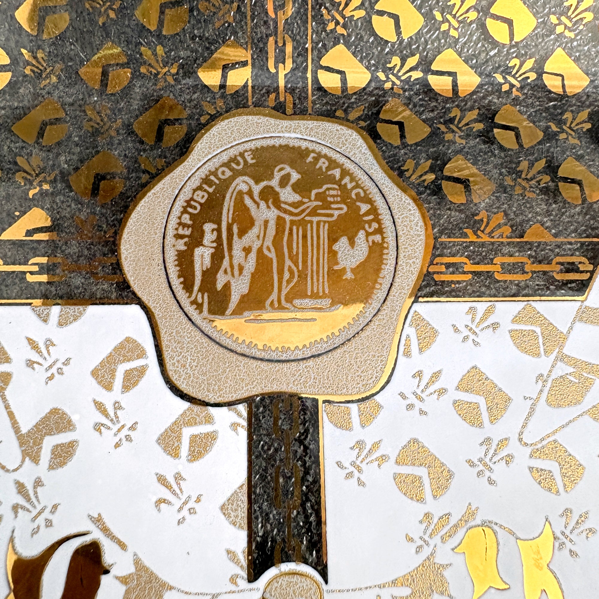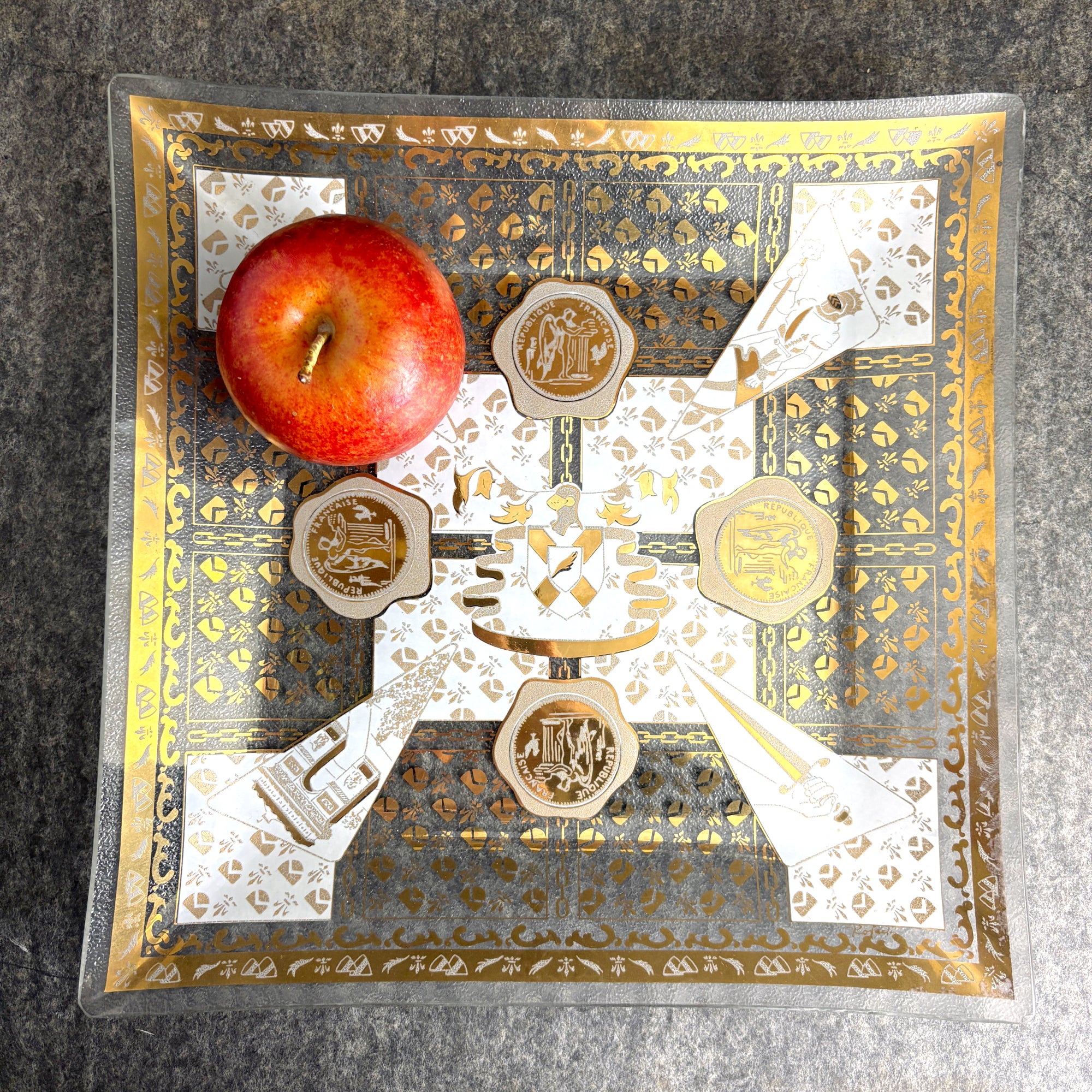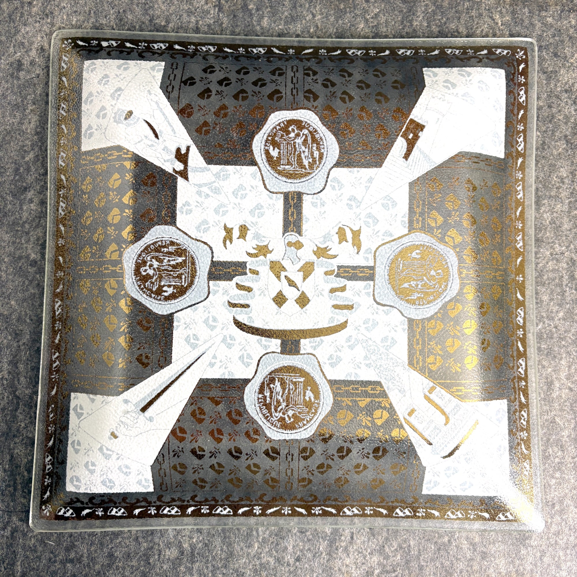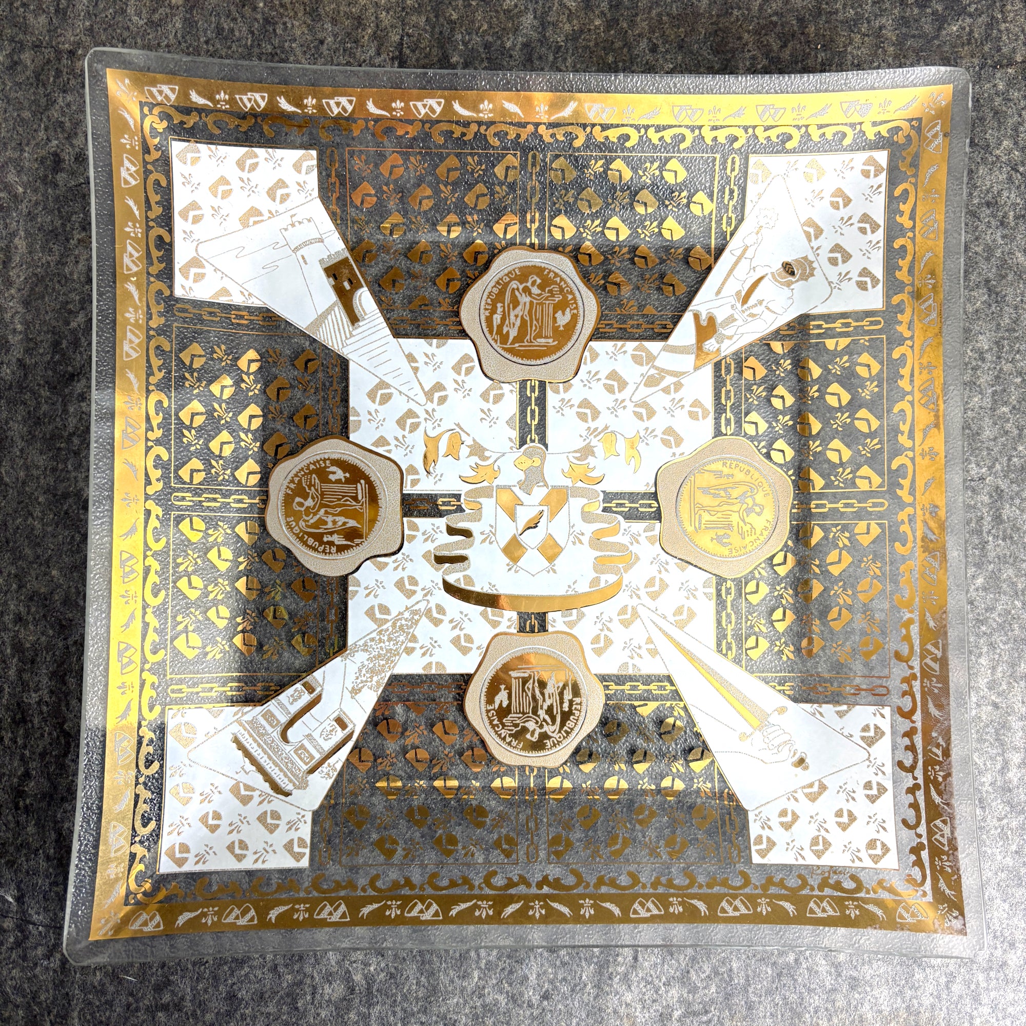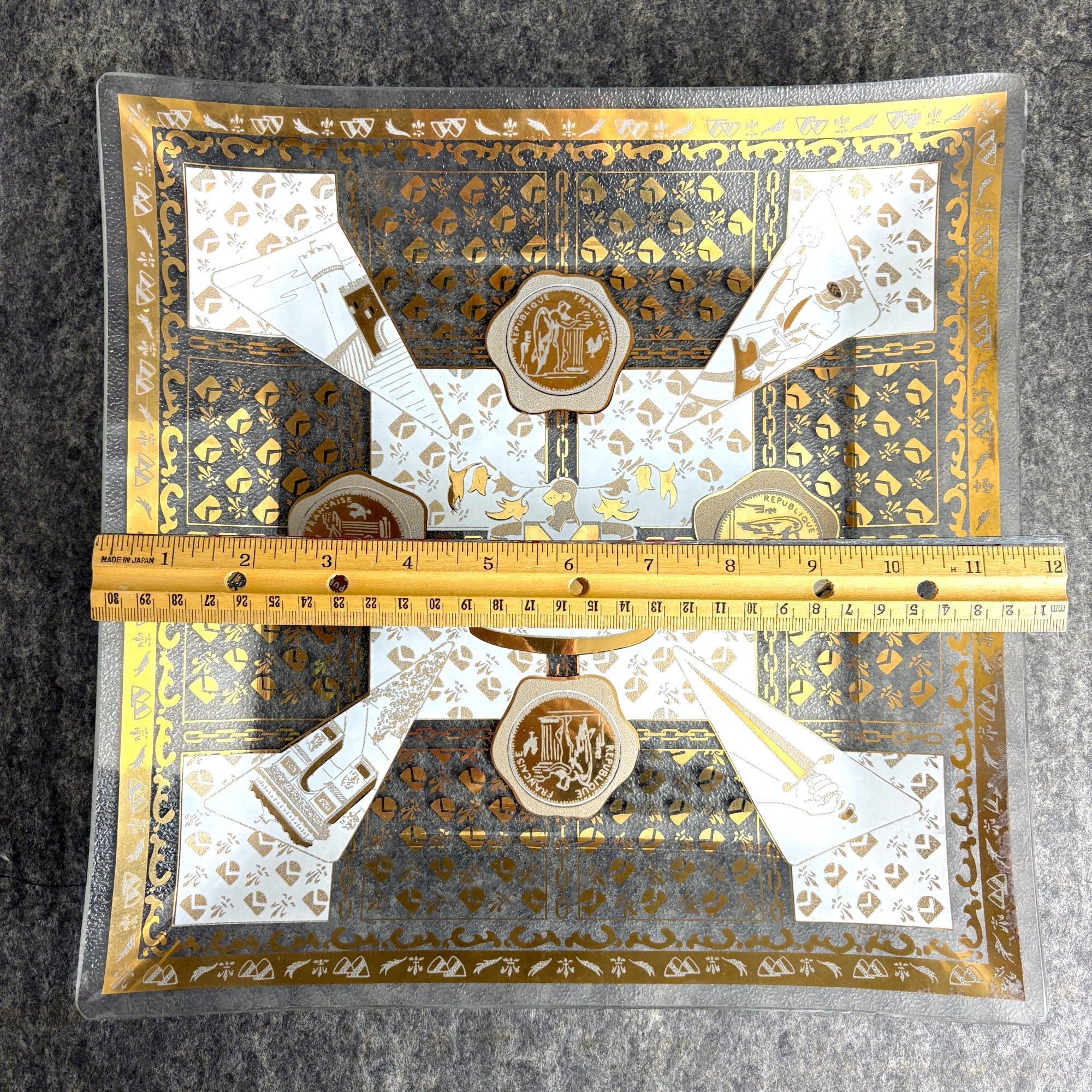 Lovely Rojack square bent glass serving tray is adorned with symbols of the French Republic, Republique Francaise. Clear pebbled glass back with white and gold symbols of France, such as heraldic center design, rooster, Arc de Triomphe, a Norman tower, knight, and sword on the smooth front. Fleur de lis alternate with heraldic symbols around the edge.