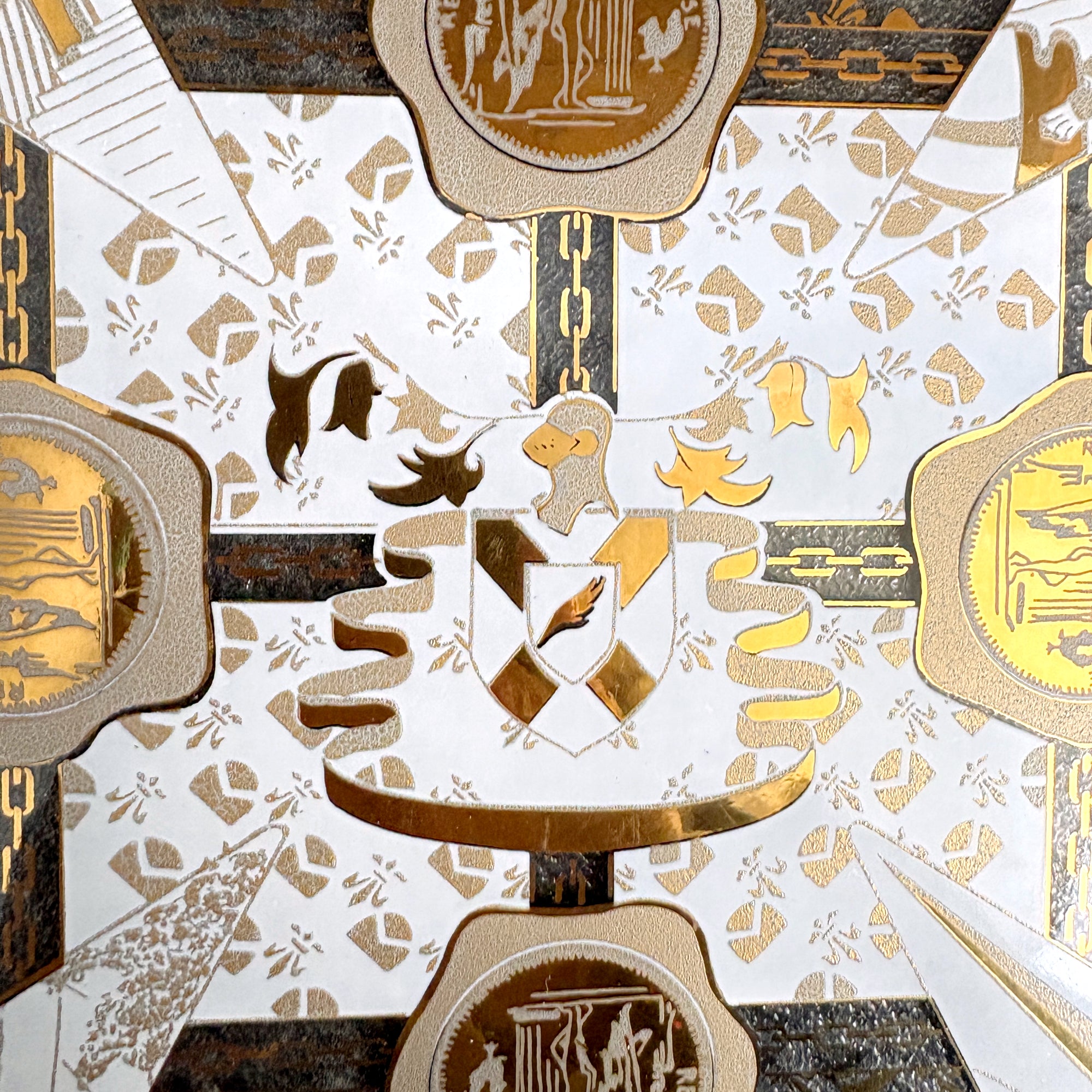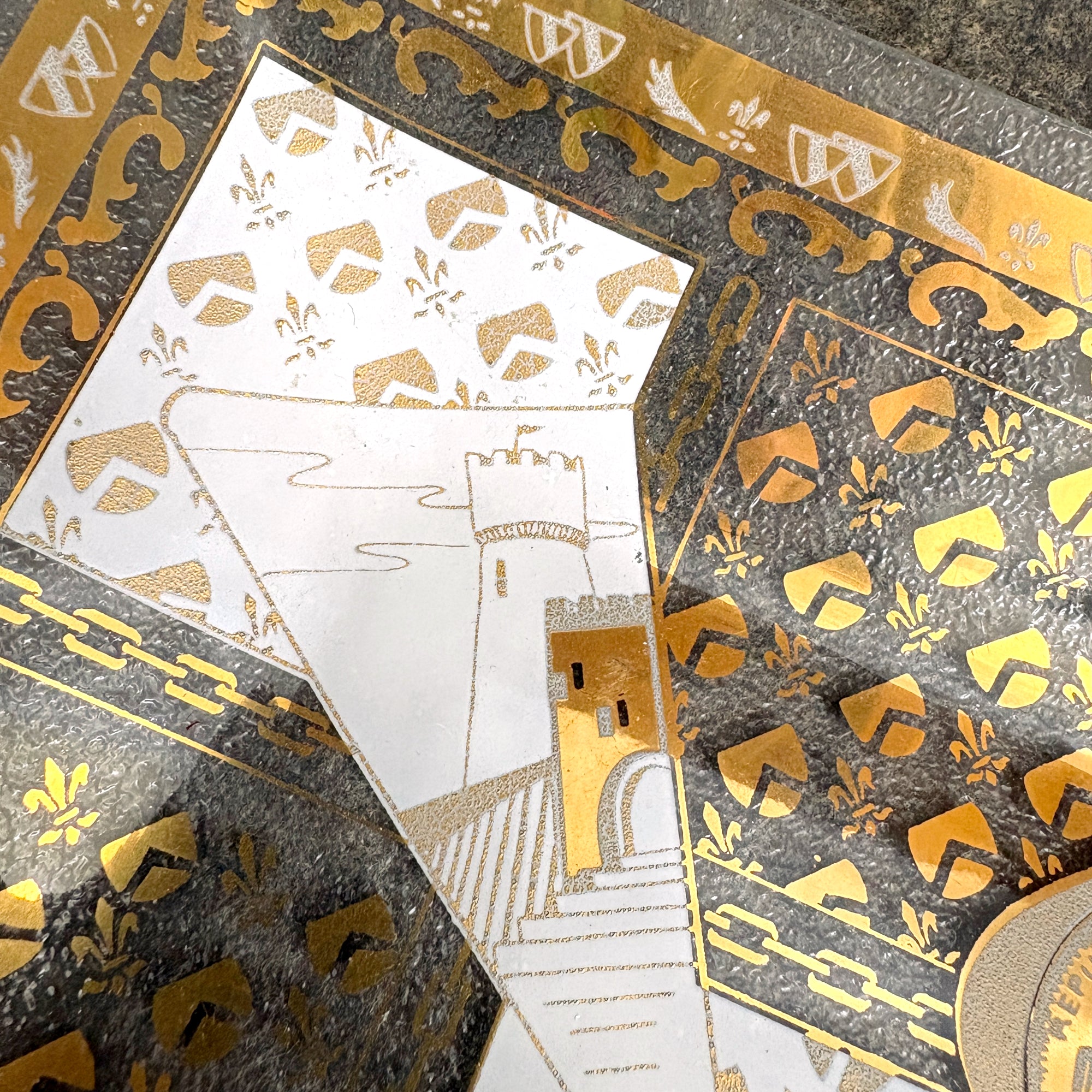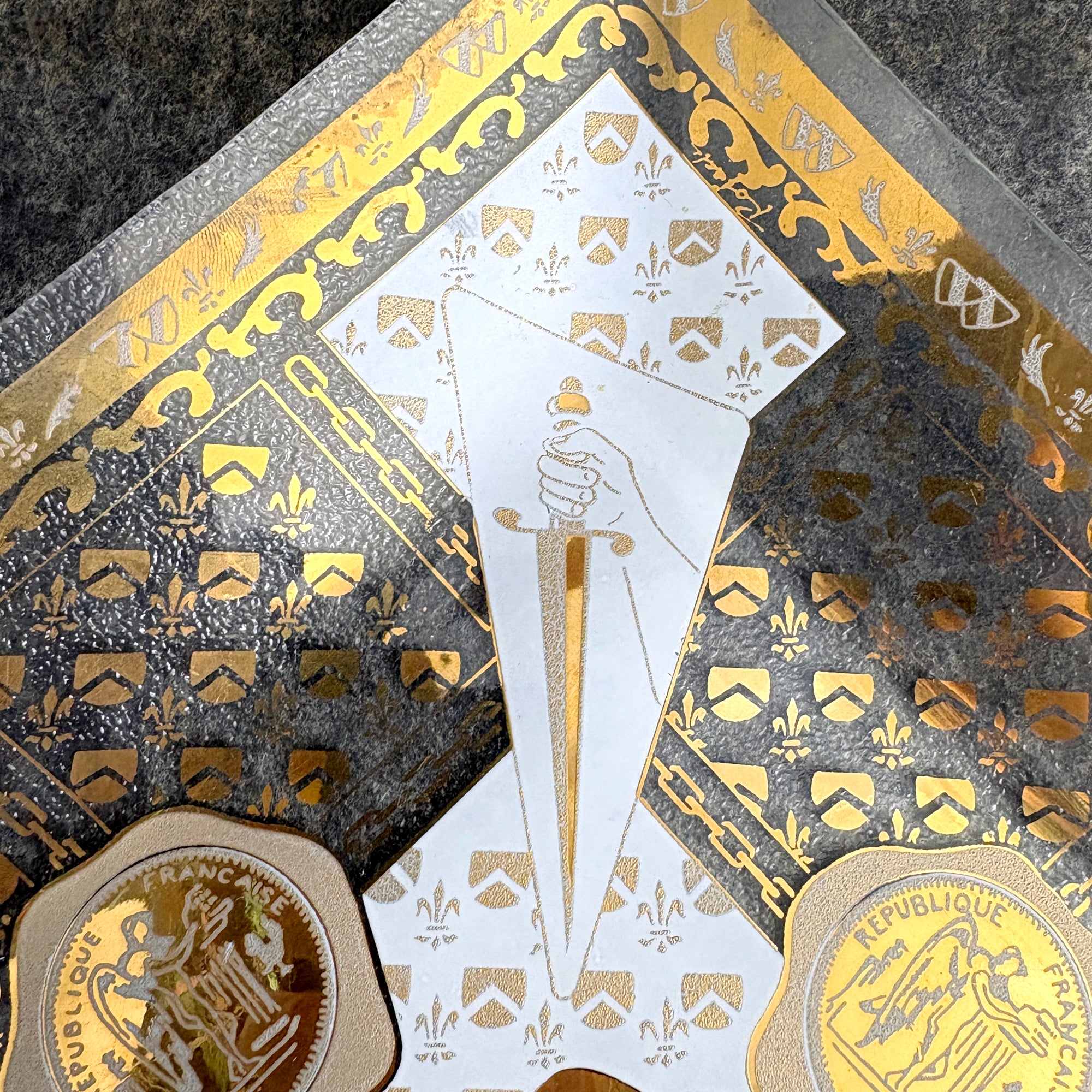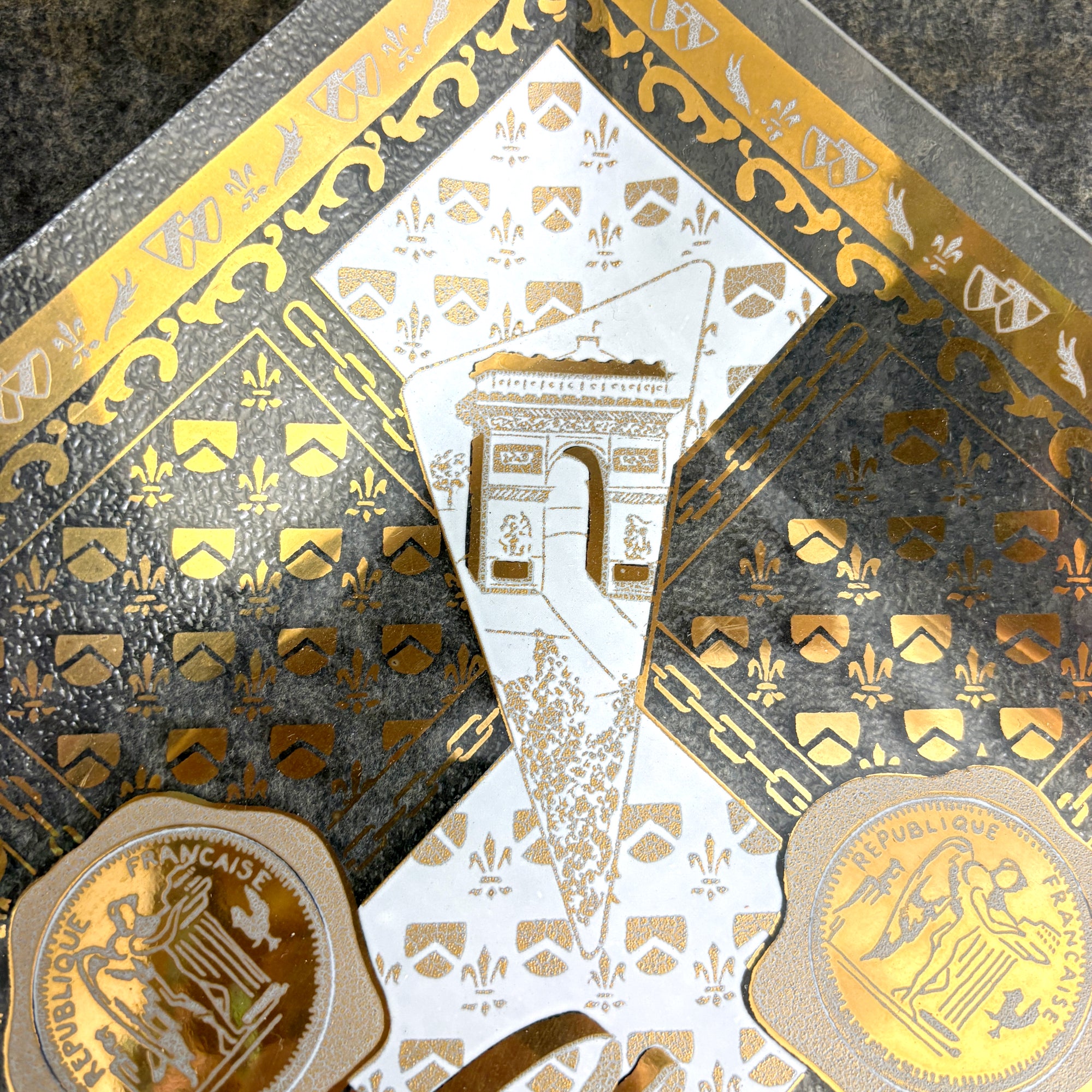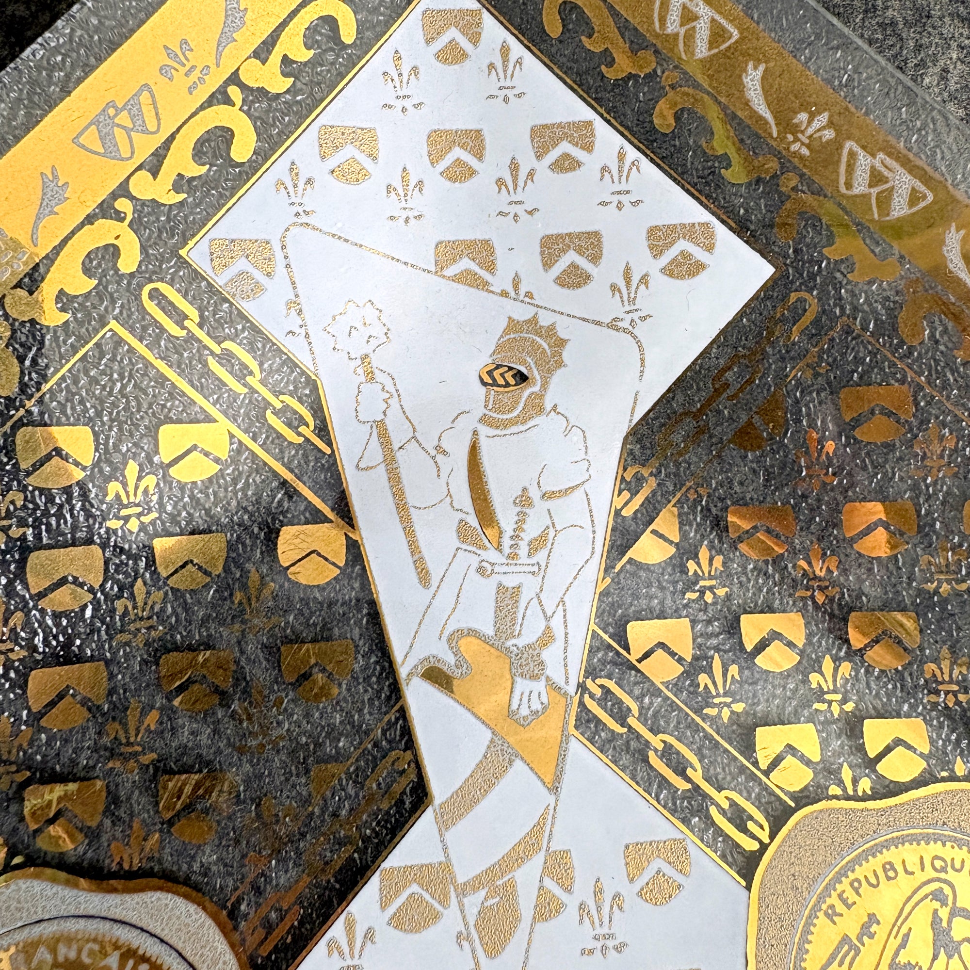 Lovely Rojack square bent glass serving tray is adorned with symbols of the French Republic, Republique Francaise. Clear pebbled glass back with white and gold symbols of France, such as heraldic center design, rooster, Arc de Triomphe, a Norman tower, knight, and sword on the smooth front. Fleur de lis alternate with heraldic symbols around the edge.