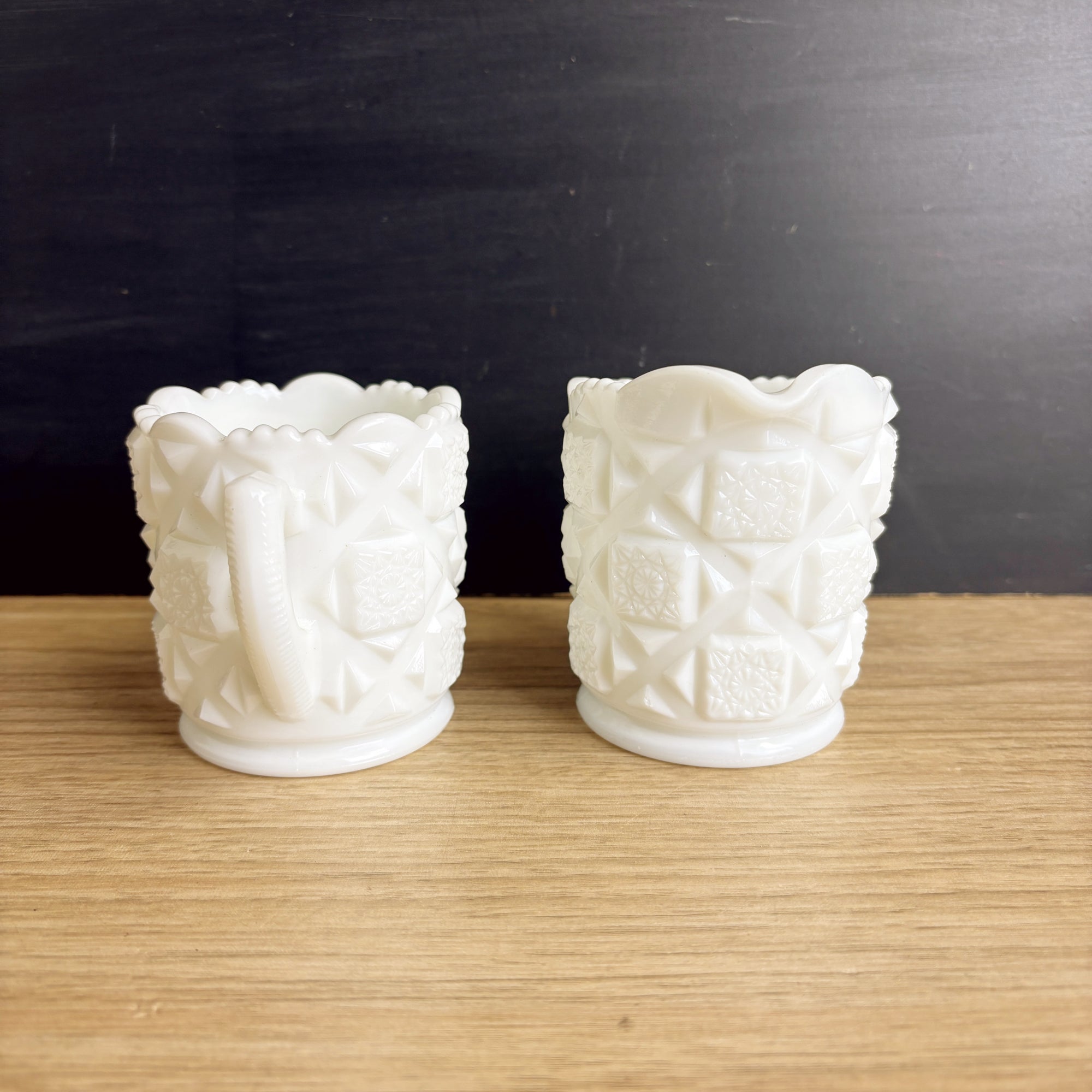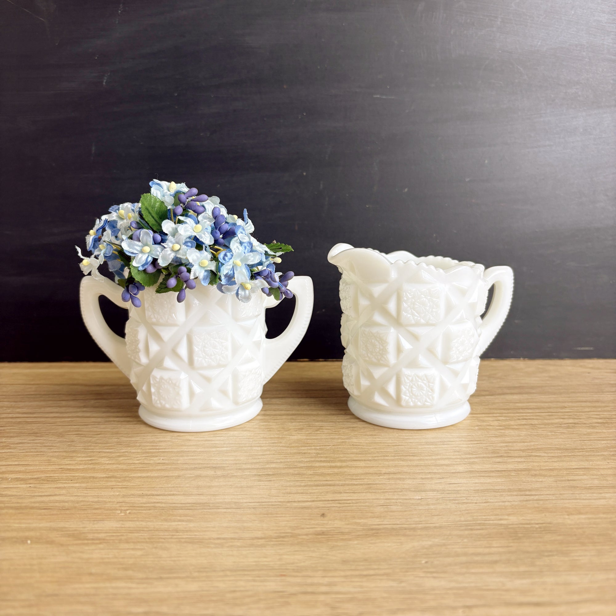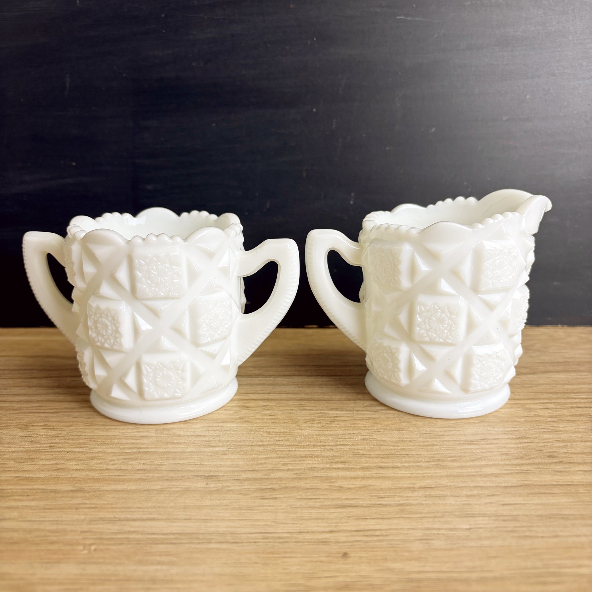 Vintage Westmoreland cream and sugar in the Old Quilt pattern. Add to your favorite mix and match milk glass dish set.