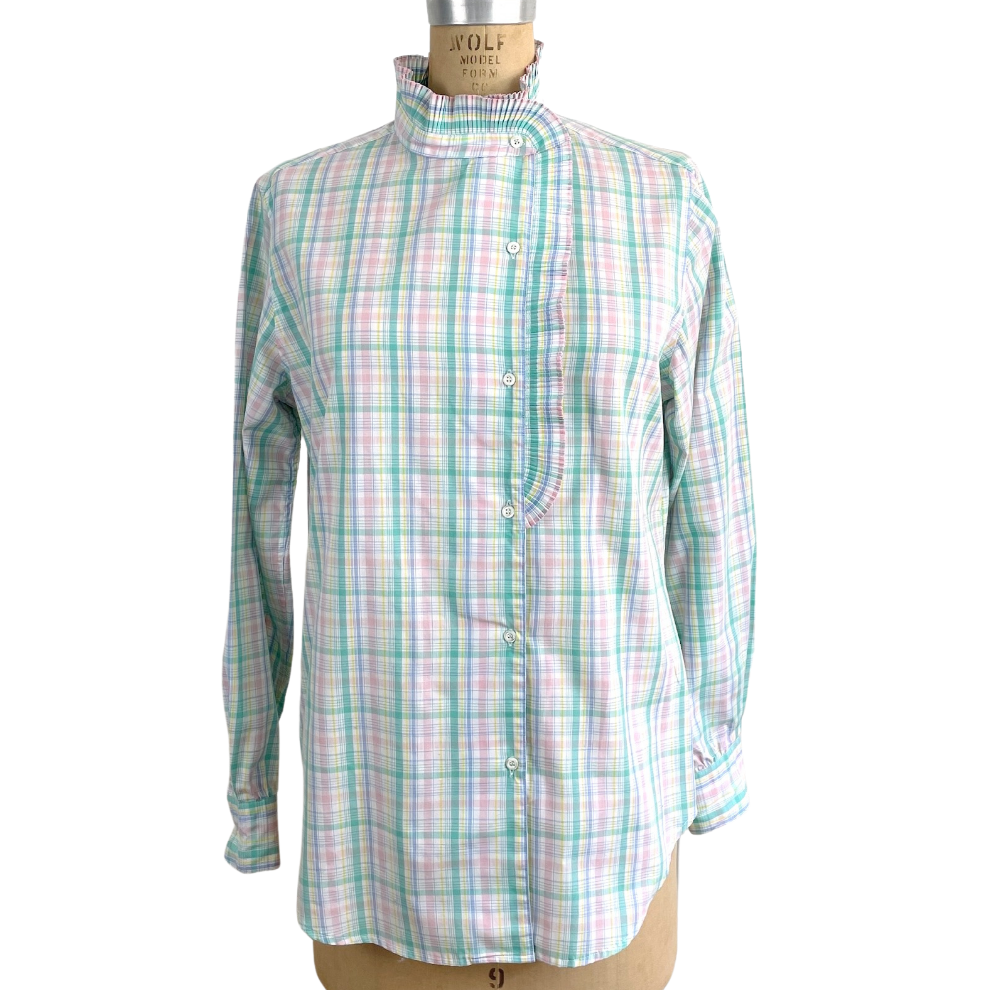 1980s asymmetrical pastel plaid blouse -high ruffled collar - size L