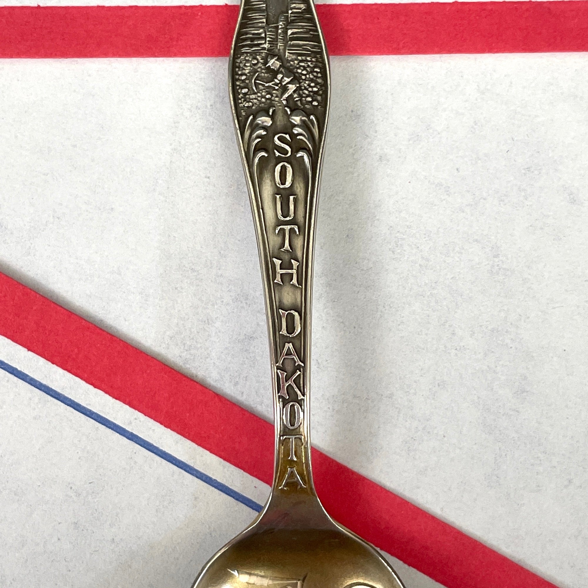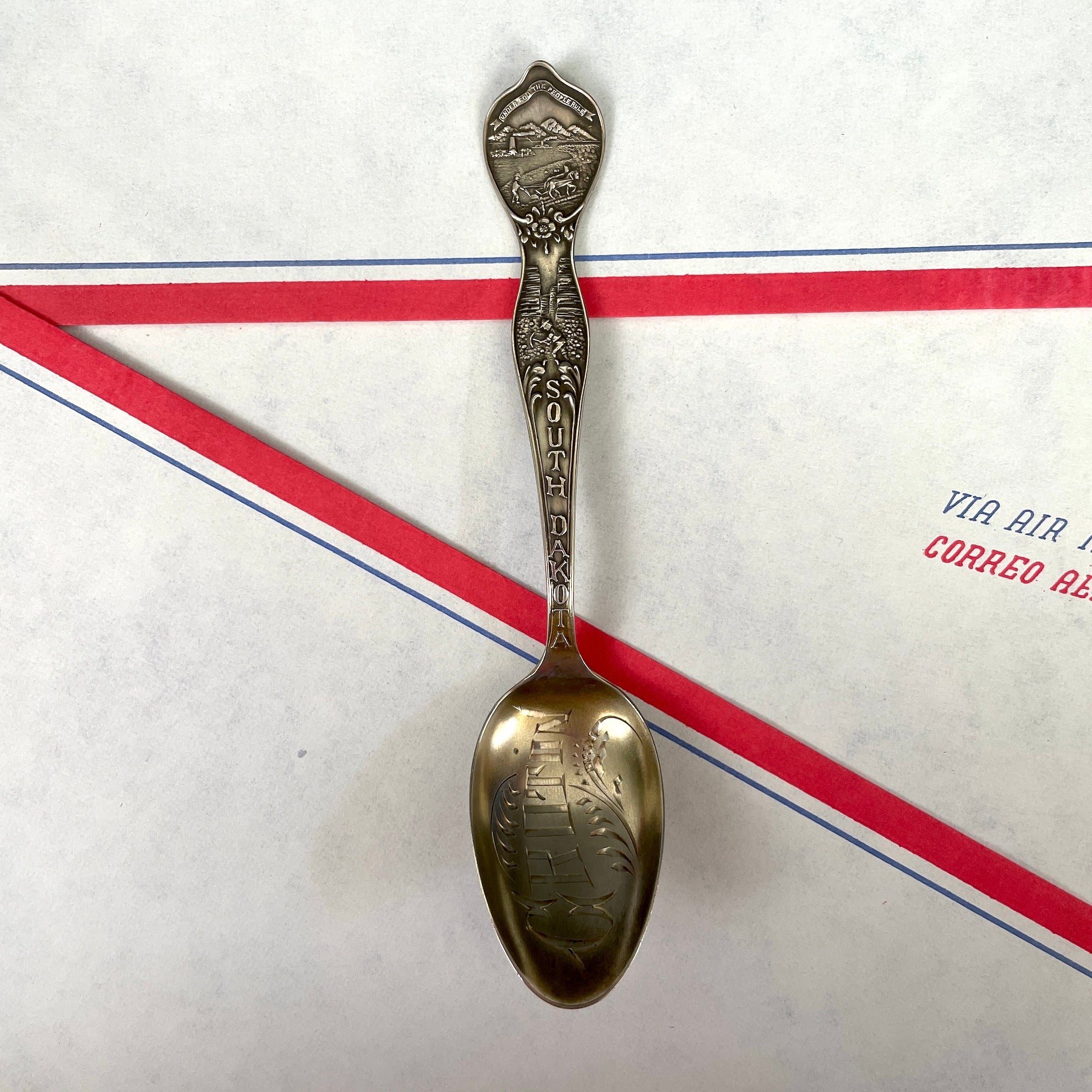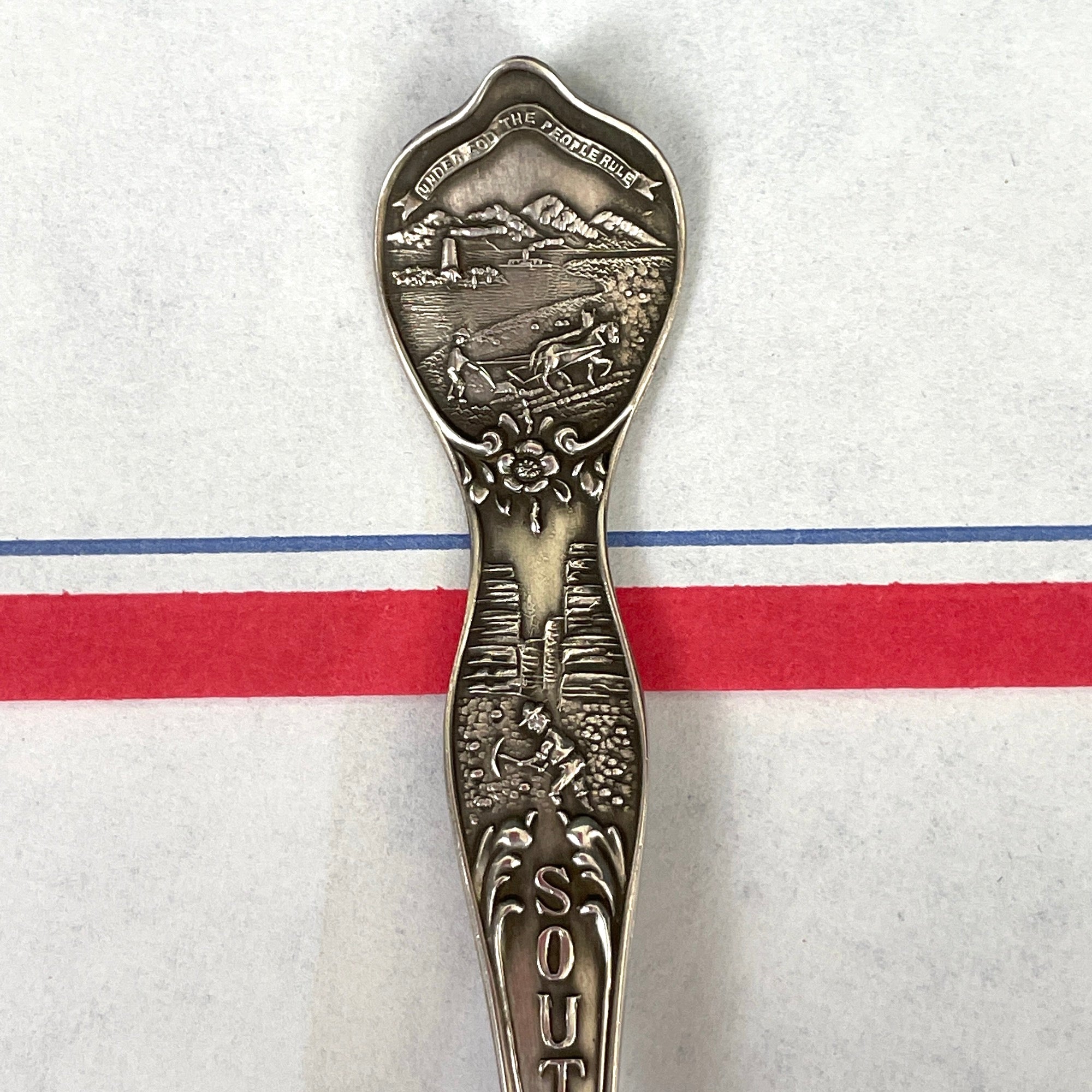 Vintage sterling silver South Dakota souvenir spoon, engraved with Groton on the bowl. Decorative engraving, small images from South Dakota history on the handle. Made by the Baker Manchester Mfg. Co. of Providence, RI between 1914-1930.