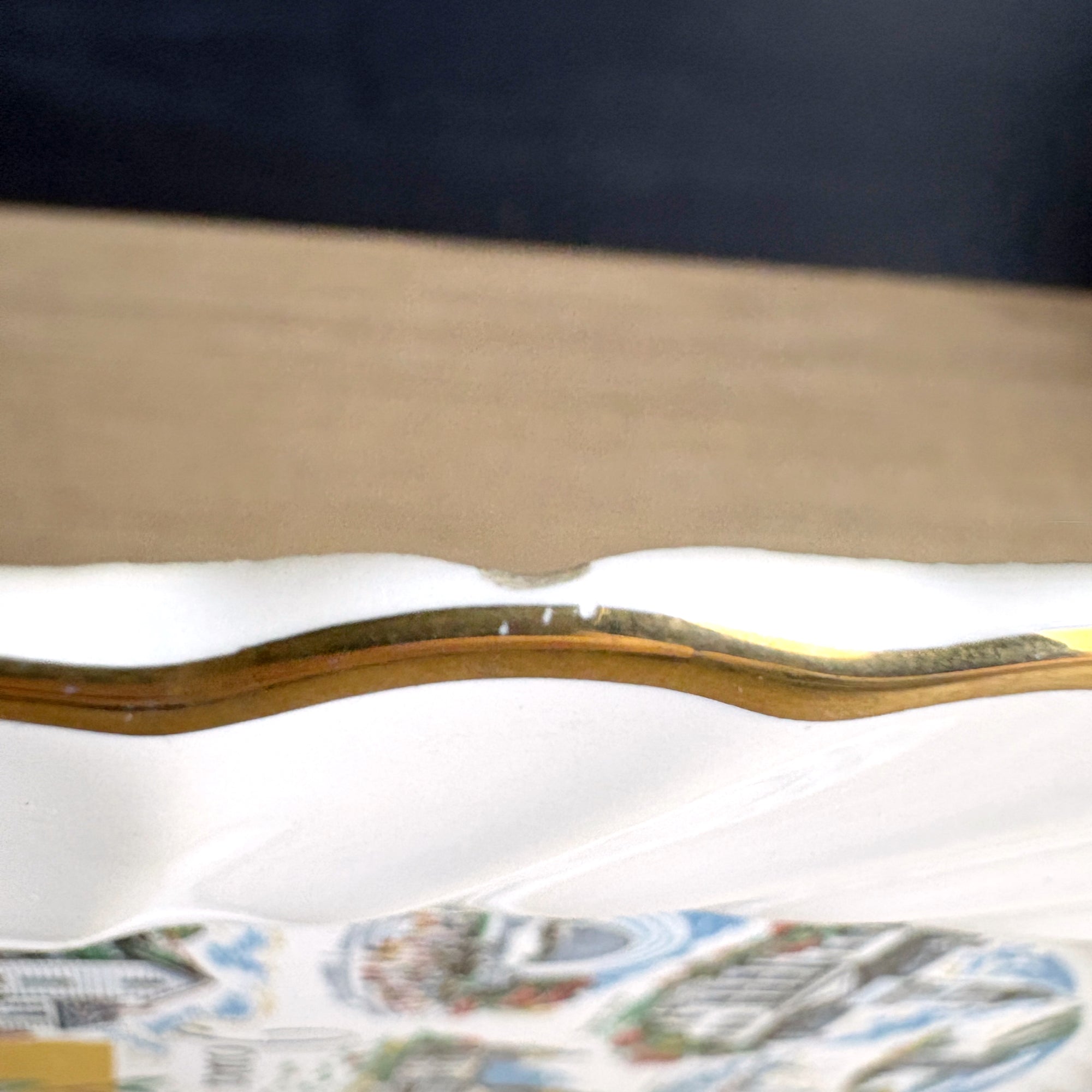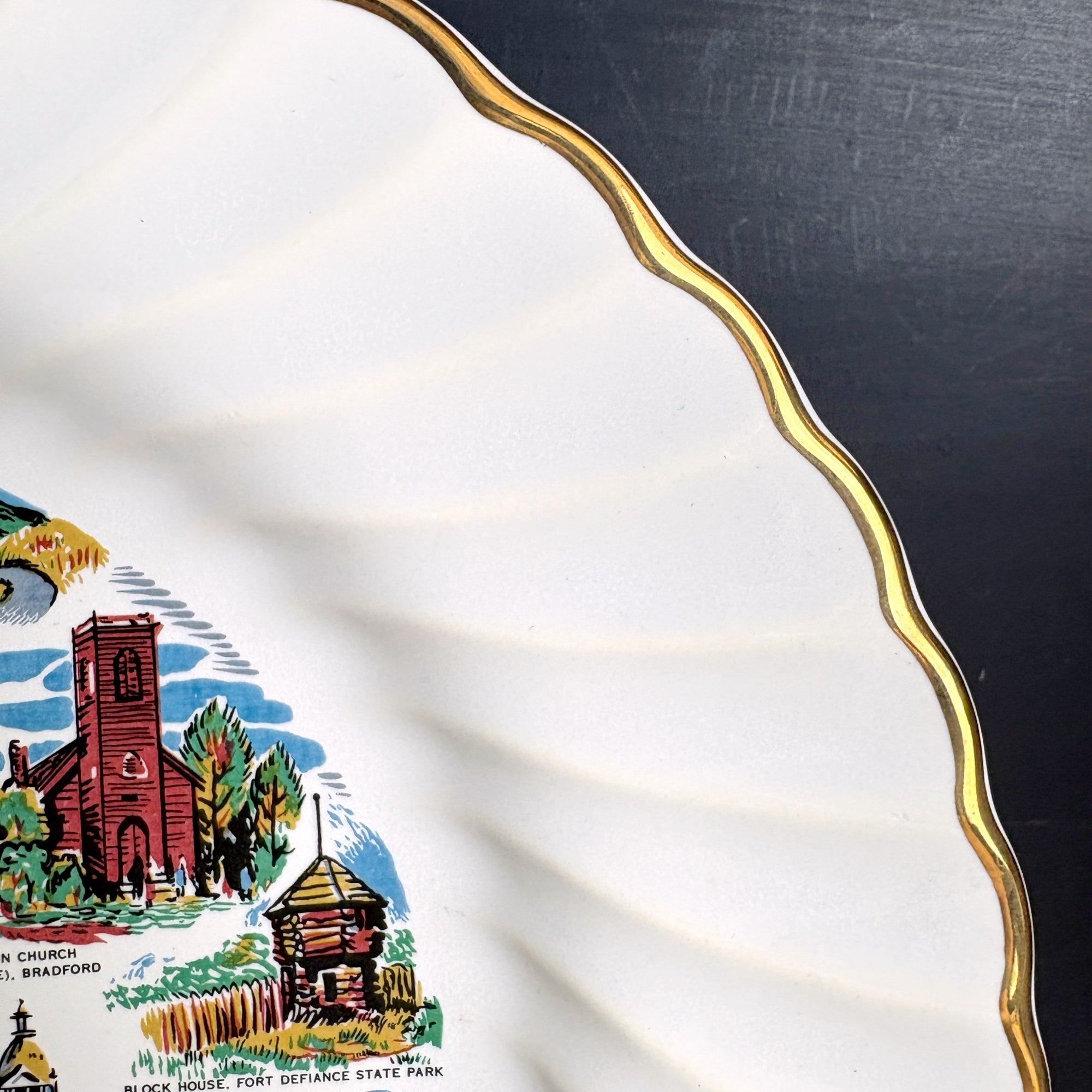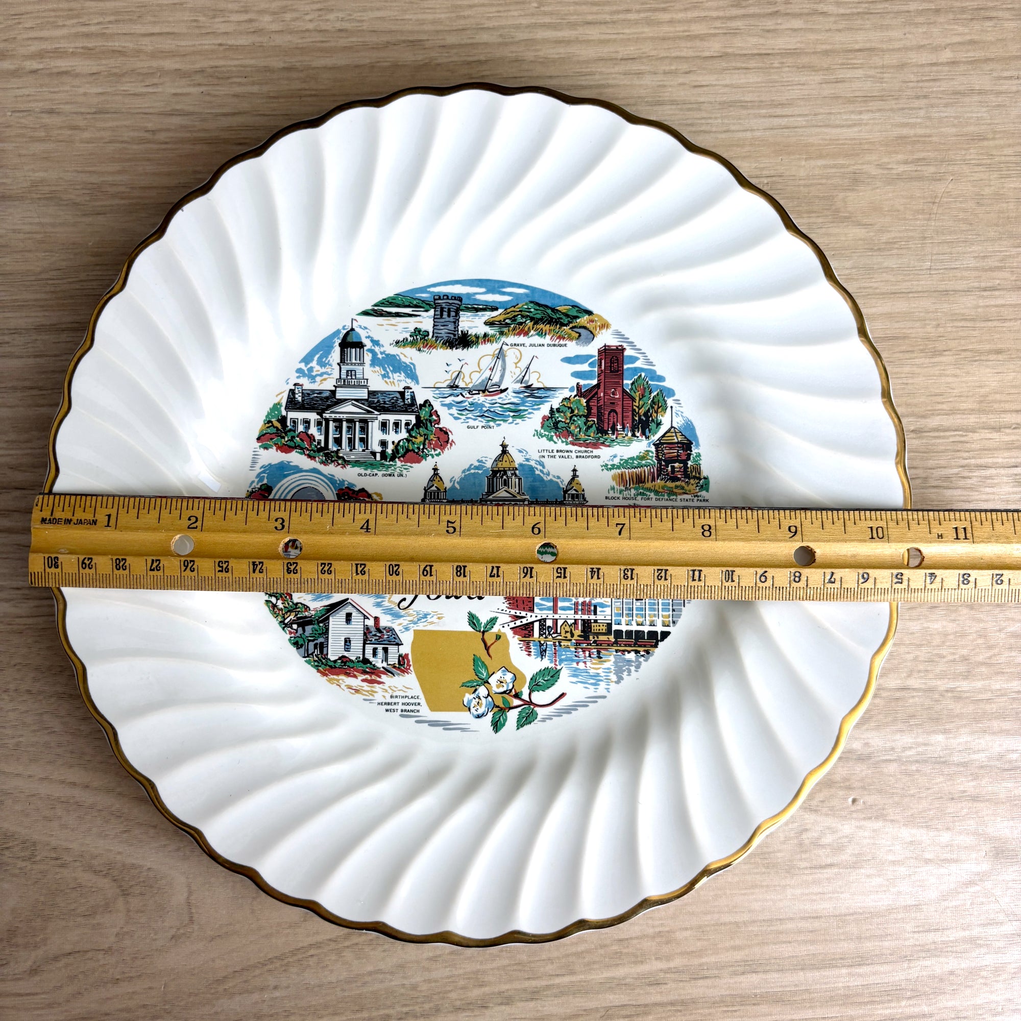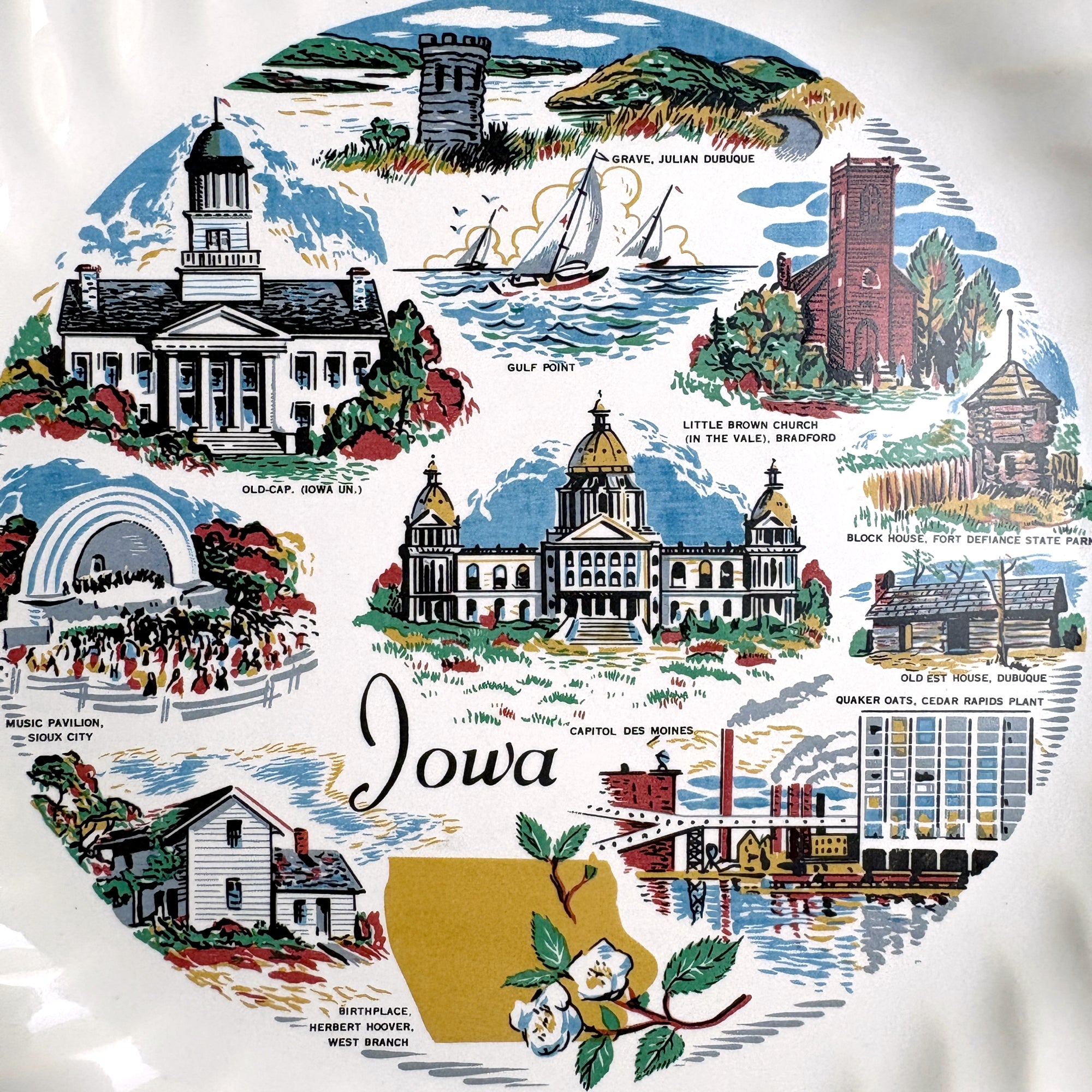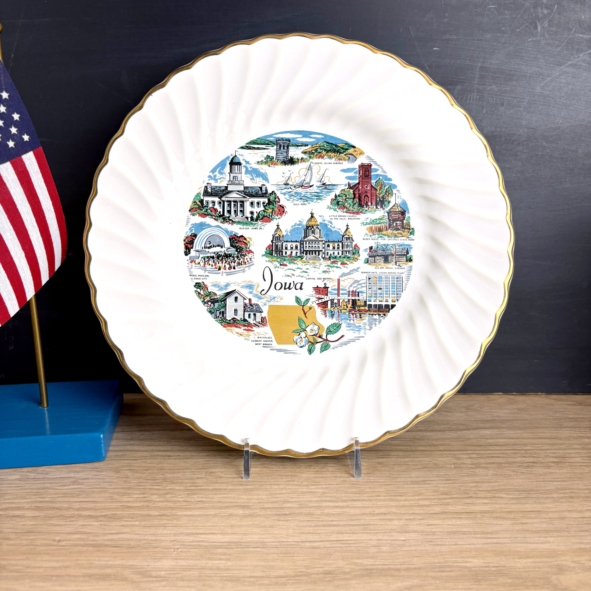 Vintage 1970s Iowa state souvenir plate is creamy white with swirled band and gold rim, with printed Iowa landmarks :