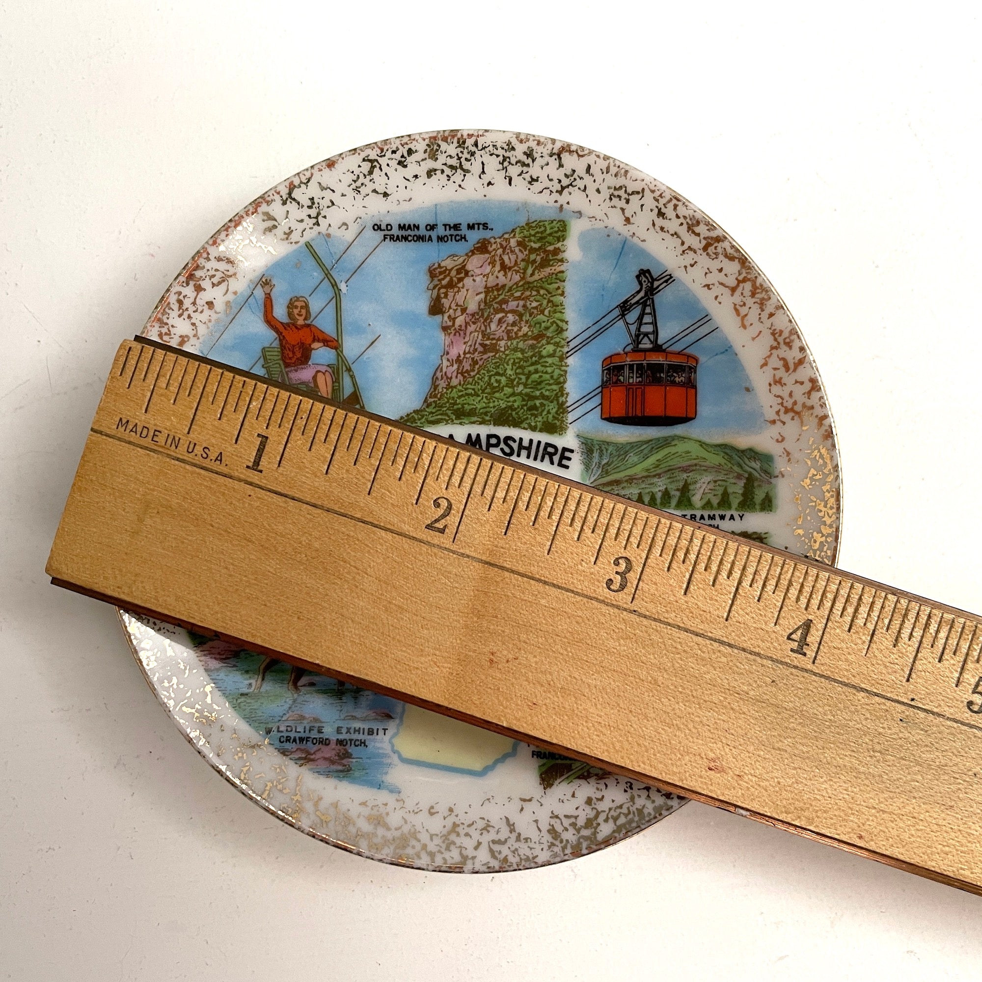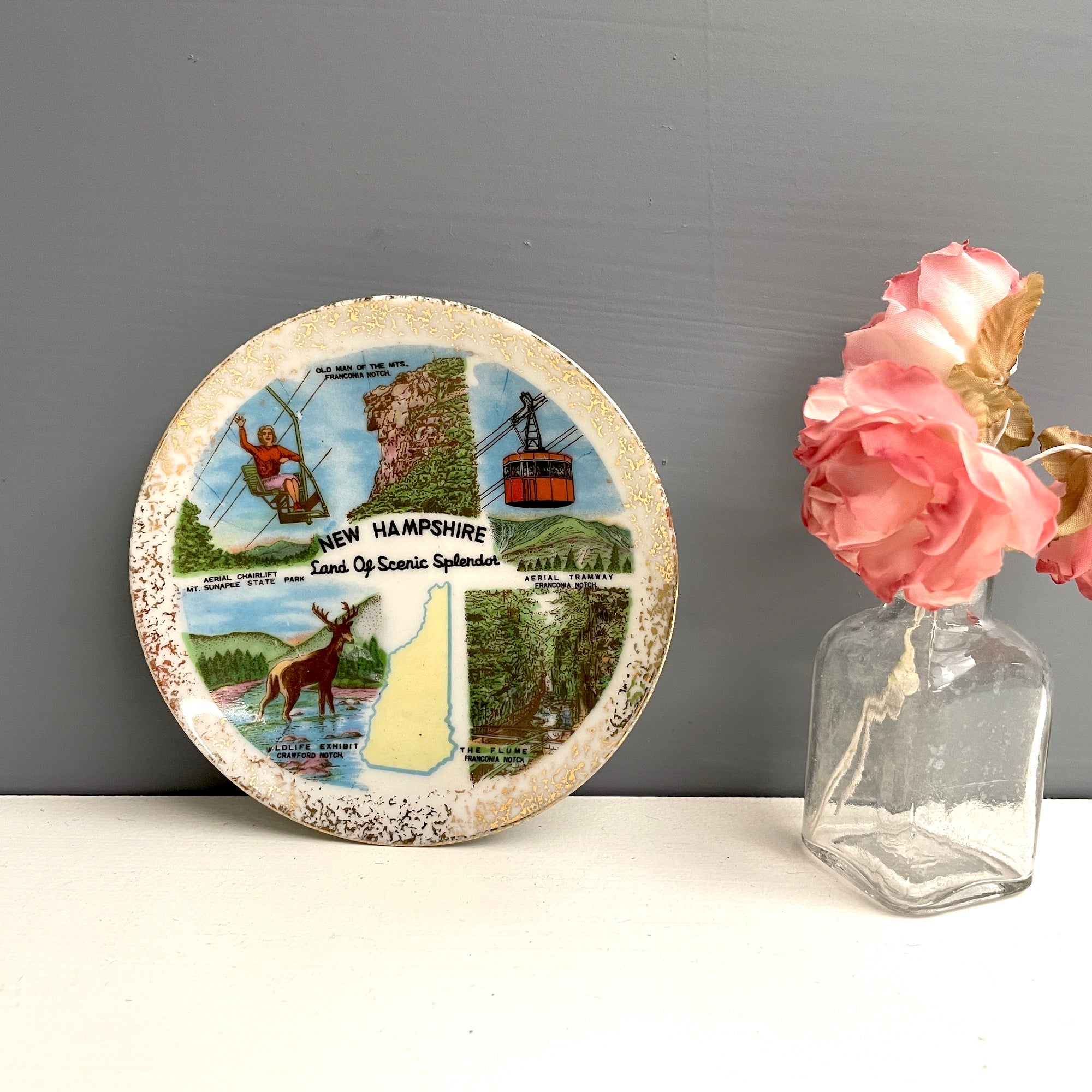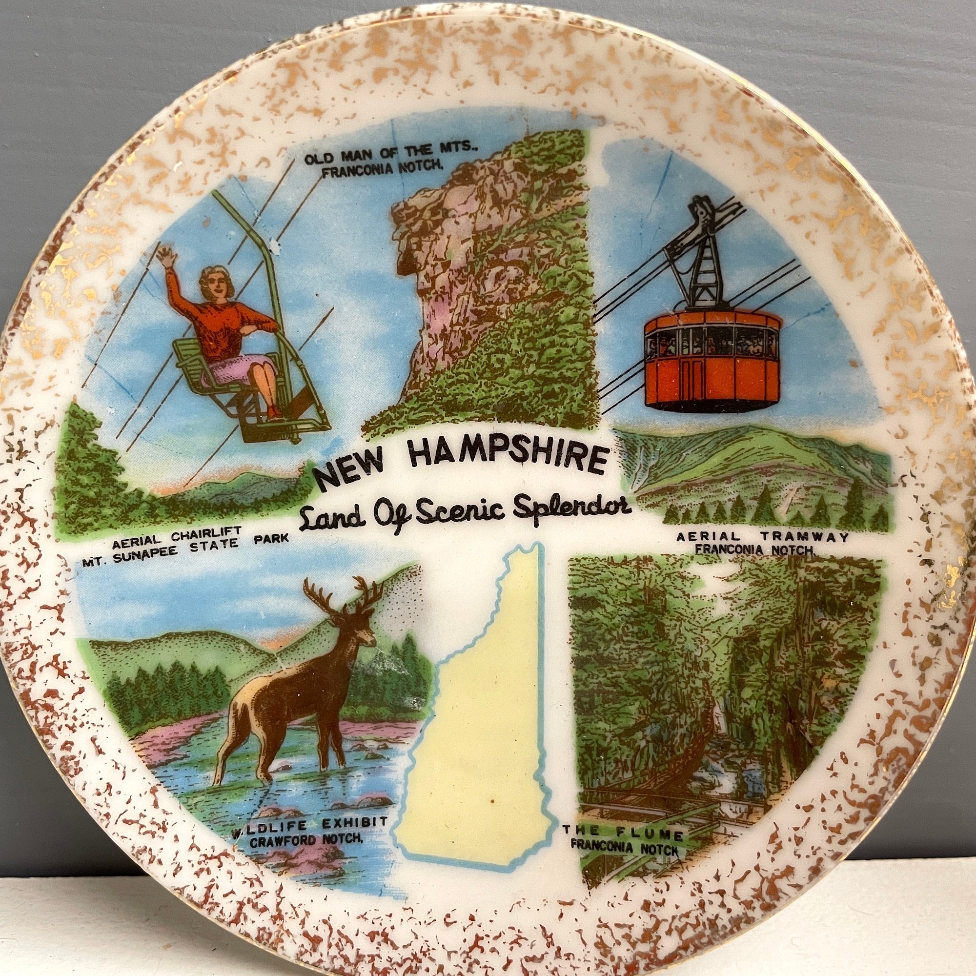 Vintage miniature "New Hampshire: Land of Scenic Splendor" plate. Includes an outline of the state with five iconic images: Aerial chairlift, Mt Sunapee State Park; Old Man of the Mts., Franconia Notch; Aerial Tramway, Franconia Notch; The Flume, Franconia Notch; Wildlife Exhibit, Crawford Notch.