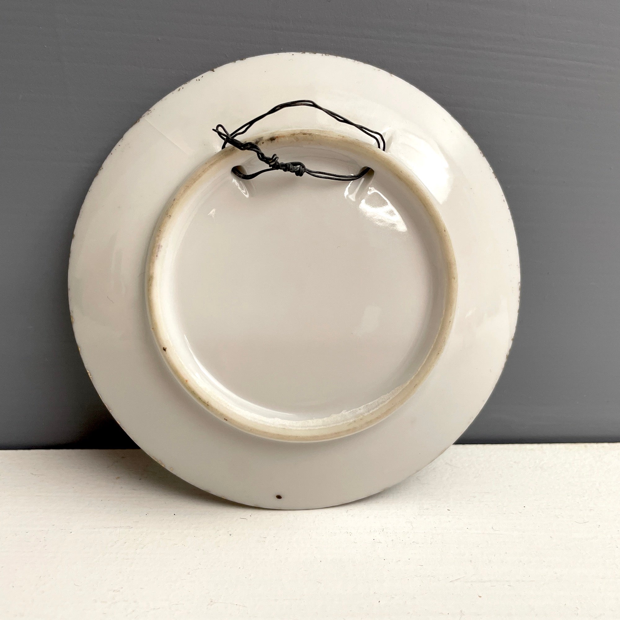 White plate with decal and gold spattered border. Holes in the back rim for hanging.