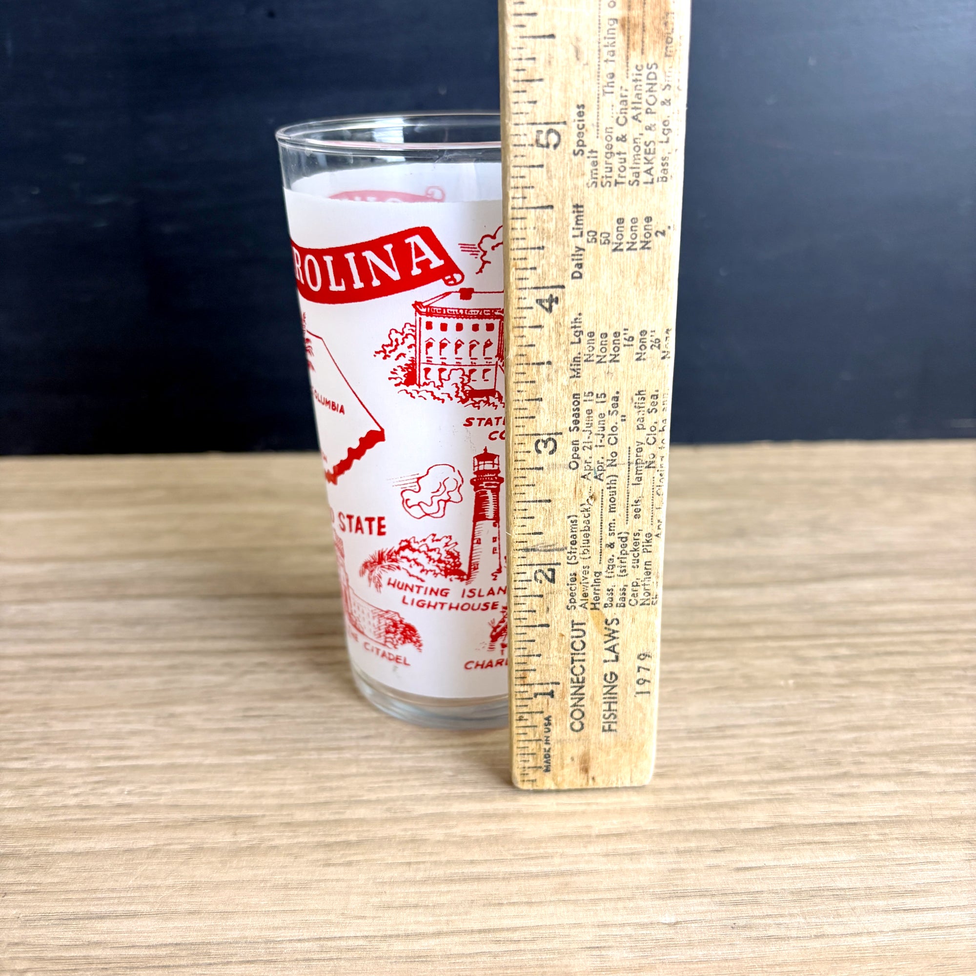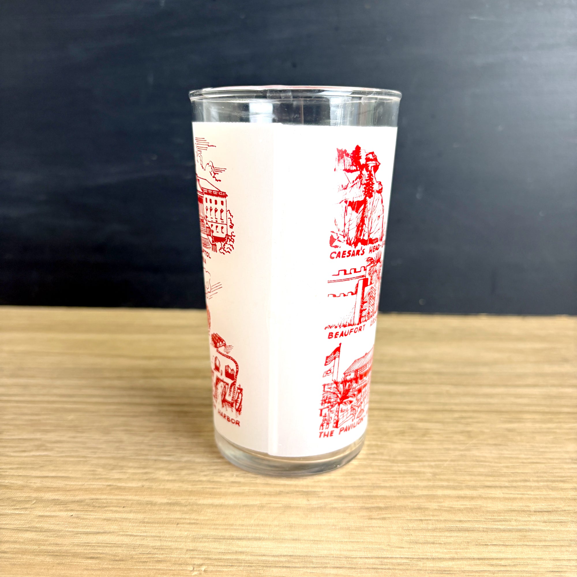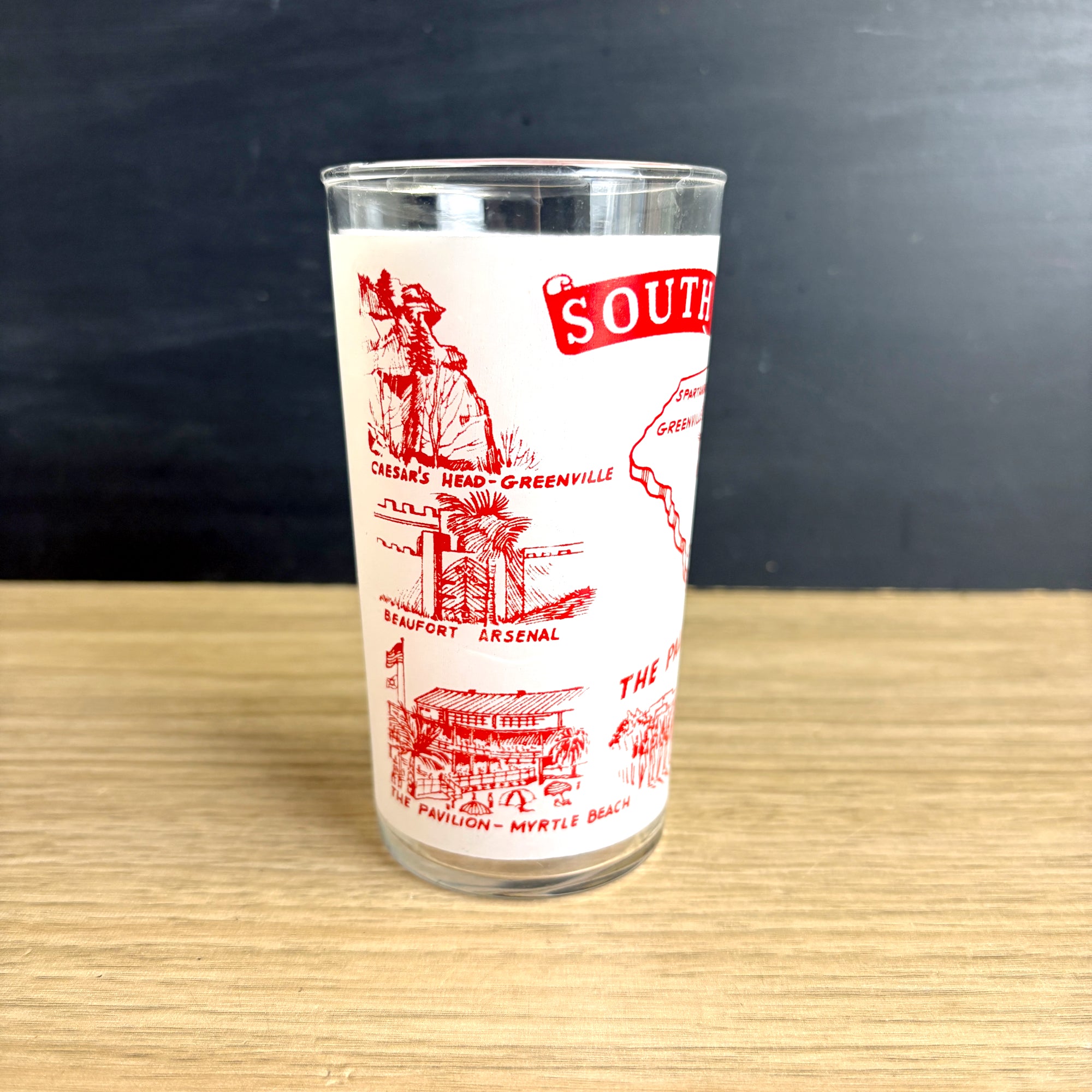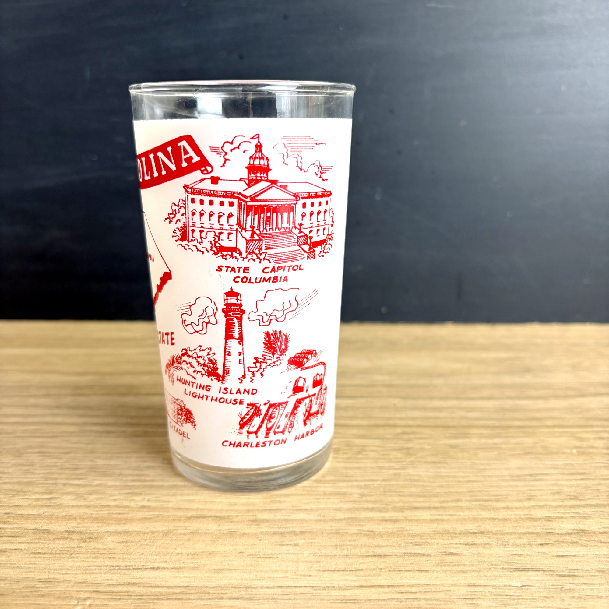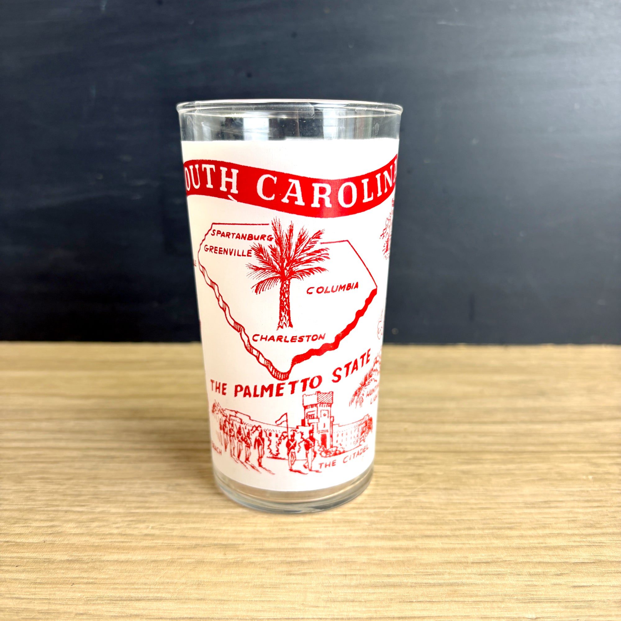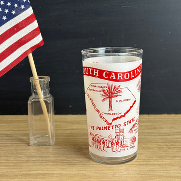 Vintage 1960s glass with red and white printed South Carolina The Palmetto State map and landmarks including Caesar's Head - Greenville, Beaufort Arsenal, The Pavilion - Myrtle Beach, The Citadel, State Capitol Columbia, Hunting Island Lighthouse, and Charleston Harbor. No maker's mark.