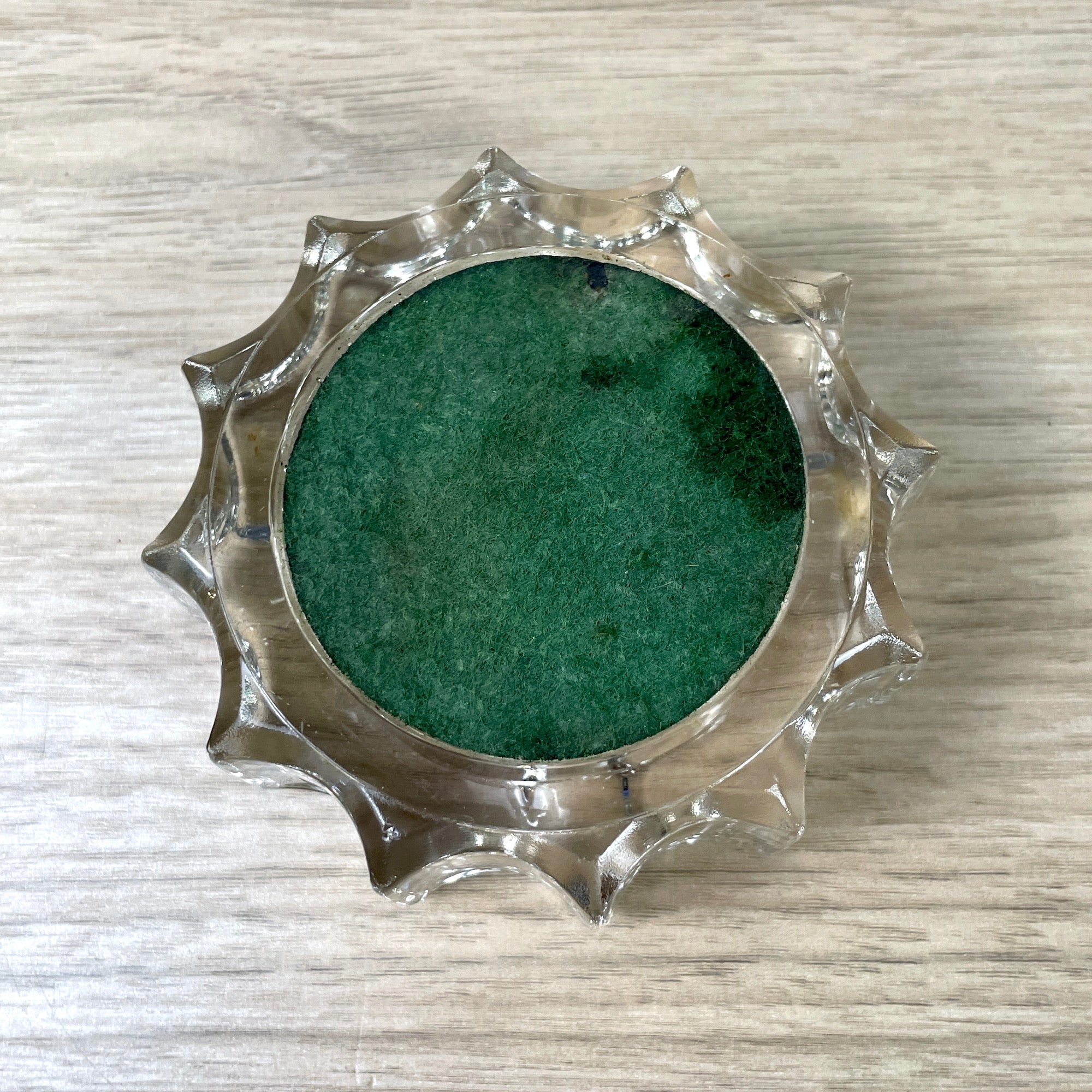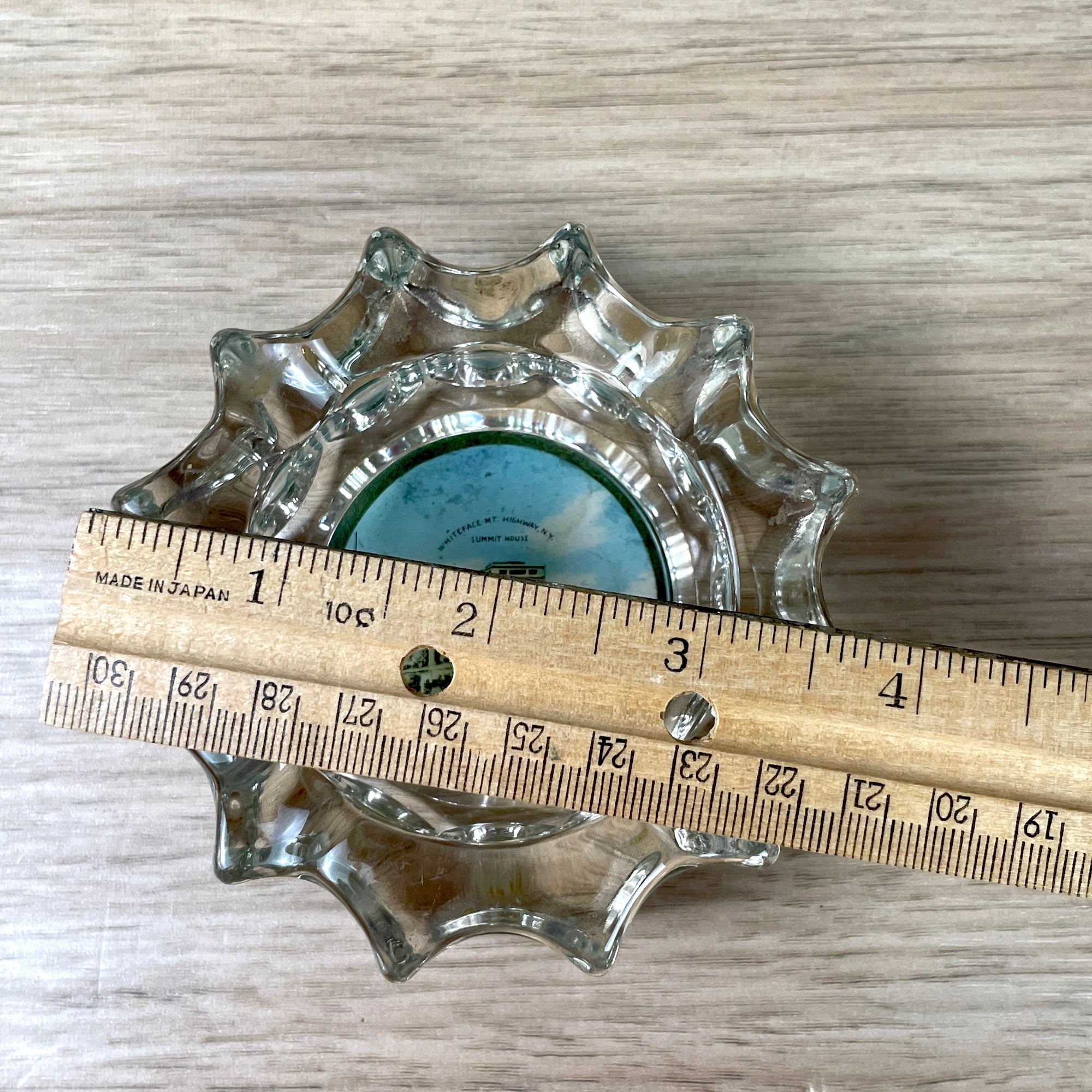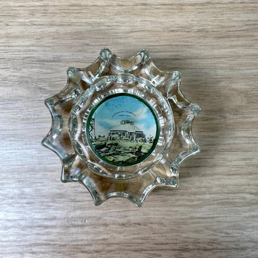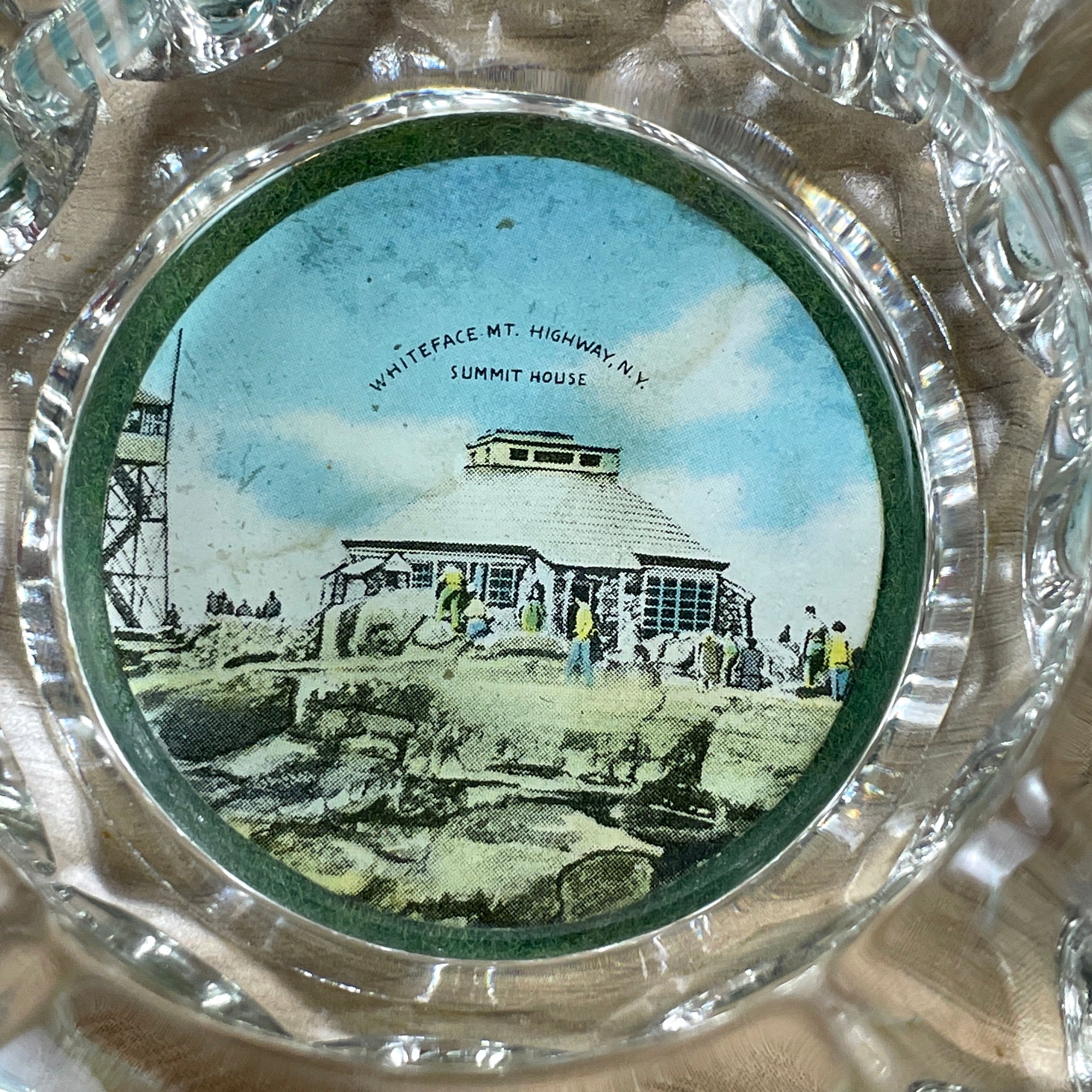 Vintage 1950s souvenir ashtray from the Whiteface Mountain Highway NY Summit House. Heavy glass ashtray with photograph glued to the base, covered with felt.