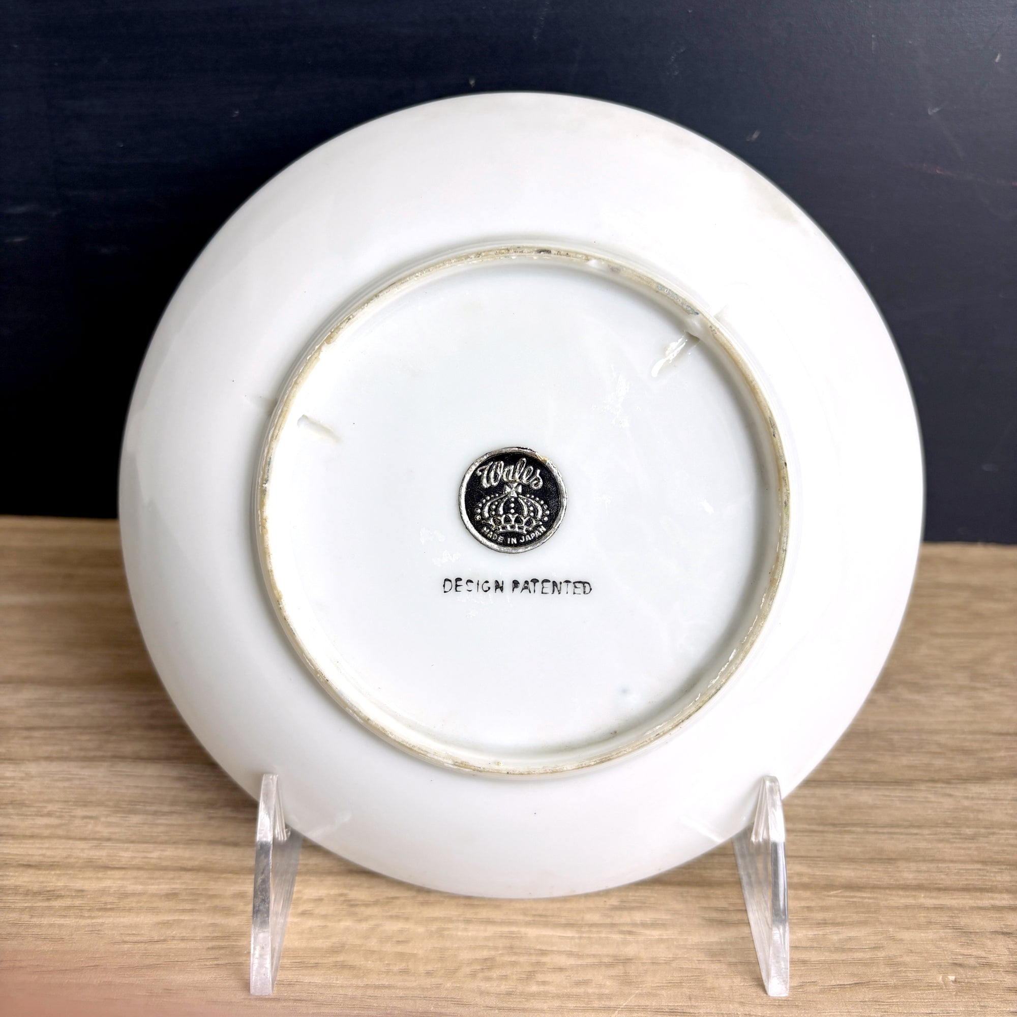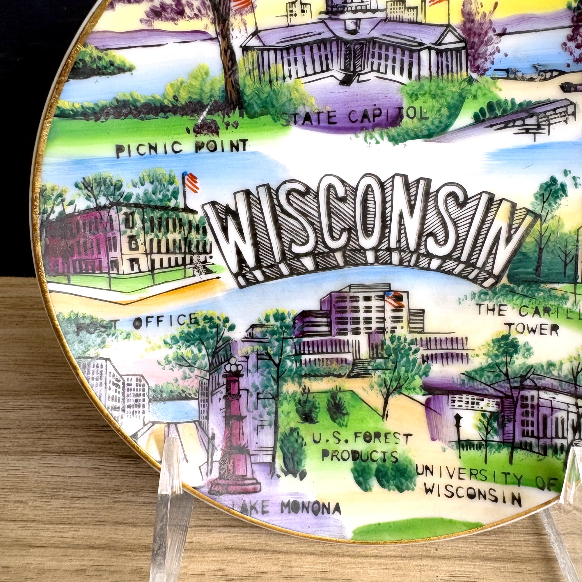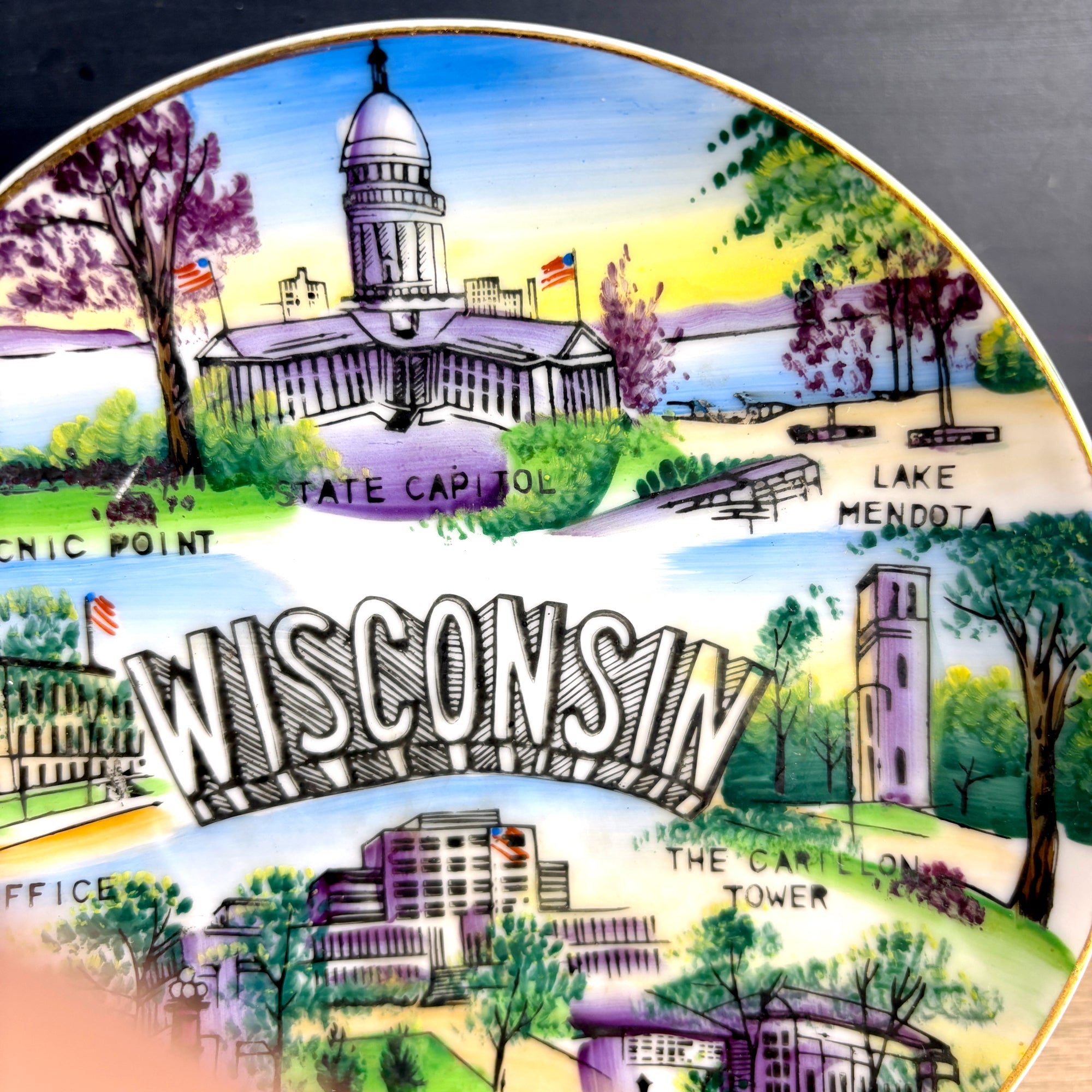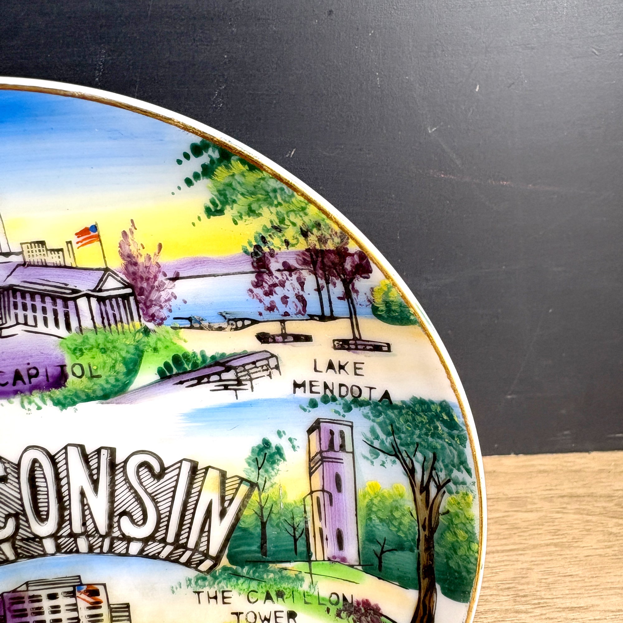 Vintage Wisconsin souvenir decorative wall plate with hand painting. Center image is the word Wisconsin surrounded by images and landmarks like State Capitol, Lake Mendota, The Carillon Tower, University of Wisconsin, U.S. Forest Products, Lake Menona, Post Office, and Picnic Point. Gold rim. Holes to run a ribbon through for hanging. Sticker on back says Wales - Made in Japan.