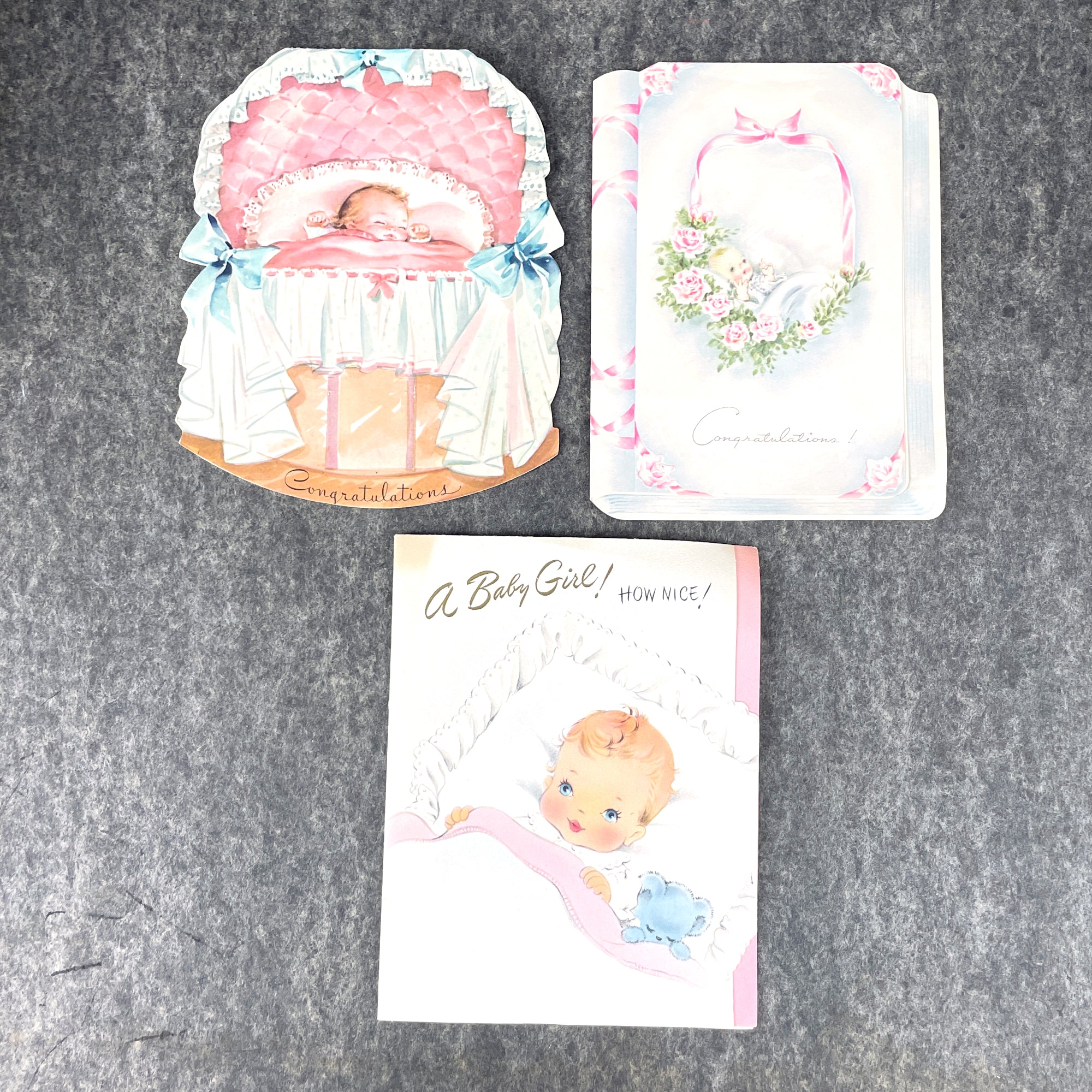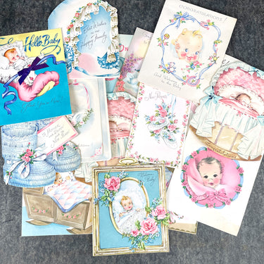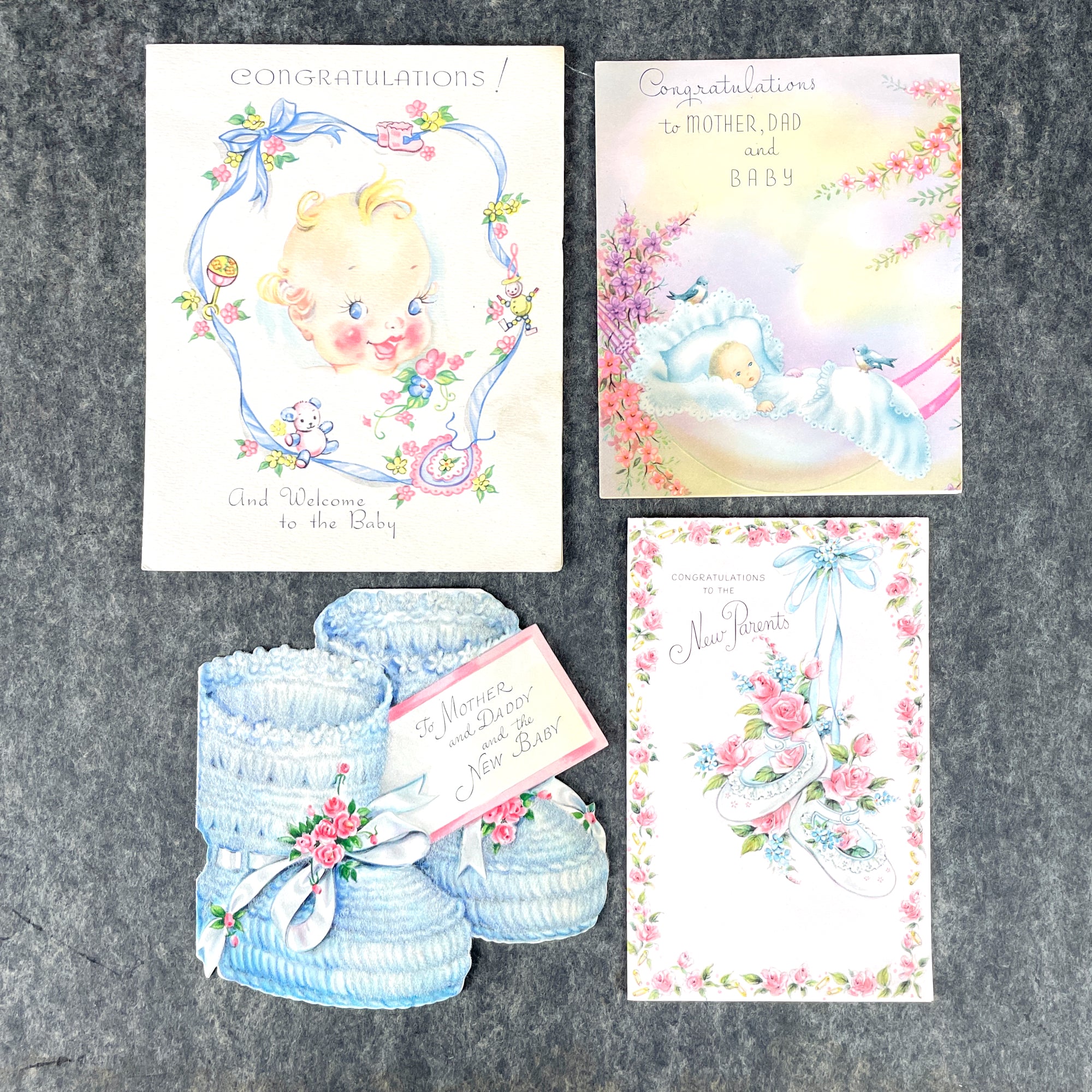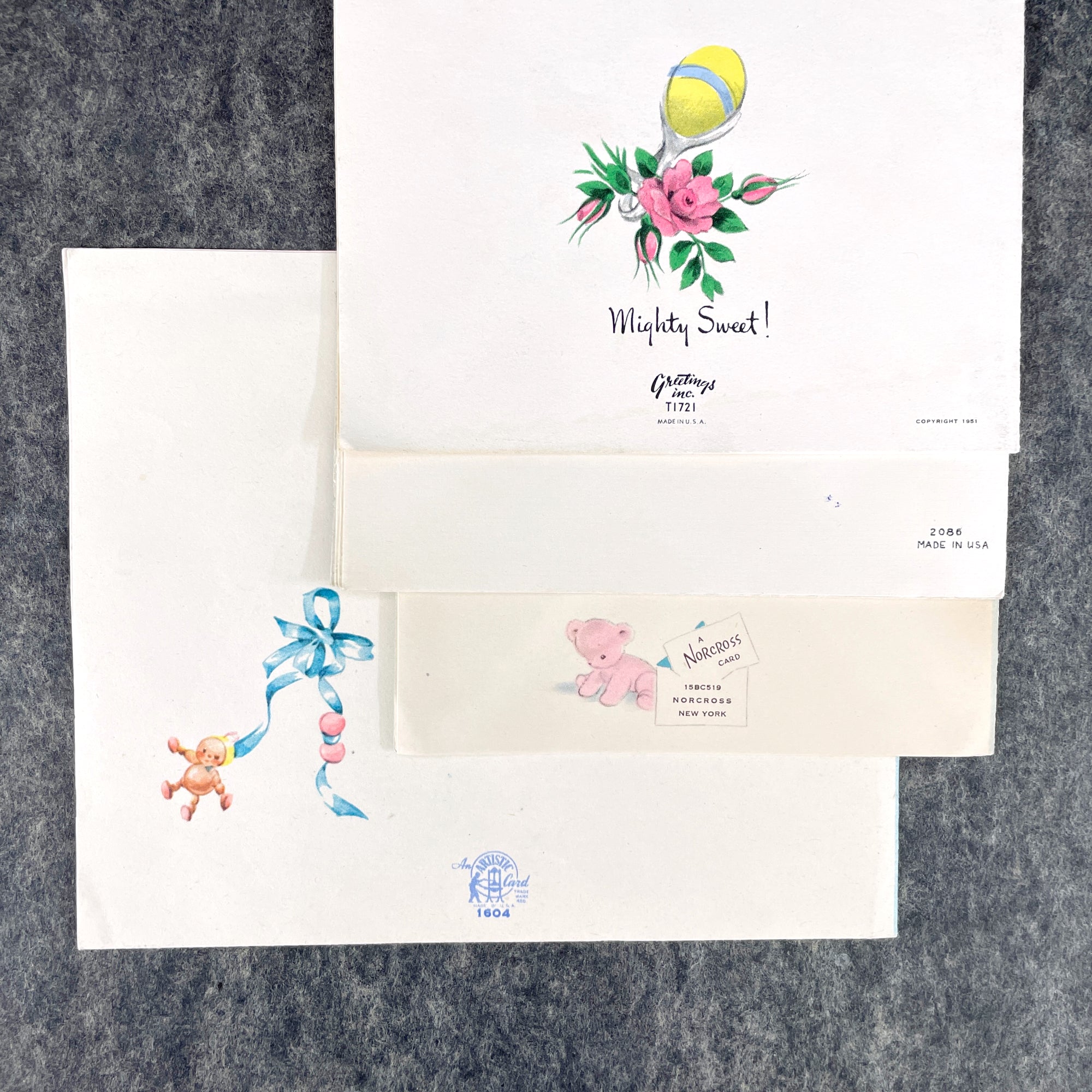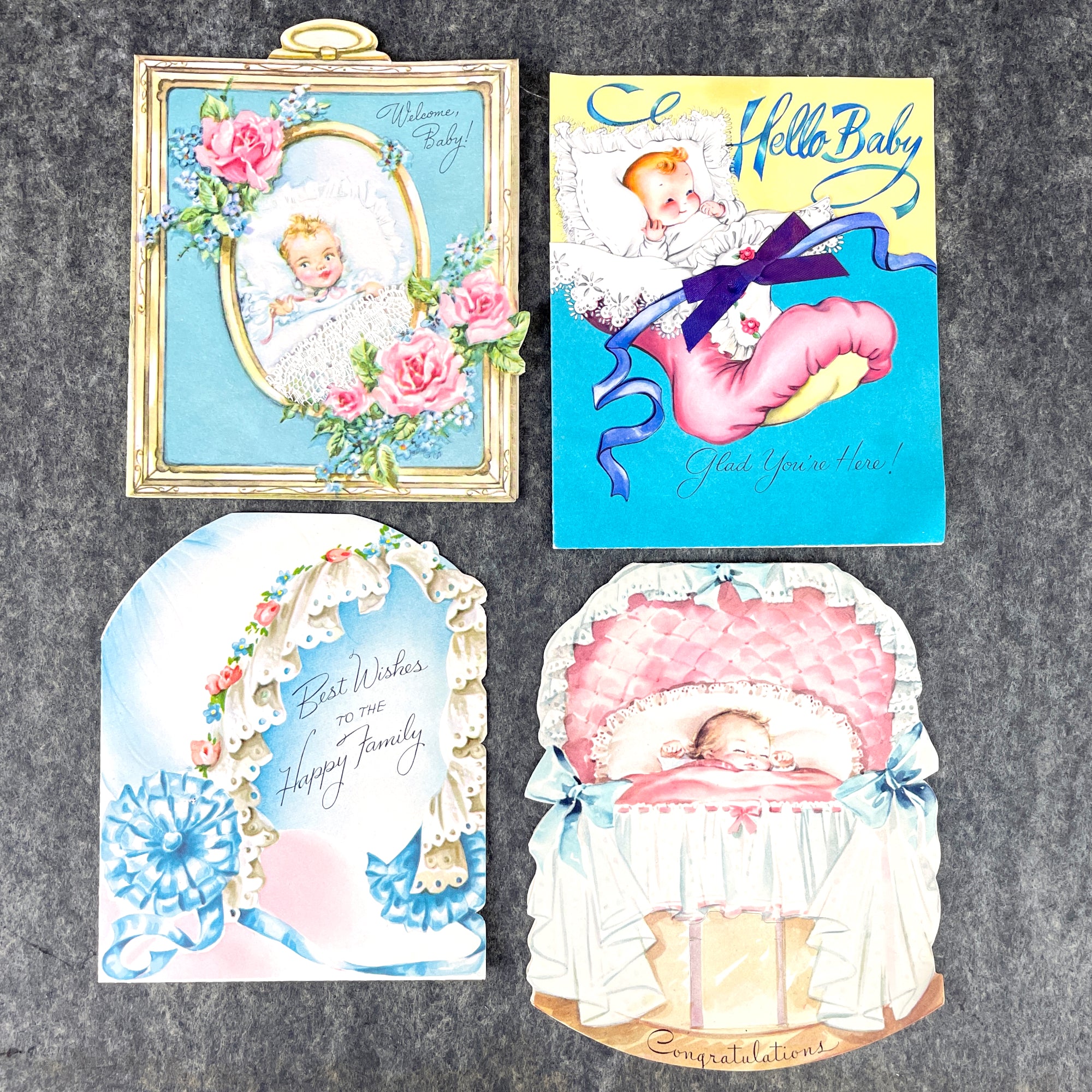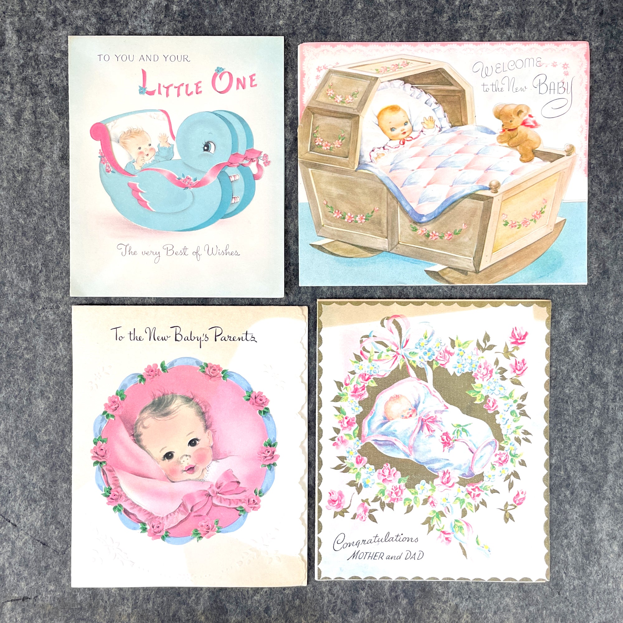 15 vintage new baby greeting cards from the 1950s for collecting and art projects. All are used. No envelopes.