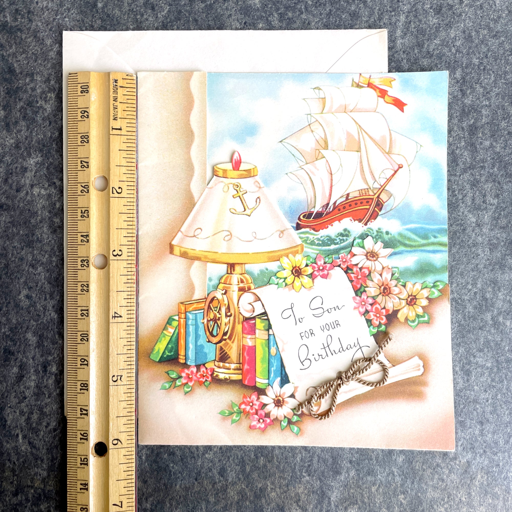 Collection of unused greeting cards, 6 with envelopes. Adorable Gibson 3rd birthday is a pop-up. 2 pastel wedding cards, 1 petite Hallmark Christmas card, thinking of you with birds, and nautical son birthday all have envelopes. 4 Cute kitty bride and groom cards from Rust Craft have no envelopes.