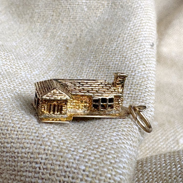 Live out your mid century modern house dreams with this nicely detailed 14K ranch house charm or pendant. L-shape with front door, windows, garage door, chimney and bay window.