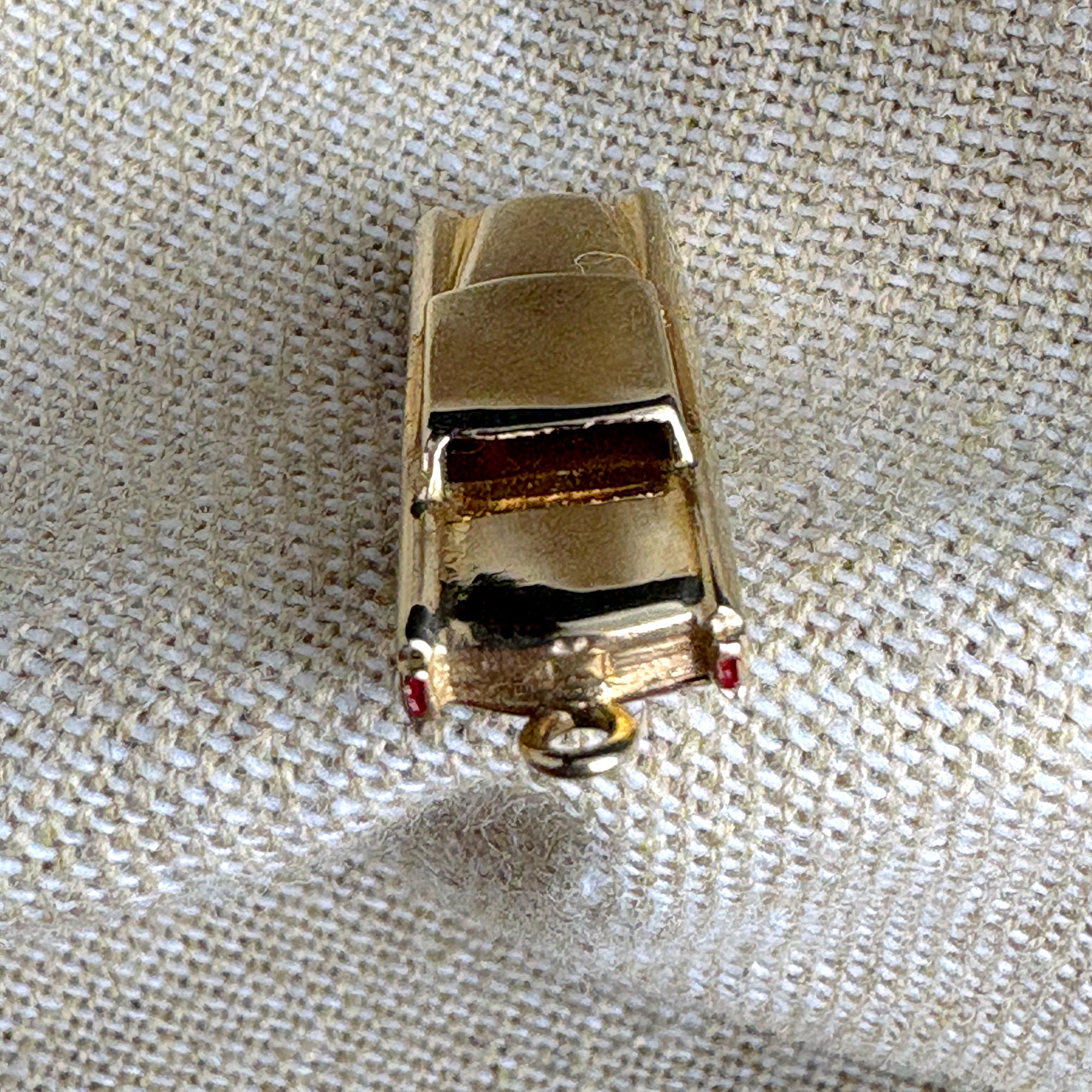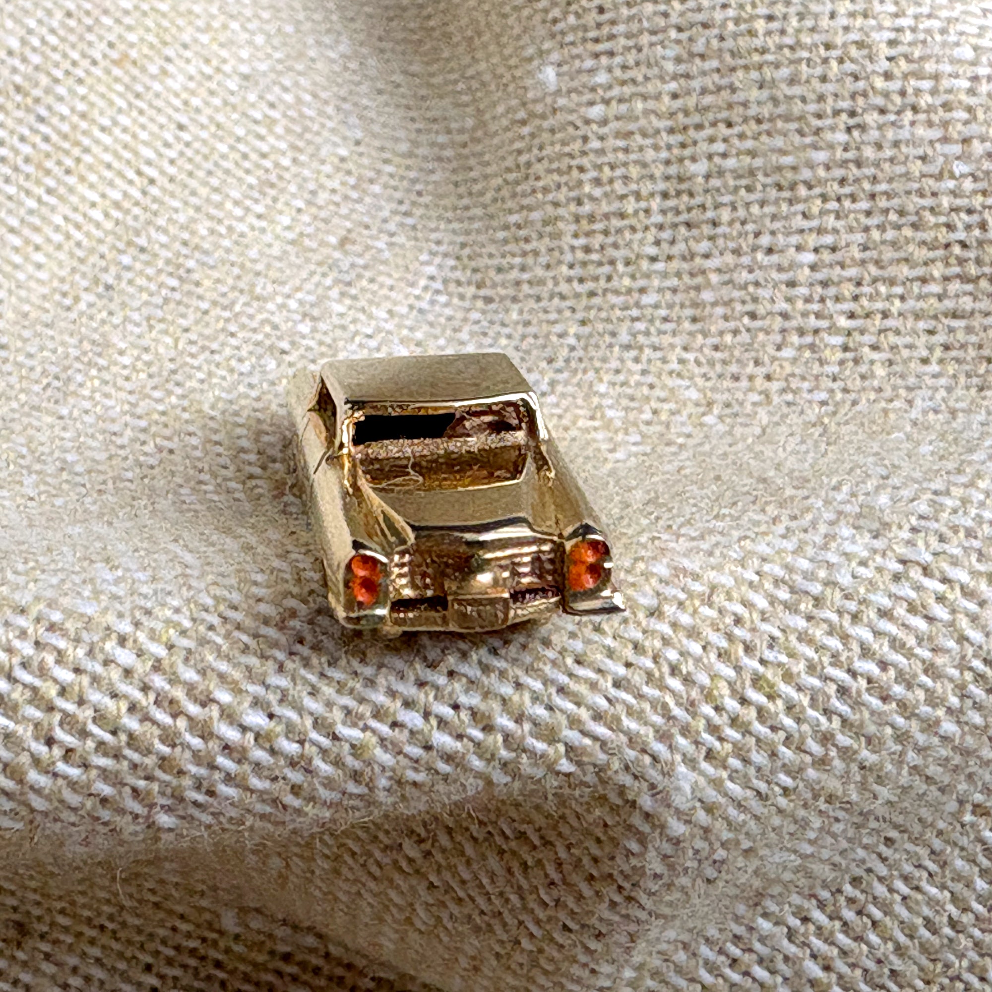 Vintage 1960s 14k gold charm of a loooong sedan with spinning wheels. Coral colored enamel on the headlights.