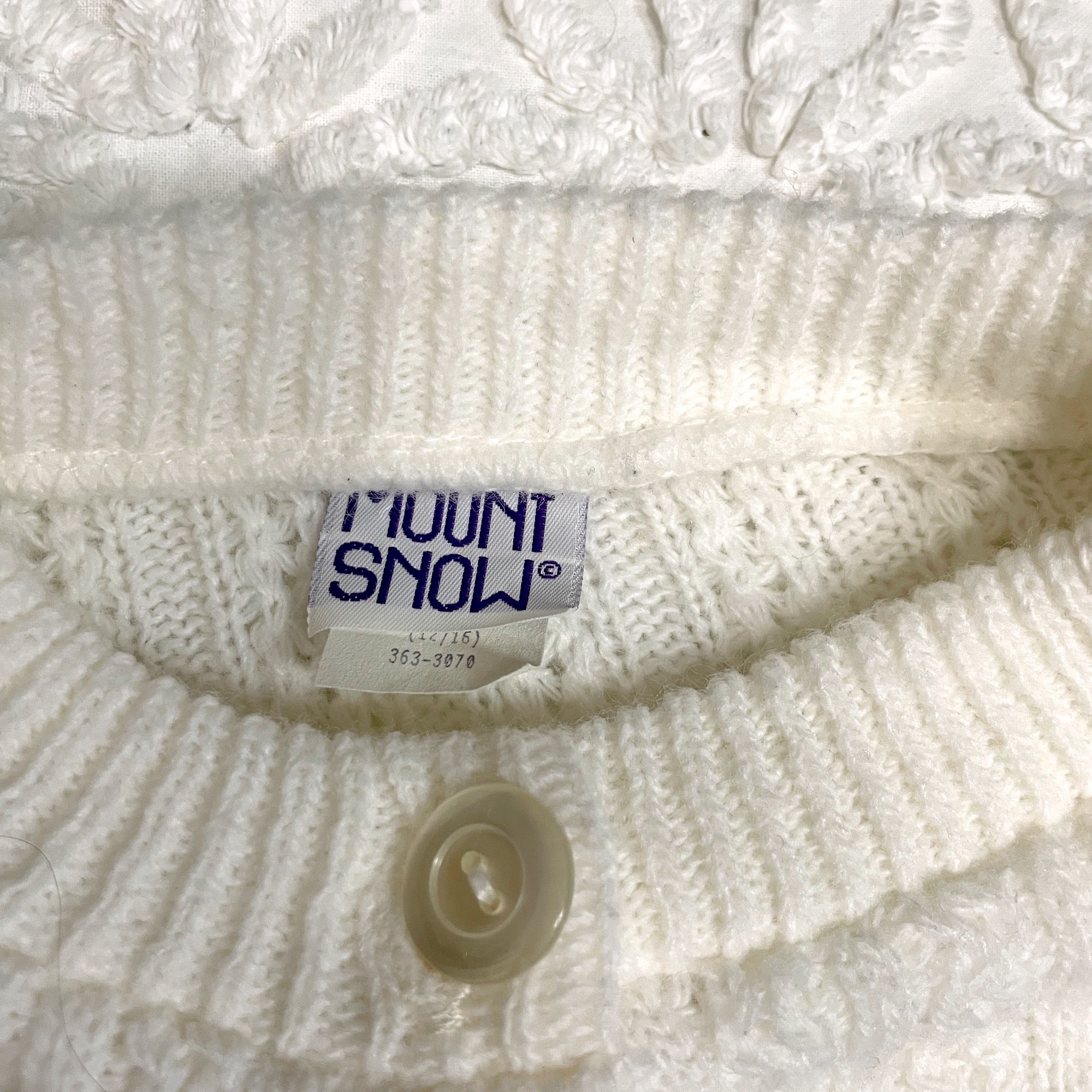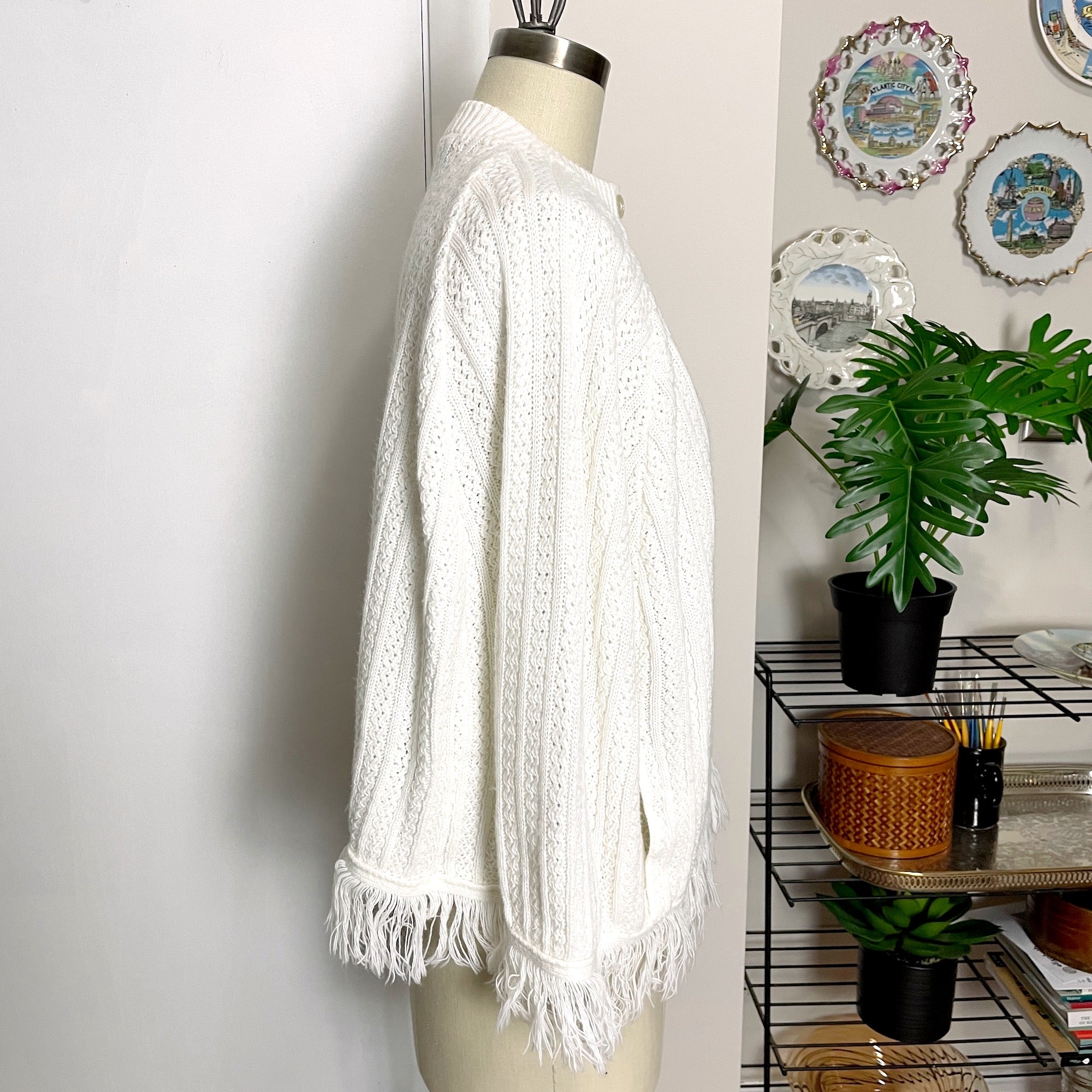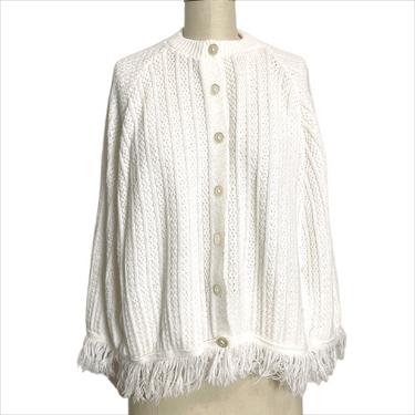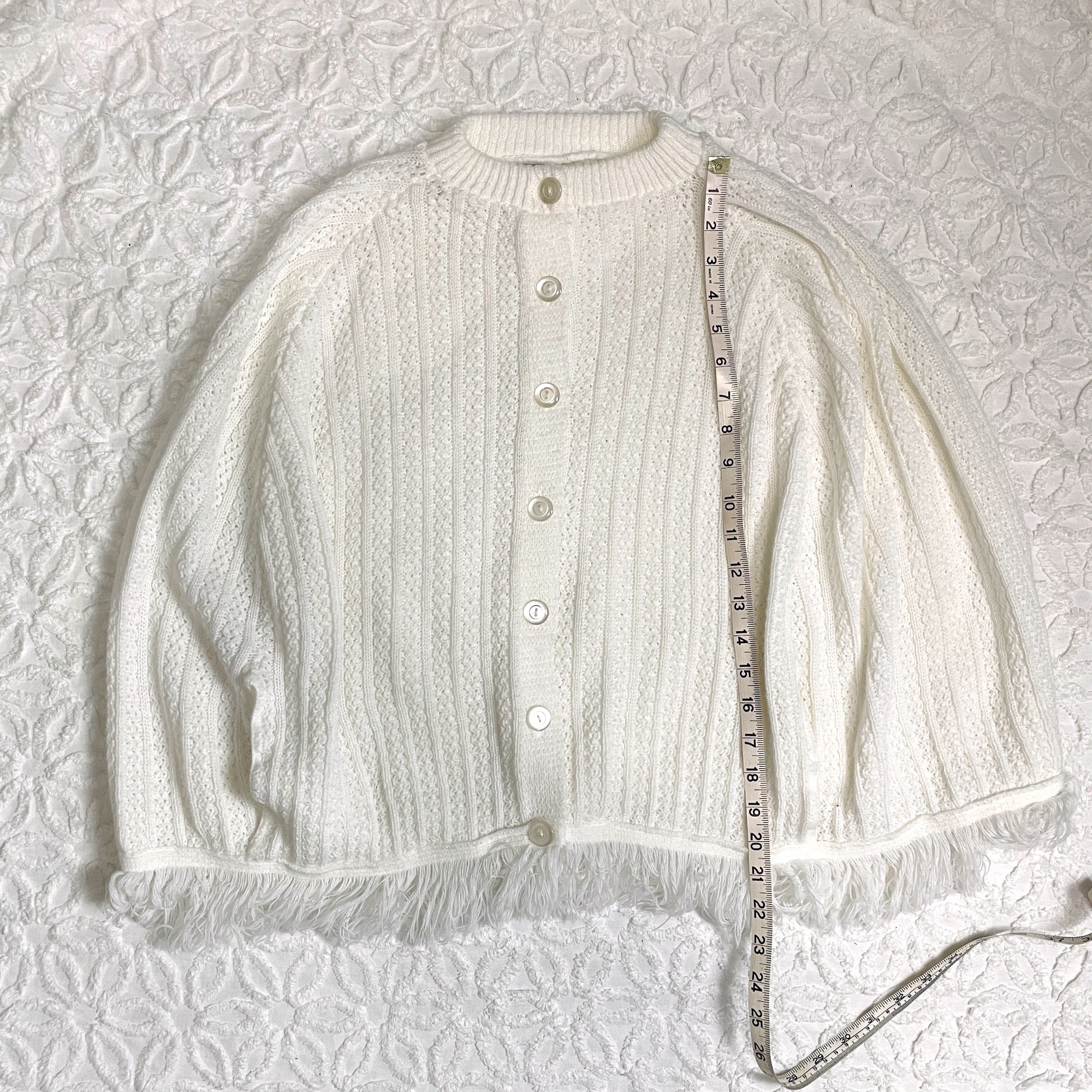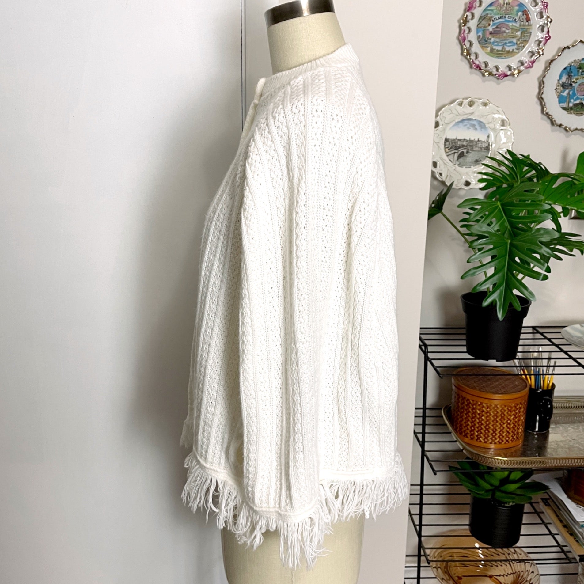 Vintage 1960s sweet white knit cape with pearl buttons and fringe. Raglan shaping. Ribbed at the neck. By Mount Snow. Made in USA.