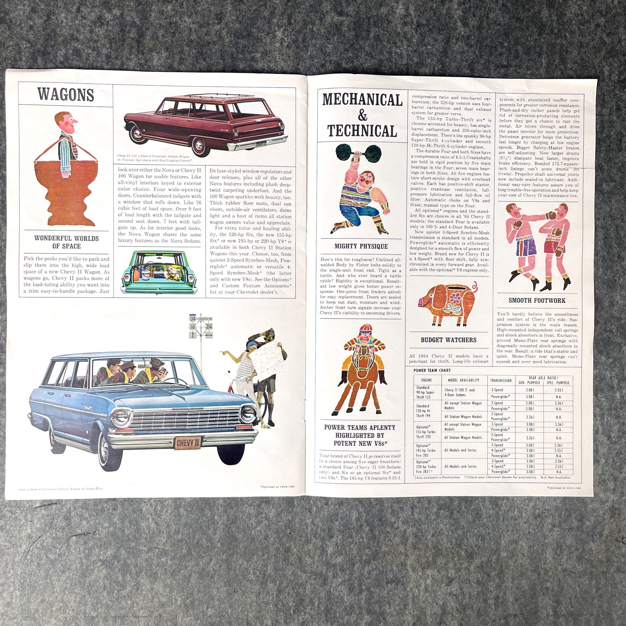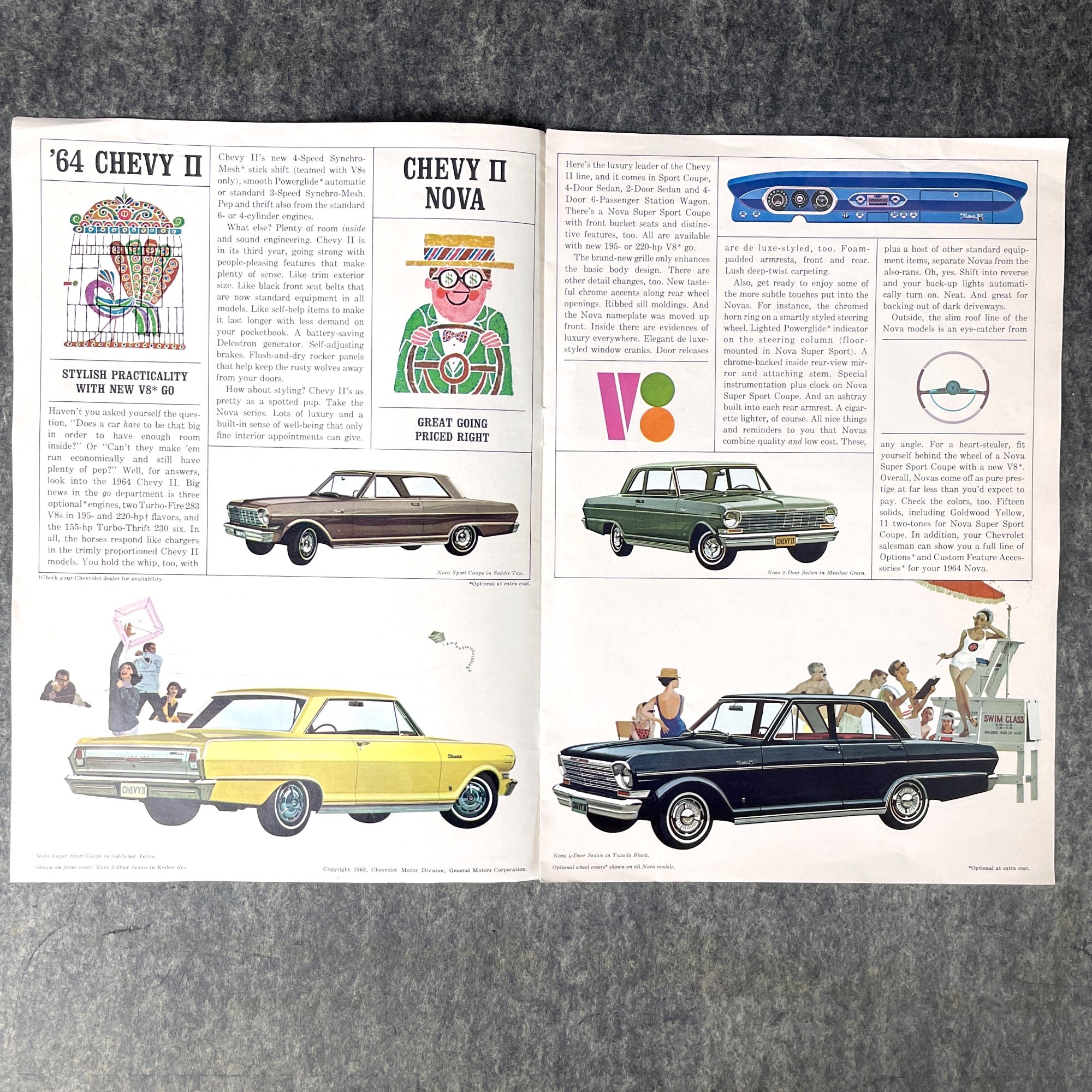 Vintage 1964 Chevy II promotional booklet. 1963 copyright. Includes Chevy II Nova and Chevy II 100 and Wagons. Includes specs. Awesome illustrations and photos.