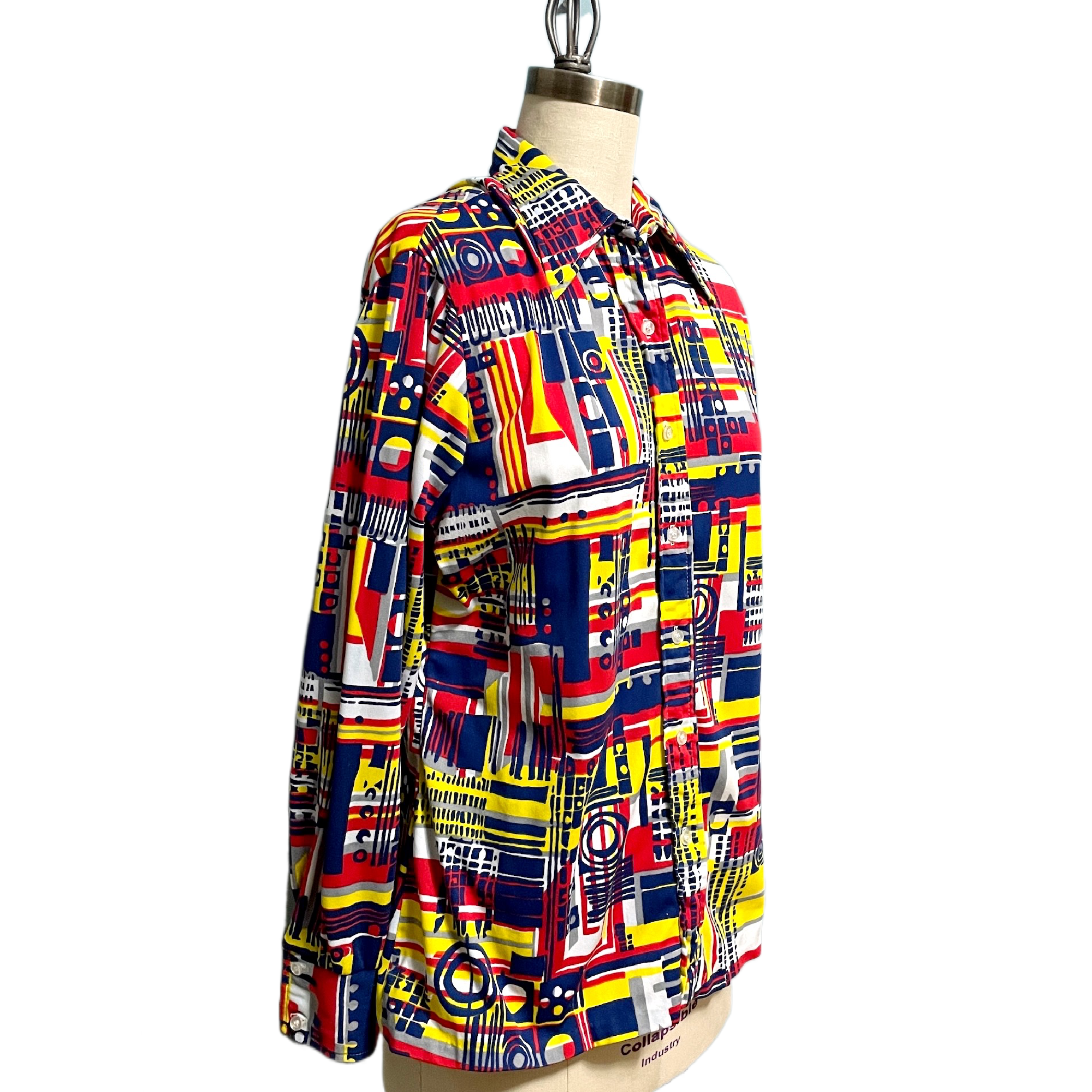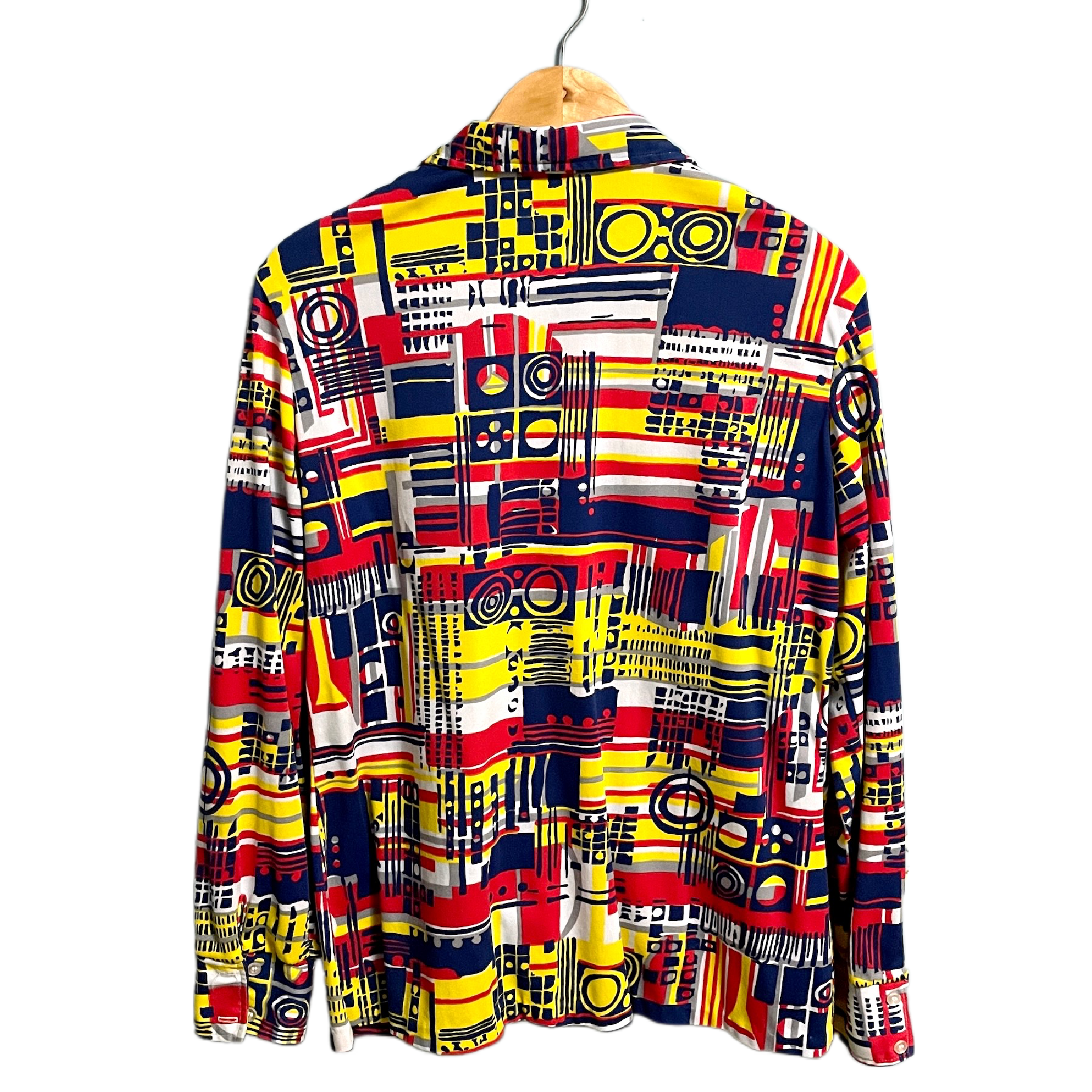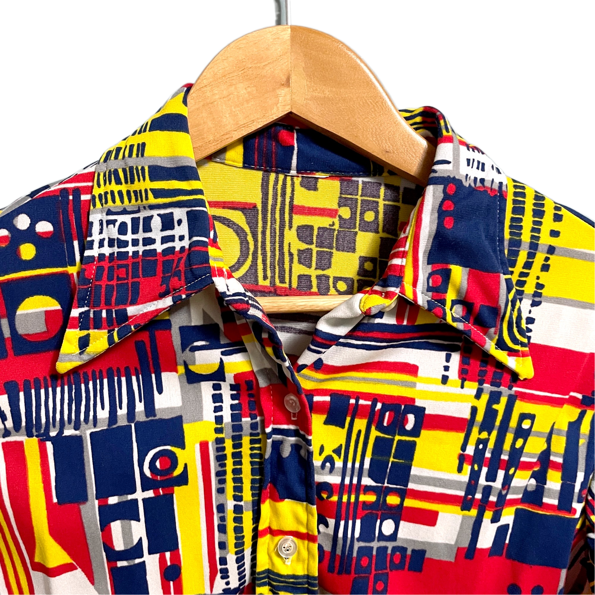 Vintage 1970s geometric print shirt, straight from the disco era. Bright primary colors with white and gray. Pointed collar. Button front. Two button cuffs. No tags. It's Saturday night, you've got the shirt, now all you need is some dancing fever.