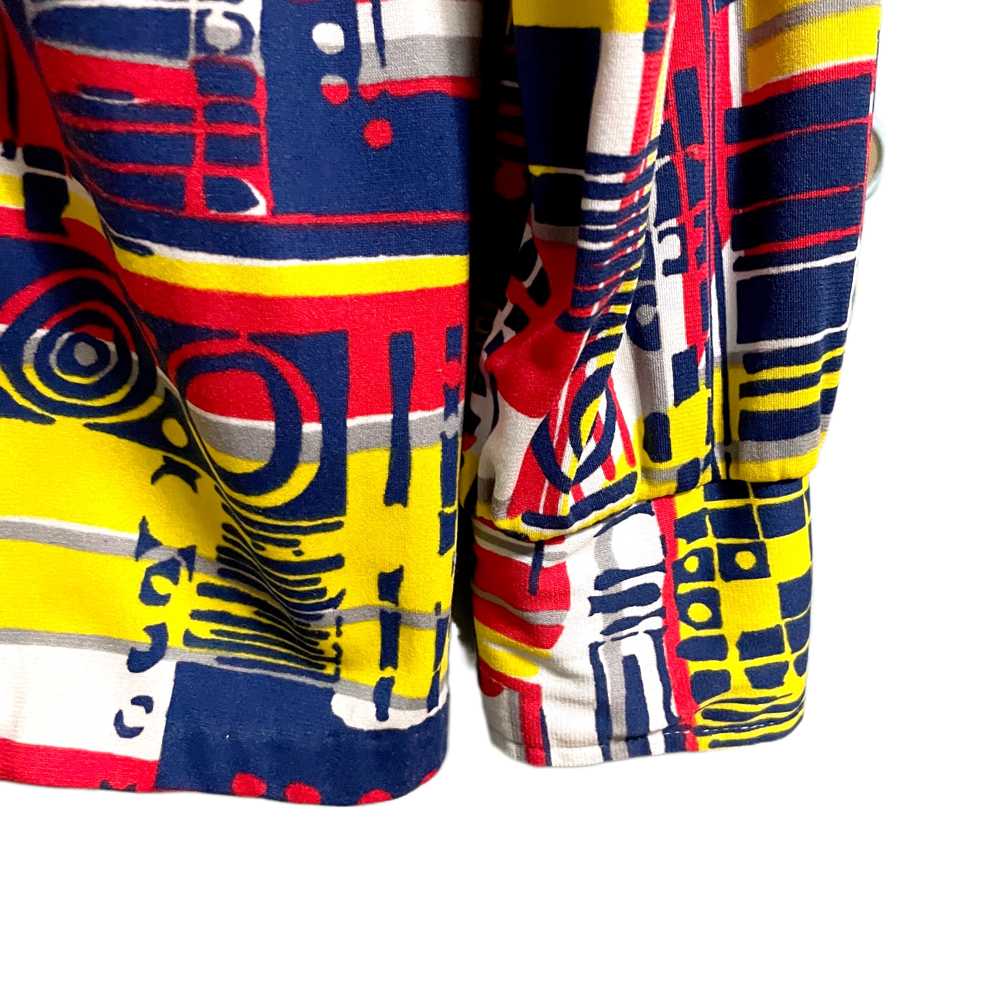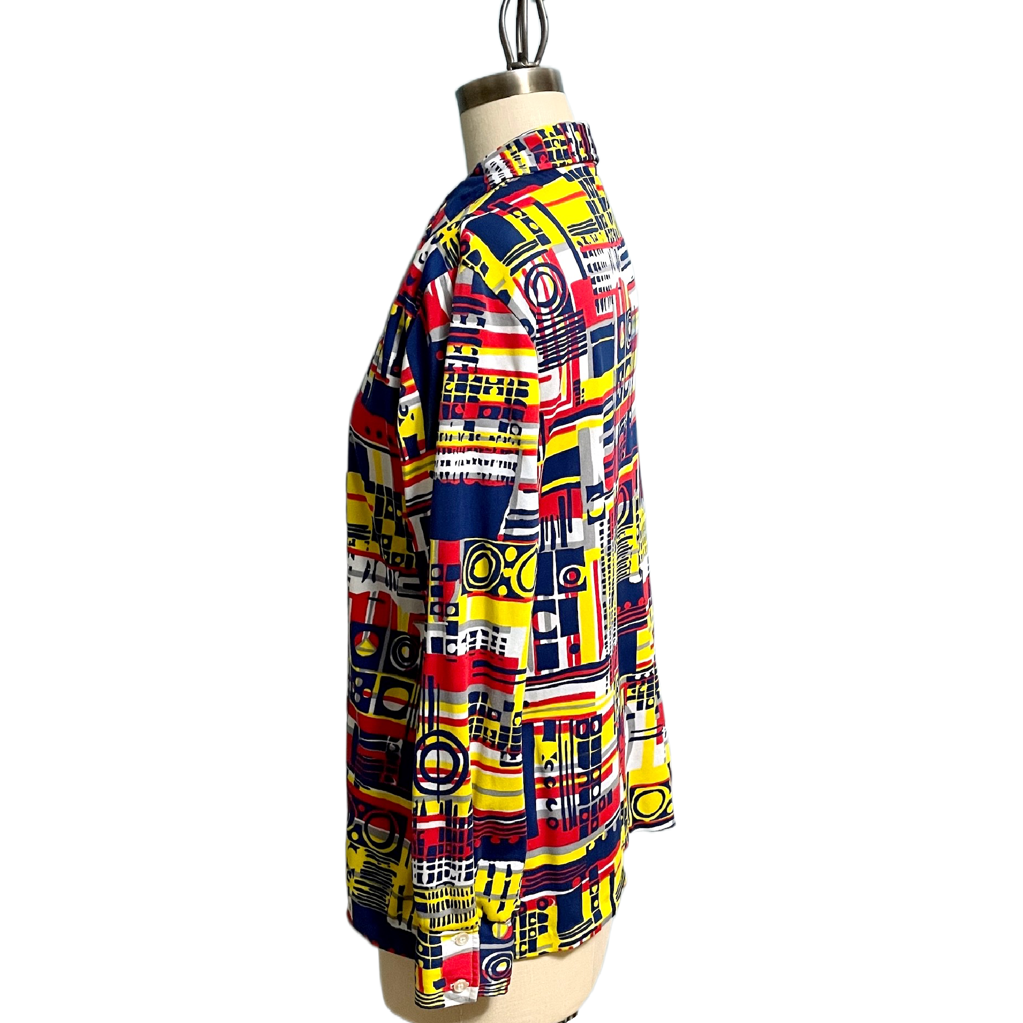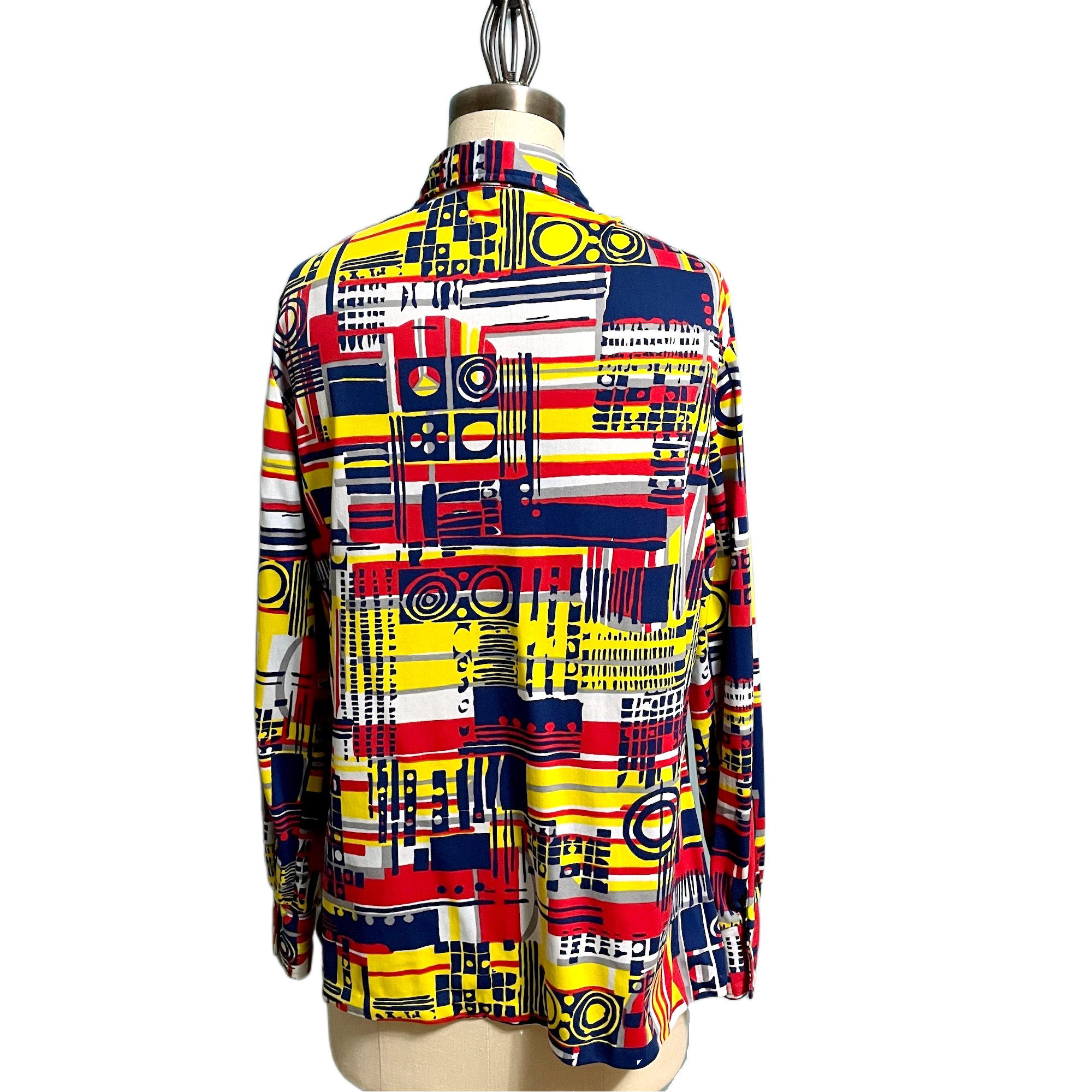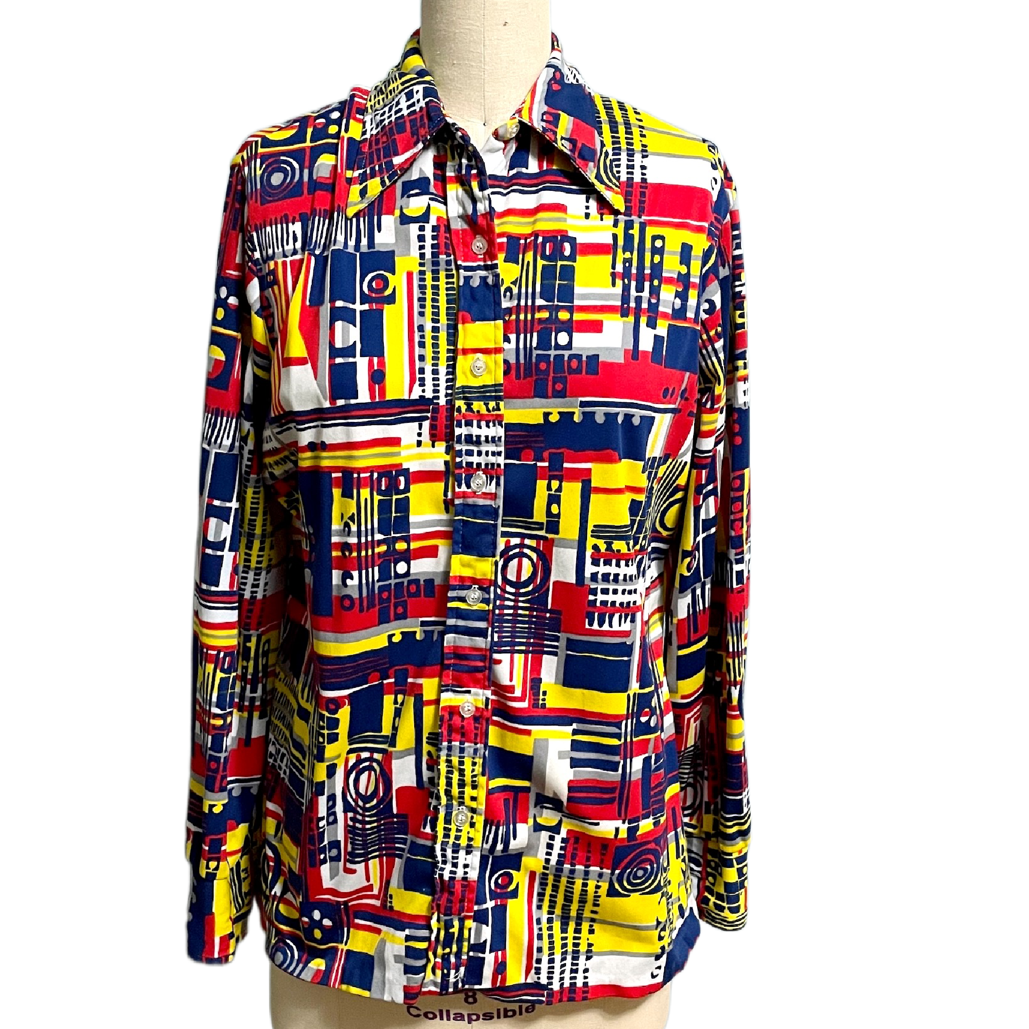 Vintage 1970s geometric print shirt, straight from the disco era. Bright primary colors with white and gray. Pointed collar. Button front. Two button cuffs. No tags. It's Saturday night, you've got the shirt, now all you need is some dancing fever.