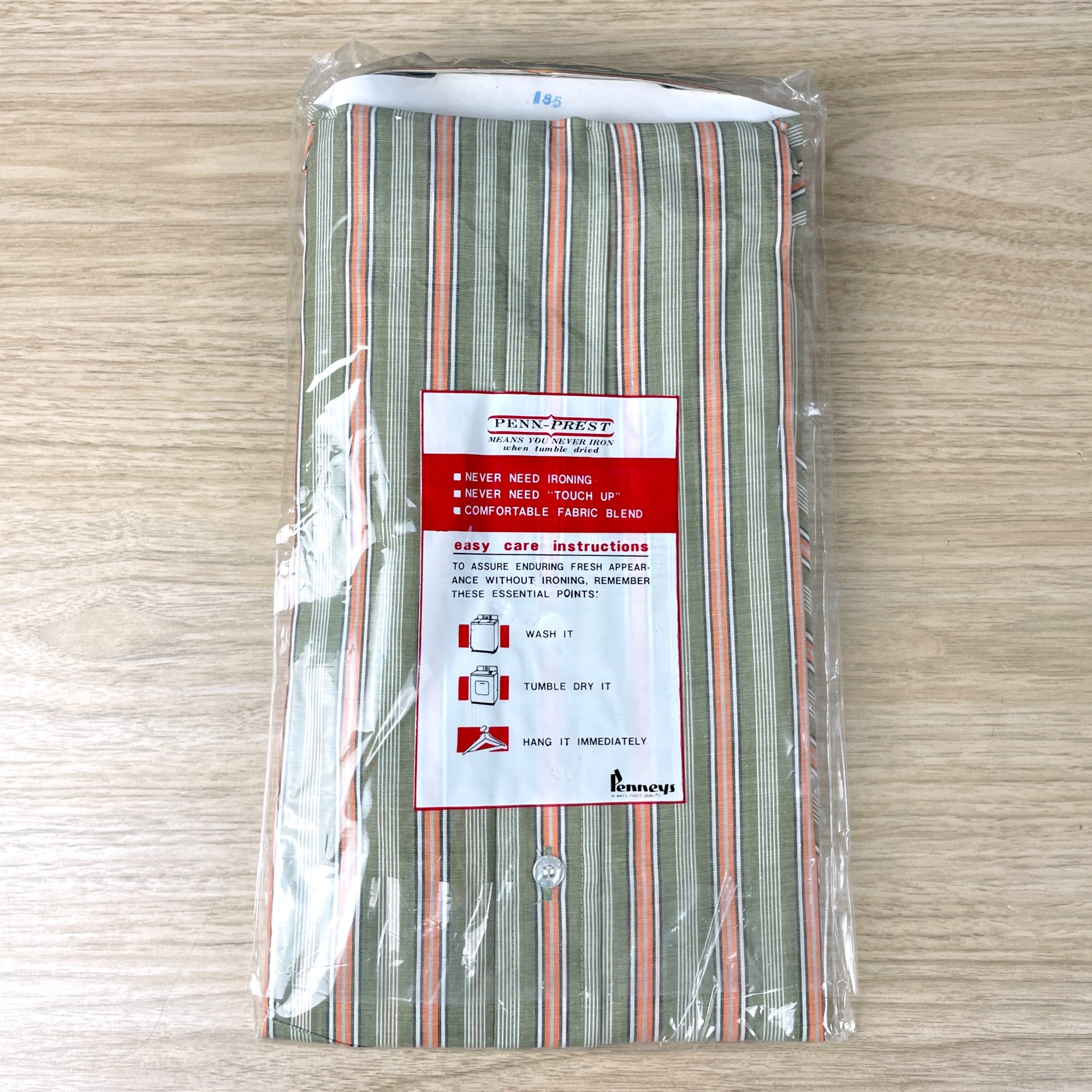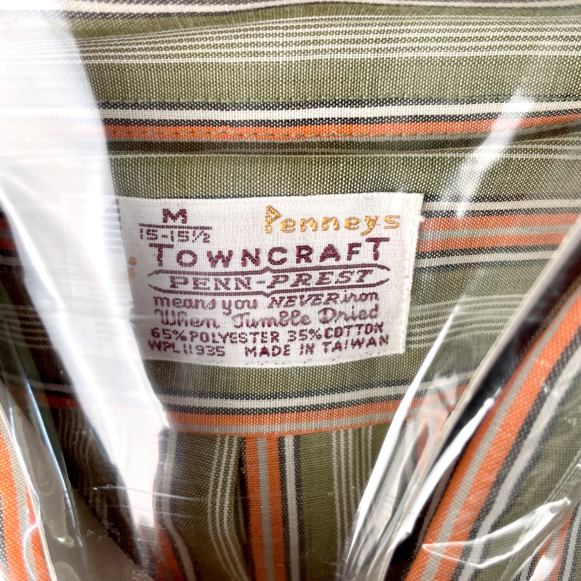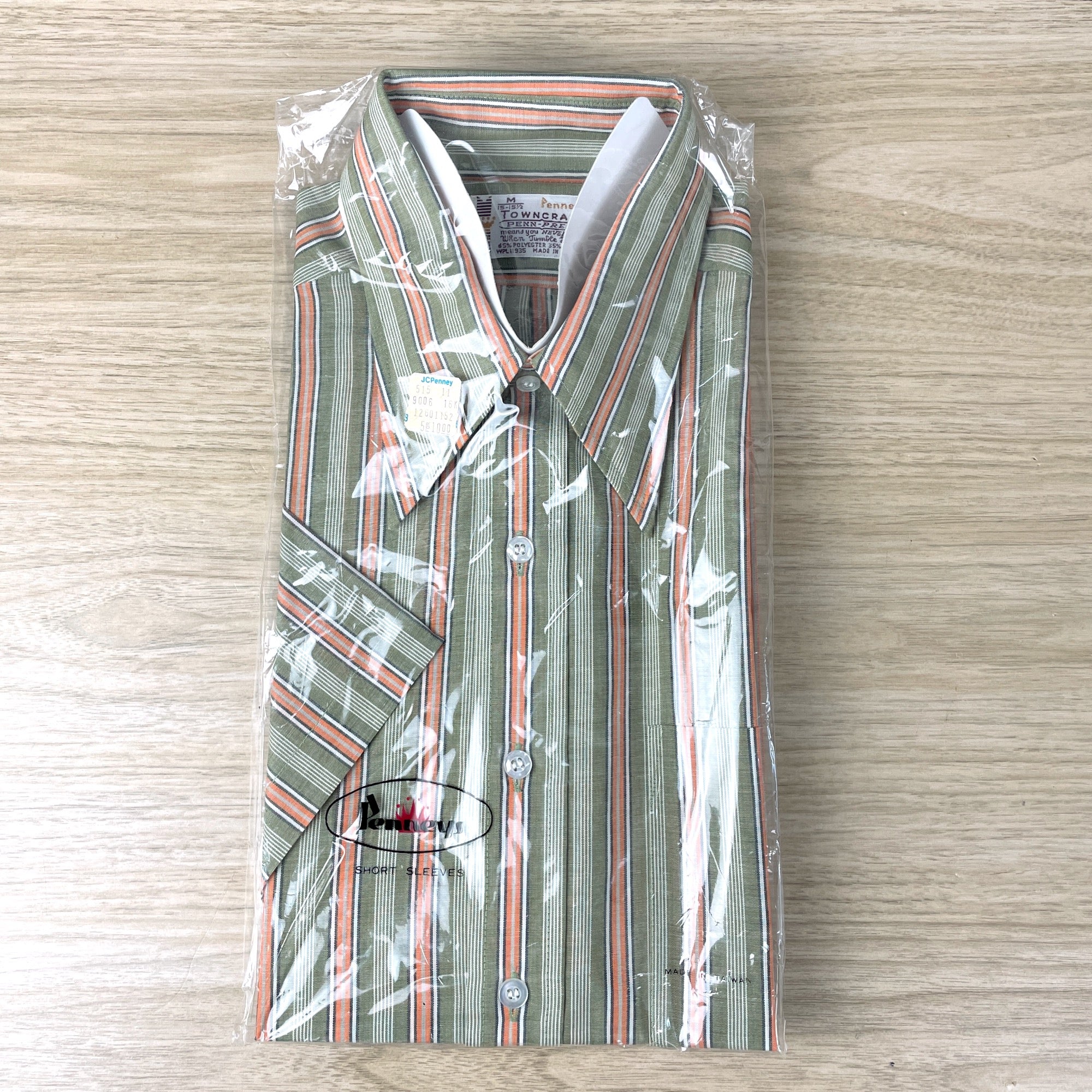 1970s new in package Penneys Towncraft men's short sleeve button down shirt. Green oxford cloth with gray, white and orange stripes. White buttons. Yoke in back with center box pleat for shaping. Made in Taiwan.