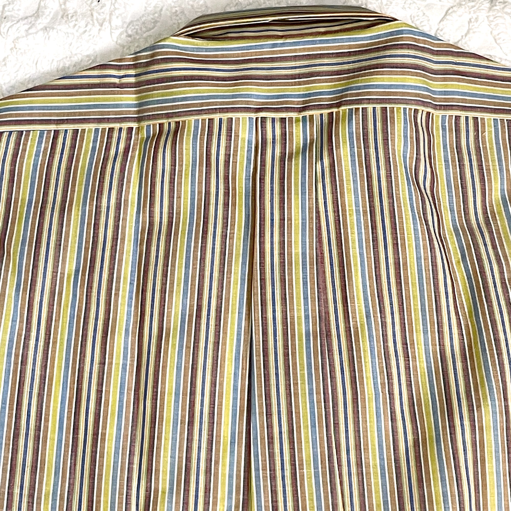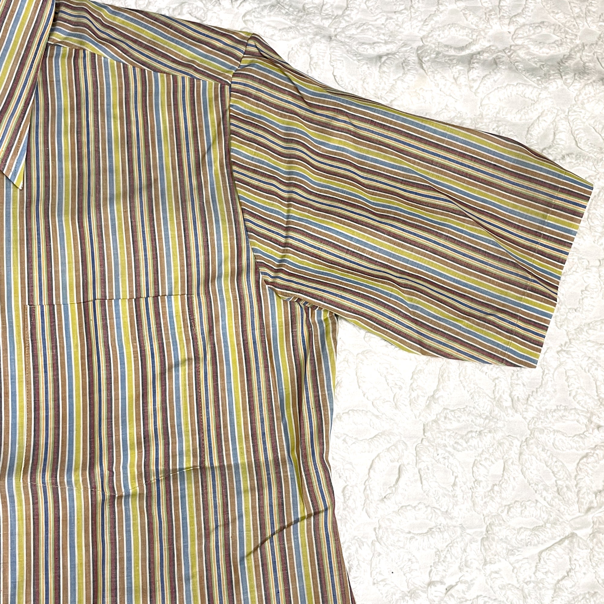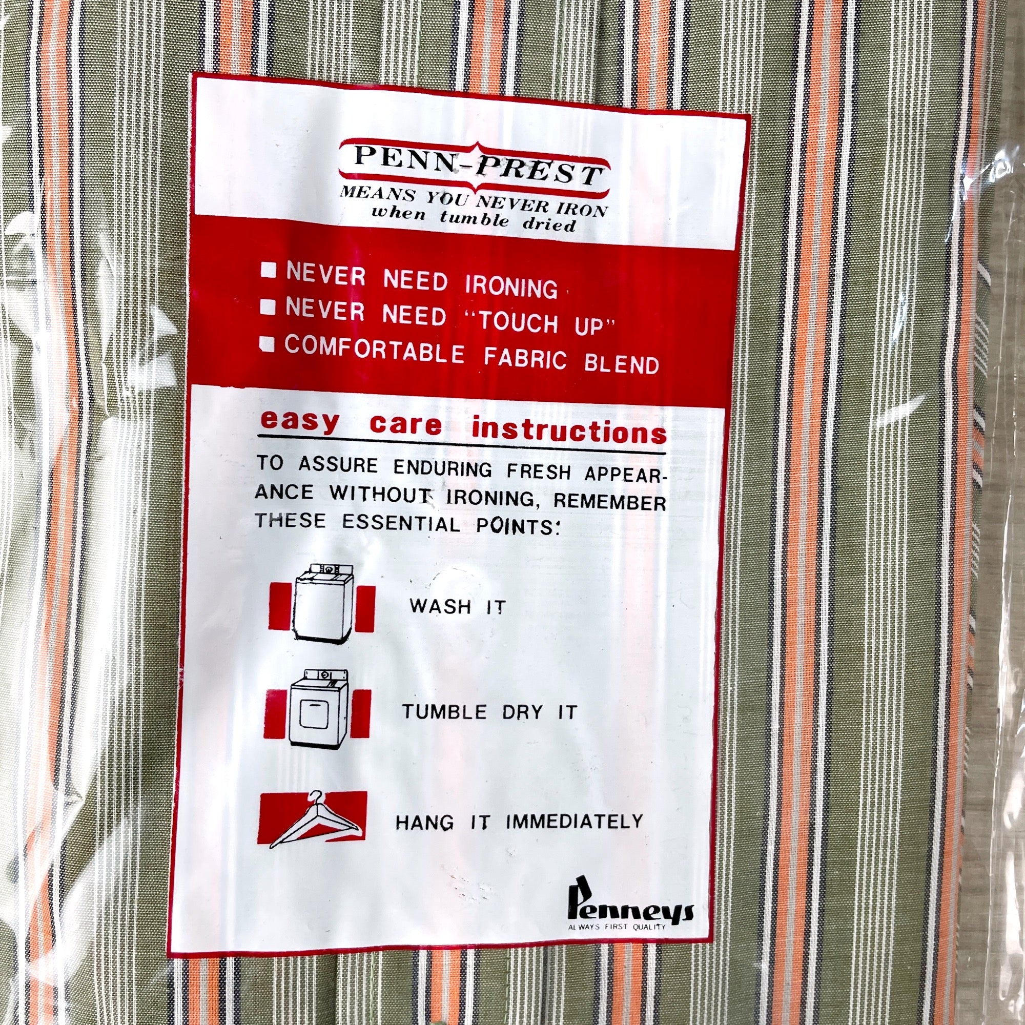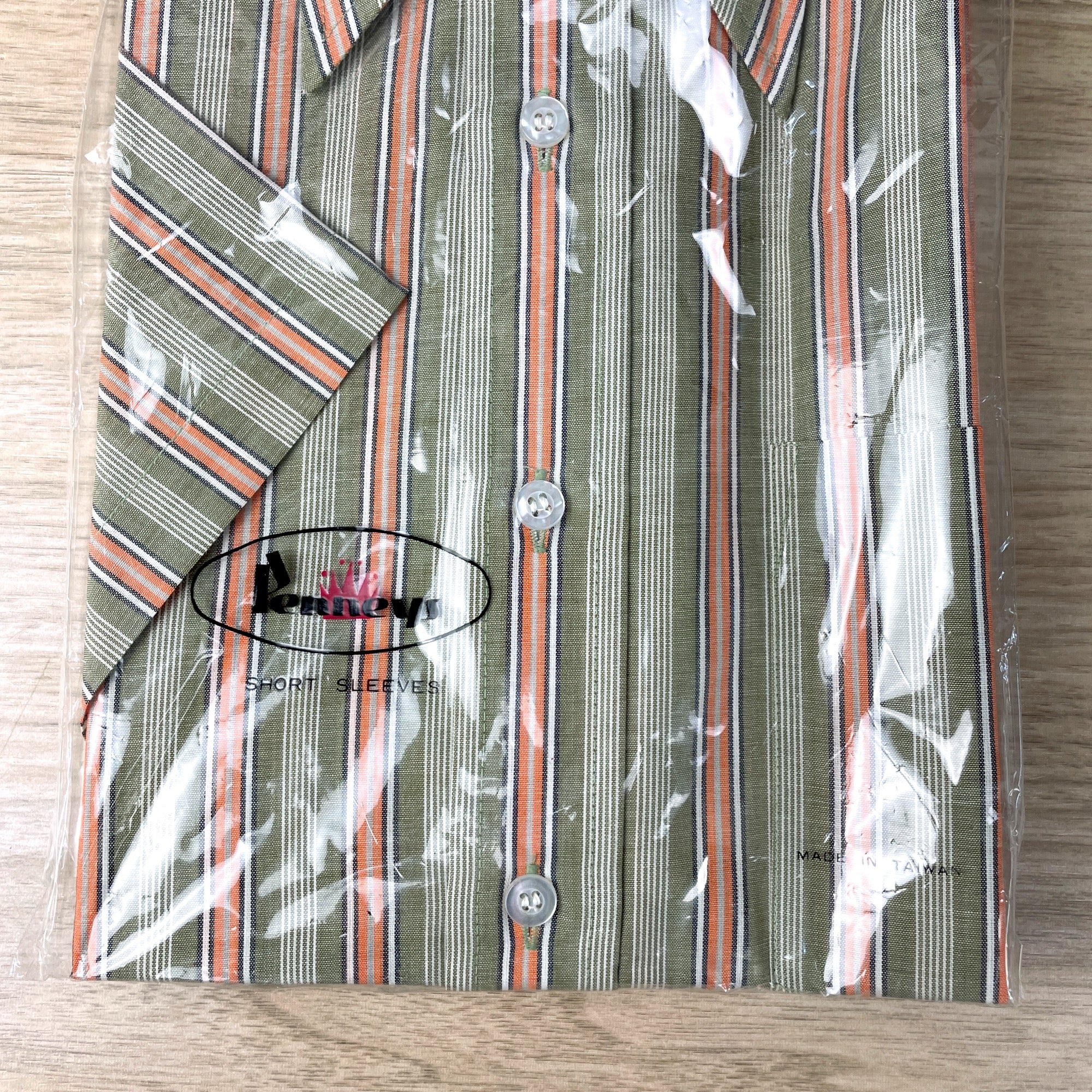 1970s new in package Penneys Towncraft men's short sleeve button down shirt. Green oxford cloth with gray, white and orange stripes. White buttons. Yoke in back with center box pleat for shaping. Made in Taiwan.