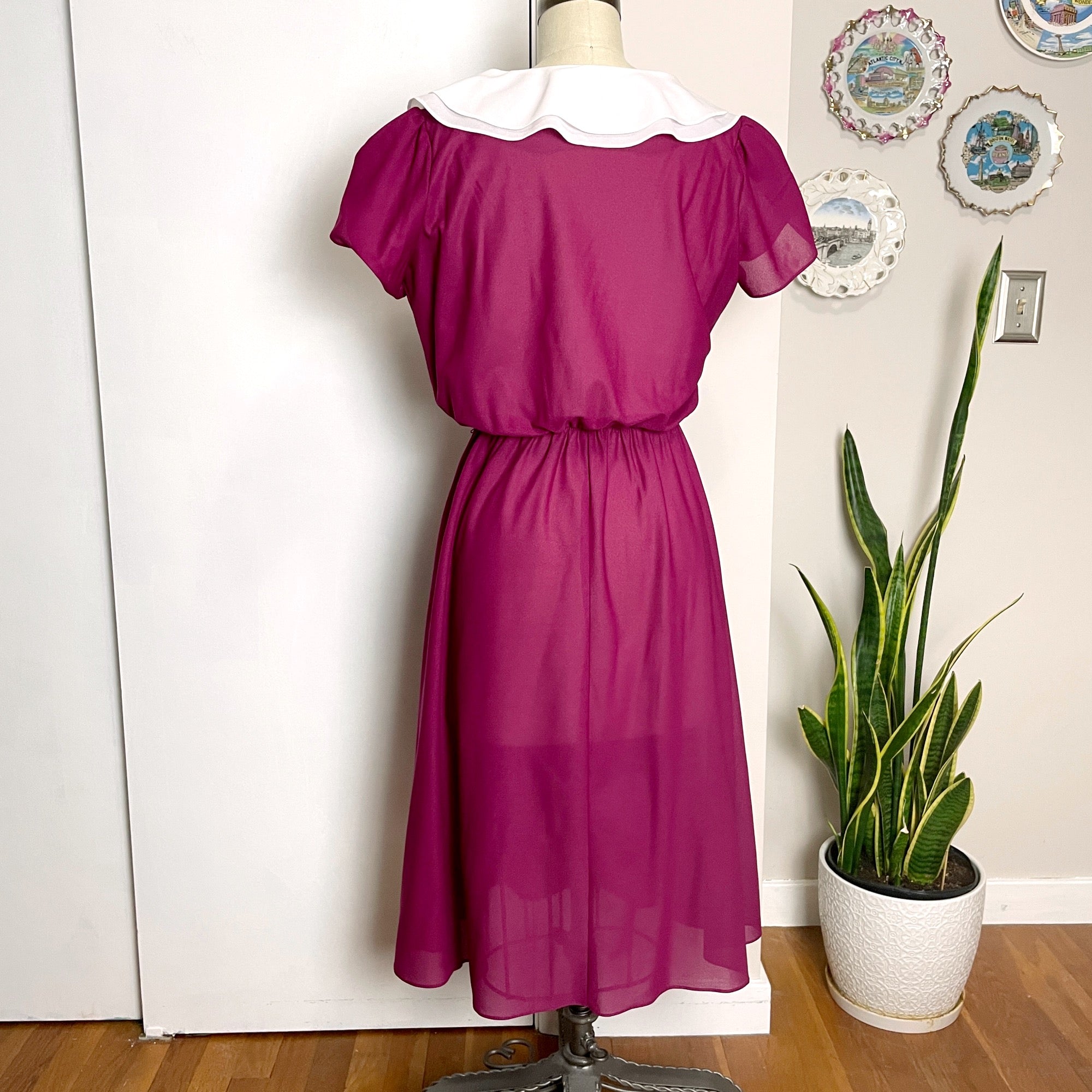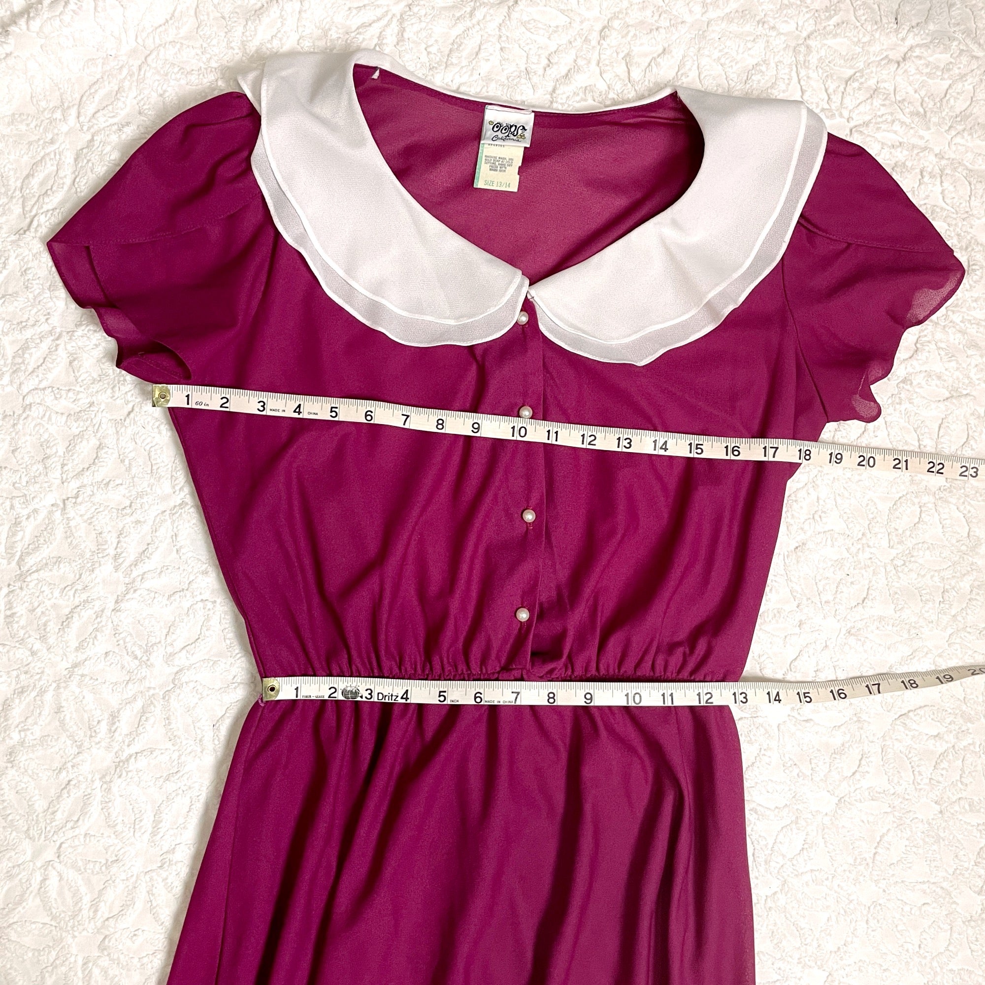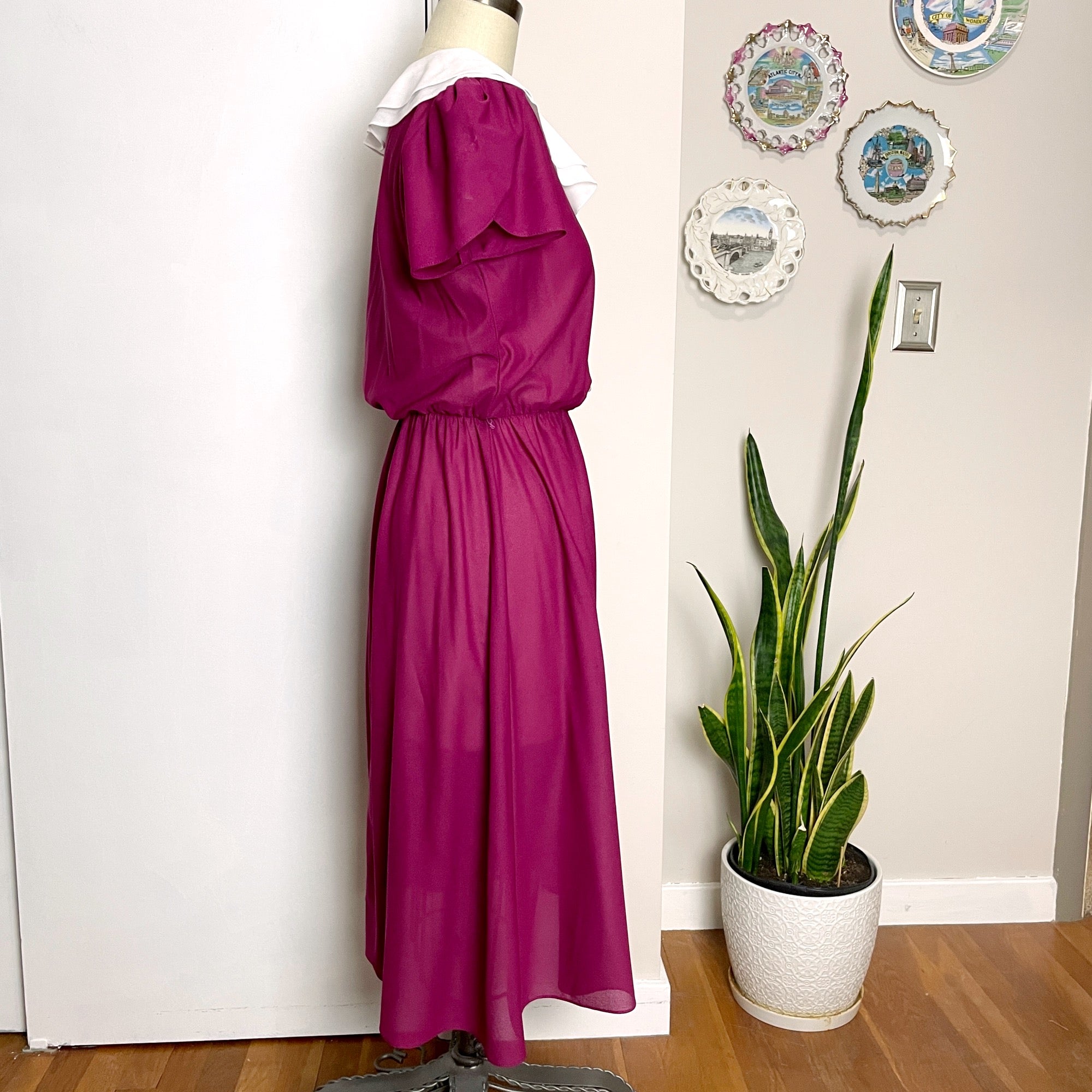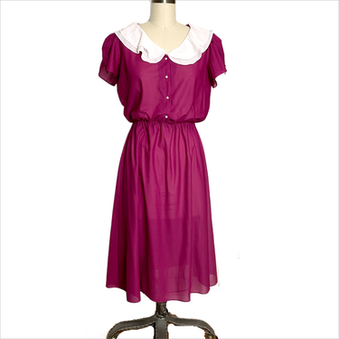 Dreamy 1970s day dress by Oops California — a gorgeous "70s does 30s" piece in a romantic plum hue. Made of lightweight, semi-sheer fabric (likely polyester), it features a white double-layer collar, pearl buttons at the blouson bodice, and a soft elastic waist for a flattering silhouette.