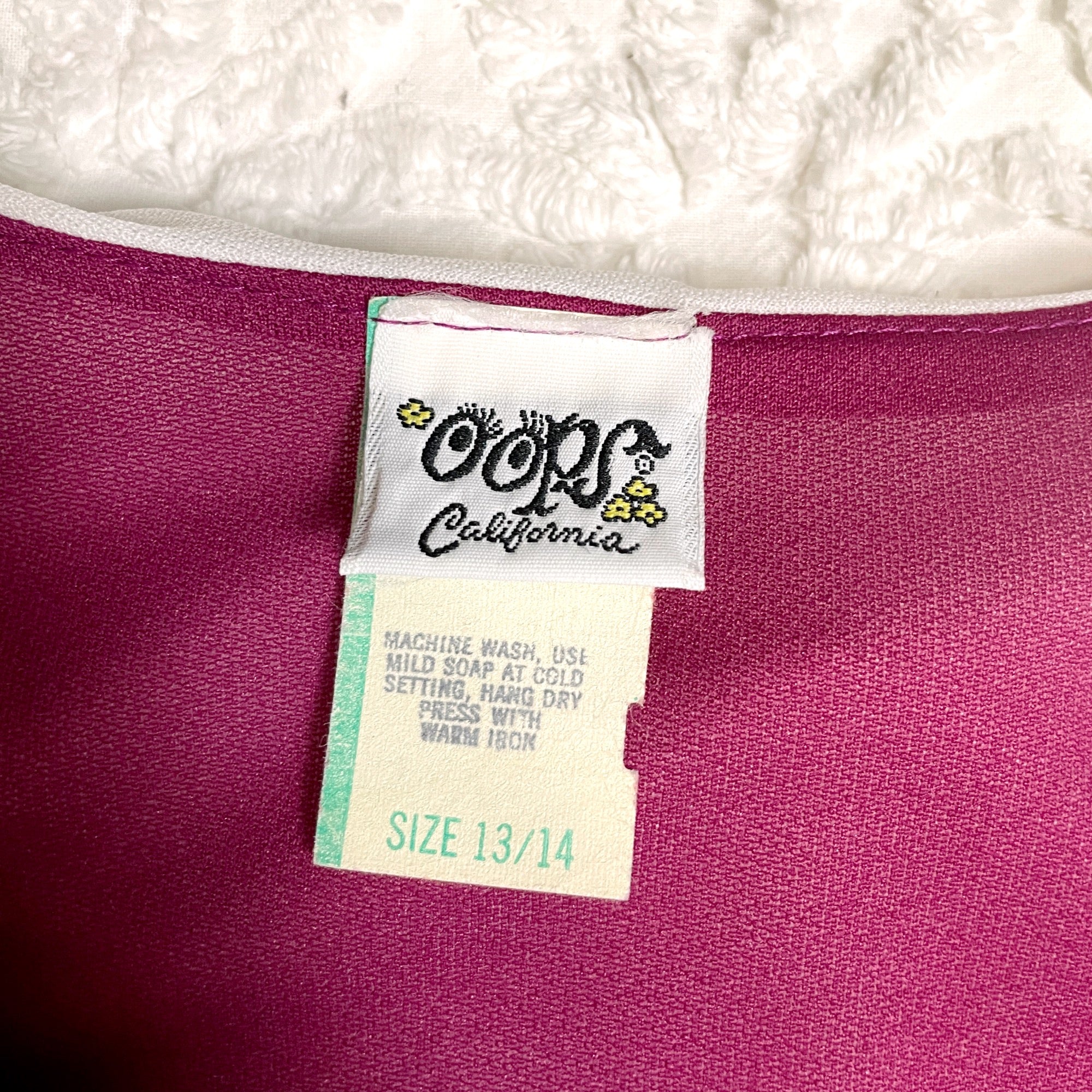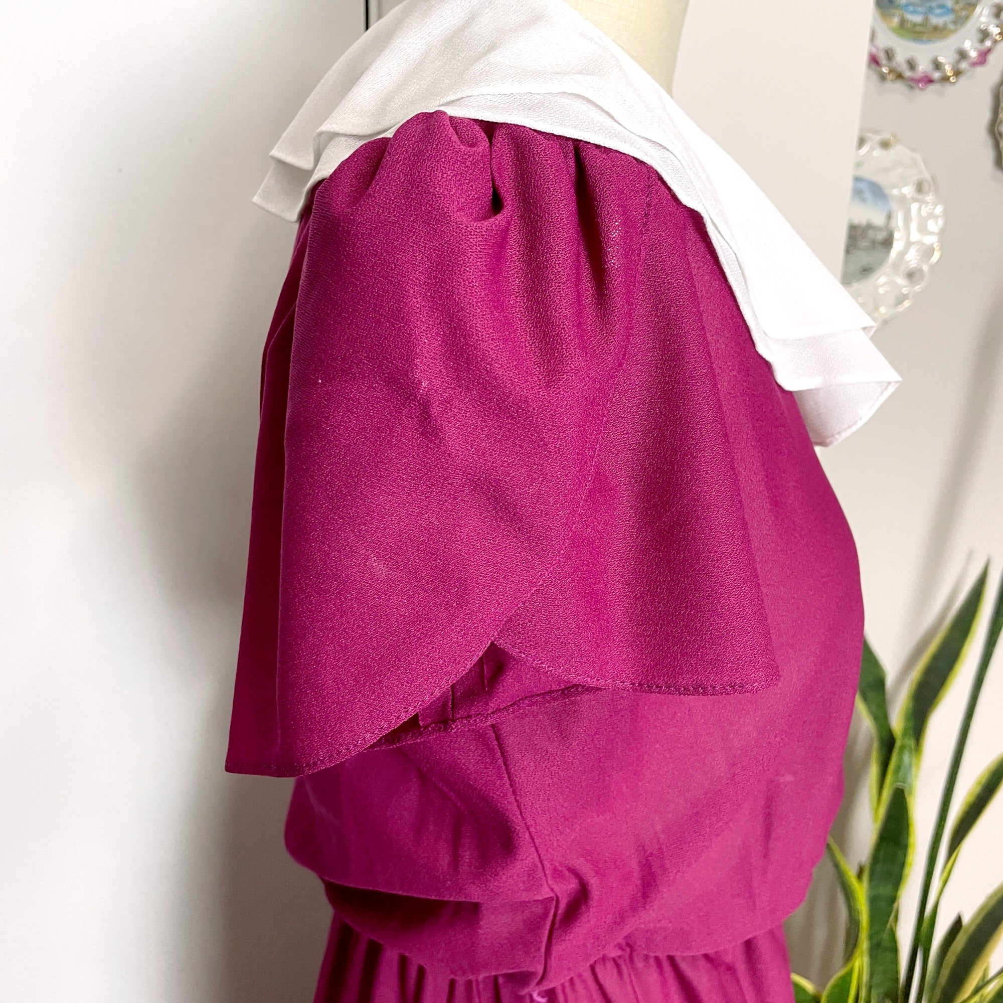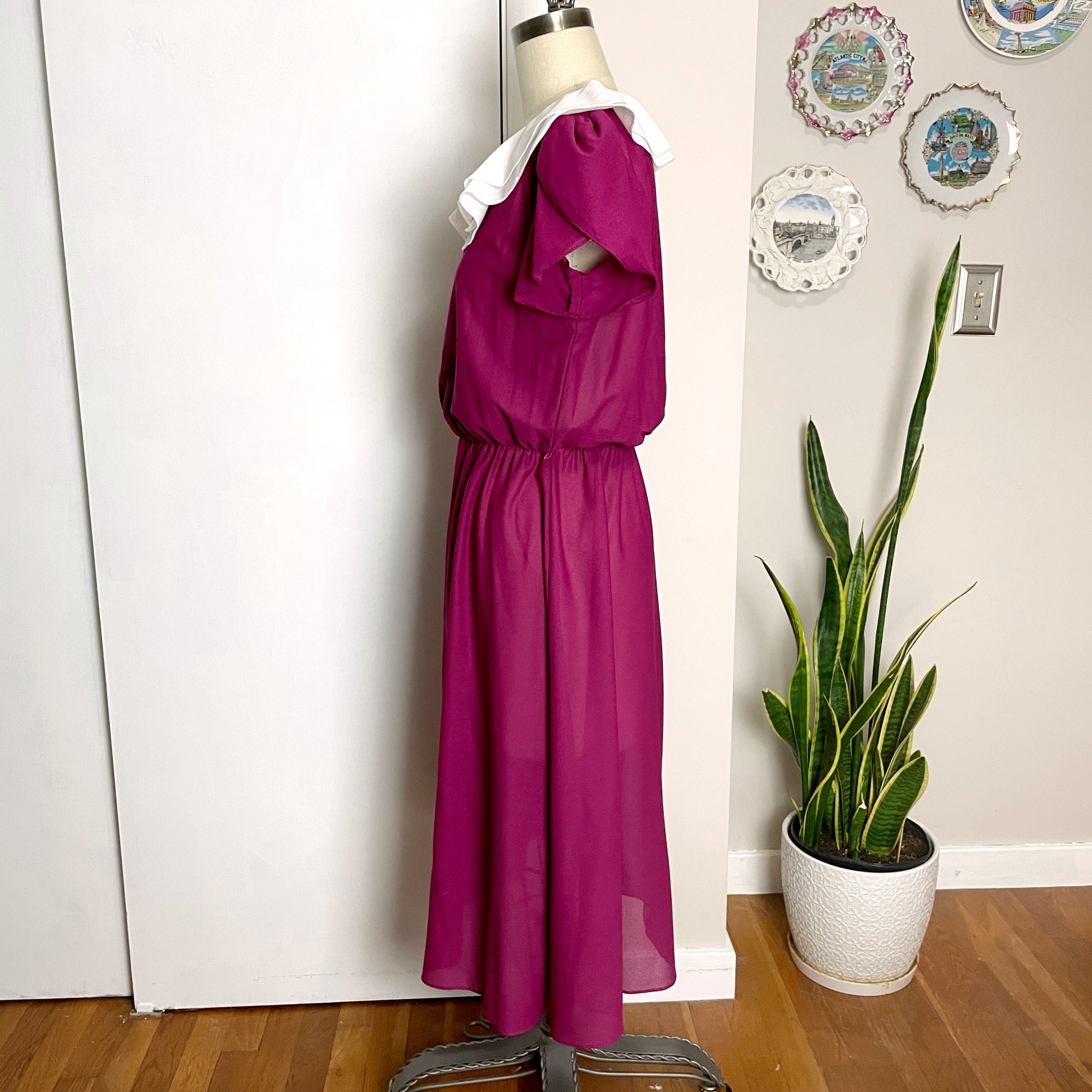 Dreamy 1970s day dress by Oops California — a gorgeous "70s does 30s" piece in a romantic plum hue. Made of lightweight, semi-sheer fabric (likely polyester), it features a white double-layer collar, pearl buttons at the blouson bodice, and a soft elastic waist for a flattering silhouette.
