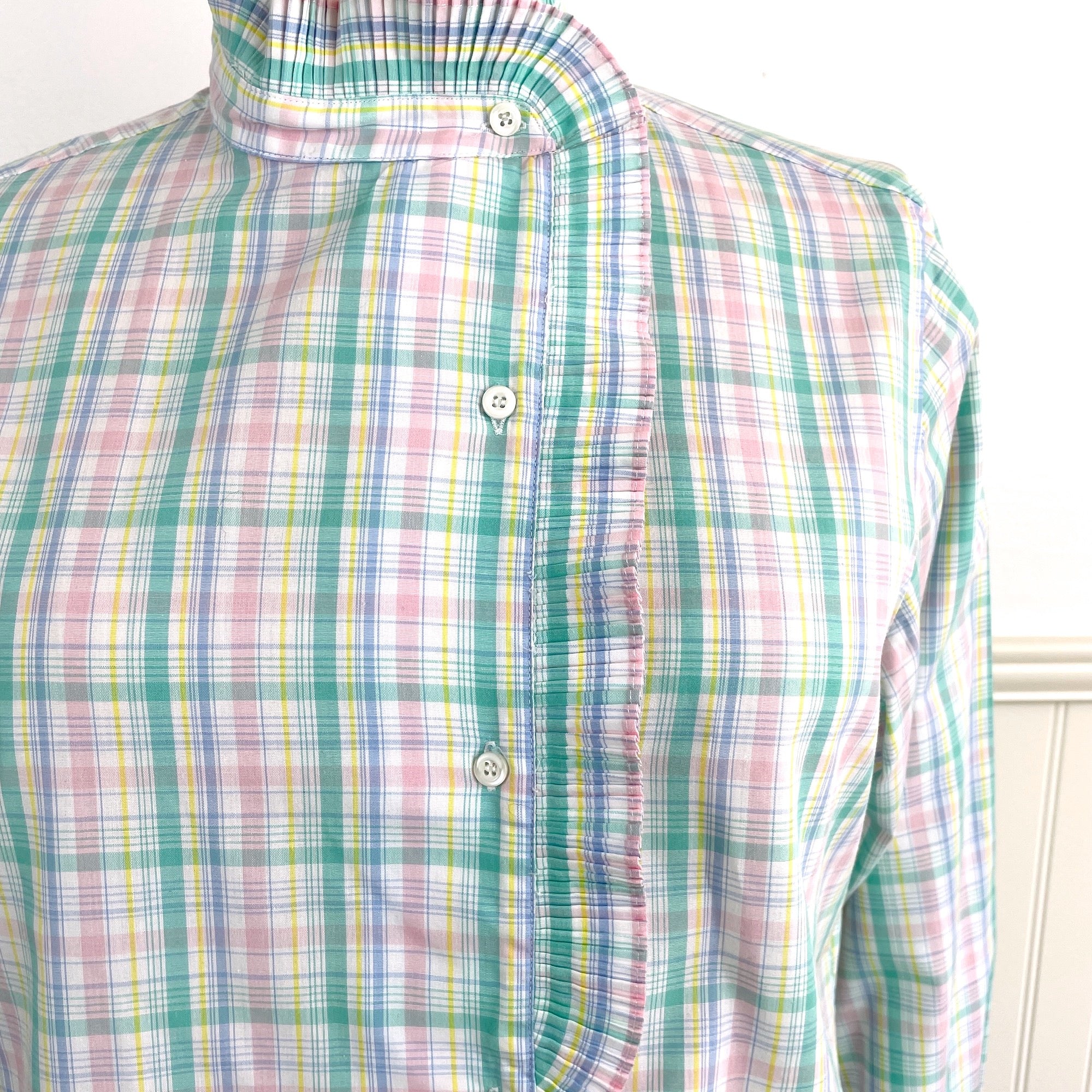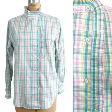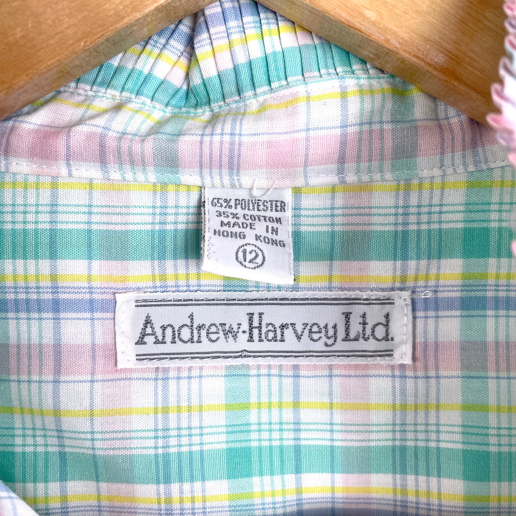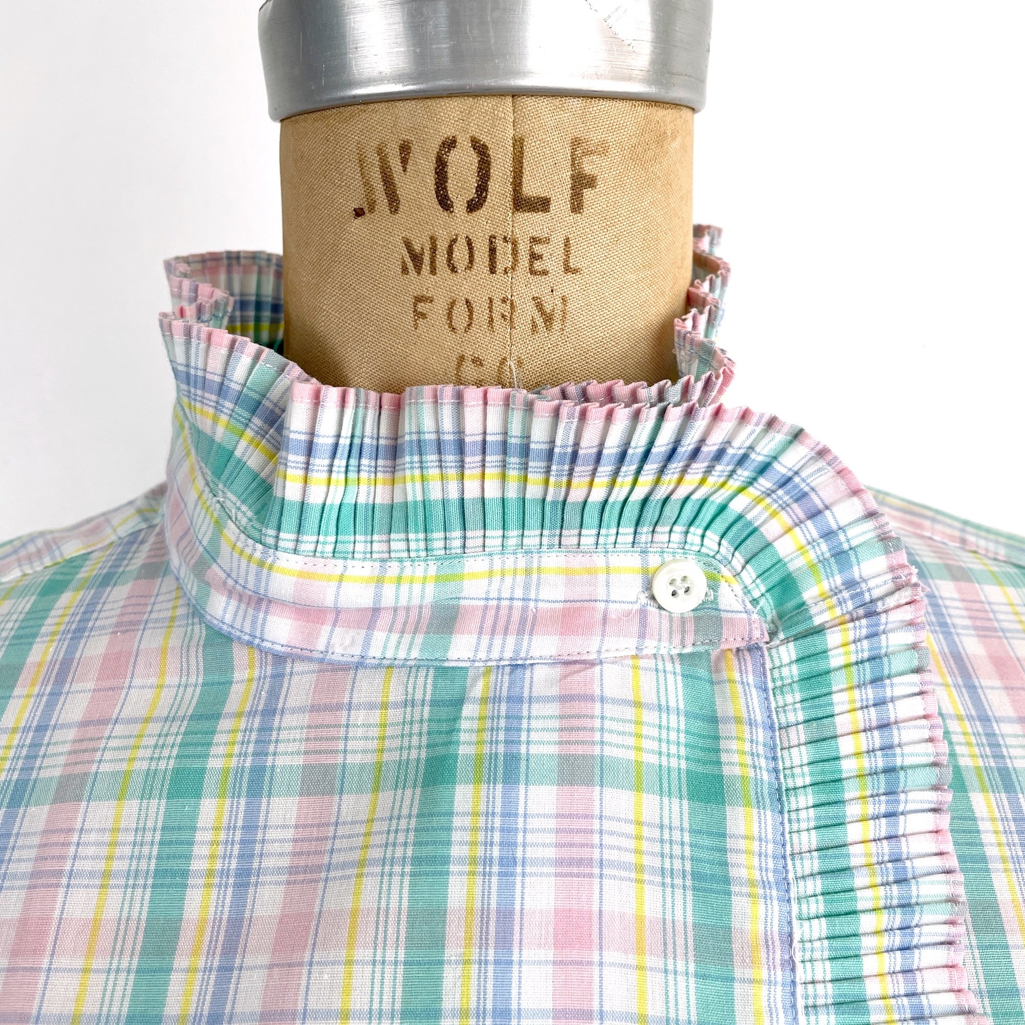 Vintage 1980s asymmetrical pastel plaid fitted shirt. Long sleeves with single button cuffs. Crystal pleated detail around the neck and partially down the front. Shaped hem. By Andrew Harvey. Made in Hong Kong.