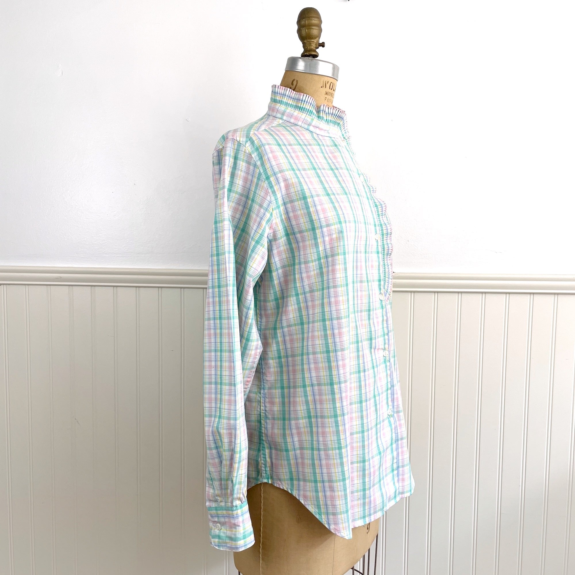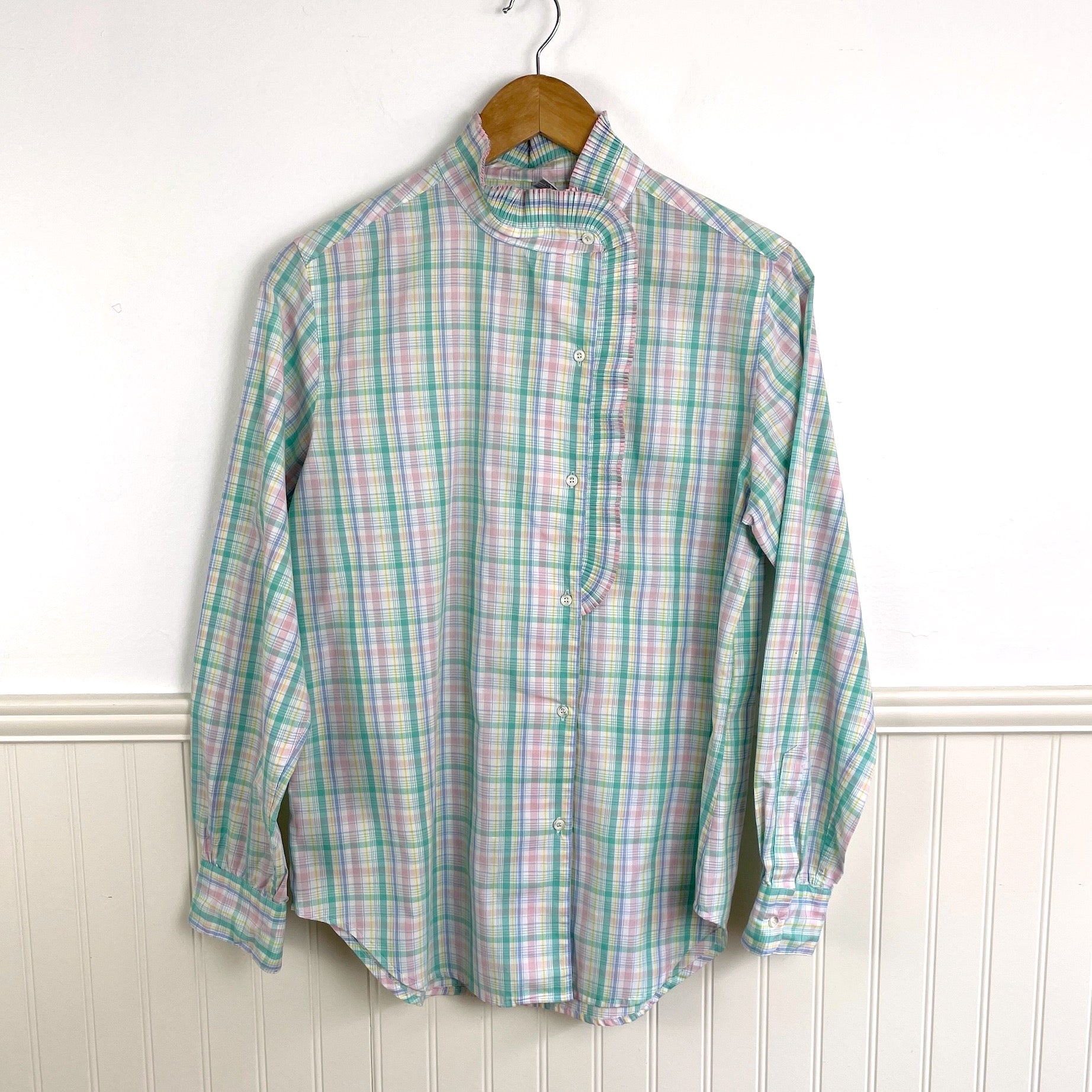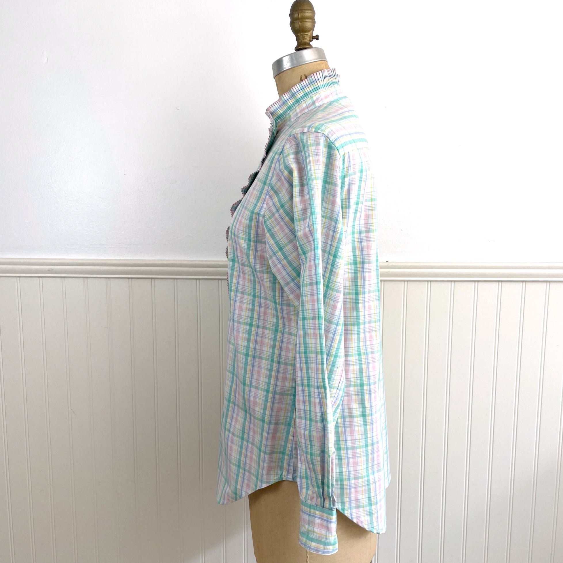 Vintage 1980s asymmetrical pastel plaid fitted shirt. Long sleeves with single button cuffs. Crystal pleated detail around the neck and partially down the front. Shaped hem. By Andrew Harvey. Made in Hong Kong.