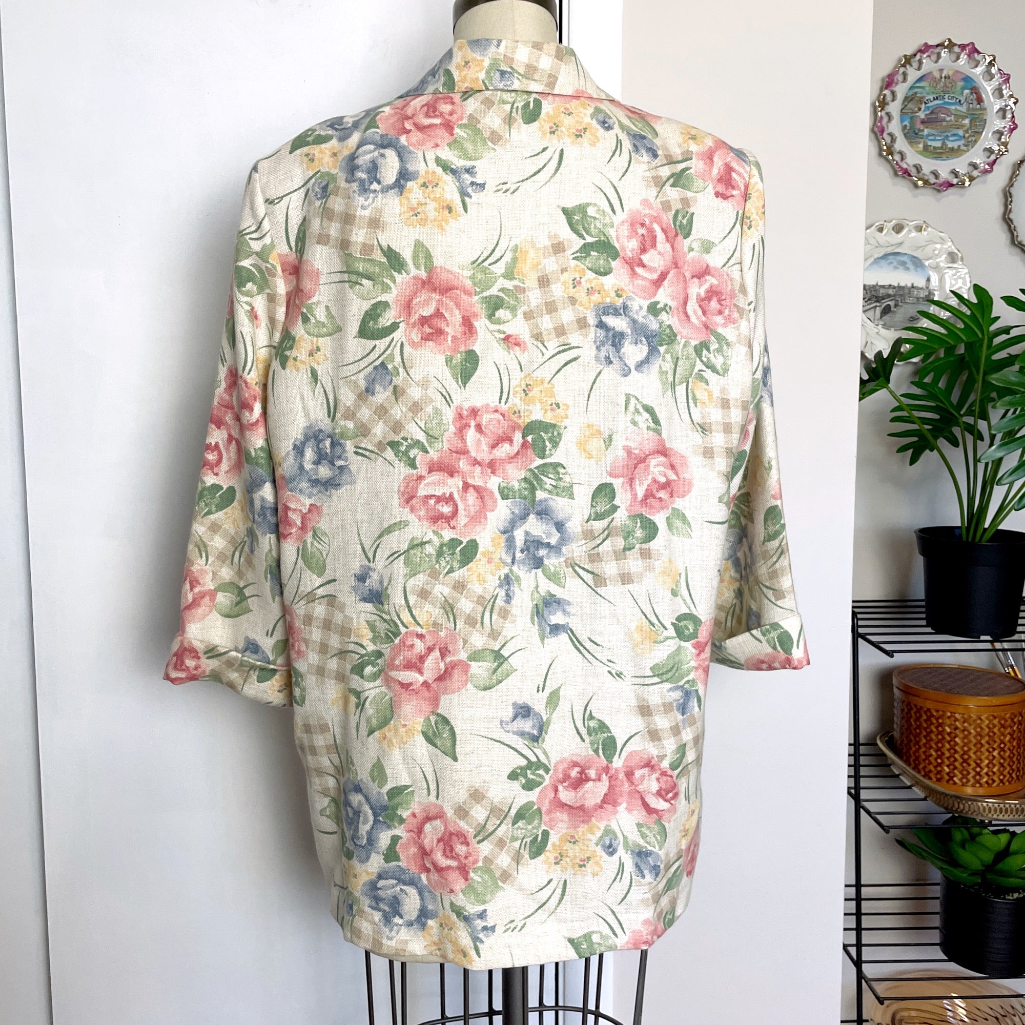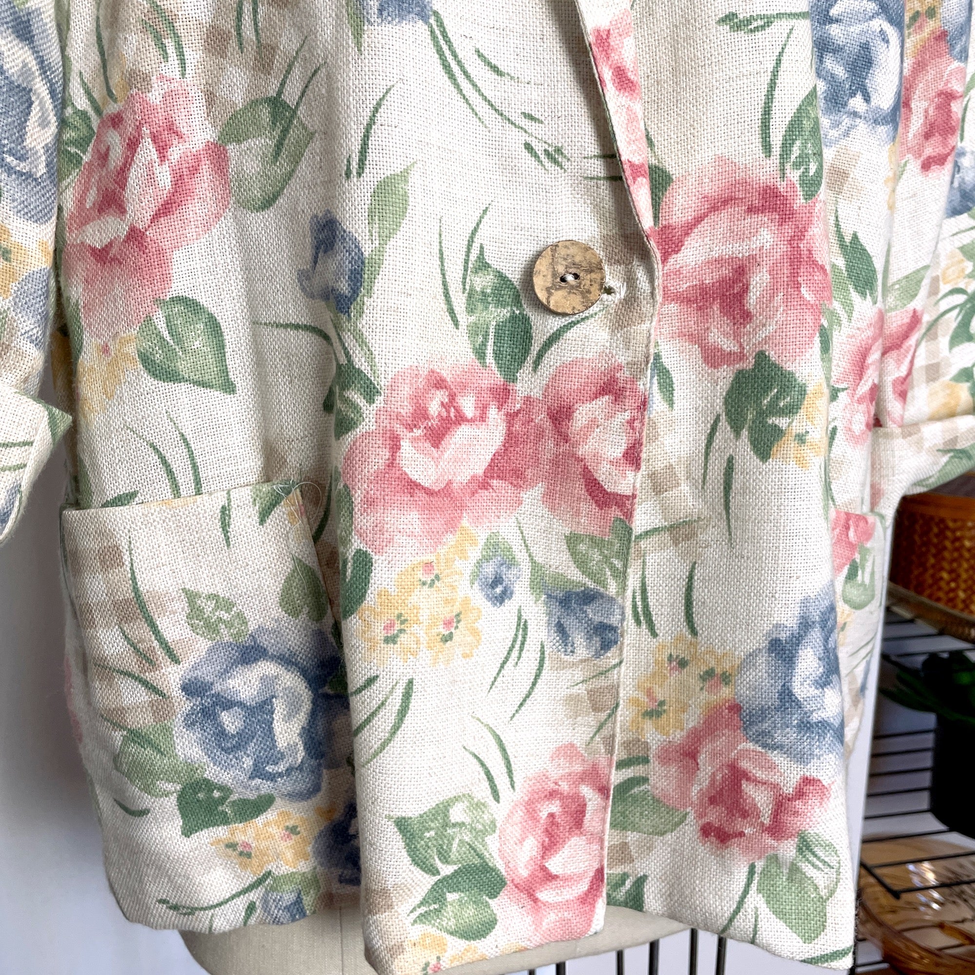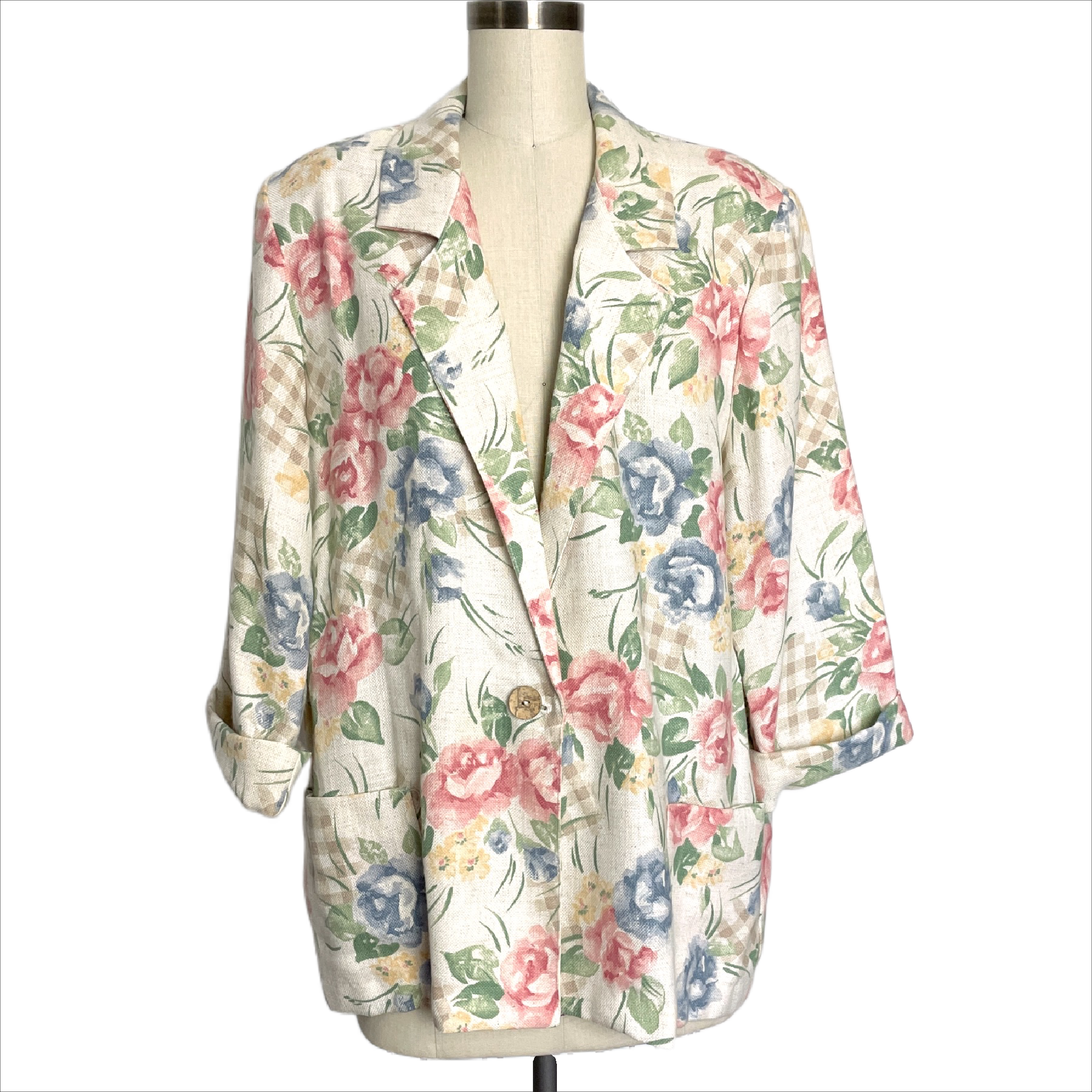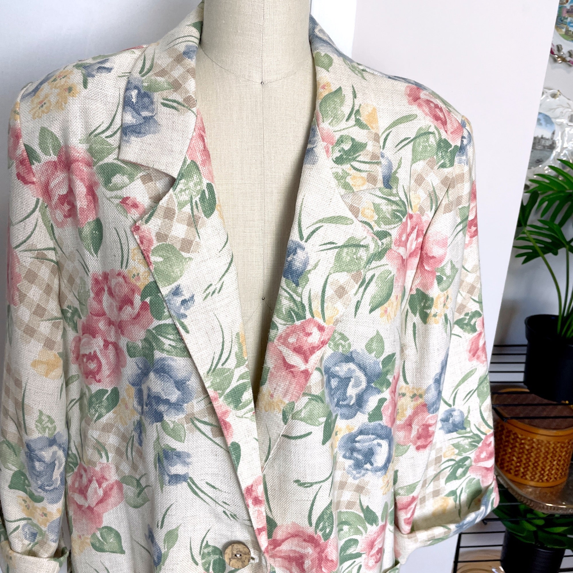 1980s vintage floral blazer with rolled 3/4 sleeves by Laura Tyler. Boyfriend fit oversized jacket has shoulder pads, single button, notched collar and pockets. Neutral tan woven fabric has large scale roses in pink and blue with scattered swatches of tan gingham. Wear to the office, wear to play, it's all good.