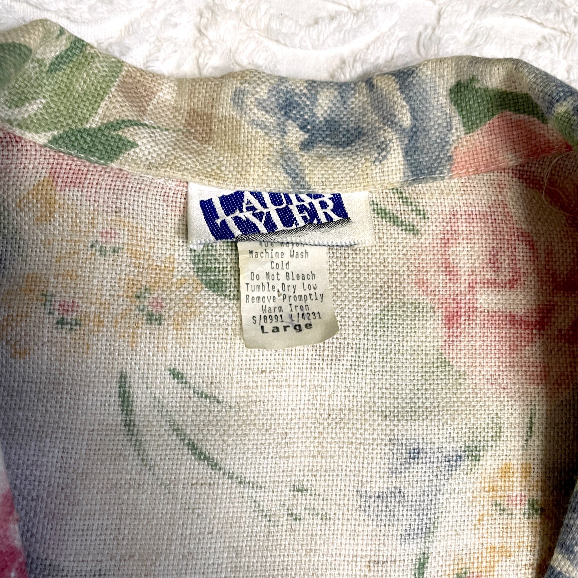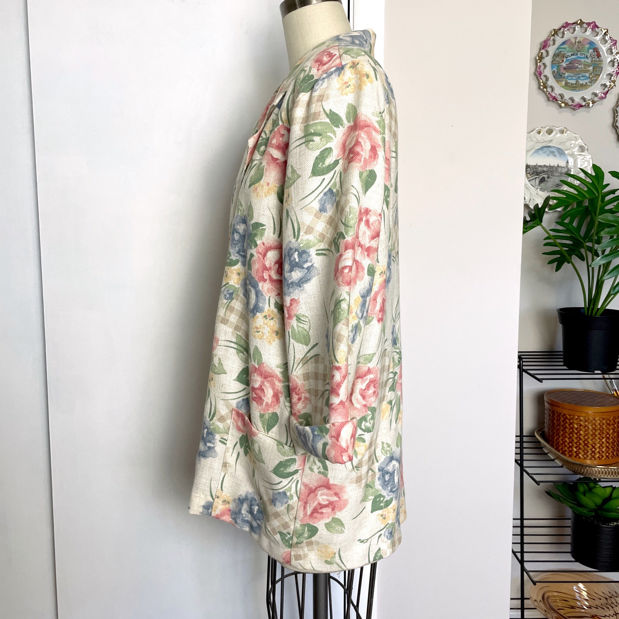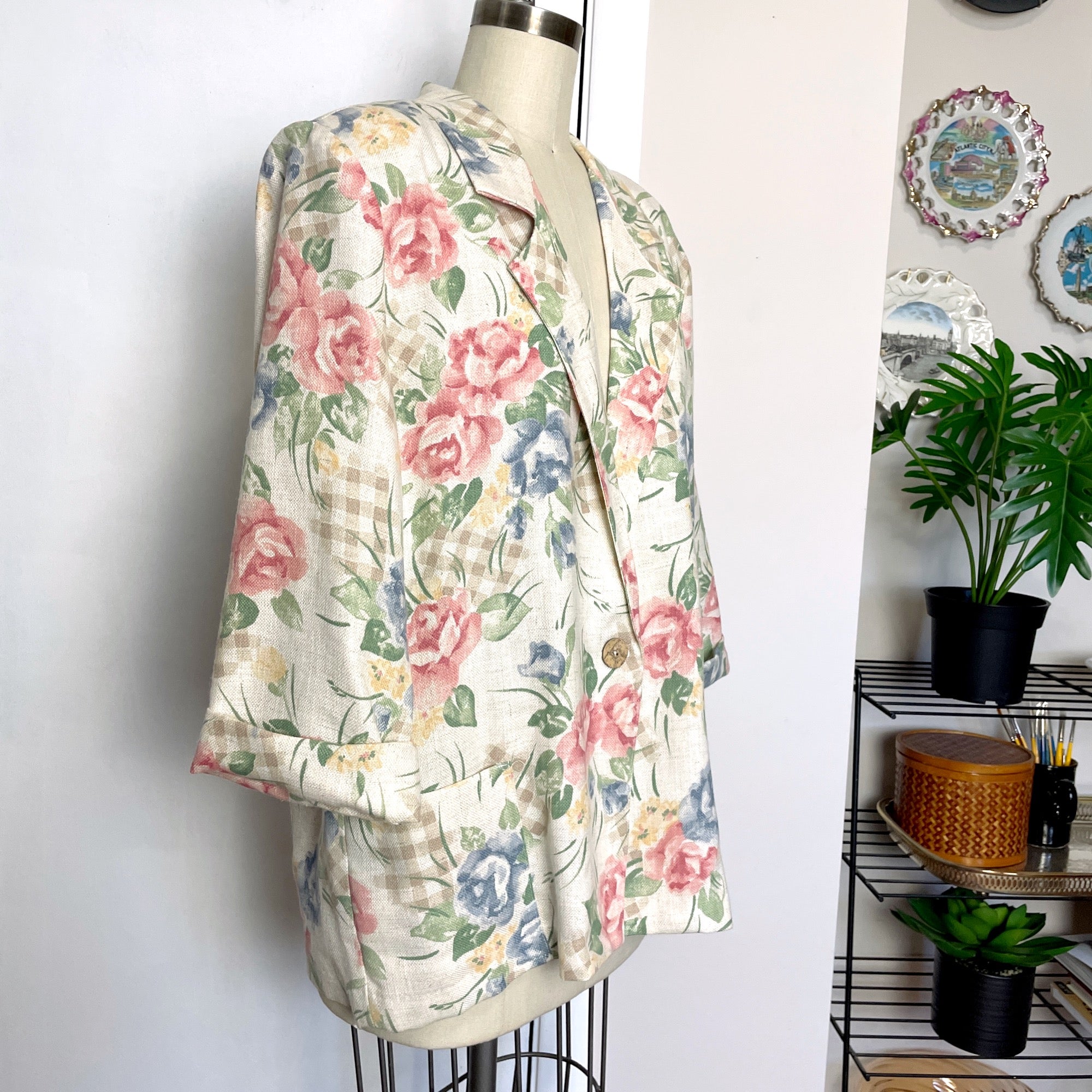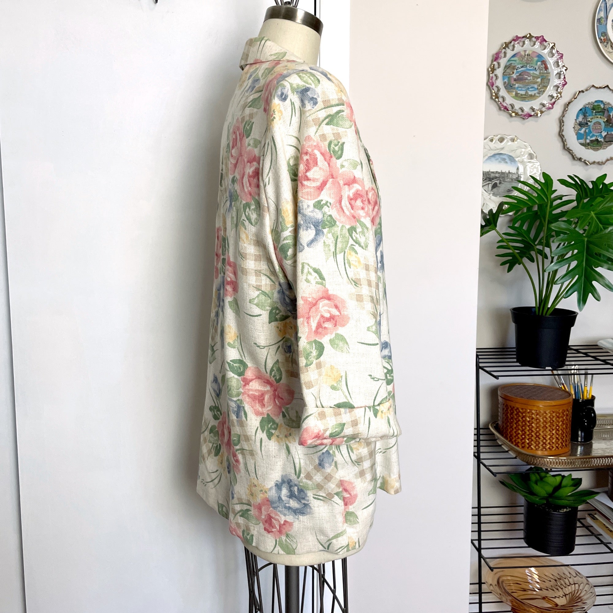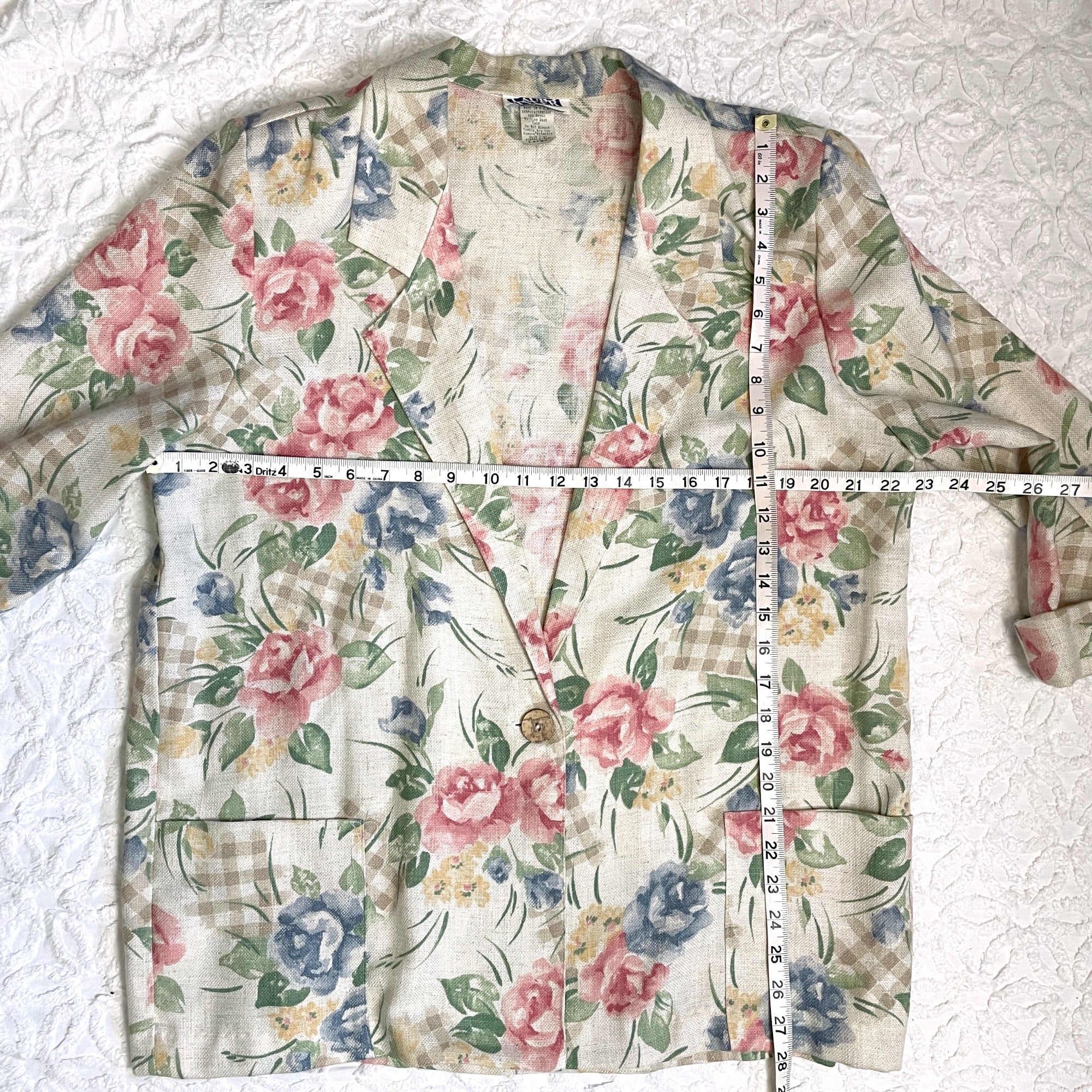 1980s vintage floral blazer with rolled 3/4 sleeves by Laura Tyler. Boyfriend fit oversized jacket has shoulder pads, single button, notched collar and pockets. Neutral tan woven fabric has large scale roses in pink and blue with scattered swatches of tan gingham. Wear to the office, wear to play, it's all good.
