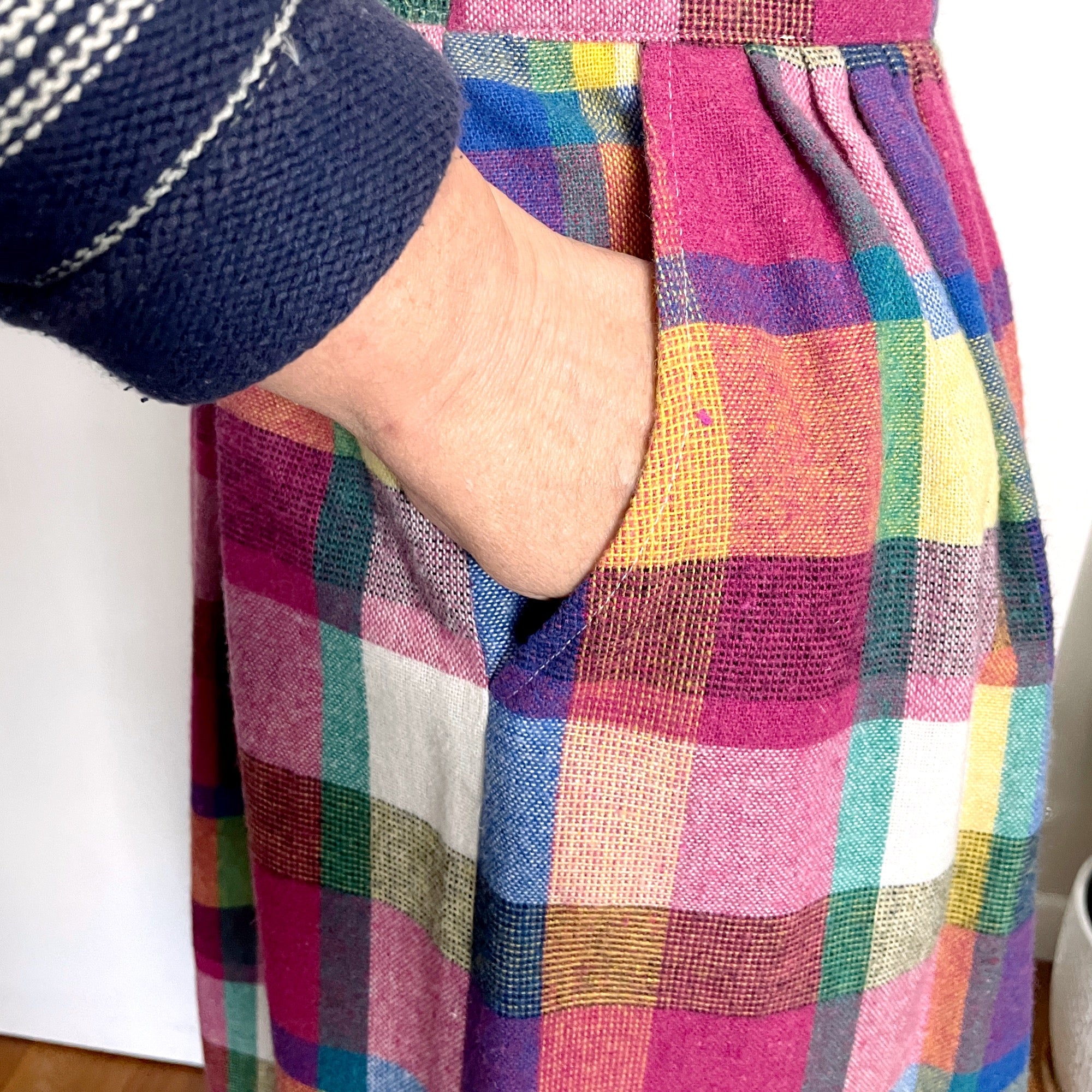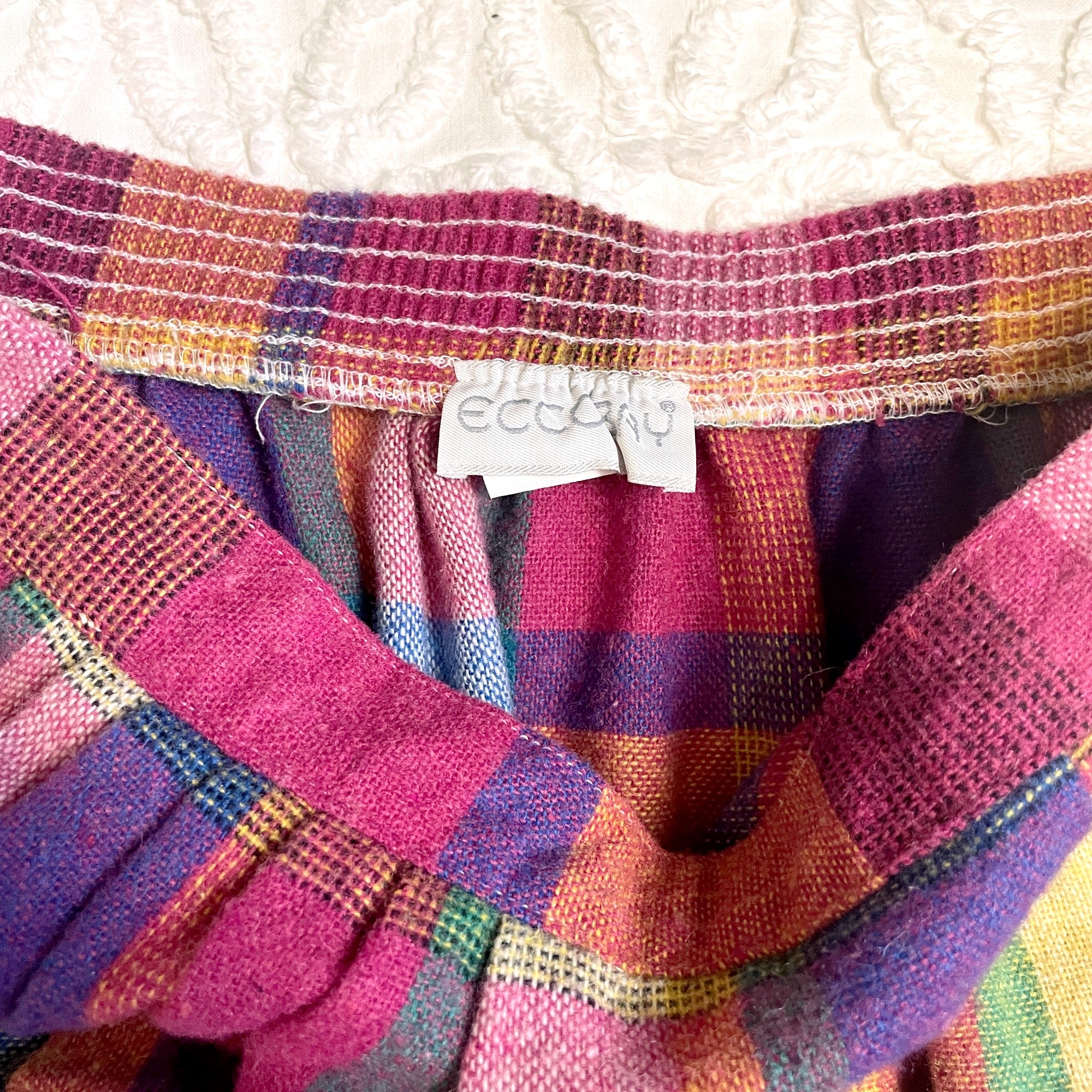 Dash the blues away with a cheerful plaid skirt in shades of magenta, yellow, royal blue, white and green from Eccobay. Side button with straight waistband  with pleats in front and elastic waist with gathers in back. Two pockets. Imagine this with a black turtleneck. NOTE: Pinned to fit dress form.