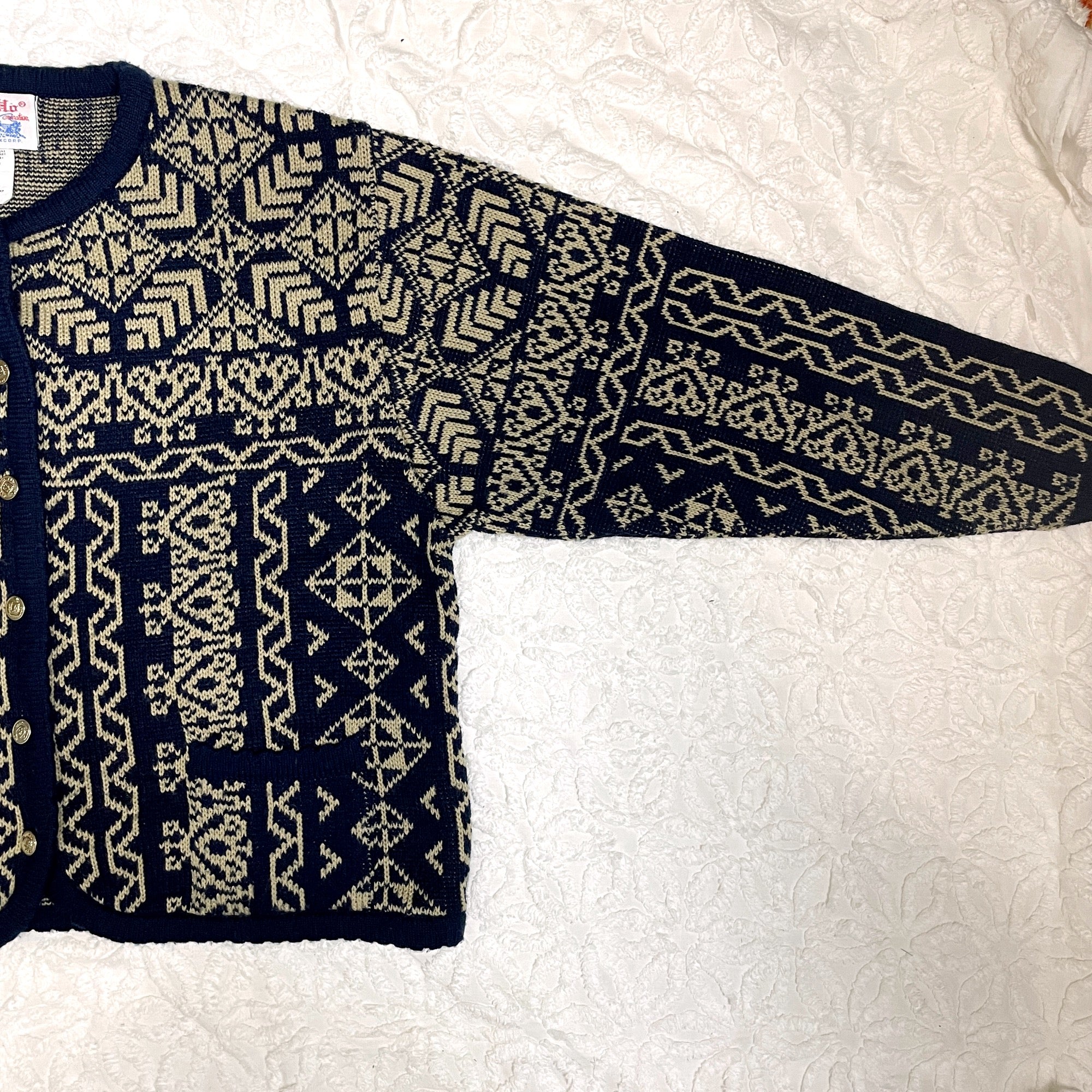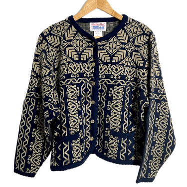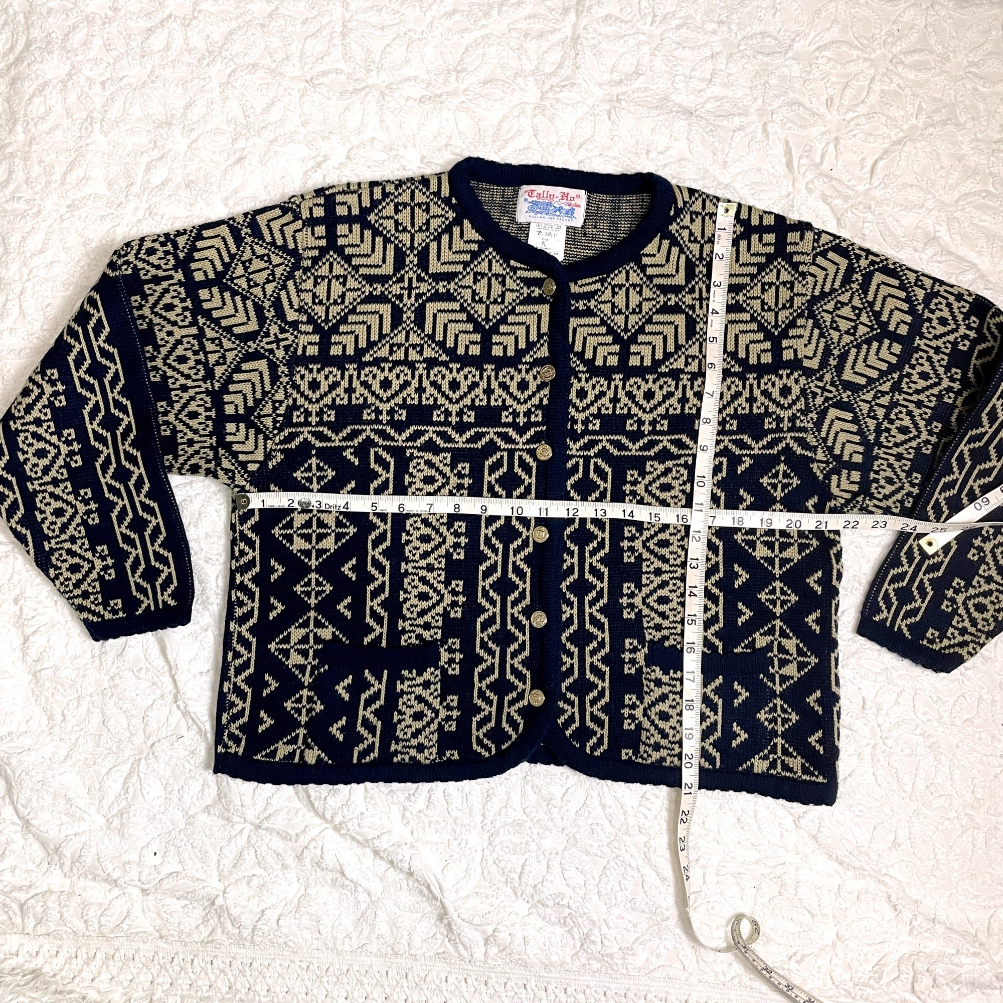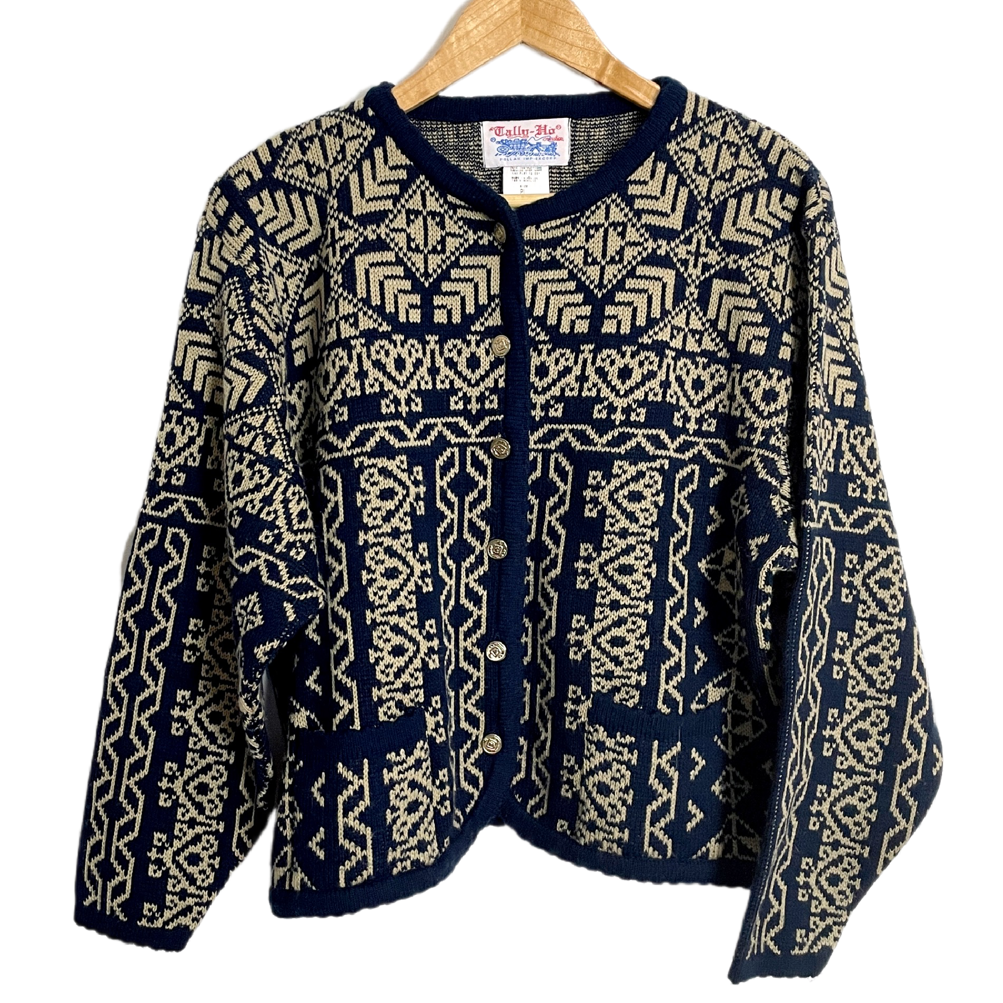 Cozy and cute deep midnight navy blue and taupe jacquard knit sweater jacket from Tally-Ho. Metal button front. Long sleeves. Two tiny front pockets. Full long sleeves. Styled like a traditional boiled wool jacket, but so much more comfortable. Preppy it out with pumps and pearls, wear with high waisted jeans, there's nothing this sweater jacket can't do.