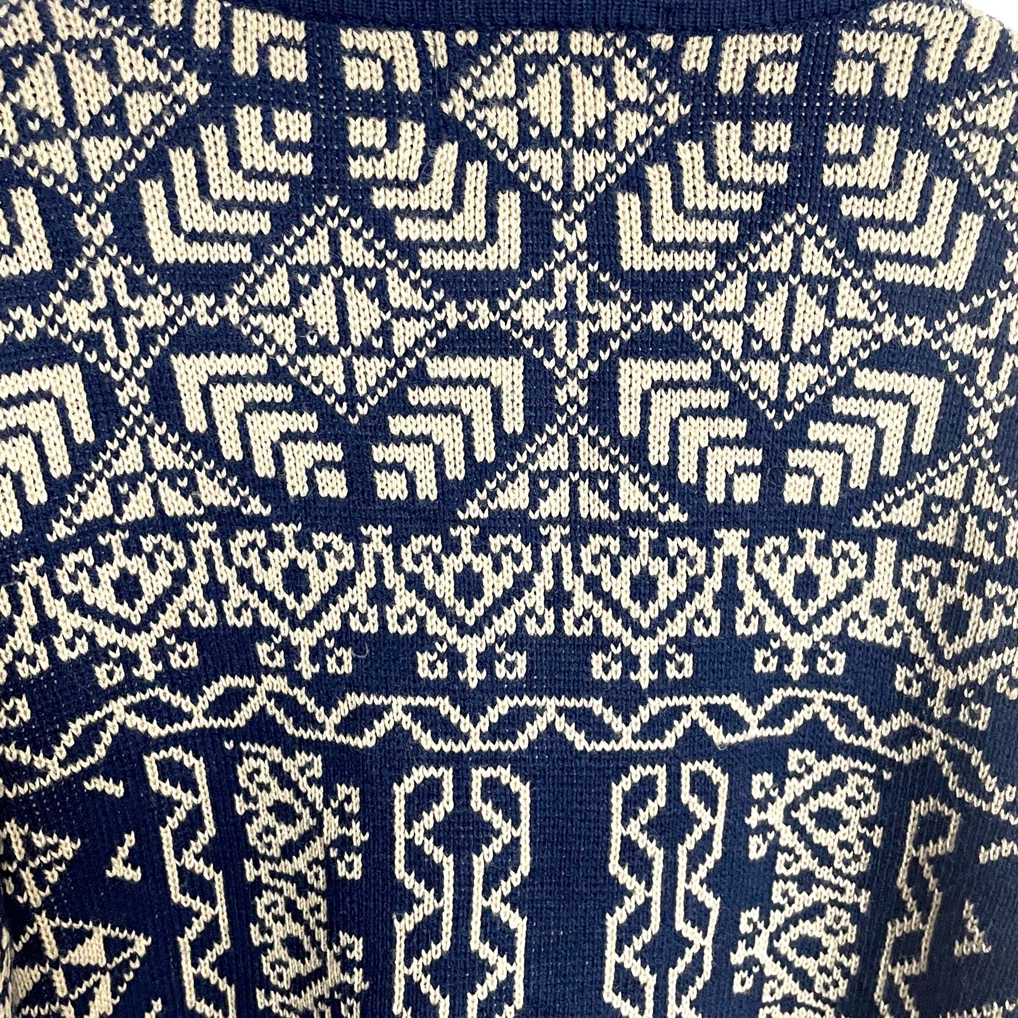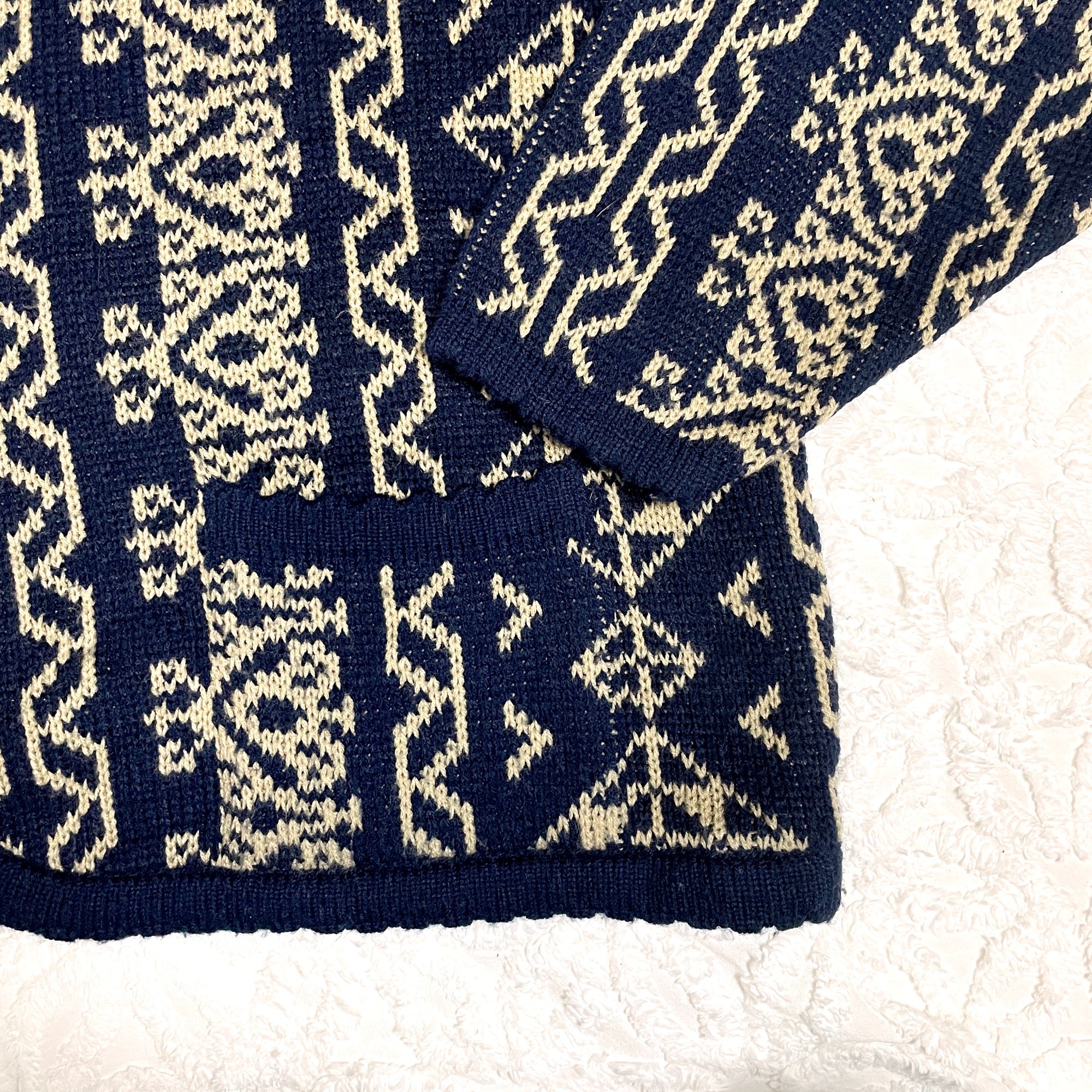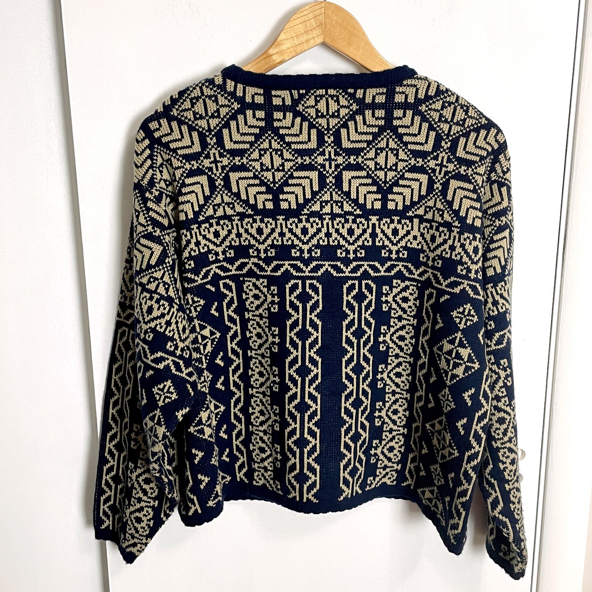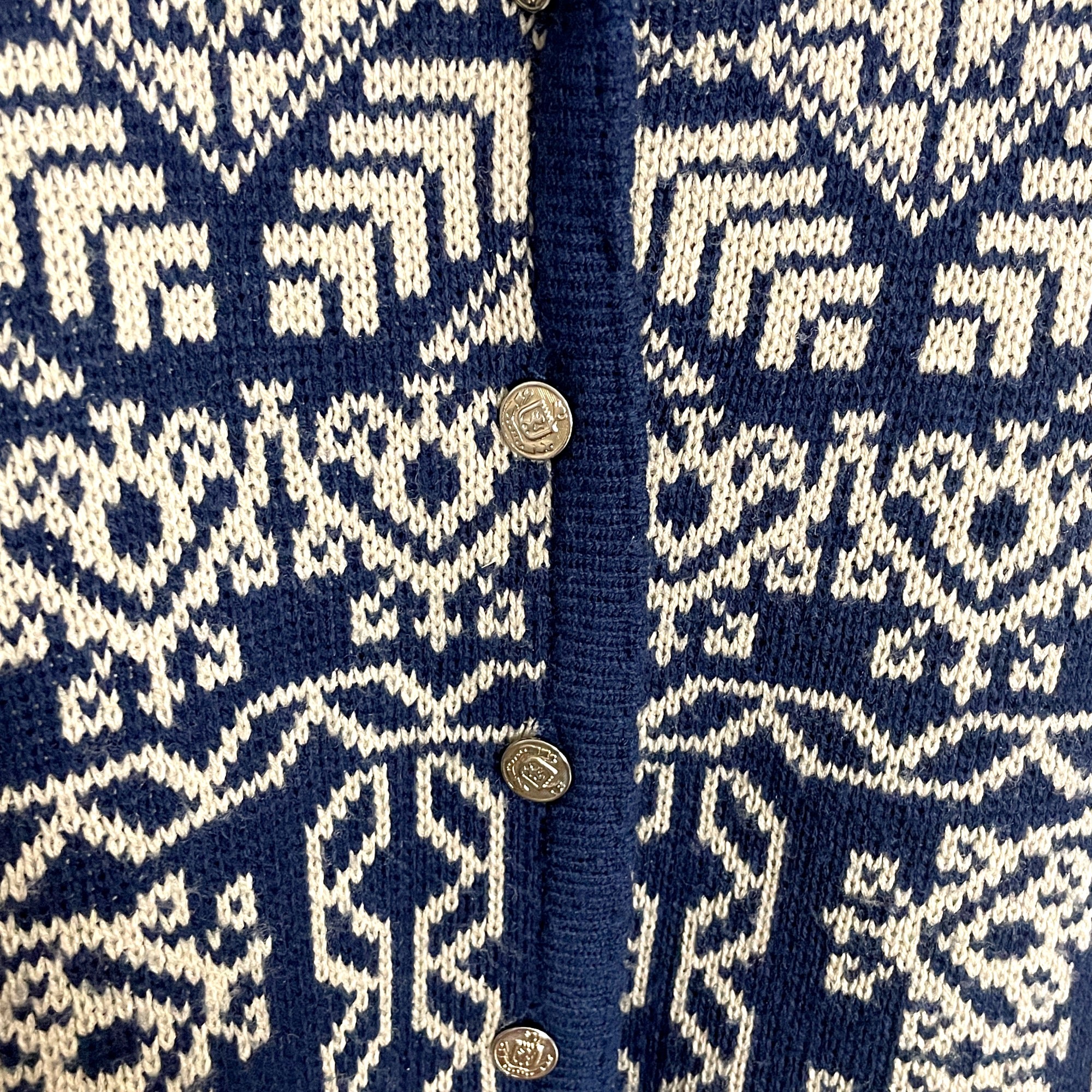 Cozy and cute deep midnight navy blue and taupe jacquard knit sweater jacket from Tally-Ho. Metal button front. Long sleeves. Two tiny front pockets. Full long sleeves. Styled like a traditional boiled wool jacket, but so much more comfortable. Preppy it out with pumps and pearls, wear with high waisted jeans, there's nothing this sweater jacket can't do.