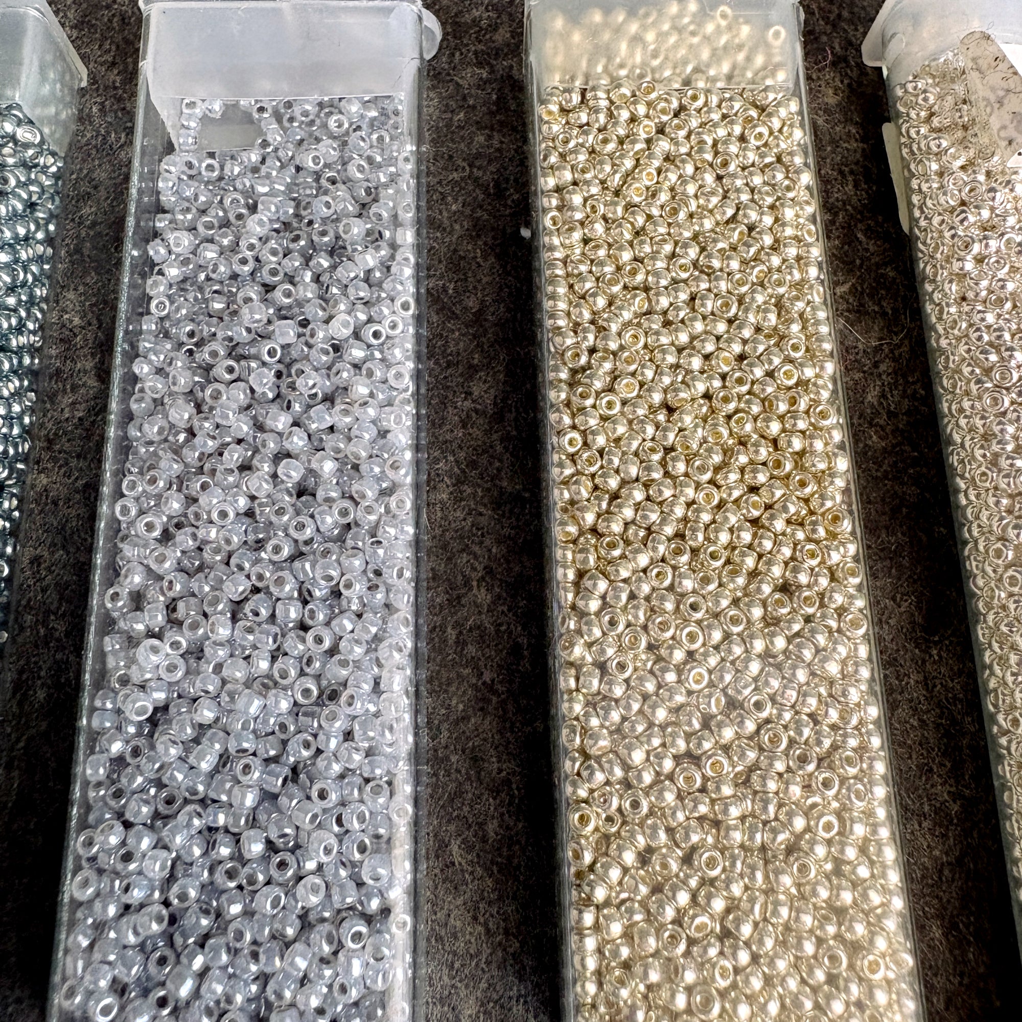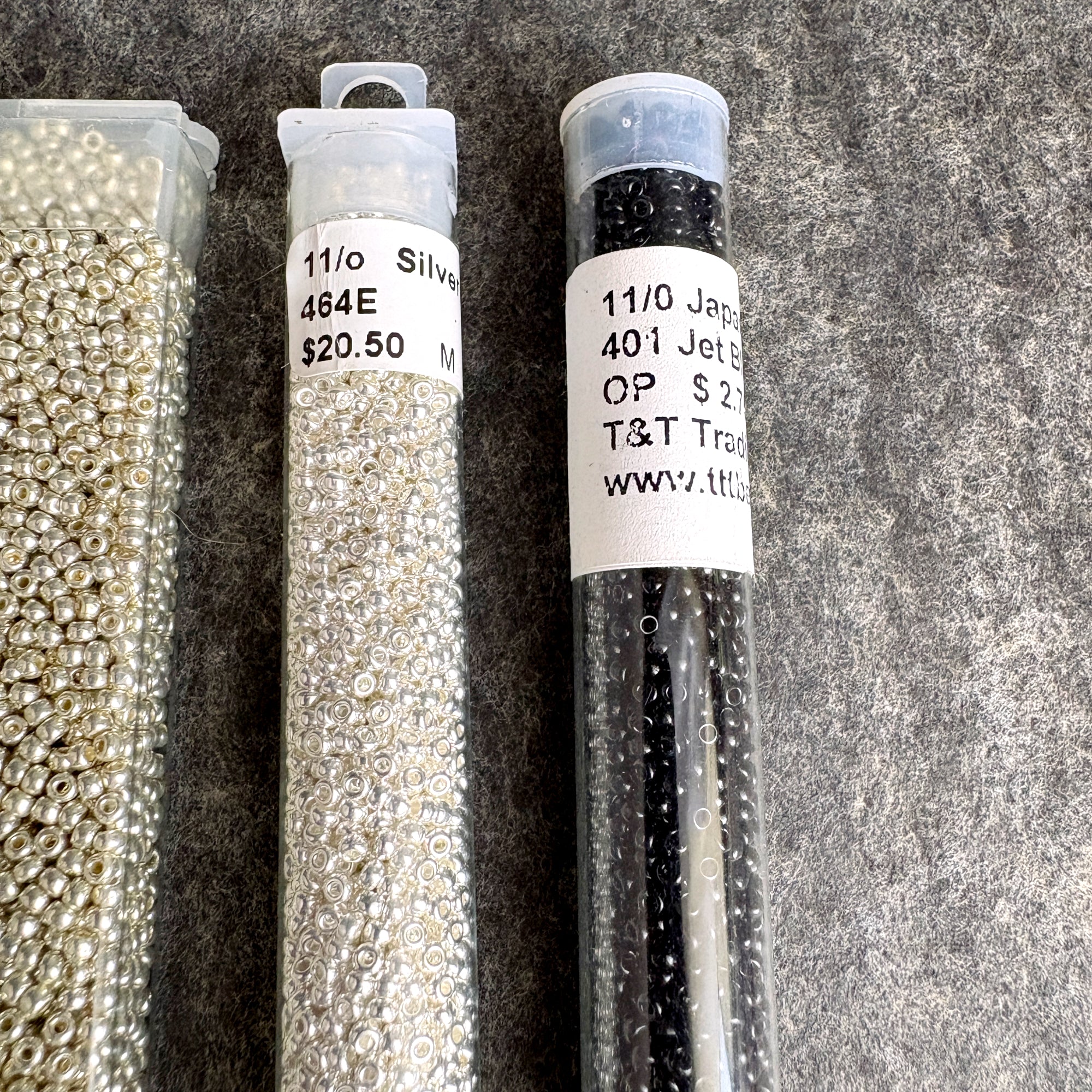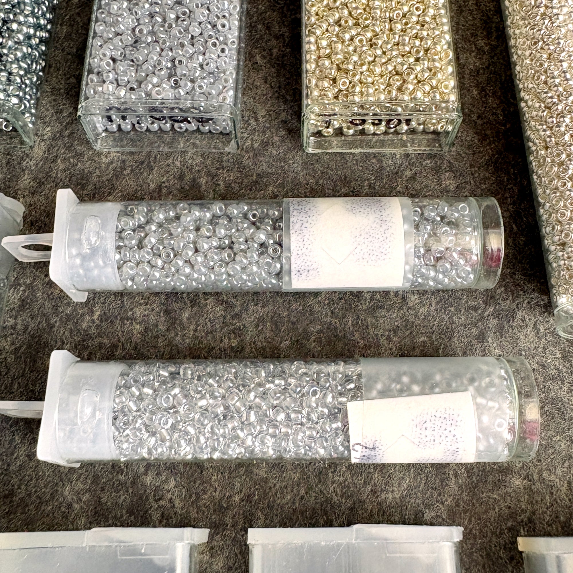 A mix of Miyuki, Toho and others that are unmarked. Most of the tubes were labeled by the reseller with their shade color and an M or T, a few tubes have their original tags, some are not completely full.